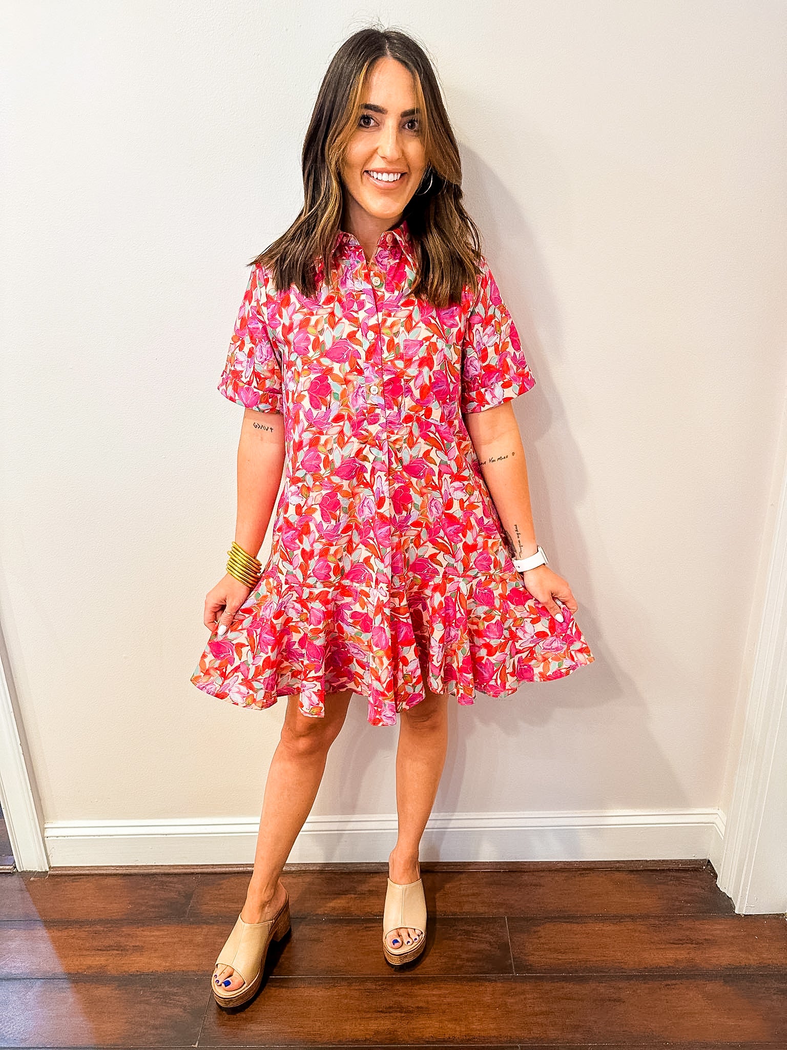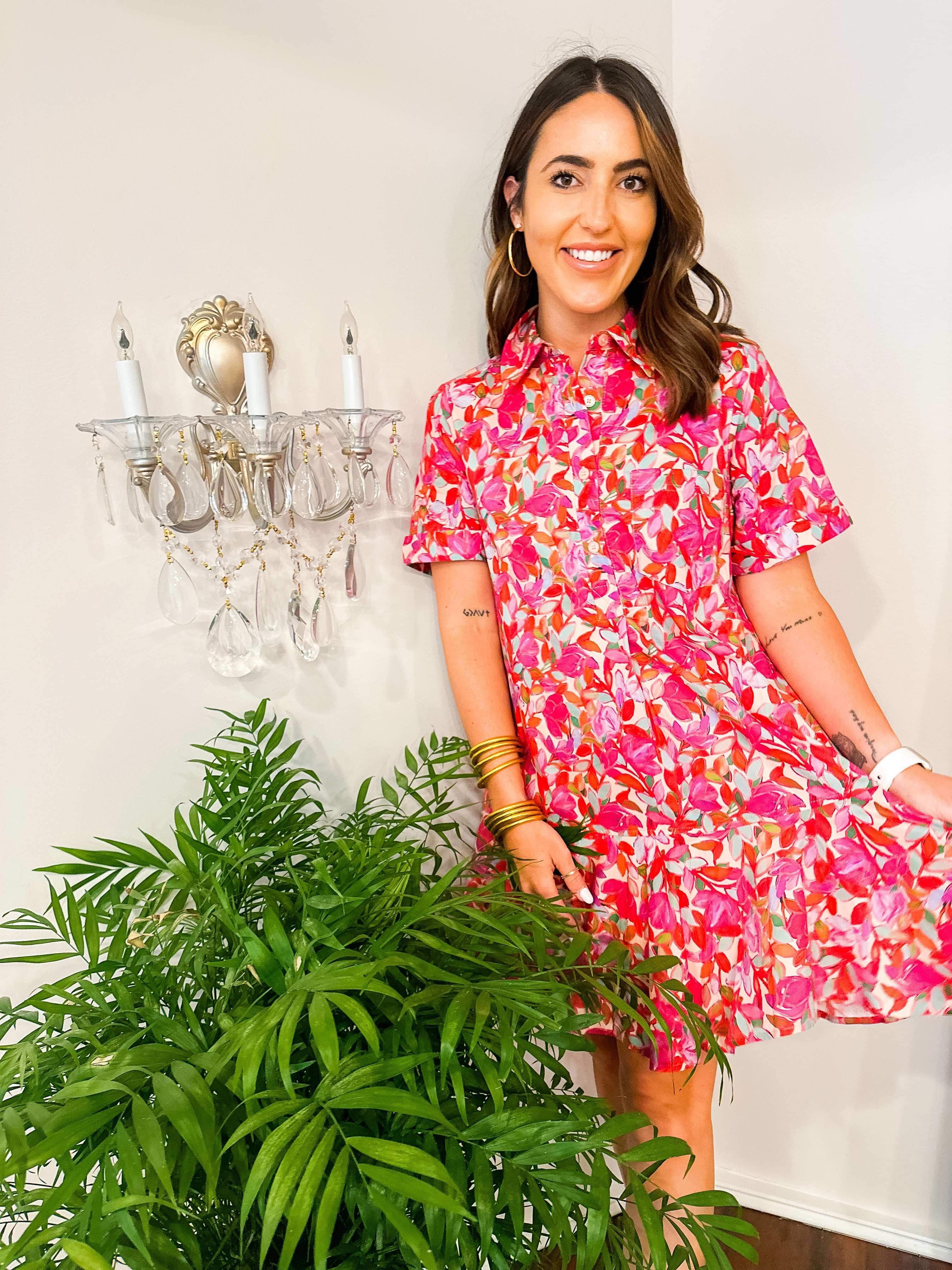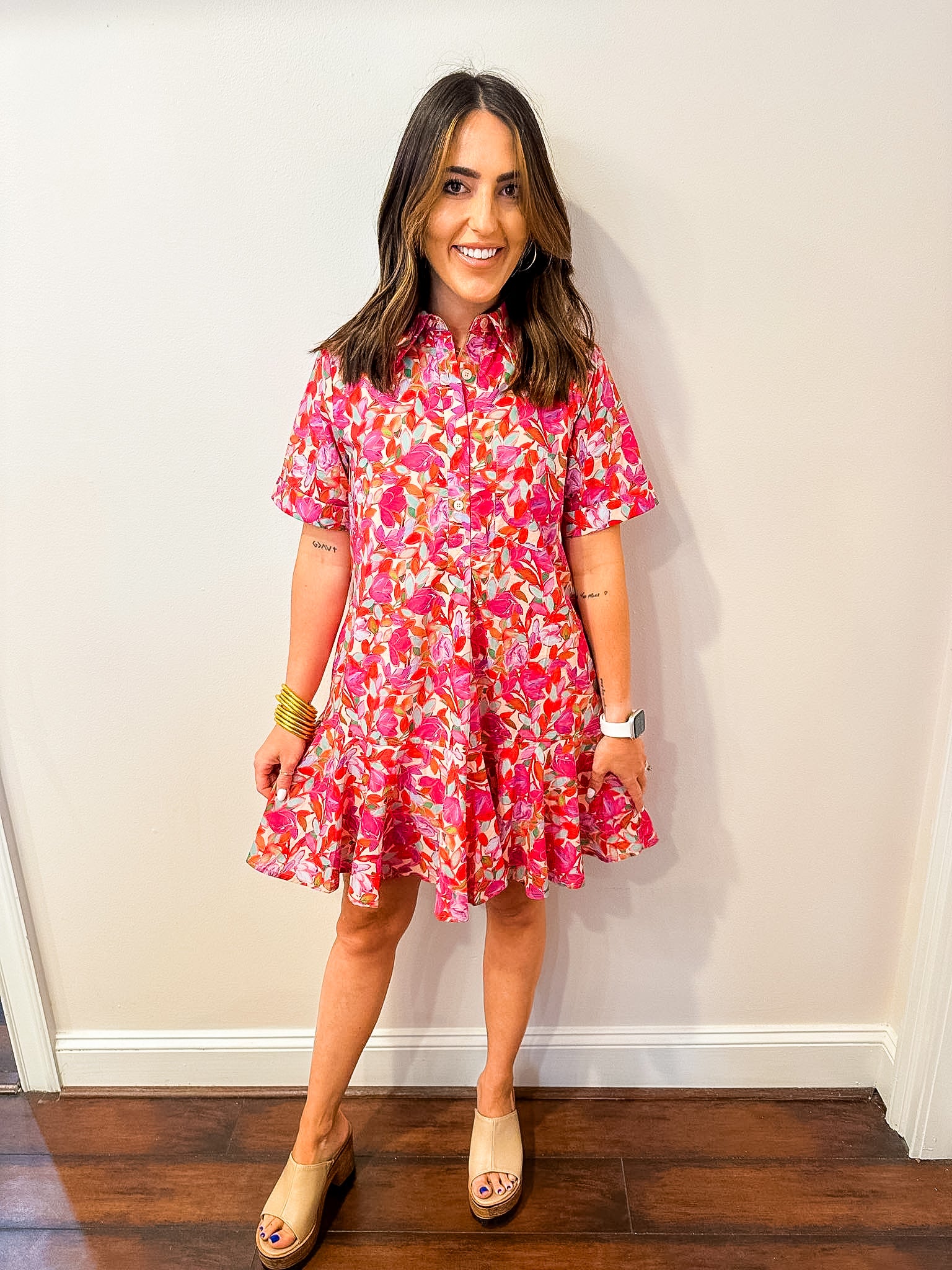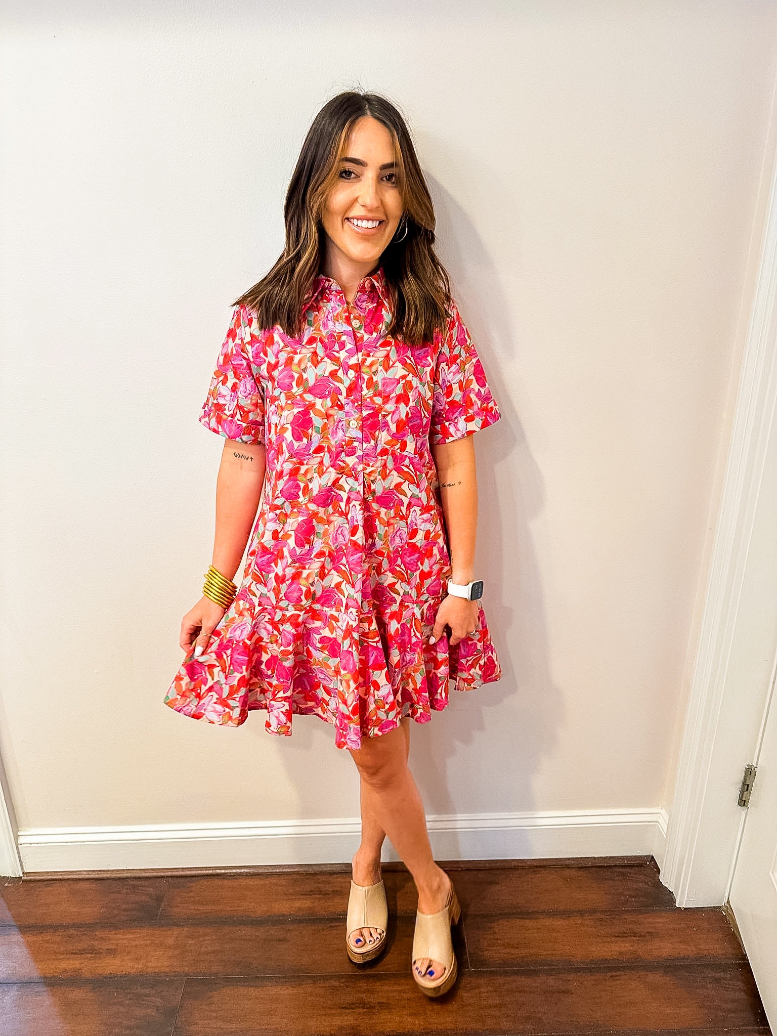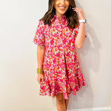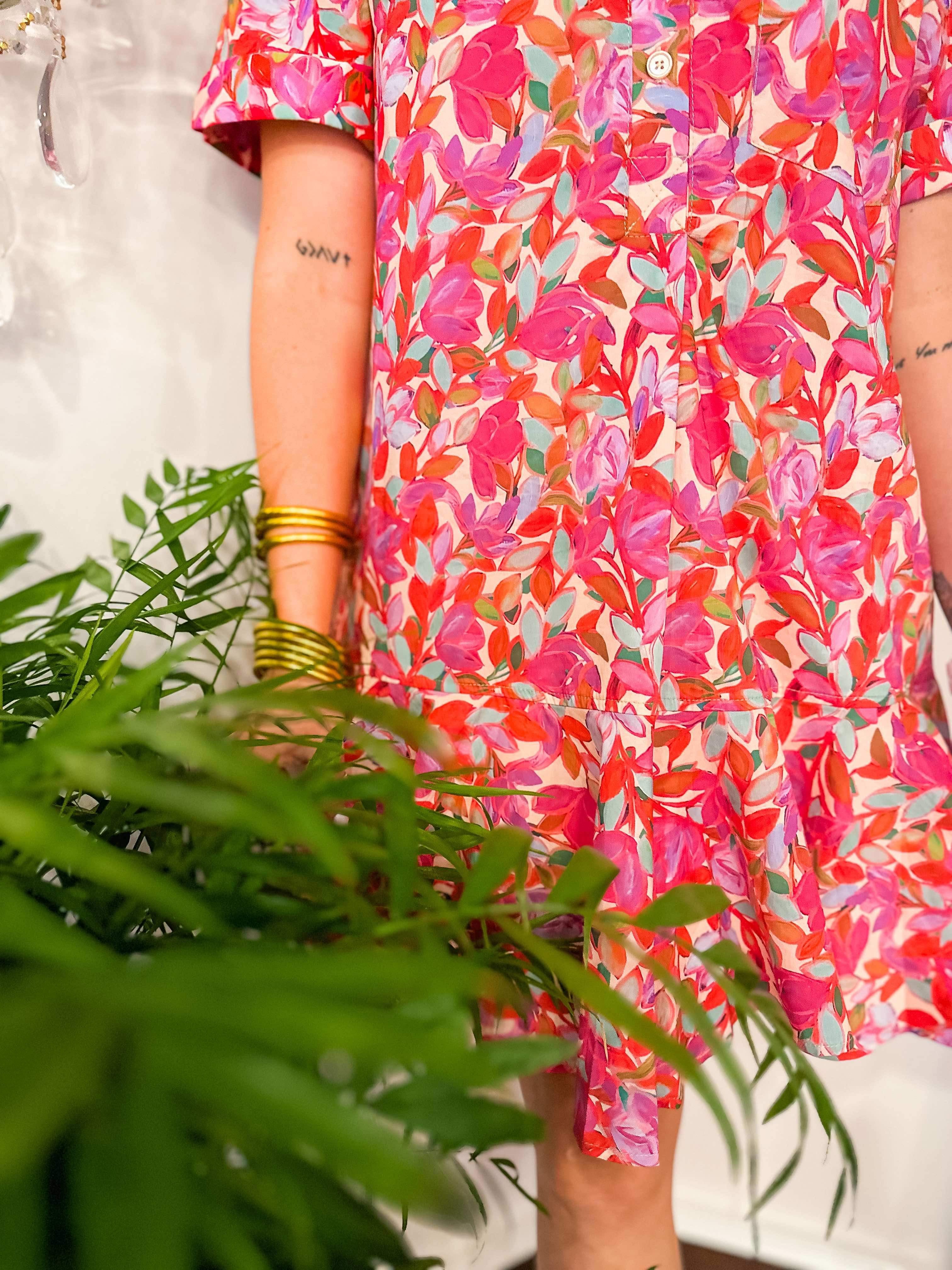 Floral print short sleeve mini dress featuring button detail at front. Pocket detail at bust. Pocket at sides. Lined. Woven. Non-sheer. Lightweight.