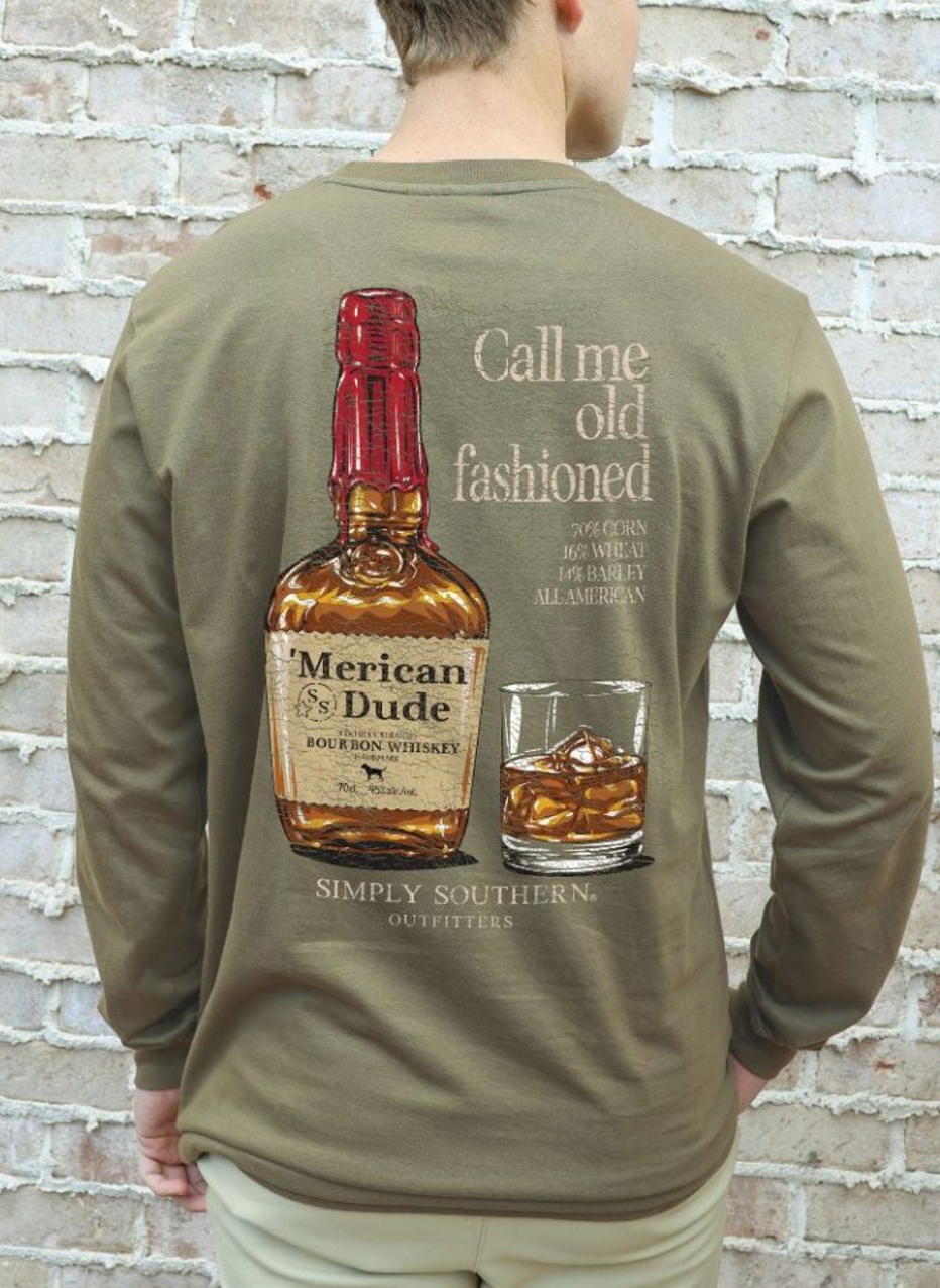 Tulepo green long sleeve shirt with the phrase 'Call me old fashioned' and an 'All American' recipe for whiskey. There is a whiskey bottle and glass. Simply Southern logo below and on left chest. 100% cotton. Unisex sizing.