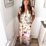 The Miraflor Rony Smocked Maxi Dress is a versatile wardrobe essential for any season. Made from soft, breathable linen, the smocked waist creates a flattering silhouette followed by short sleeves. Whether paired with sandals or wedges, this maxi dress is so cute. - Smocked waist - Short sleeves - Maxi - Pockets - Color: Ivory Multi