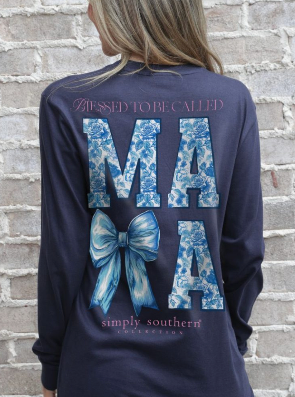 Mirage blue long sleeve shirt with the phrase 'Blessed to be called Mama' with the word 'Mama' filled with a blue motif. Simply Southern logo below. Similar design on left chest. 100% cotton. Unisex sizing.
