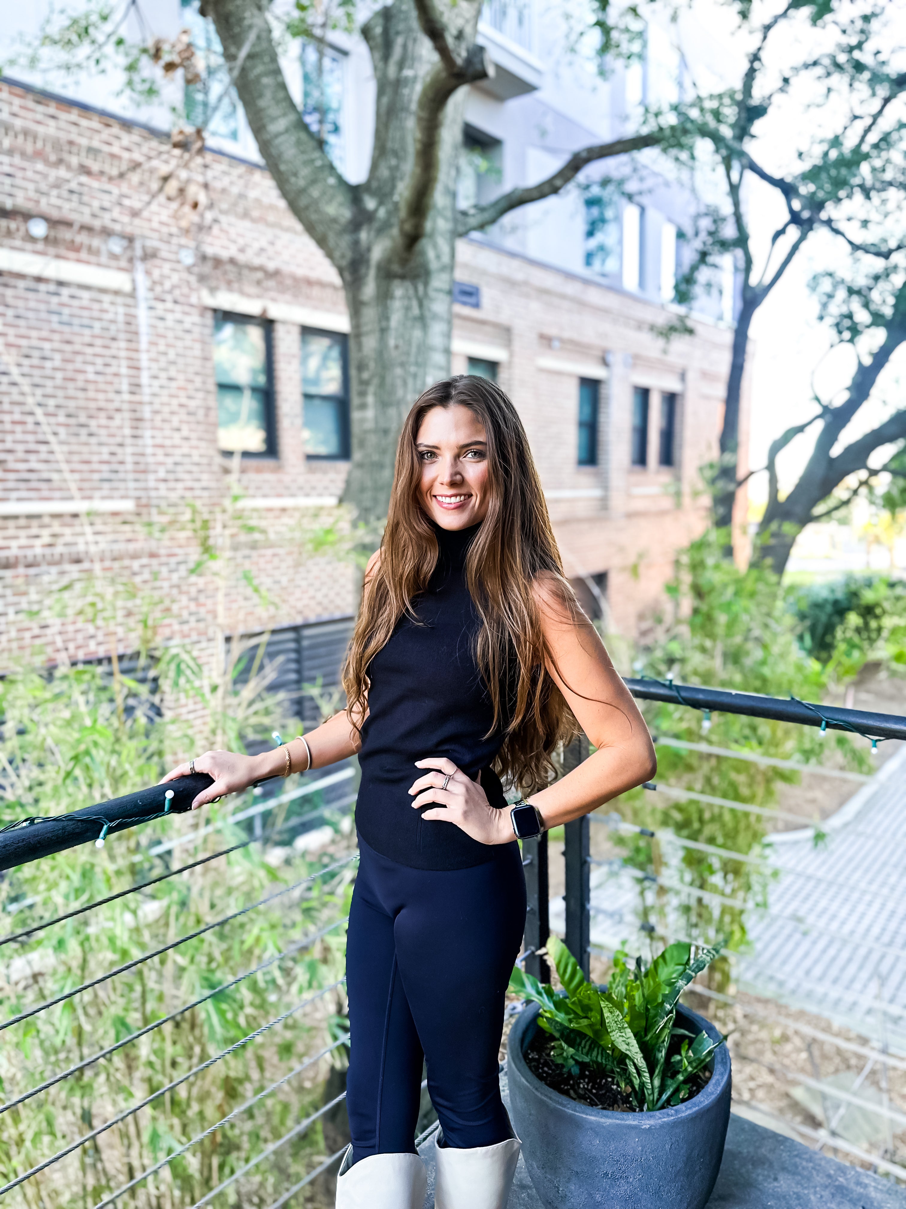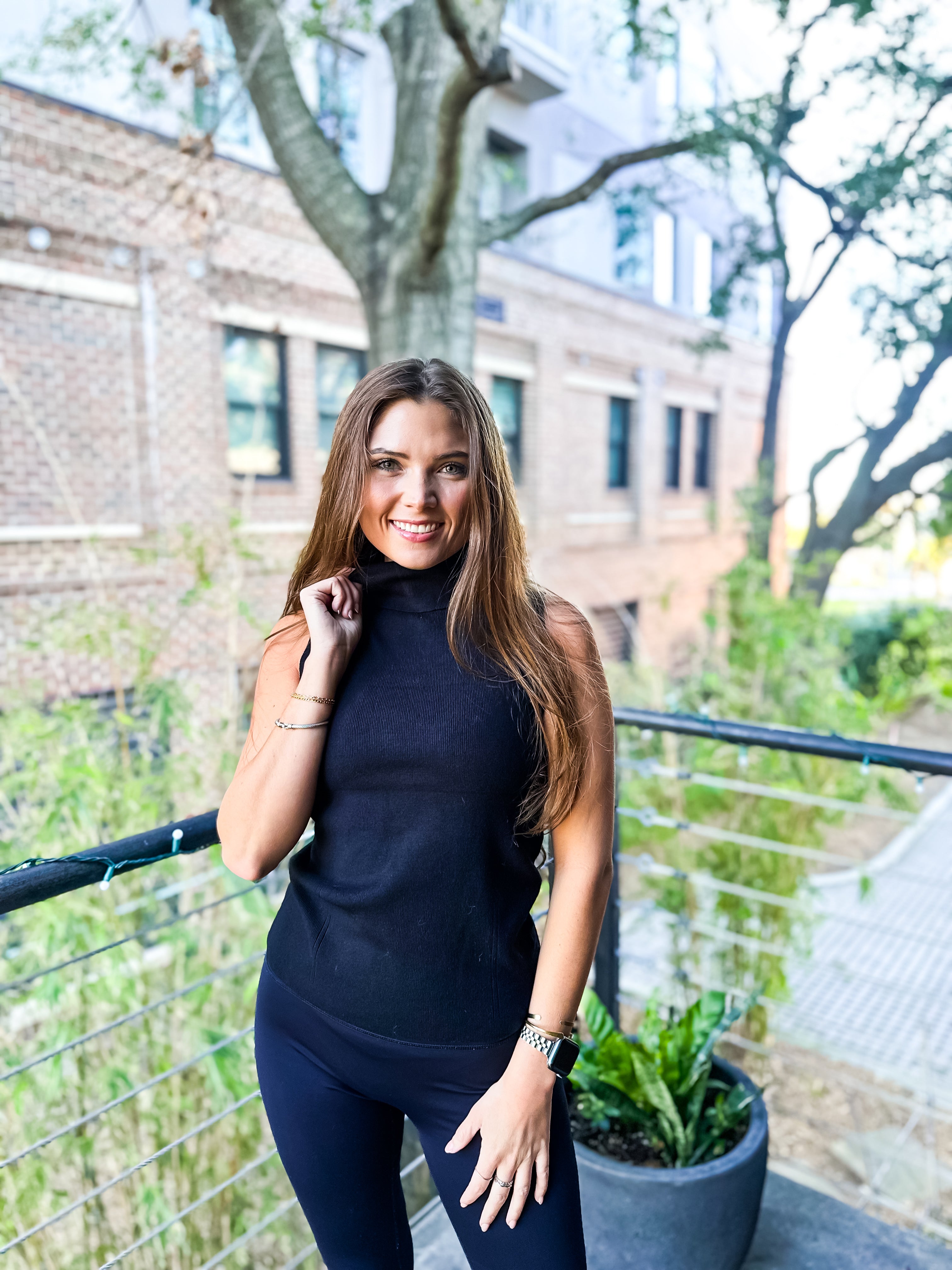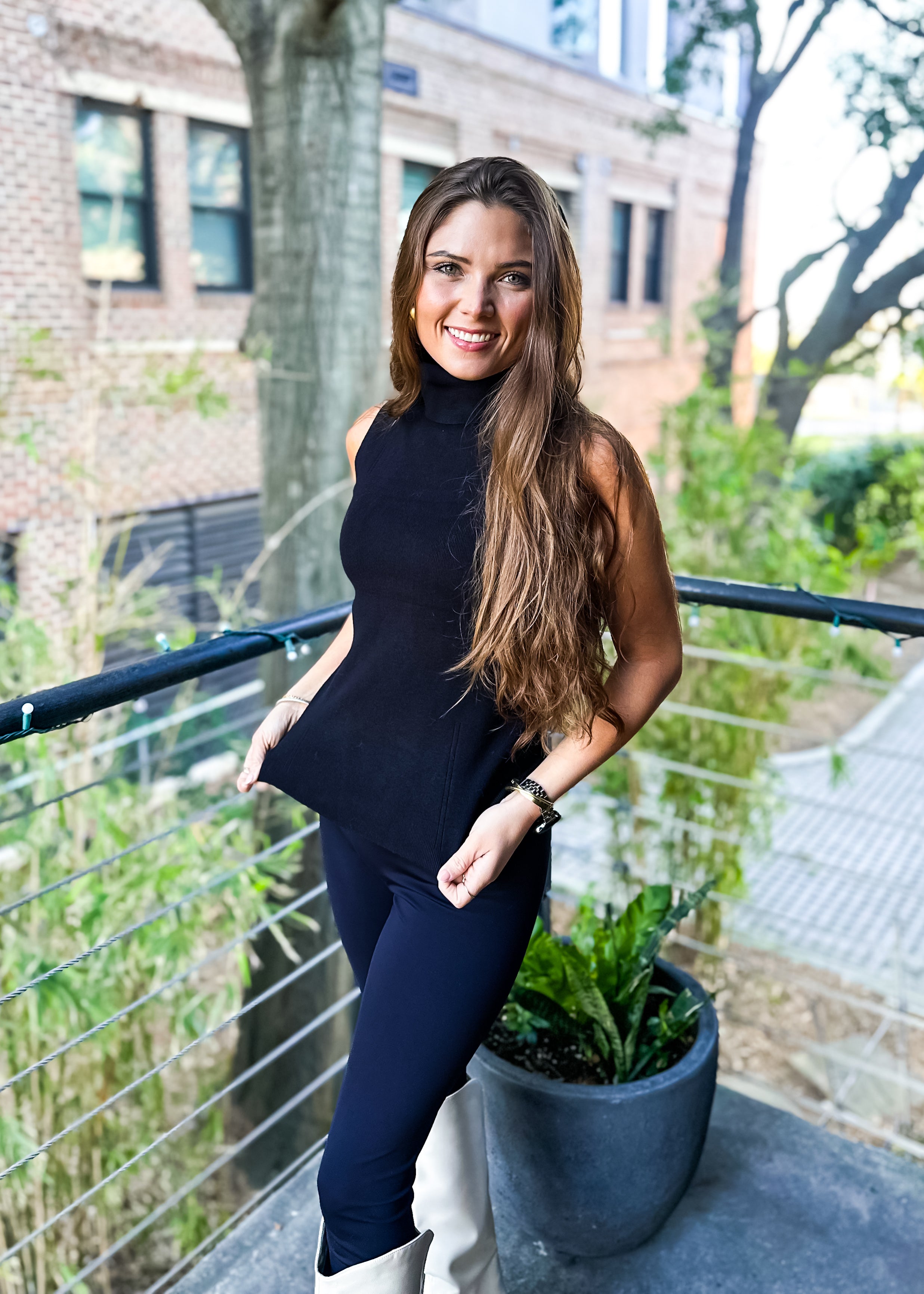 This is a great lightweight option to bring into any season. Pair her with anything and everything. It has a slight turtleneck / mock neck detail.