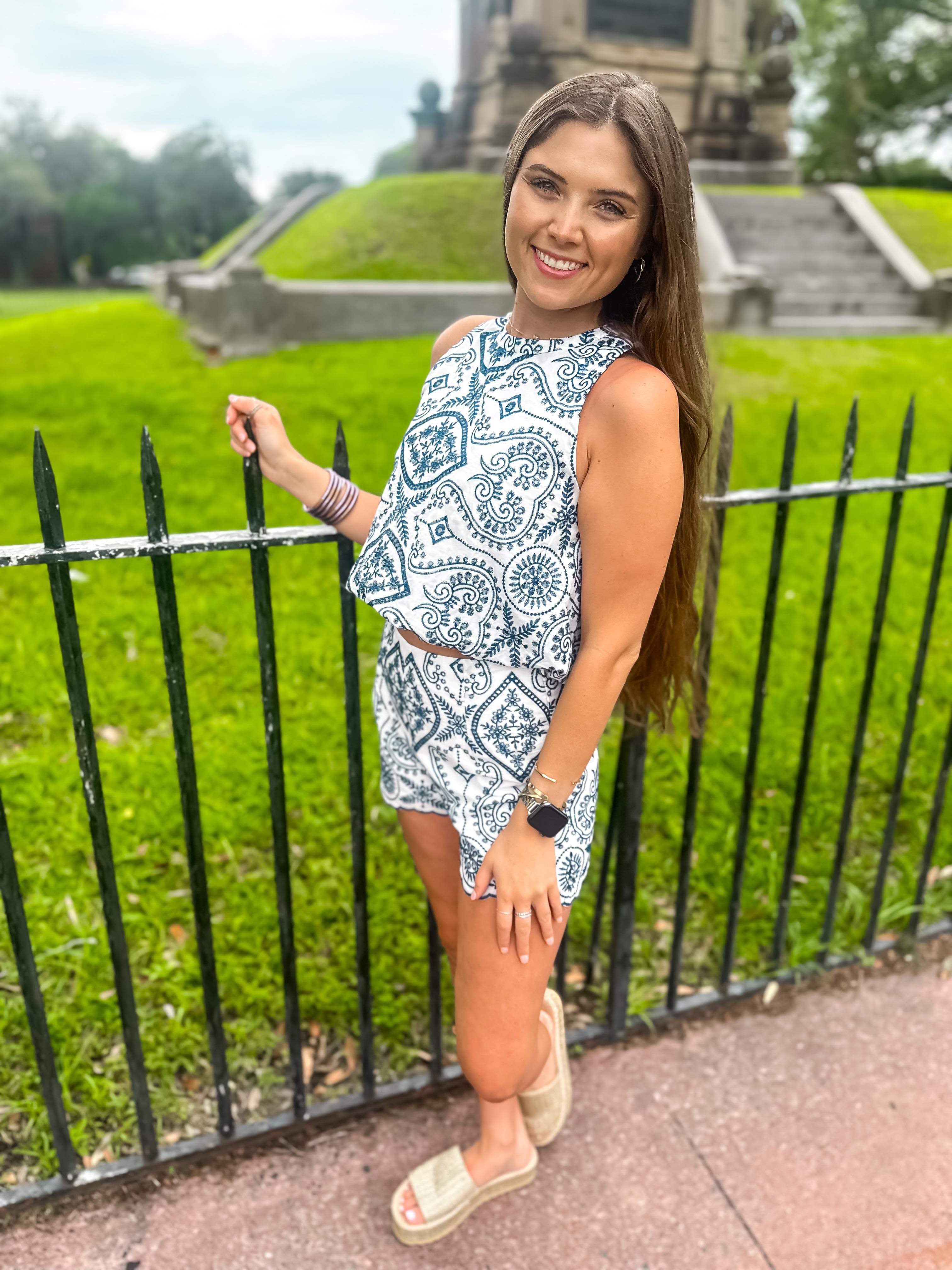 Embroidered eyelet cropped top and short set. This set is perfect for spring and summer and would be cute styled with a pair of wedges. Wear this set on vacation and style the two pieces together or separate.