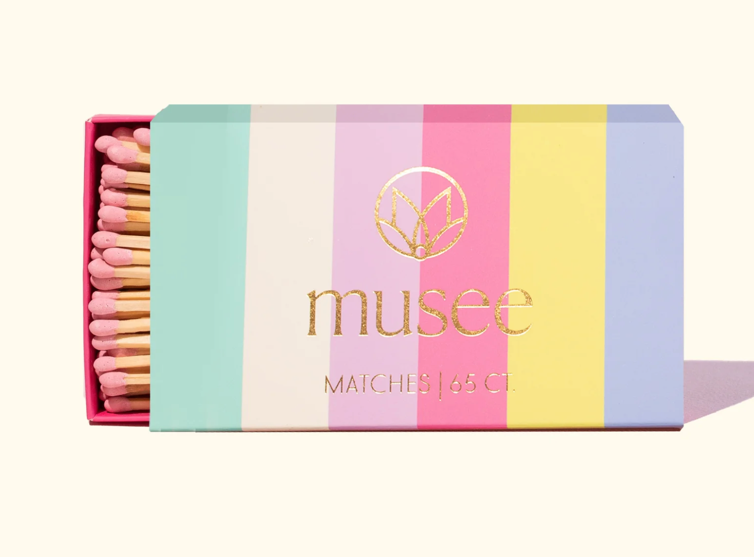 Add a spark of joy with Musee Matches! These oversized matches come in a colorful, cheerful box that’ll brighten up any space. The perfect addition for lighting Musee's luxurious soy candles! Crafted with extra-long sticks for effortless candle lighting.