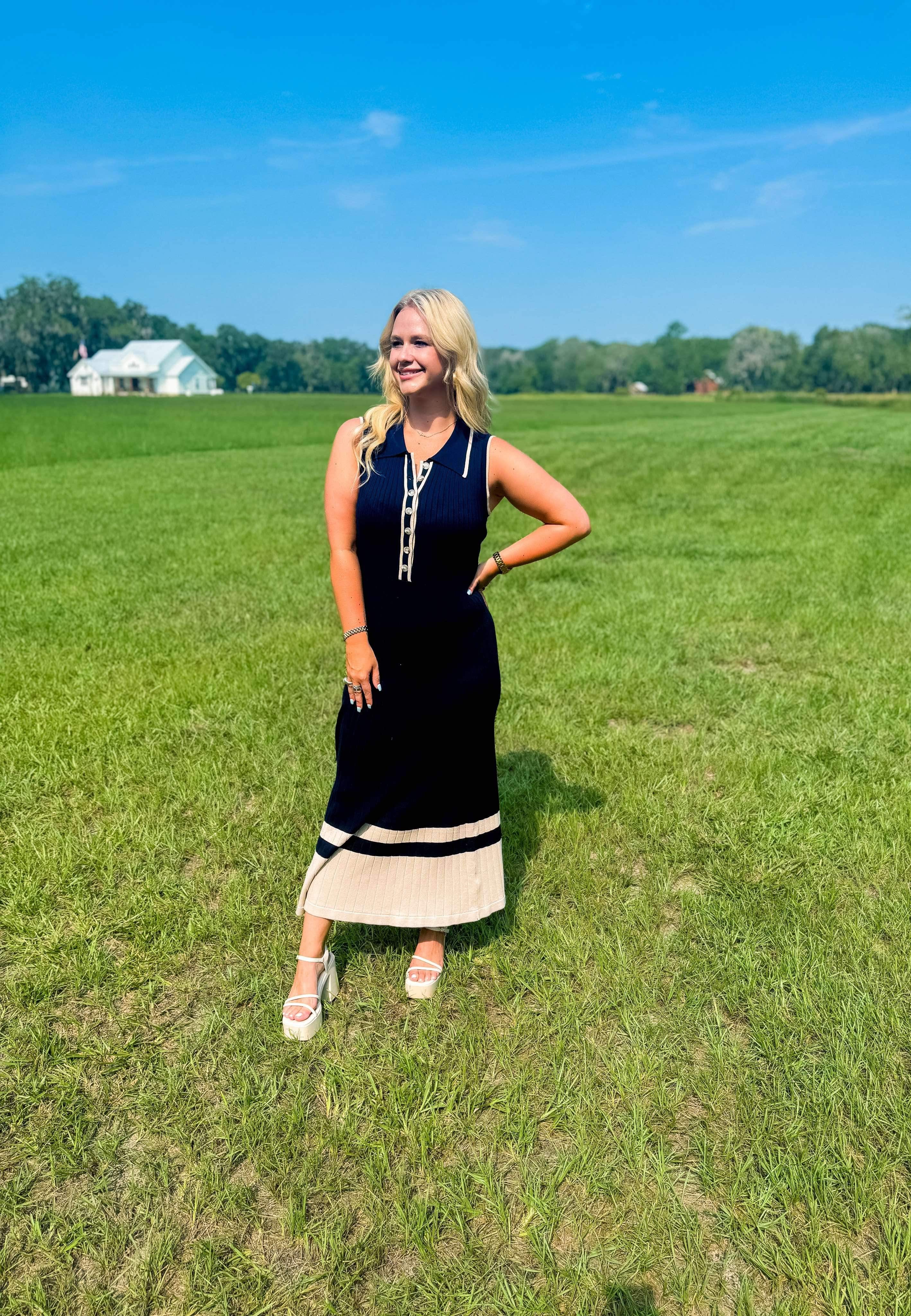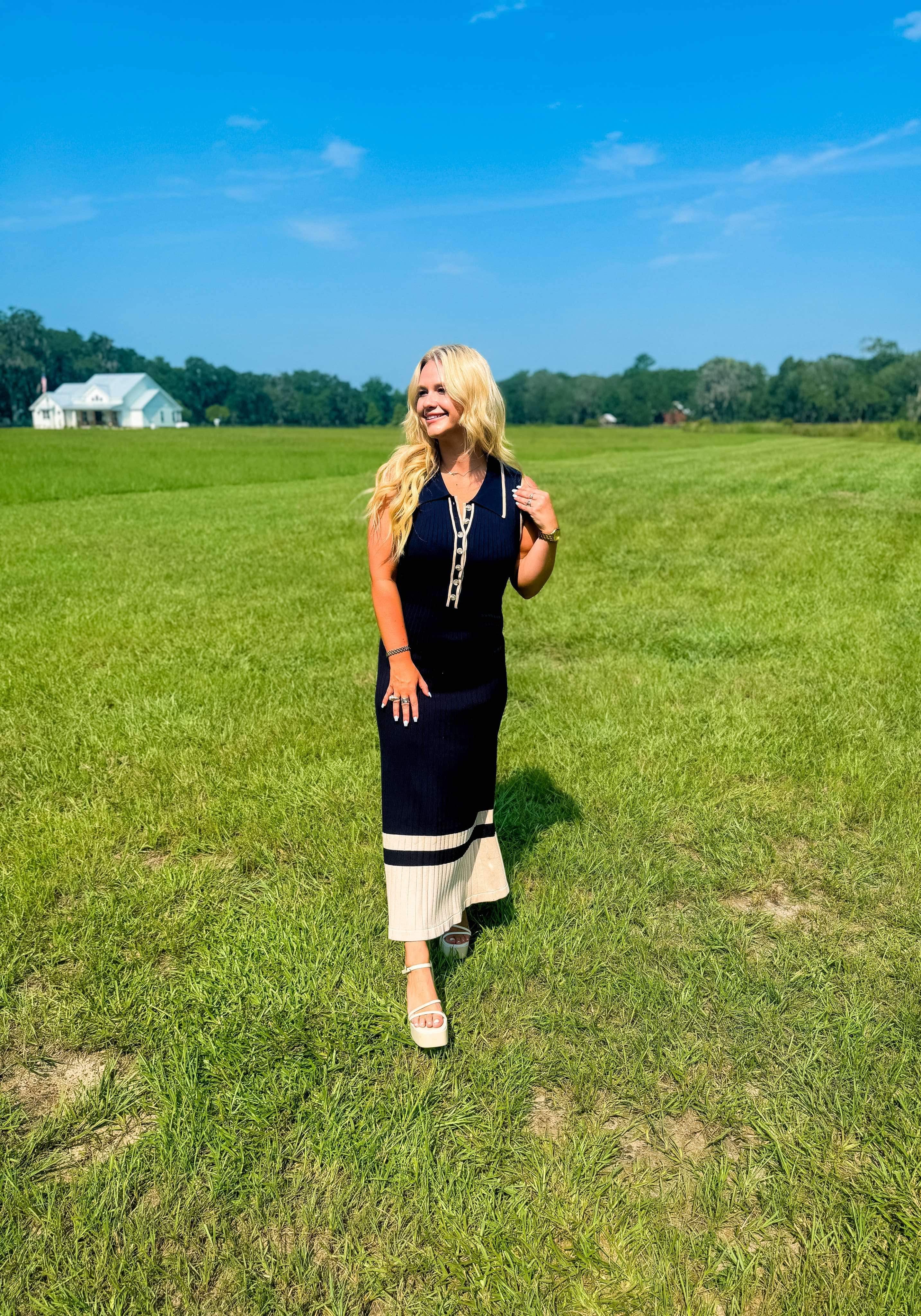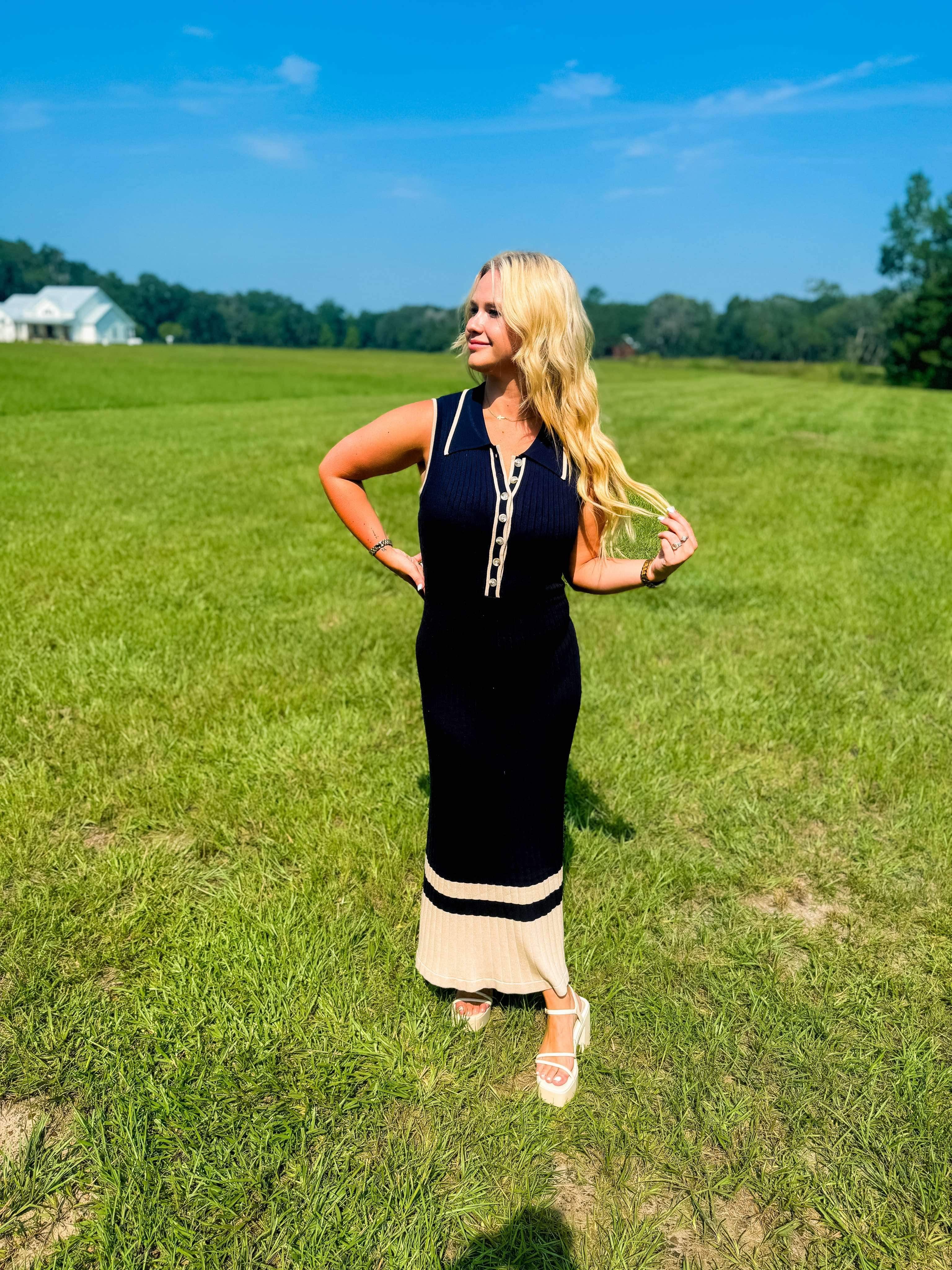 Solid contrasting ribbed sleeveless collared midi dress featuring button detail at front. Unlined. Knit. Non-sheer. Lightweight.