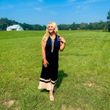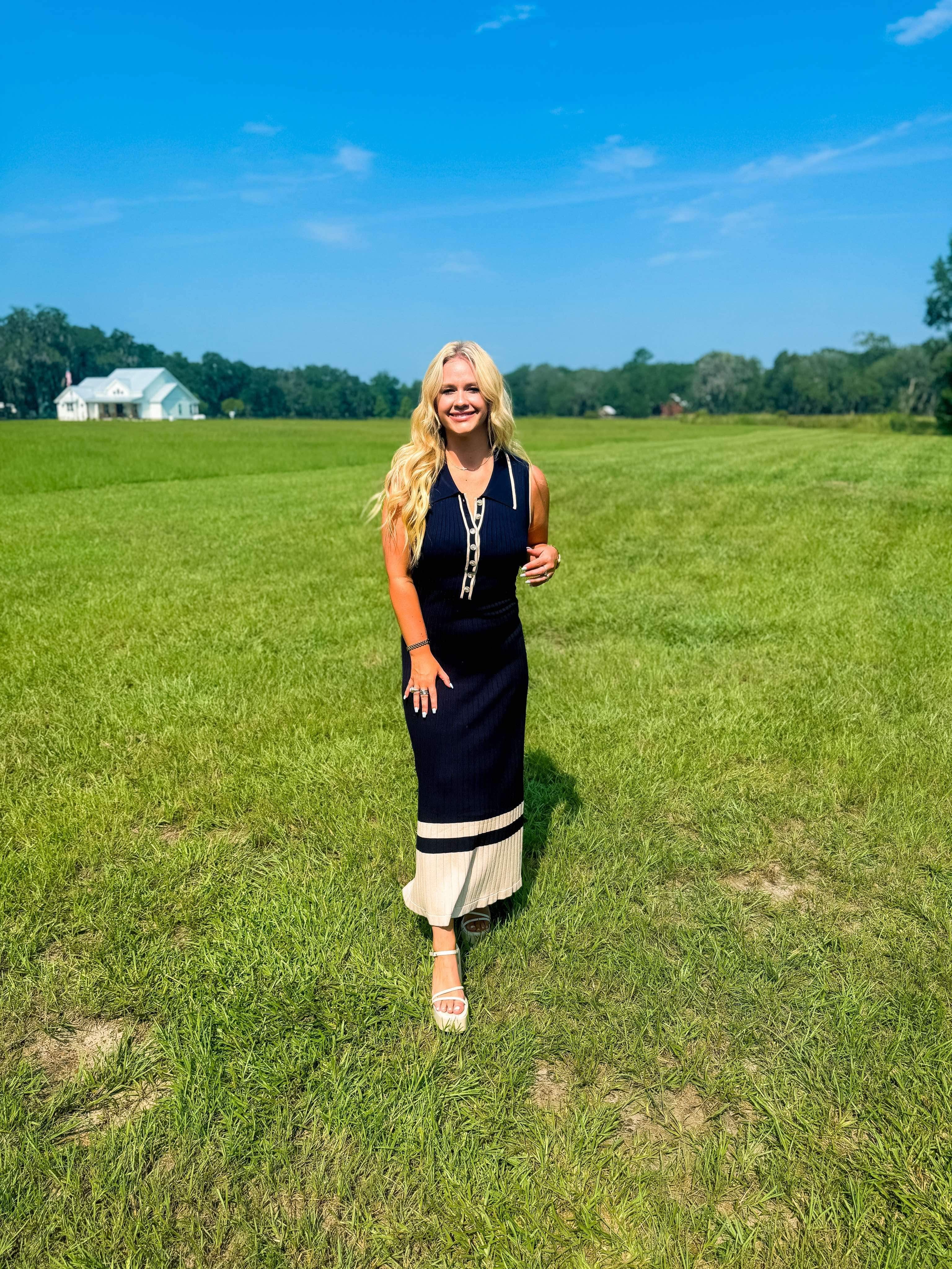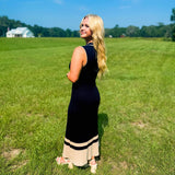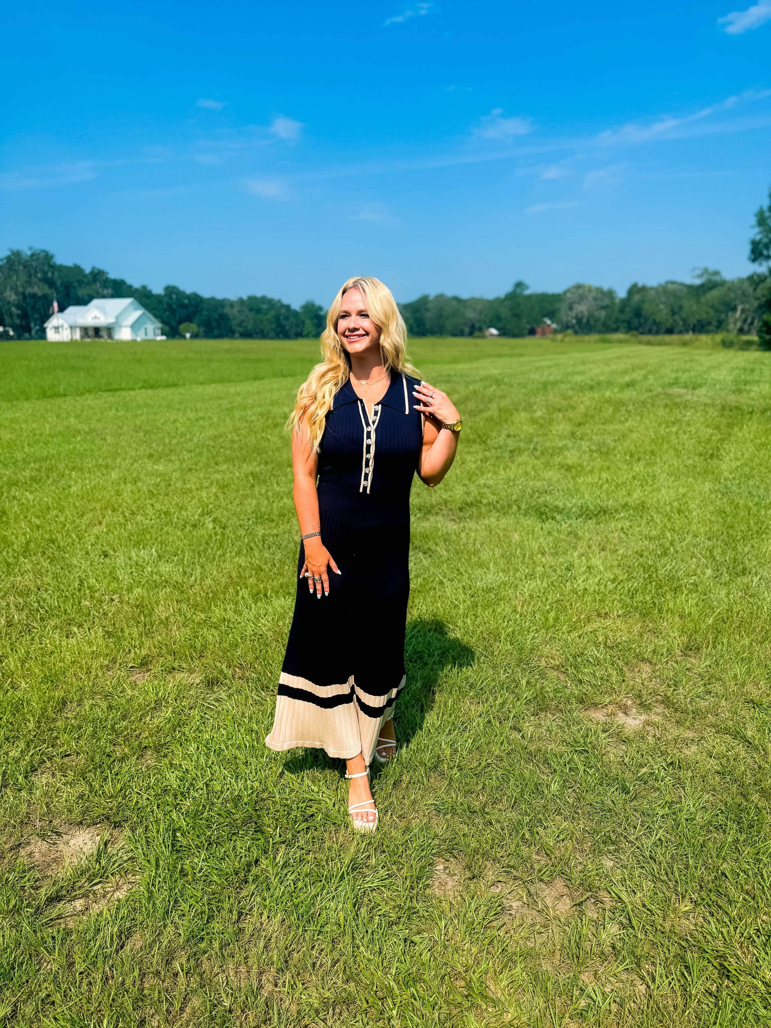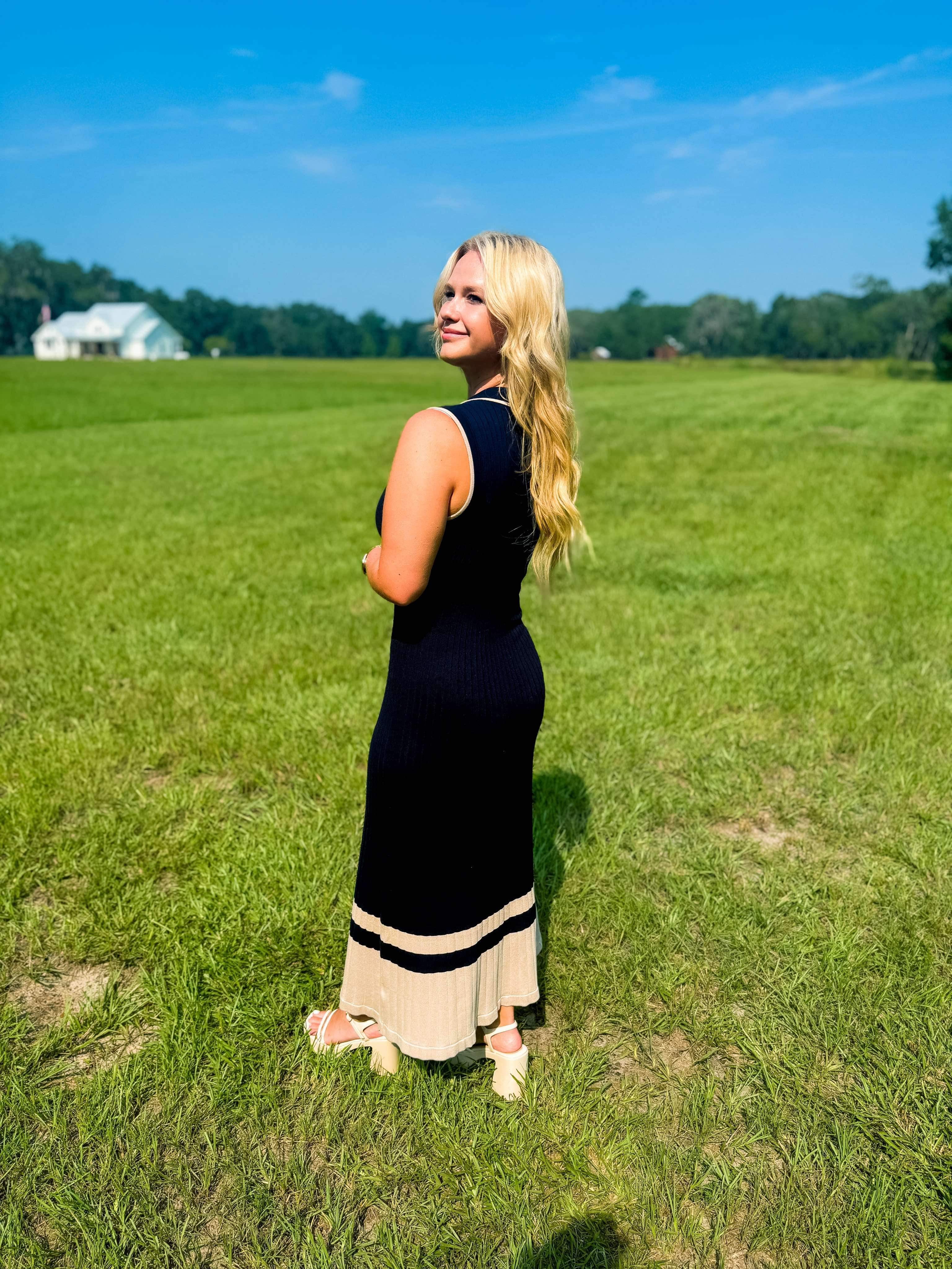 Solid contrasting ribbed sleeveless collared midi dress featuring button detail at front. Unlined. Knit. Non-sheer. Lightweight.