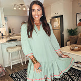Effortlessly chic and endlessly versatile, the Naomi Dress is a perfect blend of sophistication and charm. Featuring a romantic ruffle V-neckline and 3/4 sleeves with elegant puff shoulders, this dress brings timeless femininity to your wardrobe. The contrast trim details add a modern, polished touch, while the functional pockets combine style with everyday practicality.