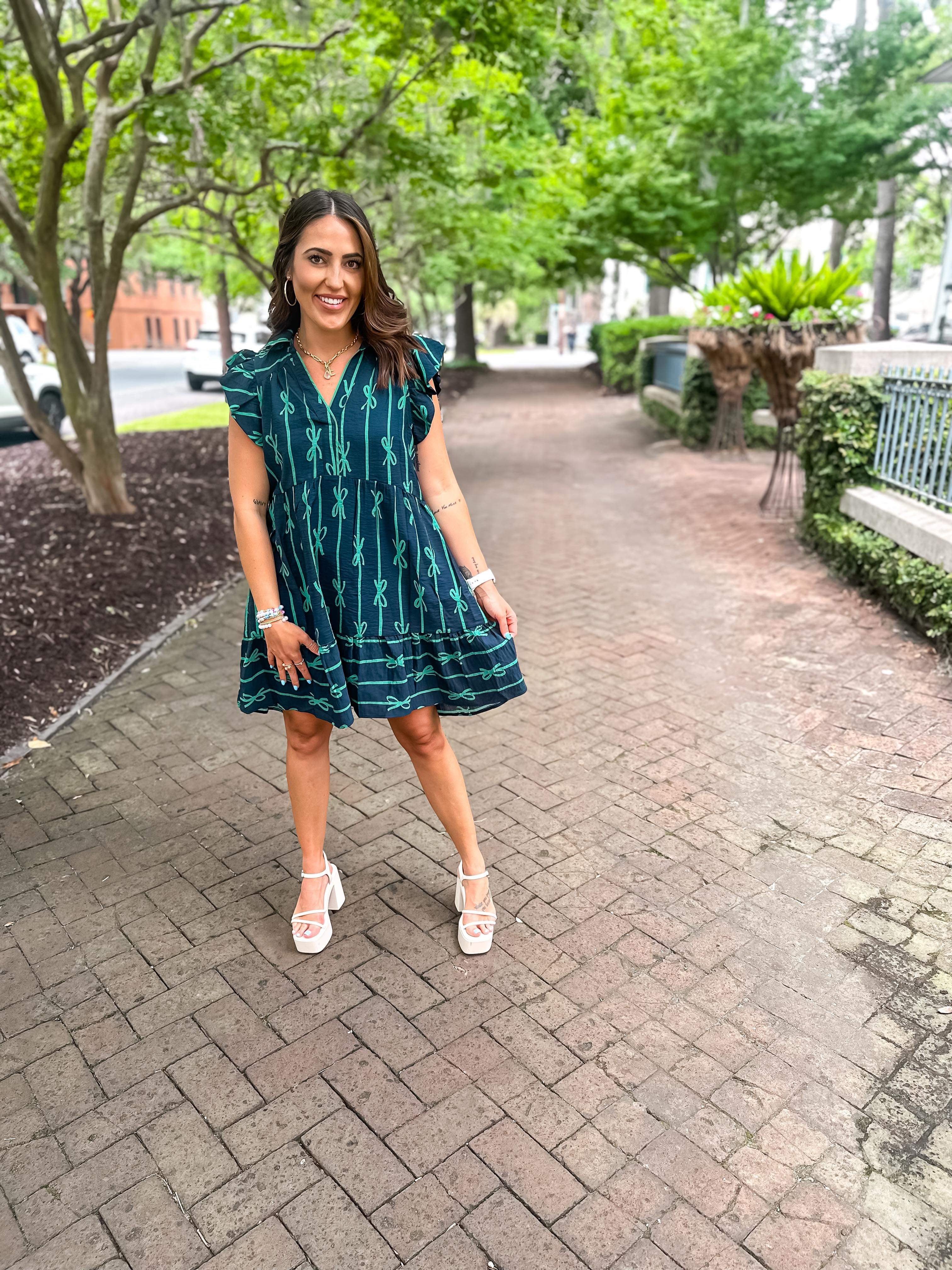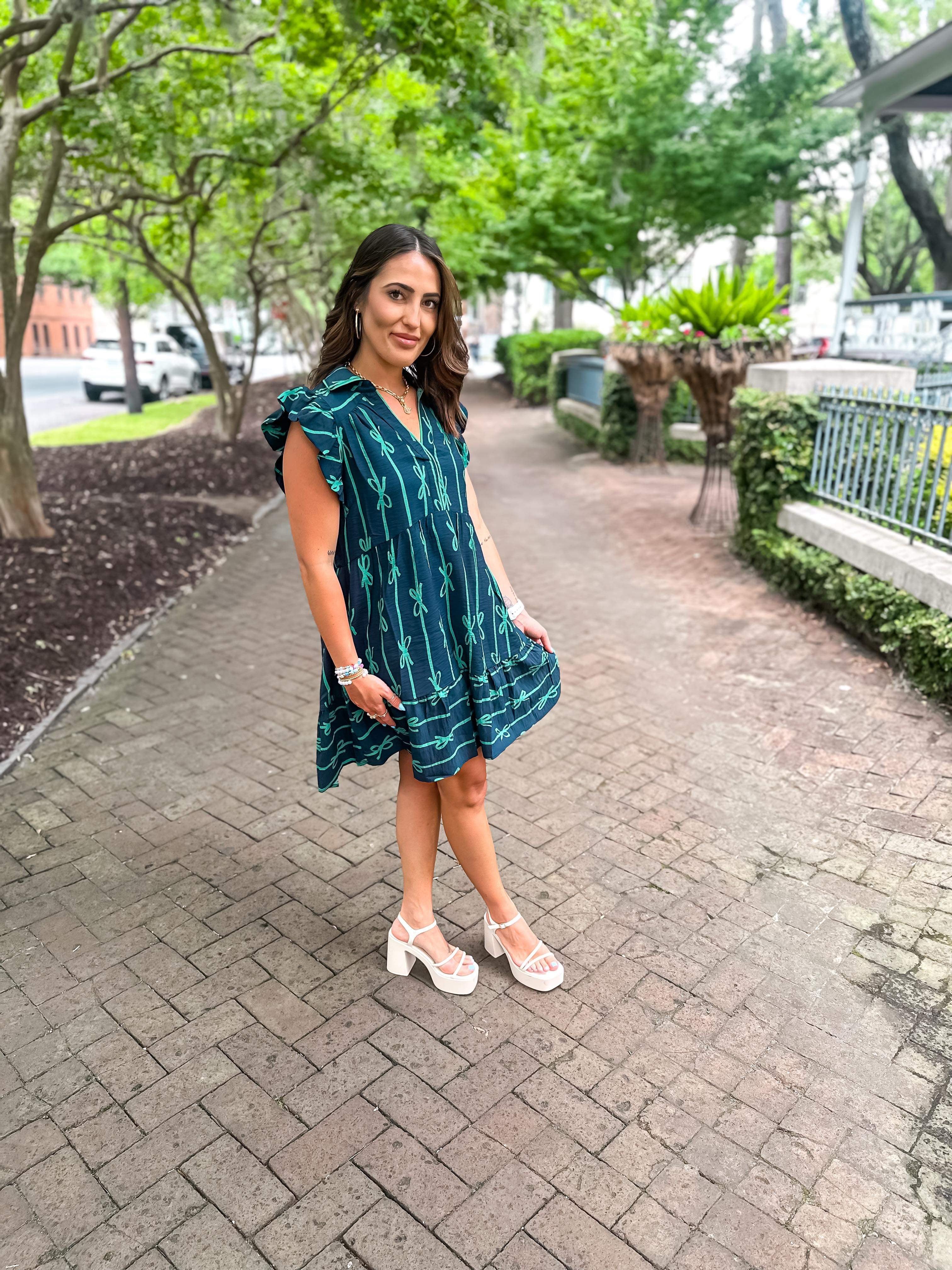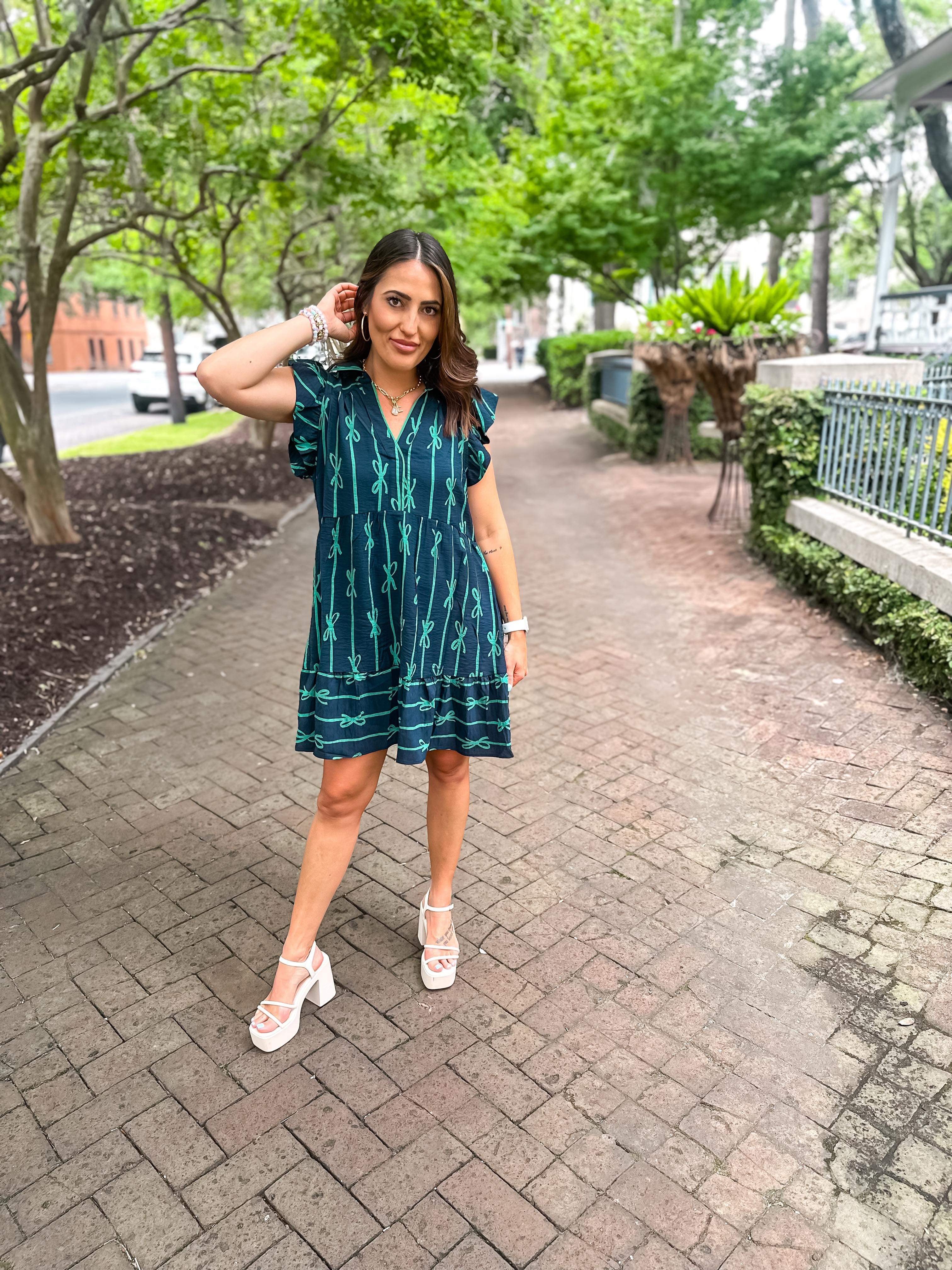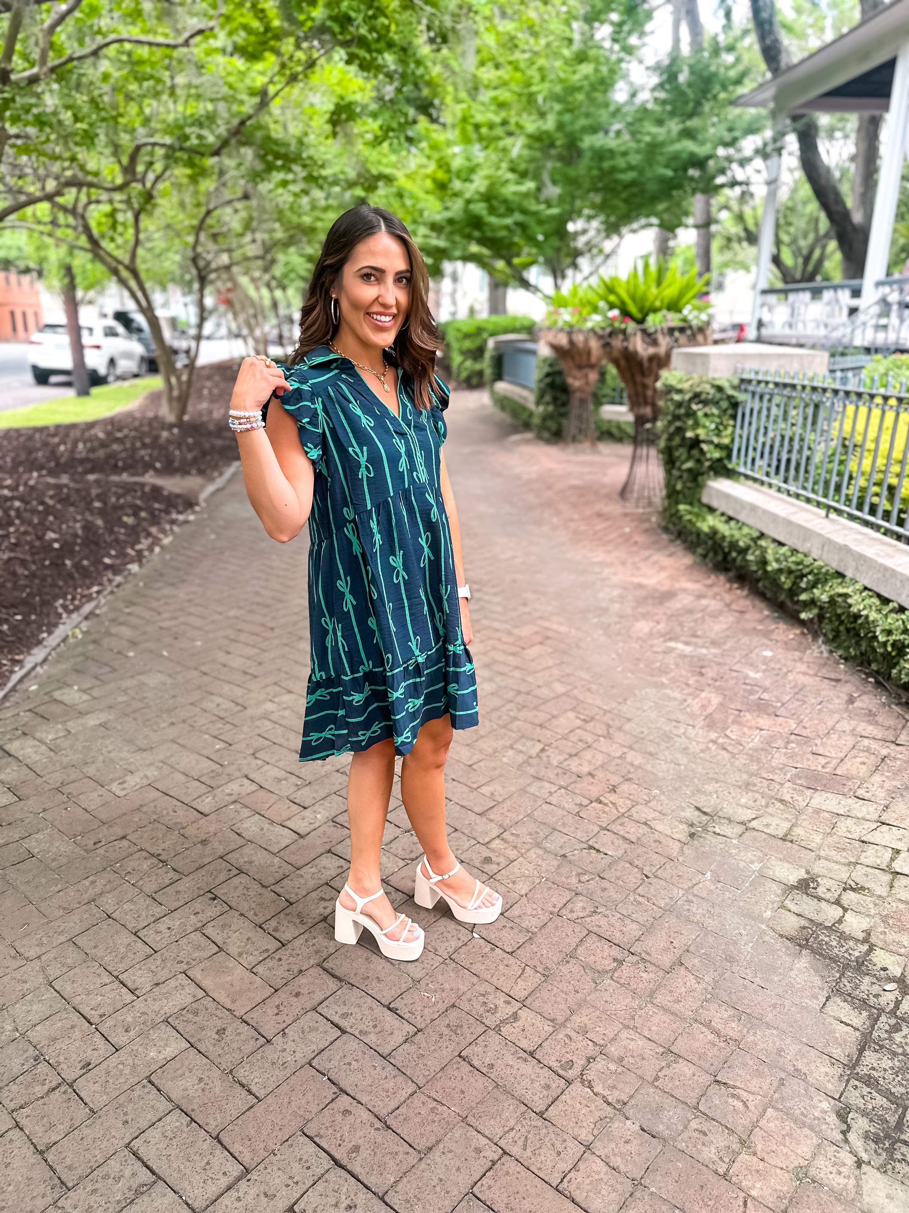 Embrace timeless coastal charm with our beautiful Nautical Noir Dress. It captivates a blend of elegance and nautical flair. Crafted on an off-white base. This dress is adorned with chic black bows throughout adding a touch of whimsy and sophistication. The sleeveless design features delicate ruffle detailing along the sleeves, evoking the gentle look. It features a drop-hem ruffle at the bottom of the dress adds movement and grace, mirroring the fluidity of the sea. Whether you're strolling along the boardwalk or attending a beachside soiree, this dress exudes effortless chic, making it a standout choice for any coastal occasion.