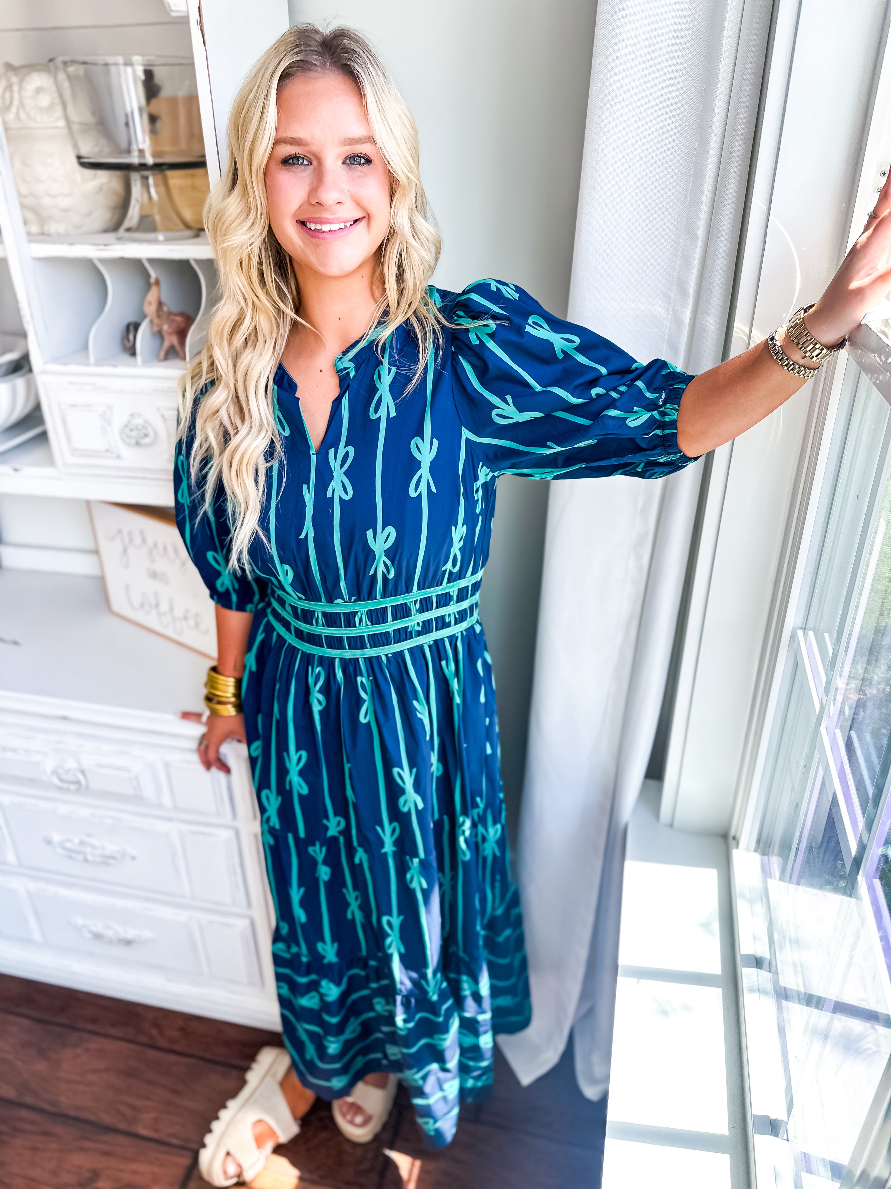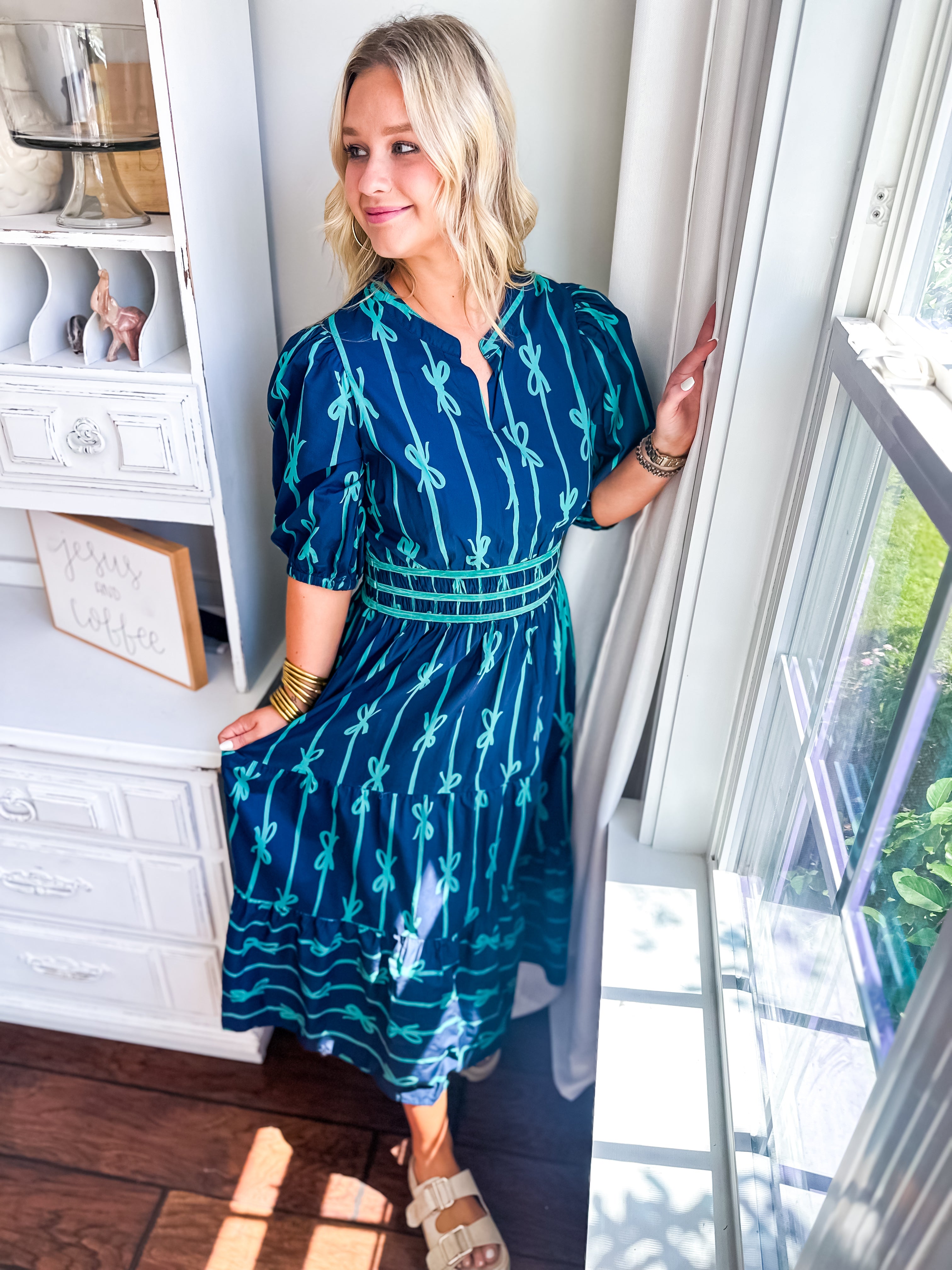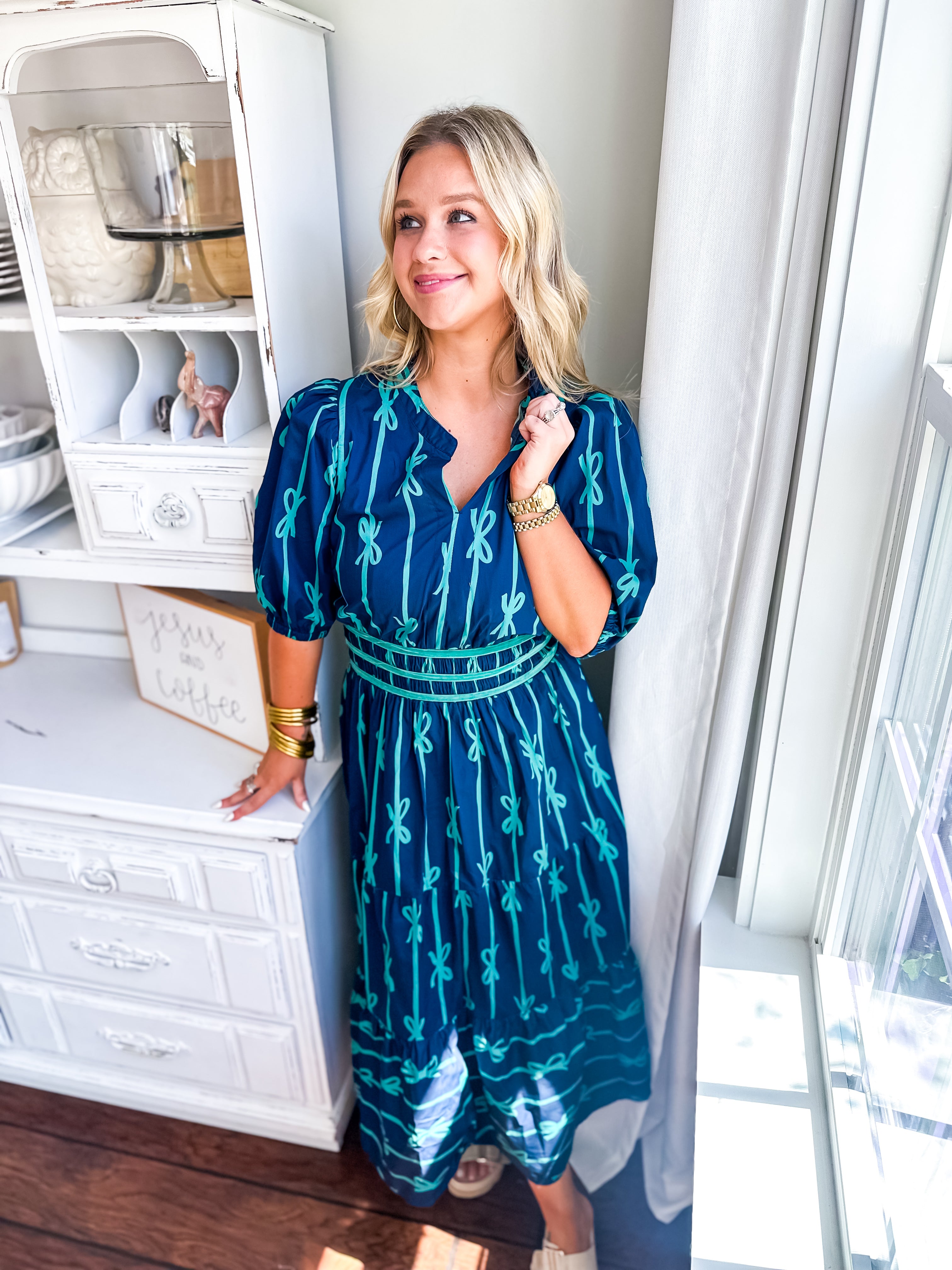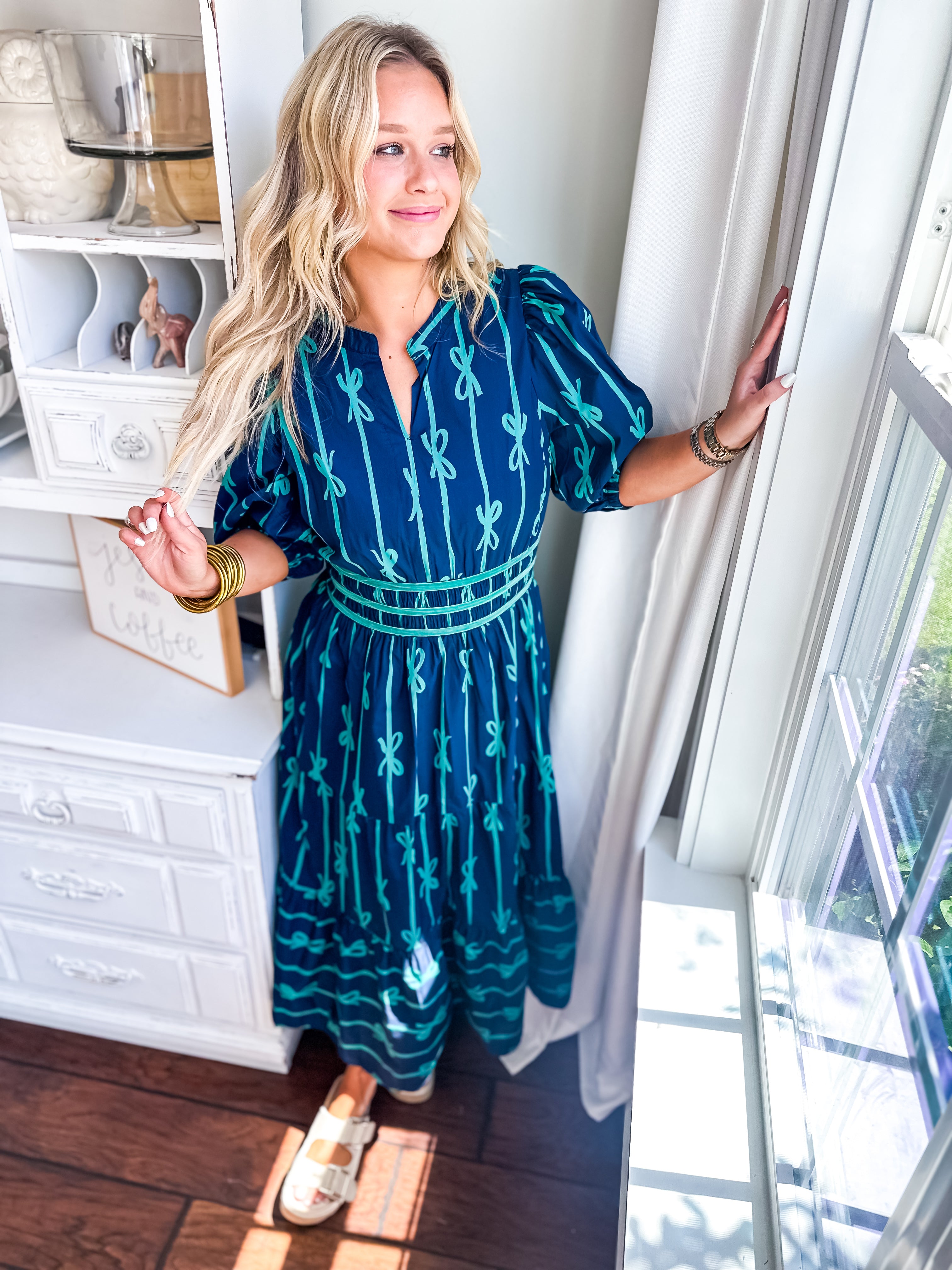 Embrace timeless coastal charm with our beautiful Nautical Noir Midi Dress. It captivates a blend of elegance and nautical flair. Crafted on a navy base. This dress is adorned with chic green bows throughout adding a touch of whimsy and sophistication. The slight puff sleeve design features delicate puff detailing along the sleeves, evoking the gentle look. It features a drop-hem ruffle at the bottom of the dress adds movement and grace, mirroring the fluidity of the sea. Whether you're strolling along the boardwalk or attending a beachside soiree, this dress exudes effortless chic, making it a standout choice for any coastal occasion.