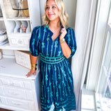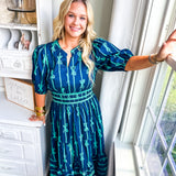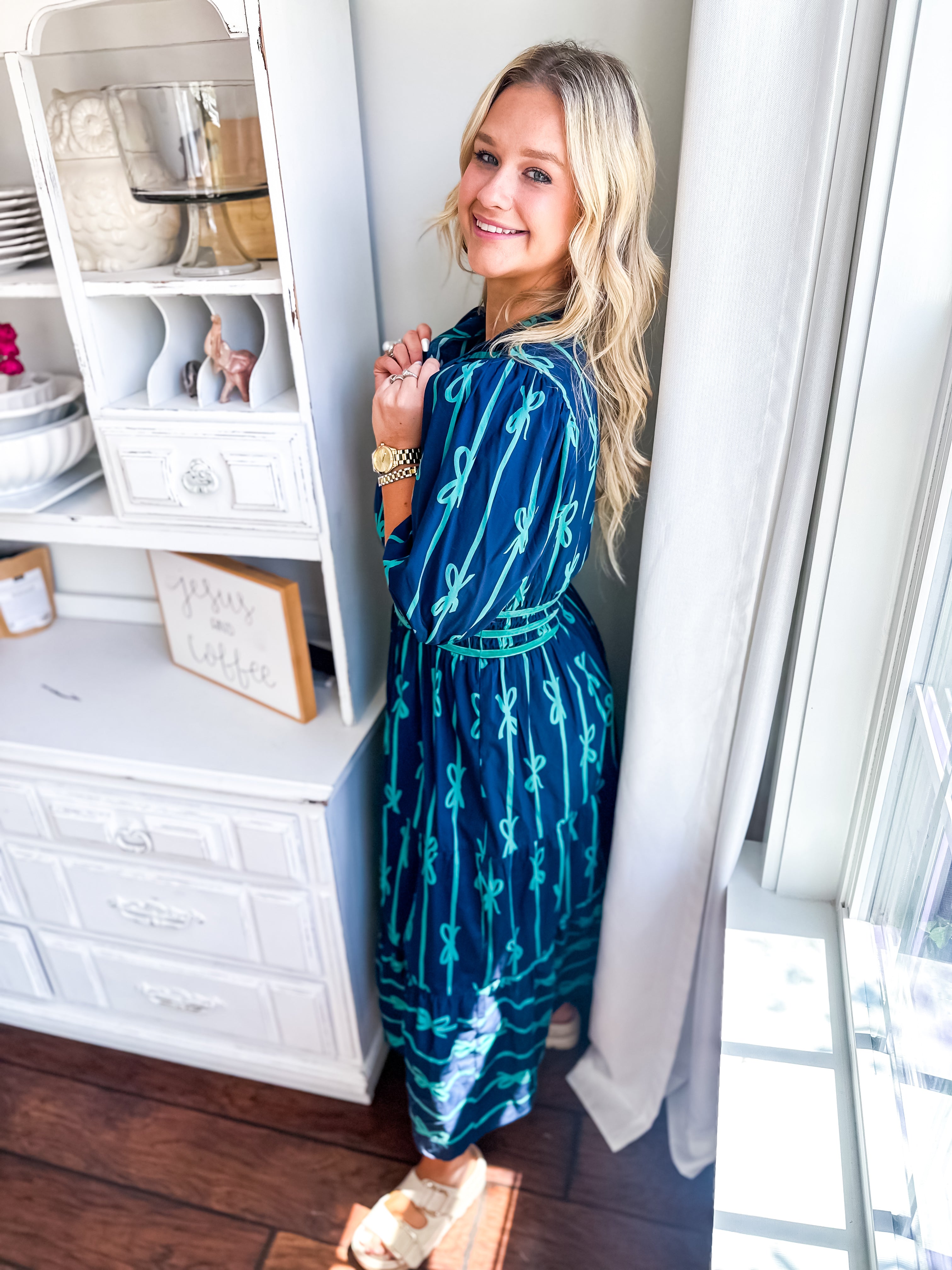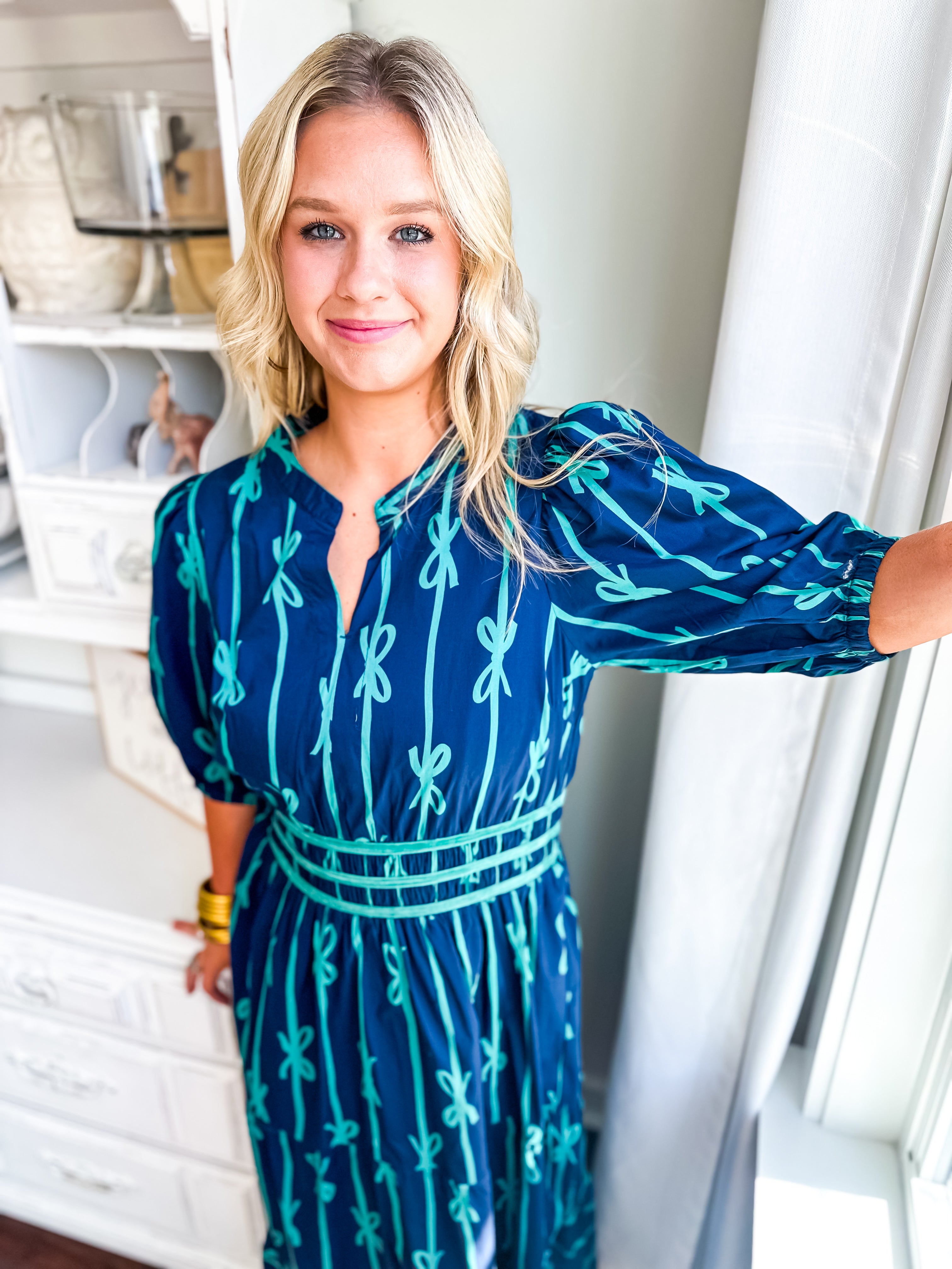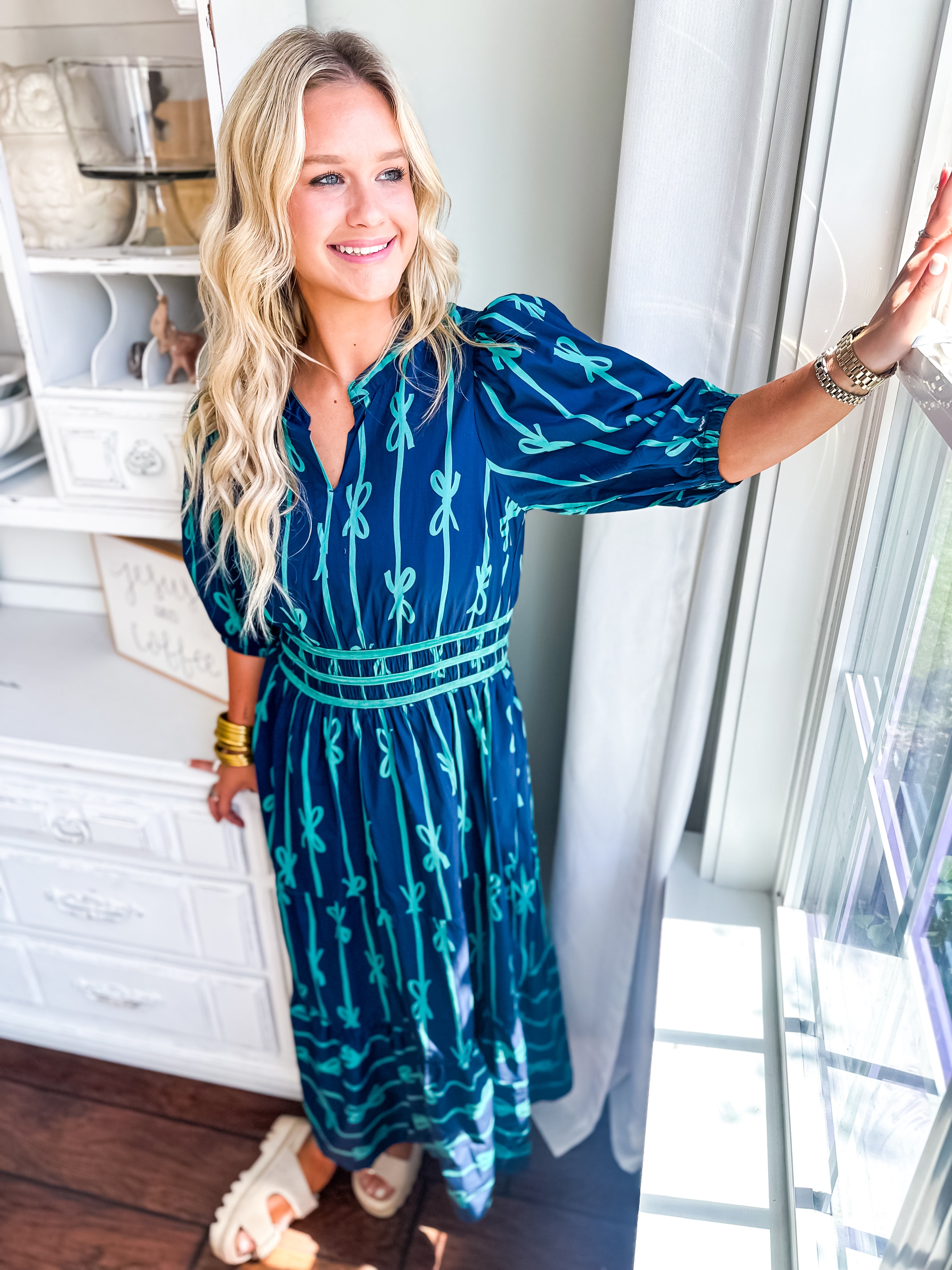 Embrace timeless coastal charm with our beautiful Nautical Noir Midi Dress. It captivates a blend of elegance and nautical flair. Crafted on a navy base. This dress is adorned with chic green bows throughout adding a touch of whimsy and sophistication. The slight puff sleeve design features delicate puff detailing along the sleeves, evoking the gentle look. It features a drop-hem ruffle at the bottom of the dress adds movement and grace, mirroring the fluidity of the sea. Whether you're strolling along the boardwalk or attending a beachside soiree, this dress exudes effortless chic, making it a standout choice for any coastal occasion.
