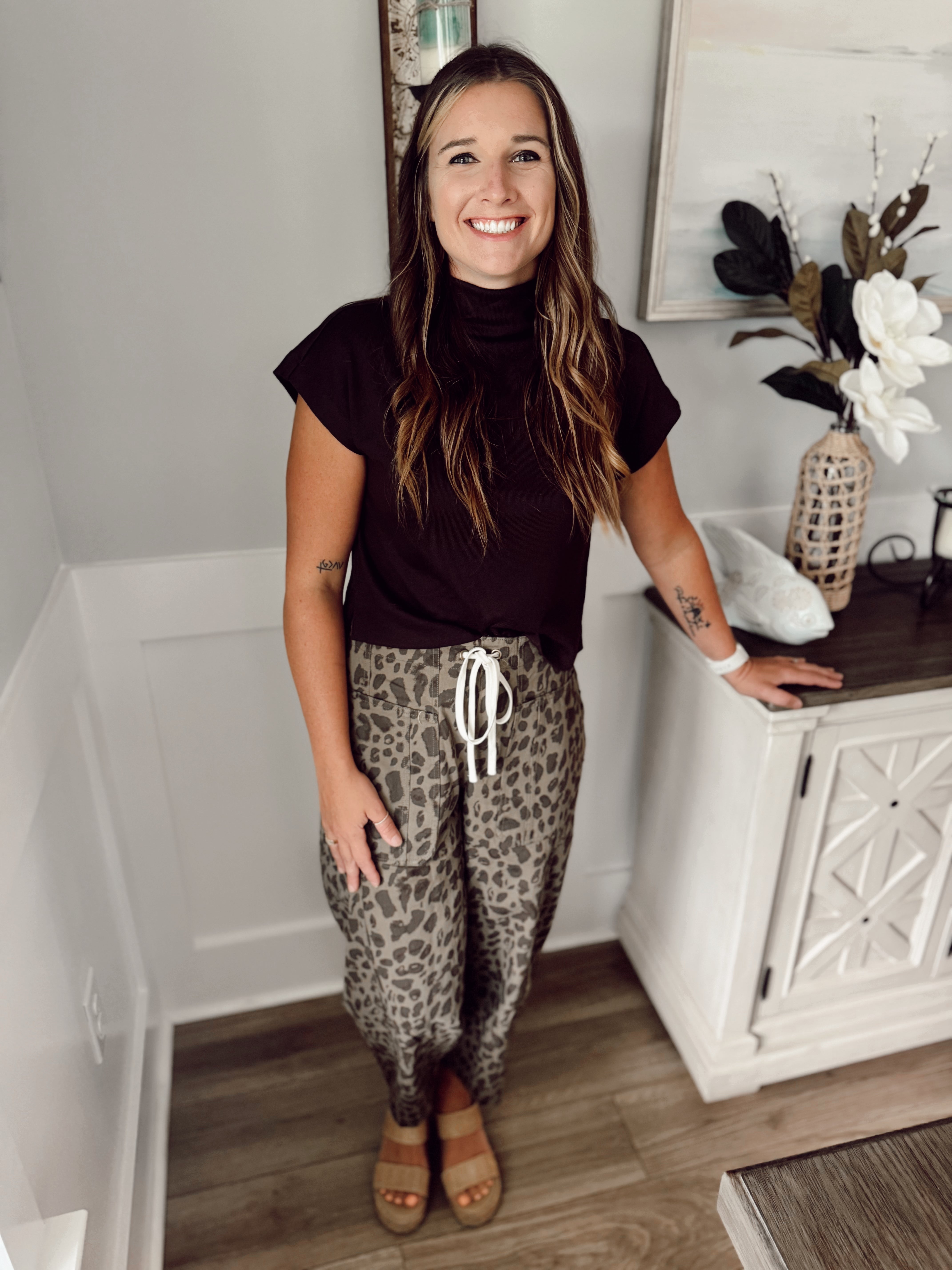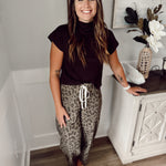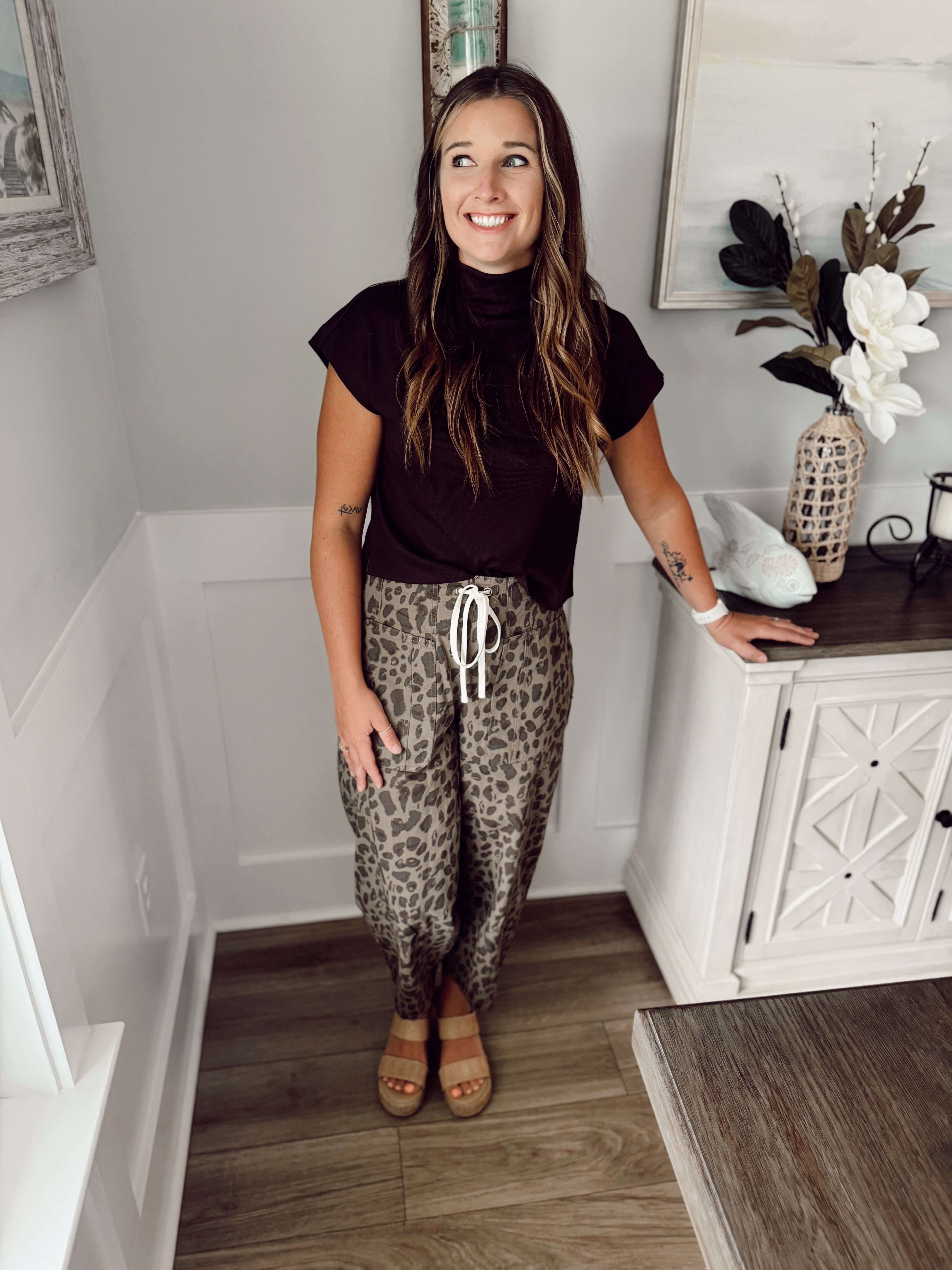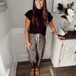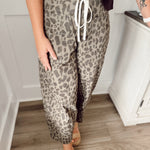 Abstract leopard pattern mid-rise ankle length pull-on balloon pants. Elastic back waistband with front adjustable drawstring tie. Front and back patch pockets. Unlined. Woven. Non-sheer. Midweight.
