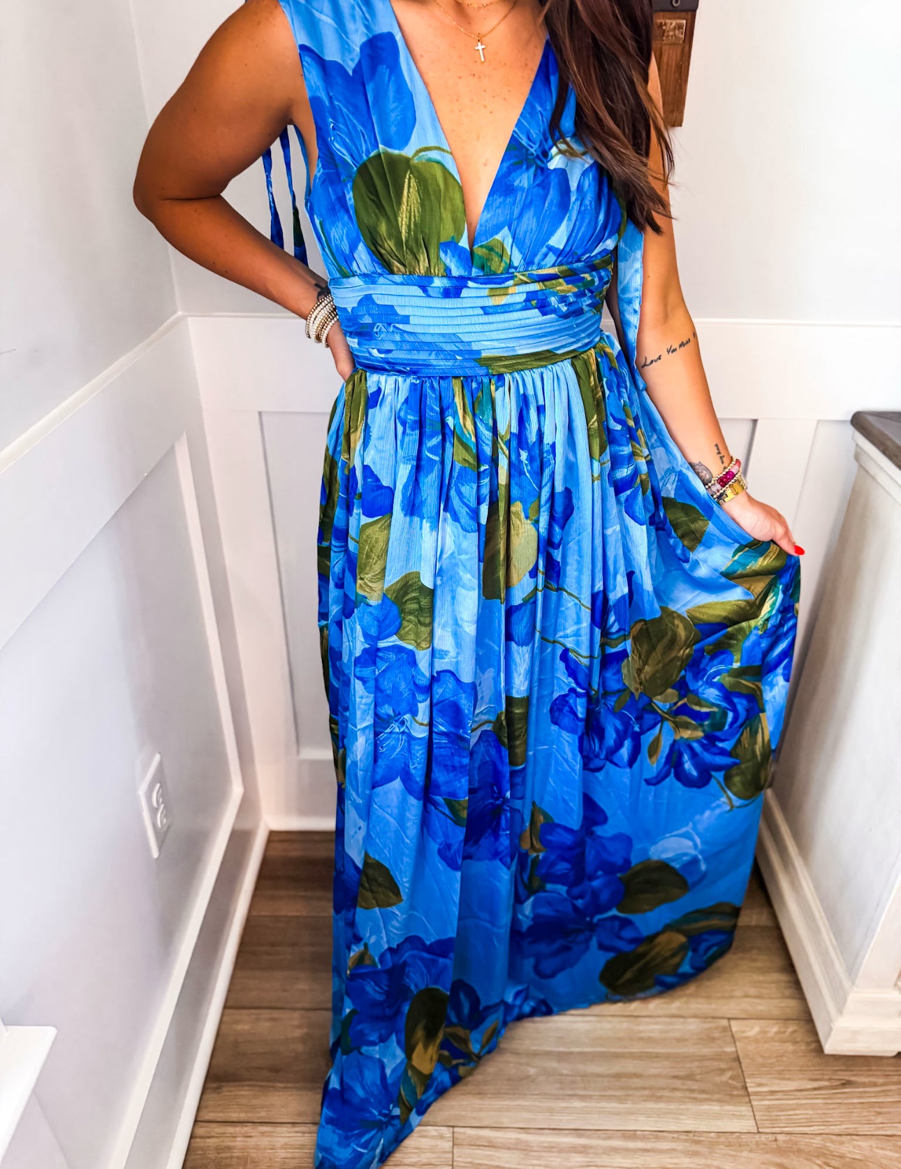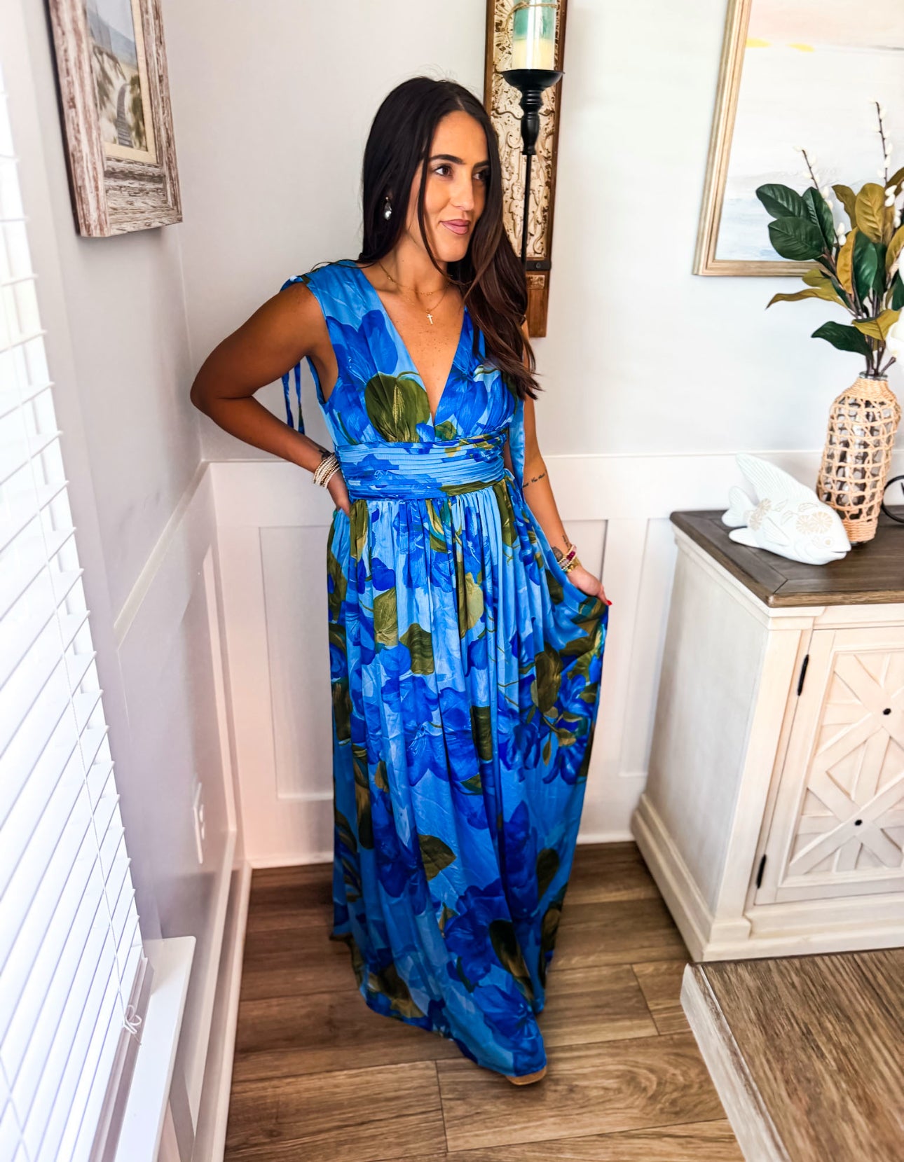 The Neiva Floral Descanso Pleated Maxi Dress is the perfect party dress for warmer weather! Ruched shoulders top a plunging V neckline. A pleated flat waistband creates a cinched waist and sits atop an ethereal, gathered maxi skirt. Add on any heels to match this stunning dress! - Plunging V neckline - Lined - Zipper - Pleats
