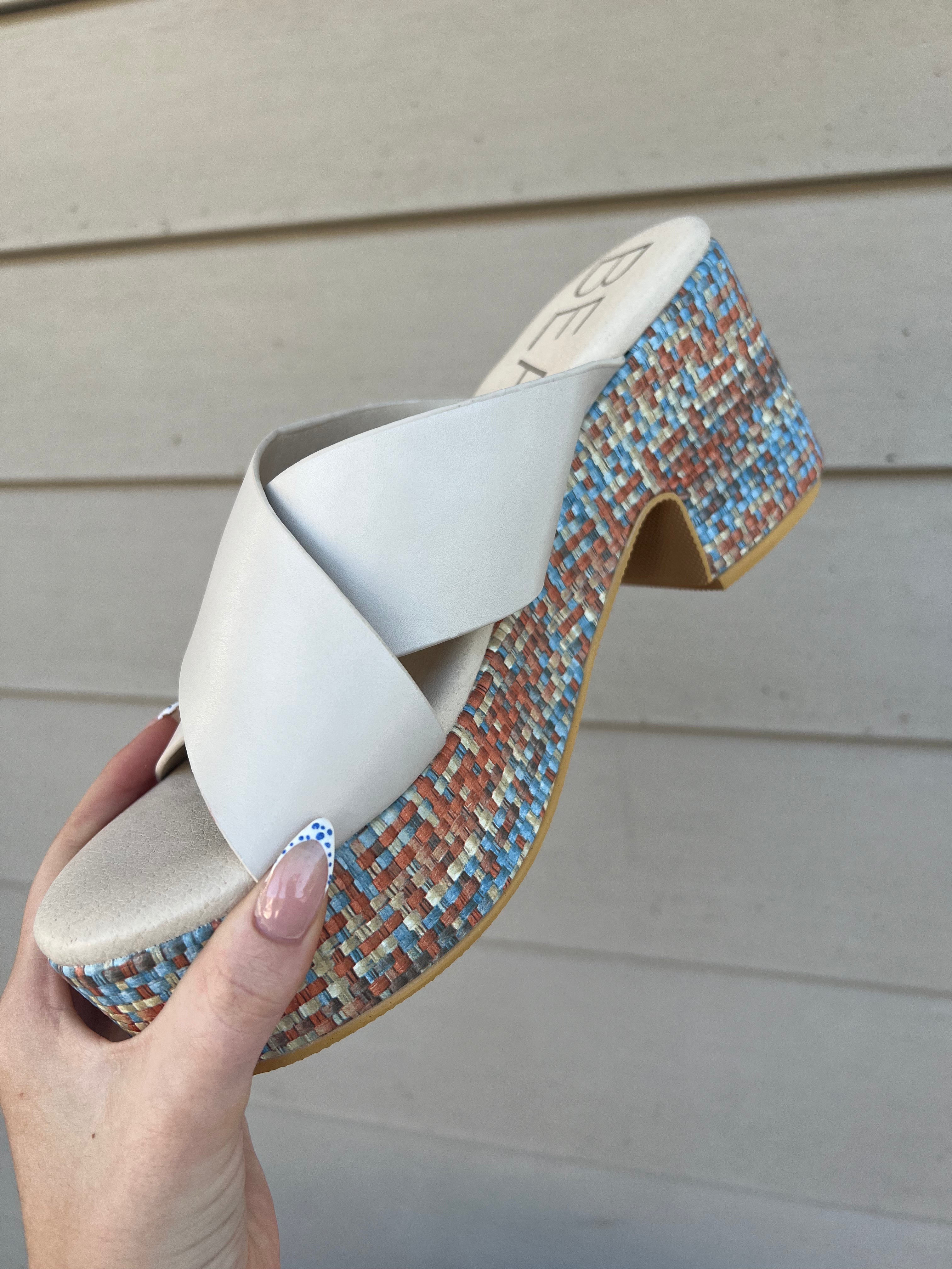 Vegan, criss-cross sandal on a chunky platform heel.