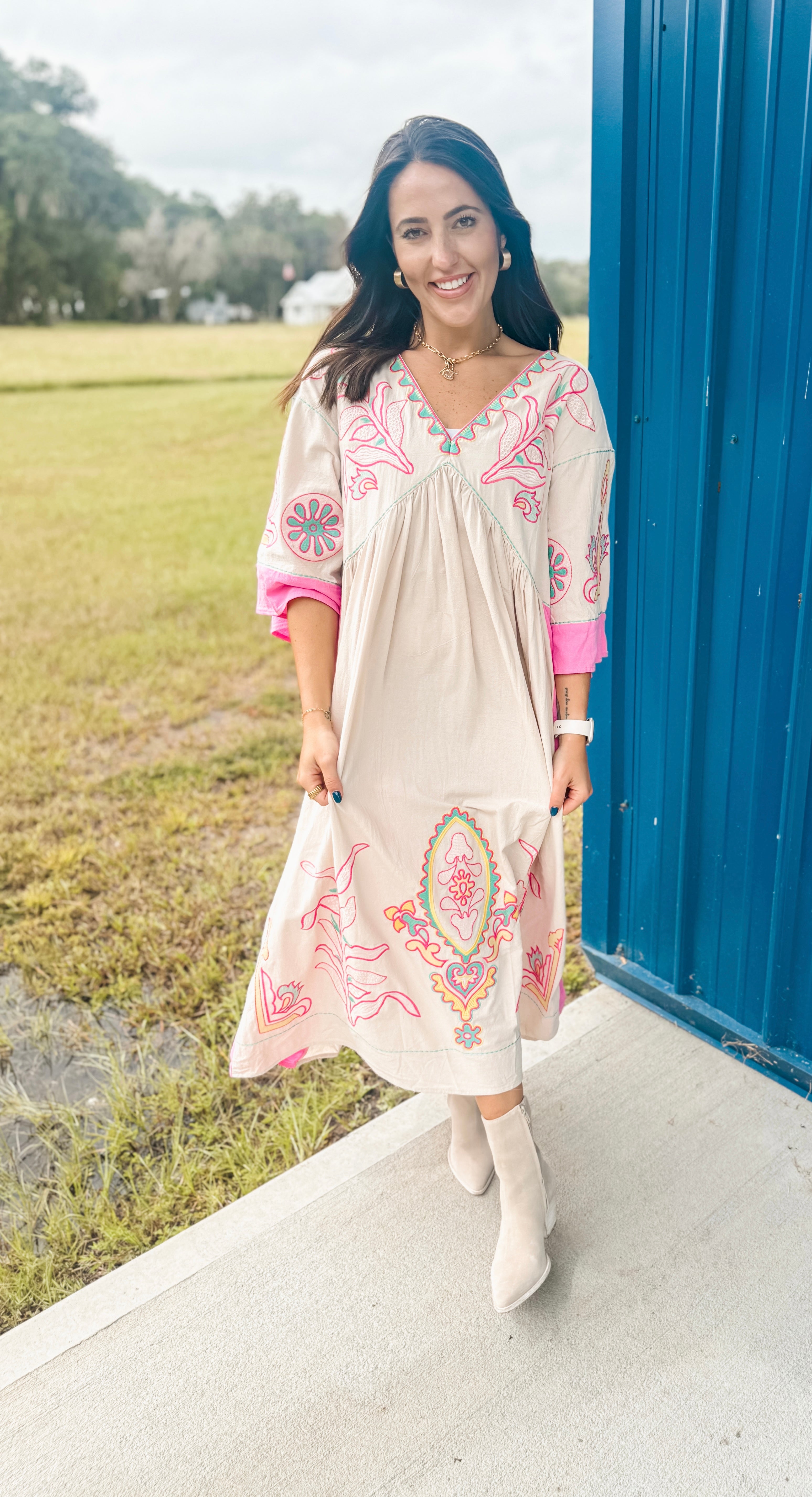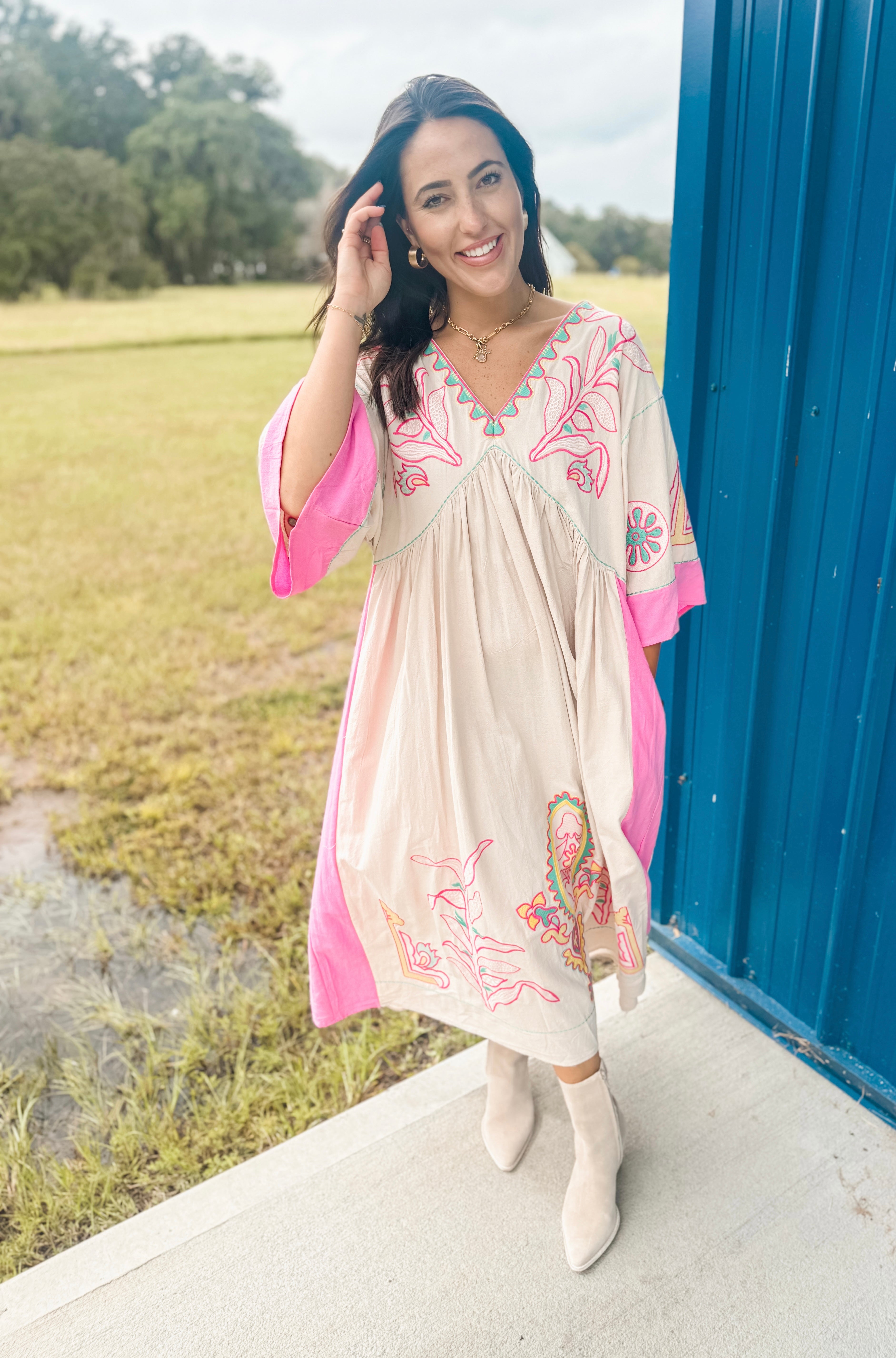 Everyone's favorite dress is now in midi form. Deep V Neck Midi Dress. Features a mid sleeve length - great for all year around.