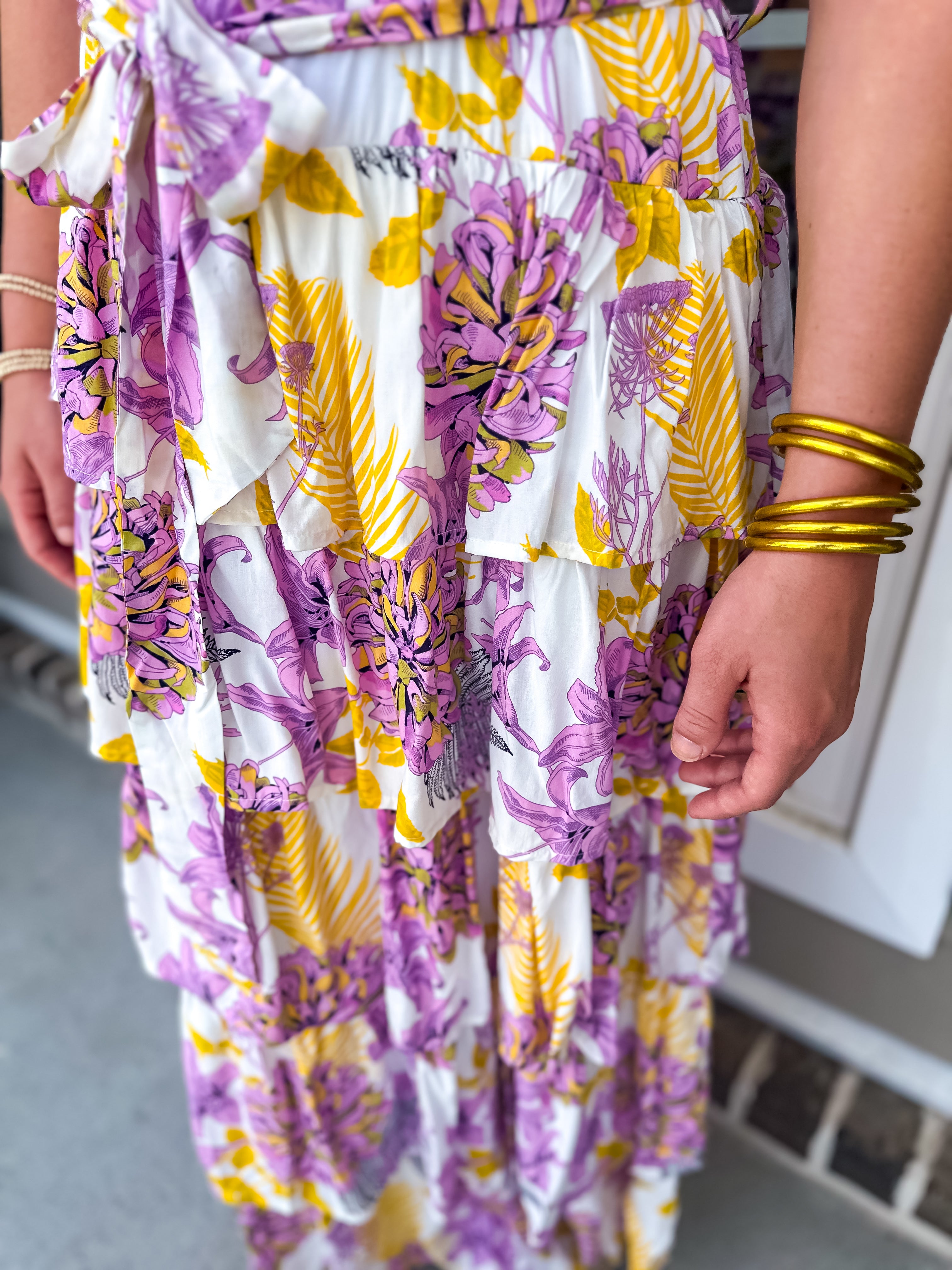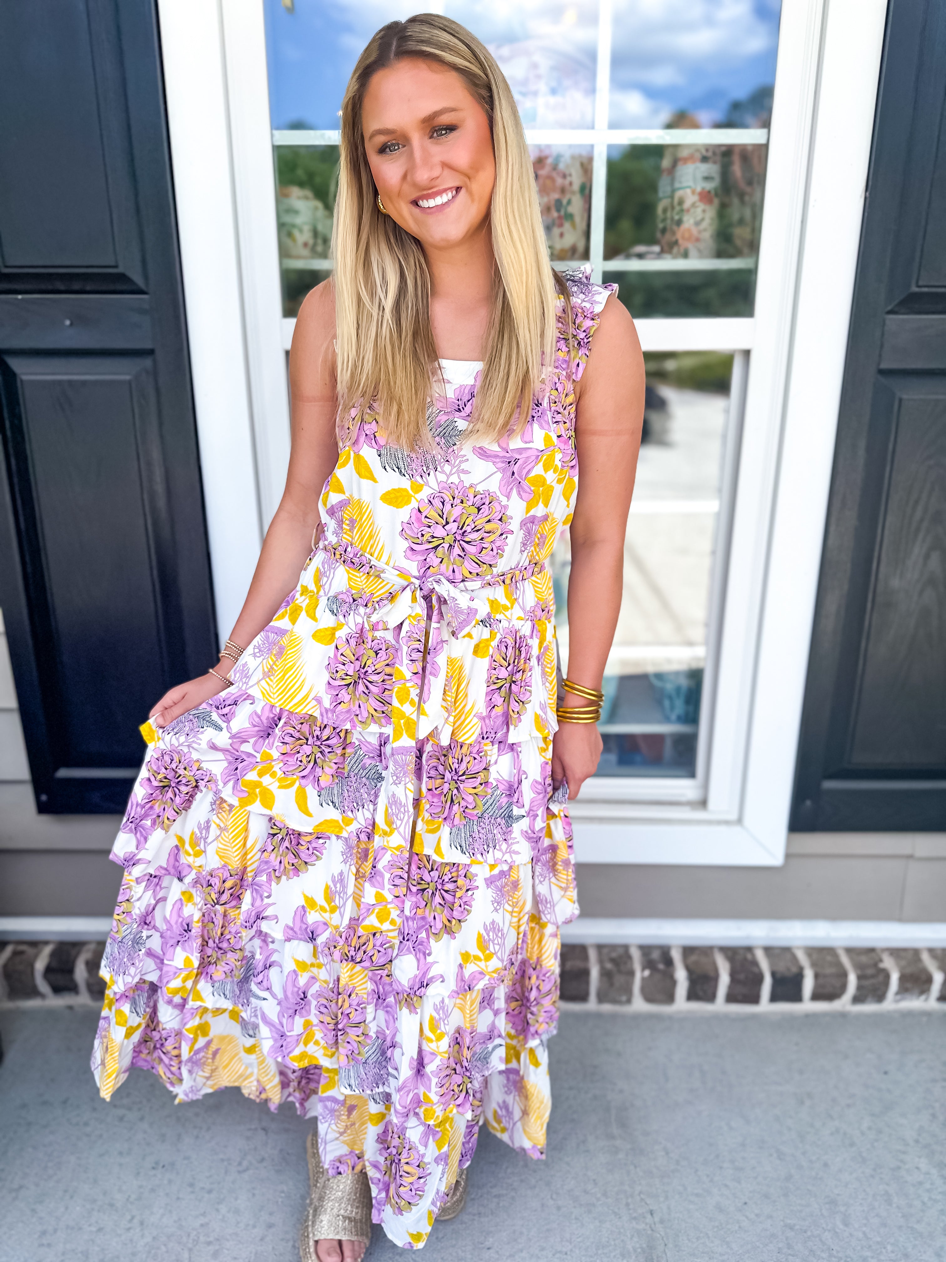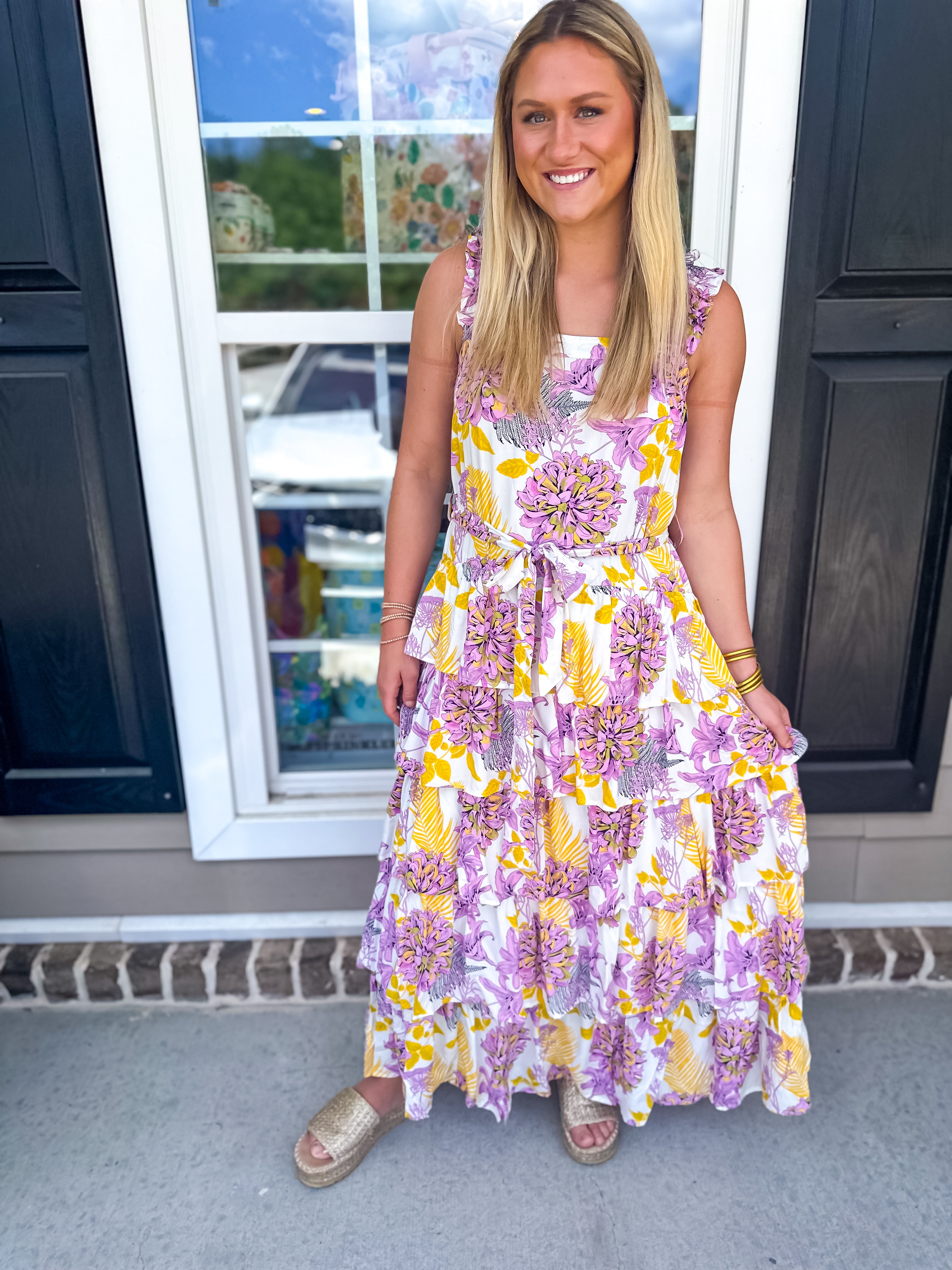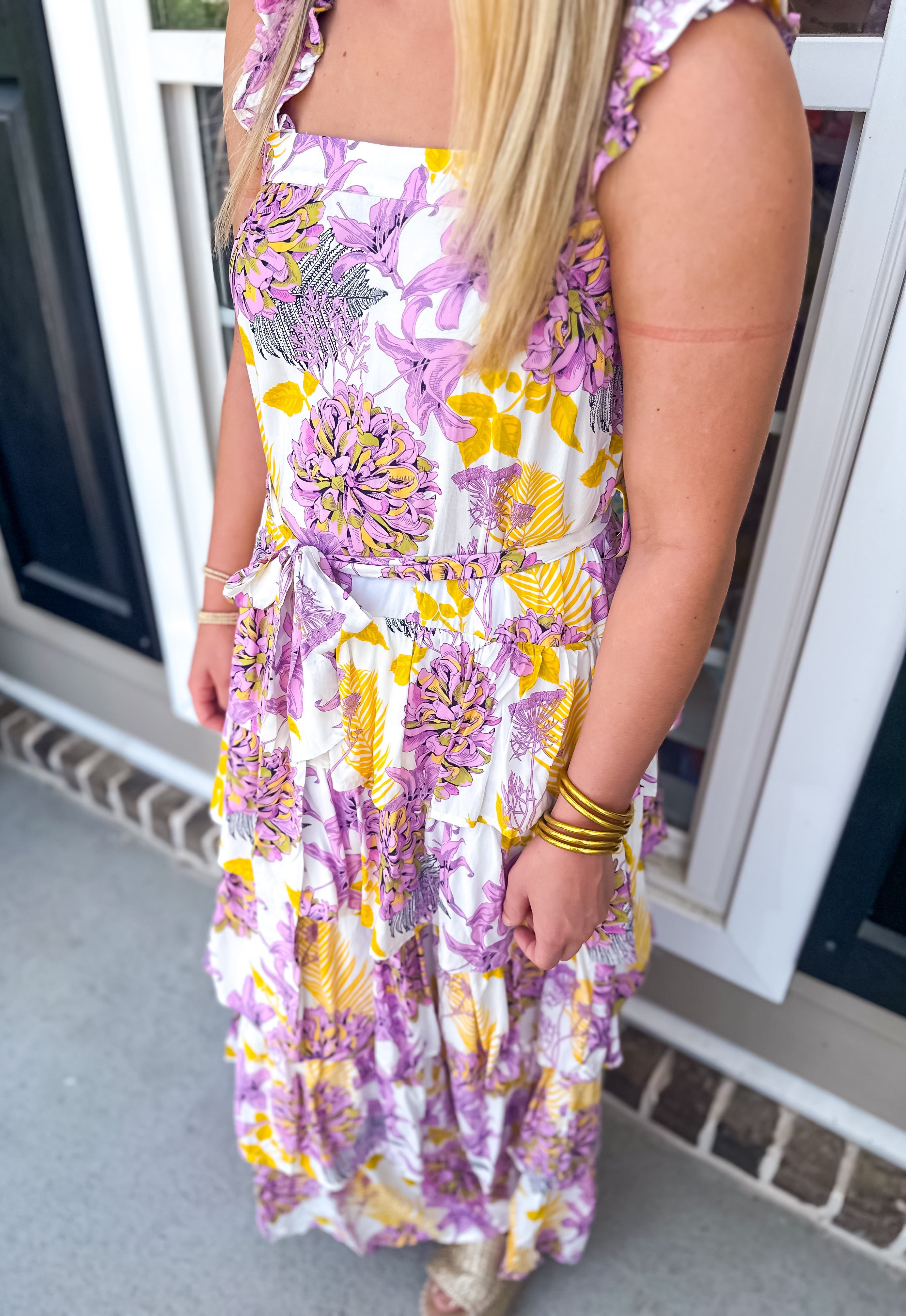 Printed square neck sleeveless midi dress featuring self tie at waist. Belt loops. Lined. Woven. Non-sheer. Lightweight.