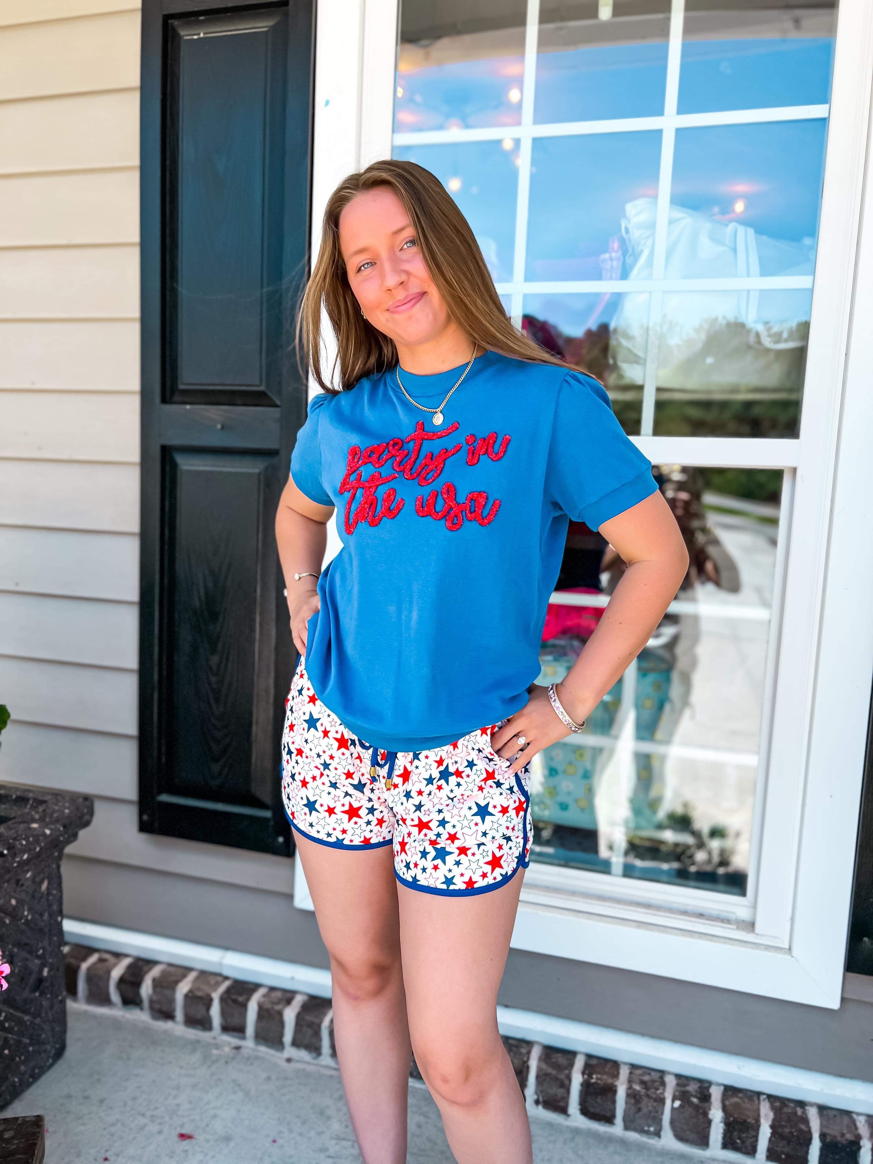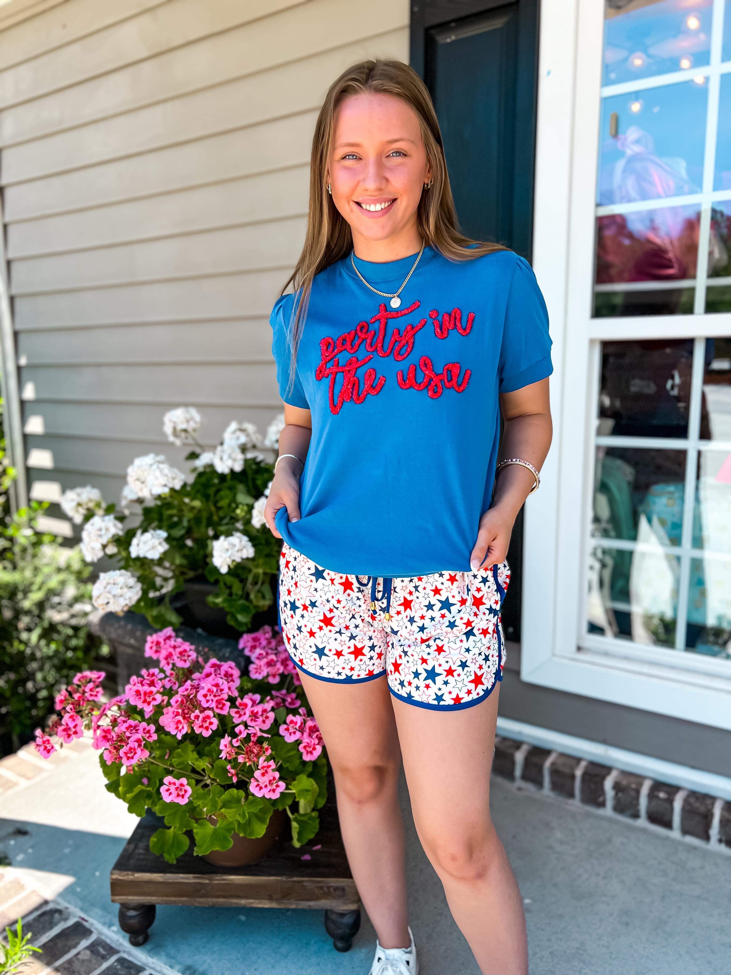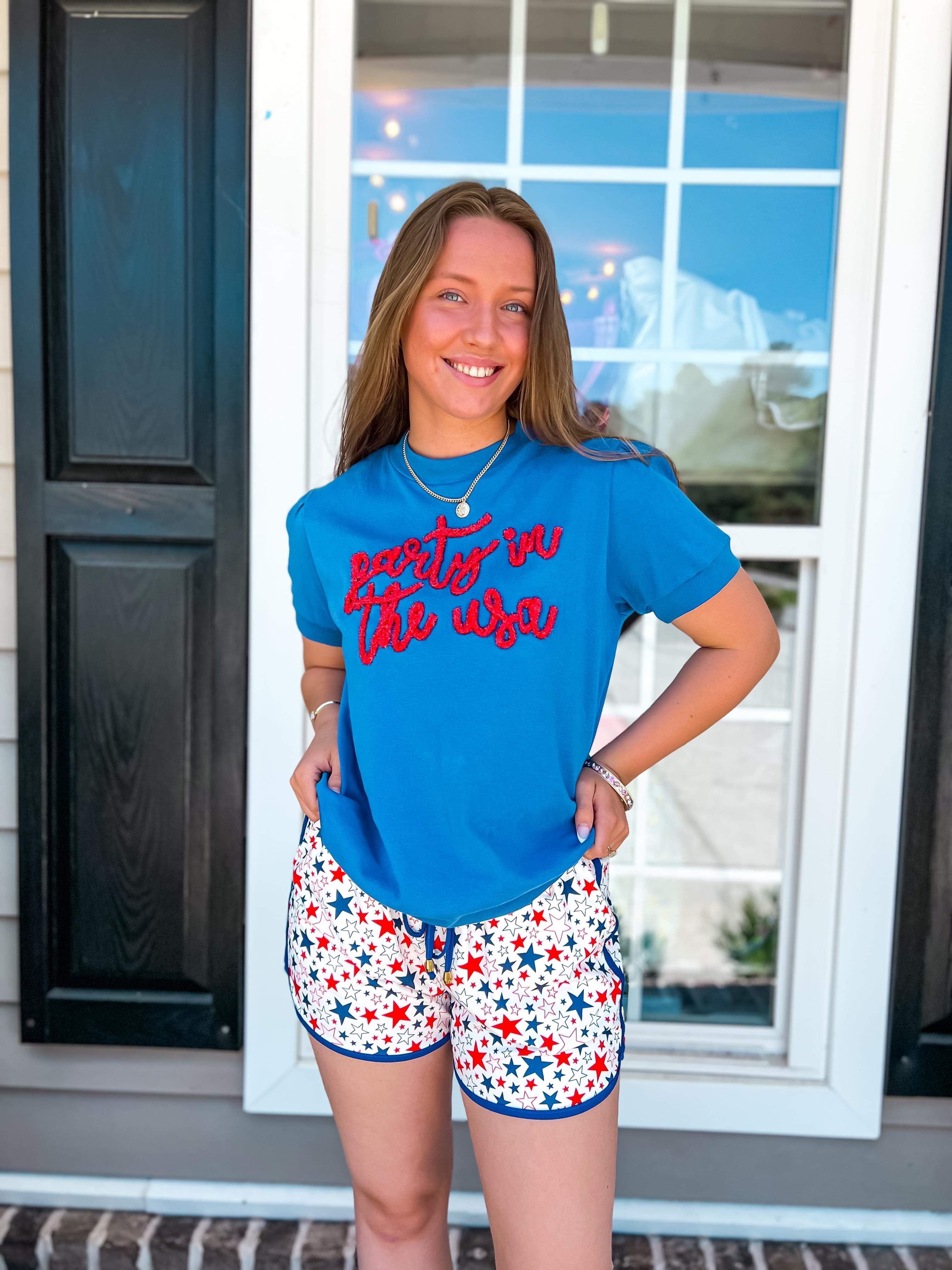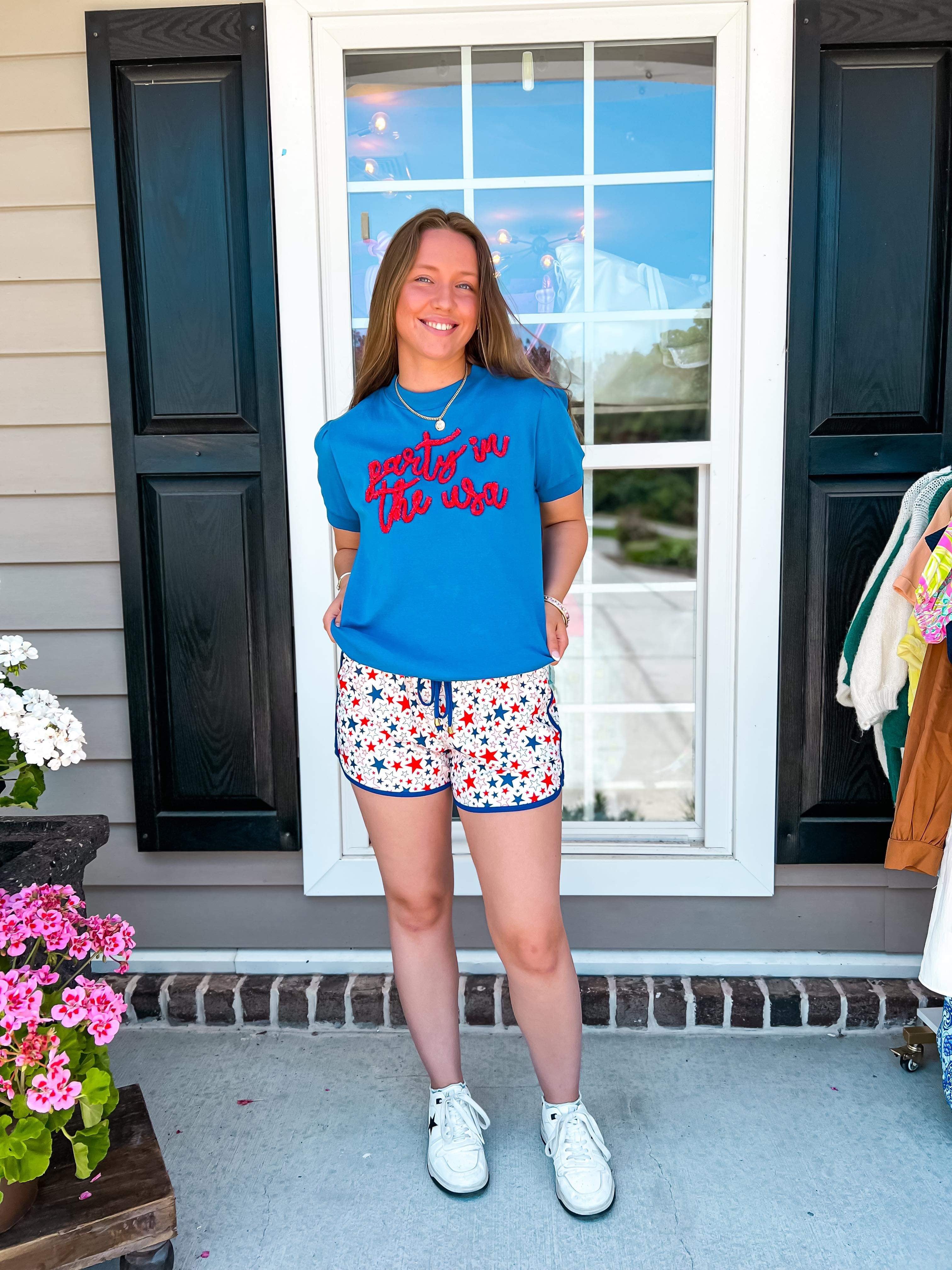 The perfect short for the 4th of July has arrived! These are great for casual wear and would pair perfectly with a t-shirt or tank top. These are an all white short with red and navy stars, along with an elastic waistband which does feature a drawstring.
