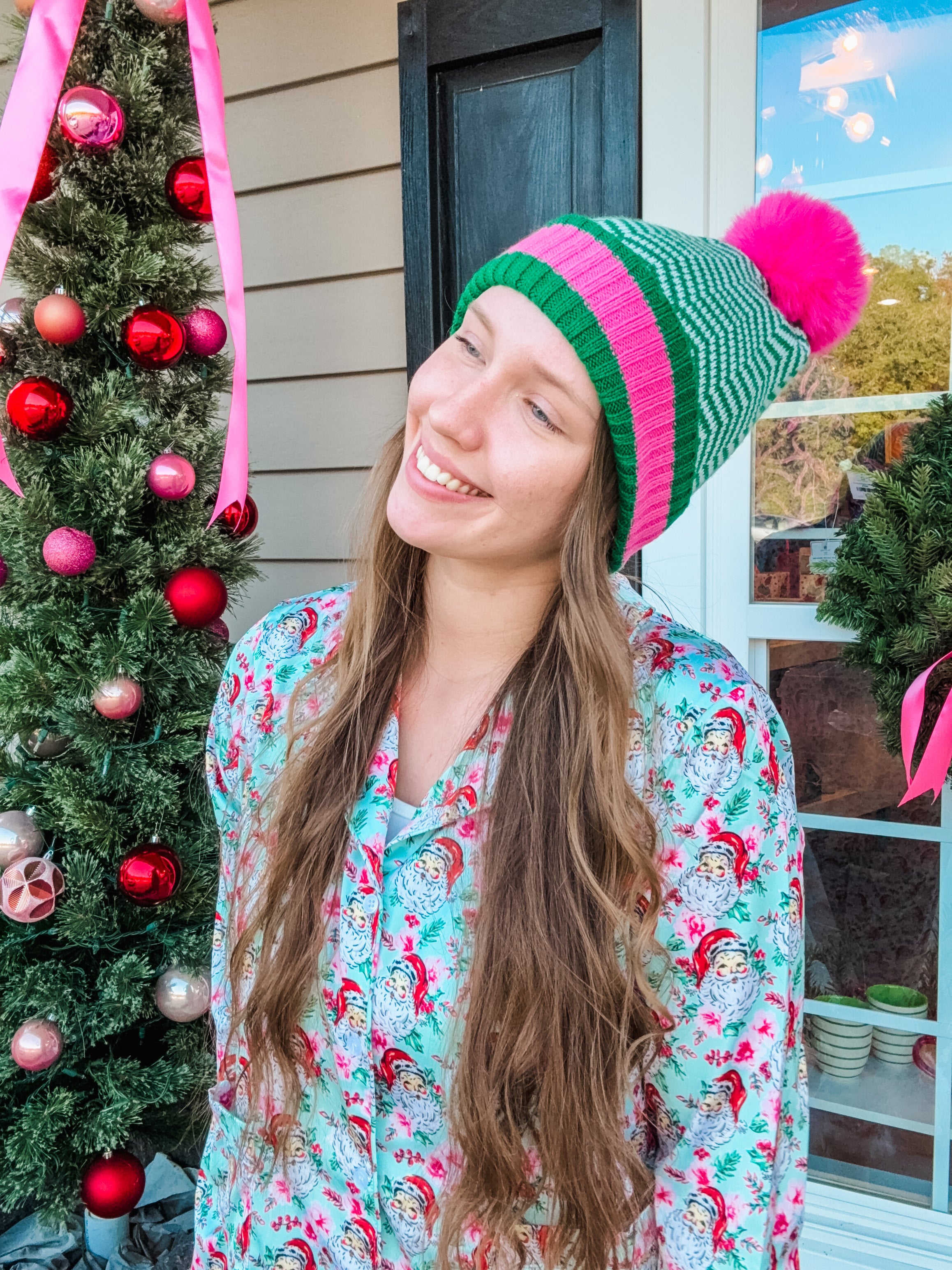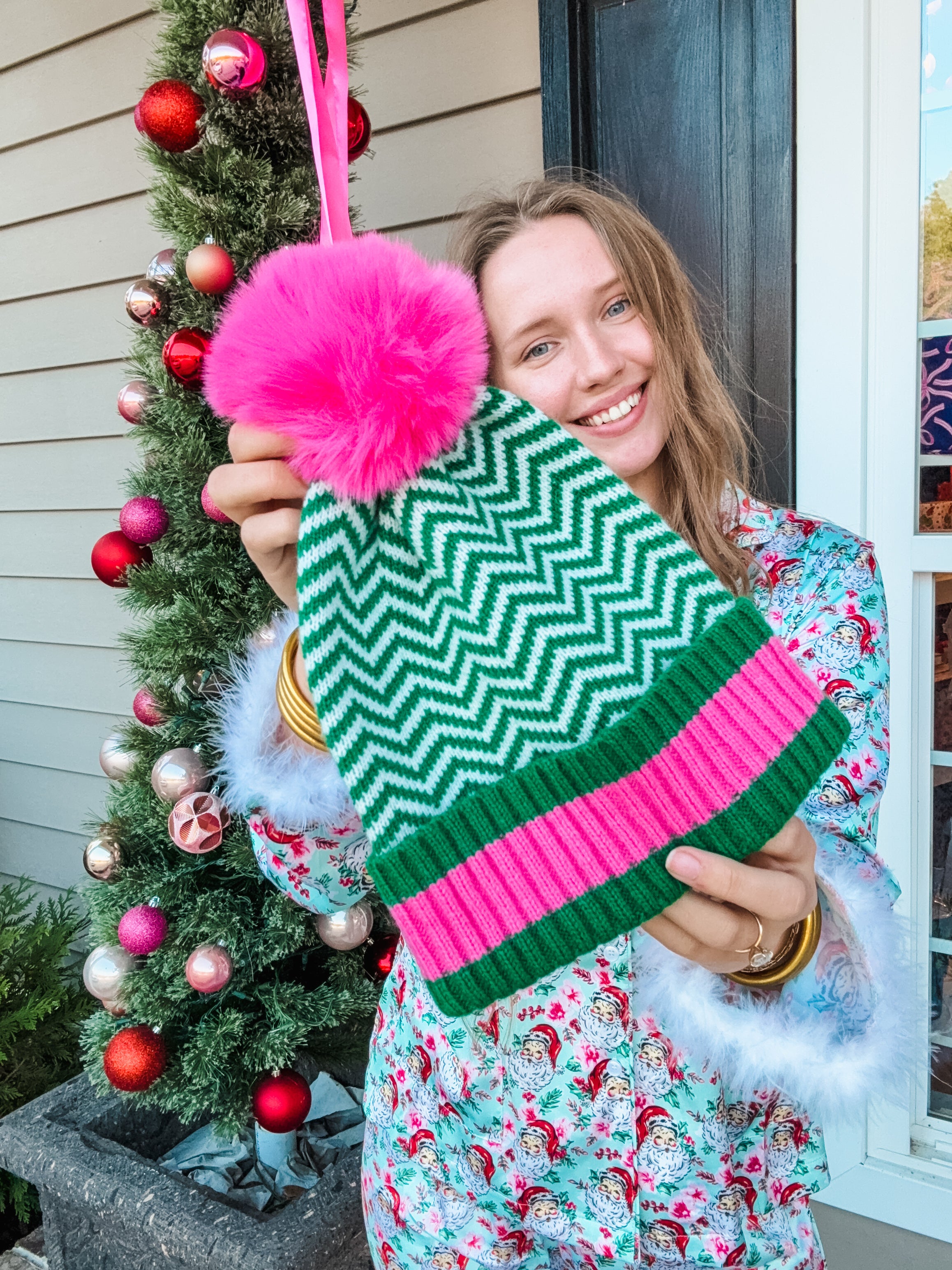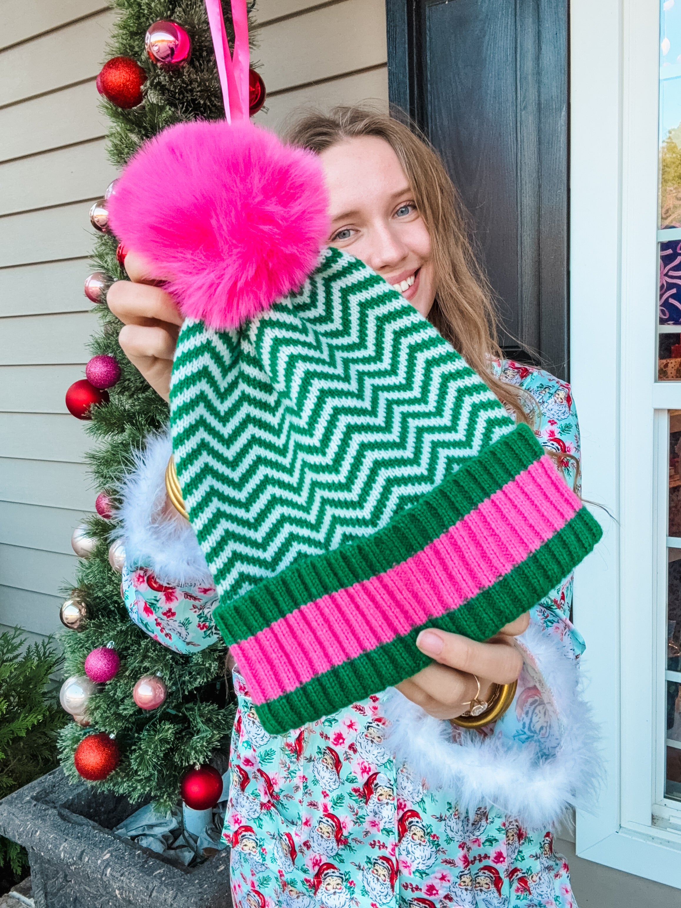 Add a unique blend of color and pattern to your neutral winter outfits with Shiraleah’s Olivia Beanie. Made from a warm wool blend, this trendy pink and green hat is the perfect combination of comfort and style. The green body of the hat features a fun white zig-zag pattern with a thick pink stripe by the hem and a bright pink top pom detail. Pair with the matching Olivia Scarf and Olivia Touchscreen Gloves or with other items from Shiraleah’s collection to complete your cold weather look!