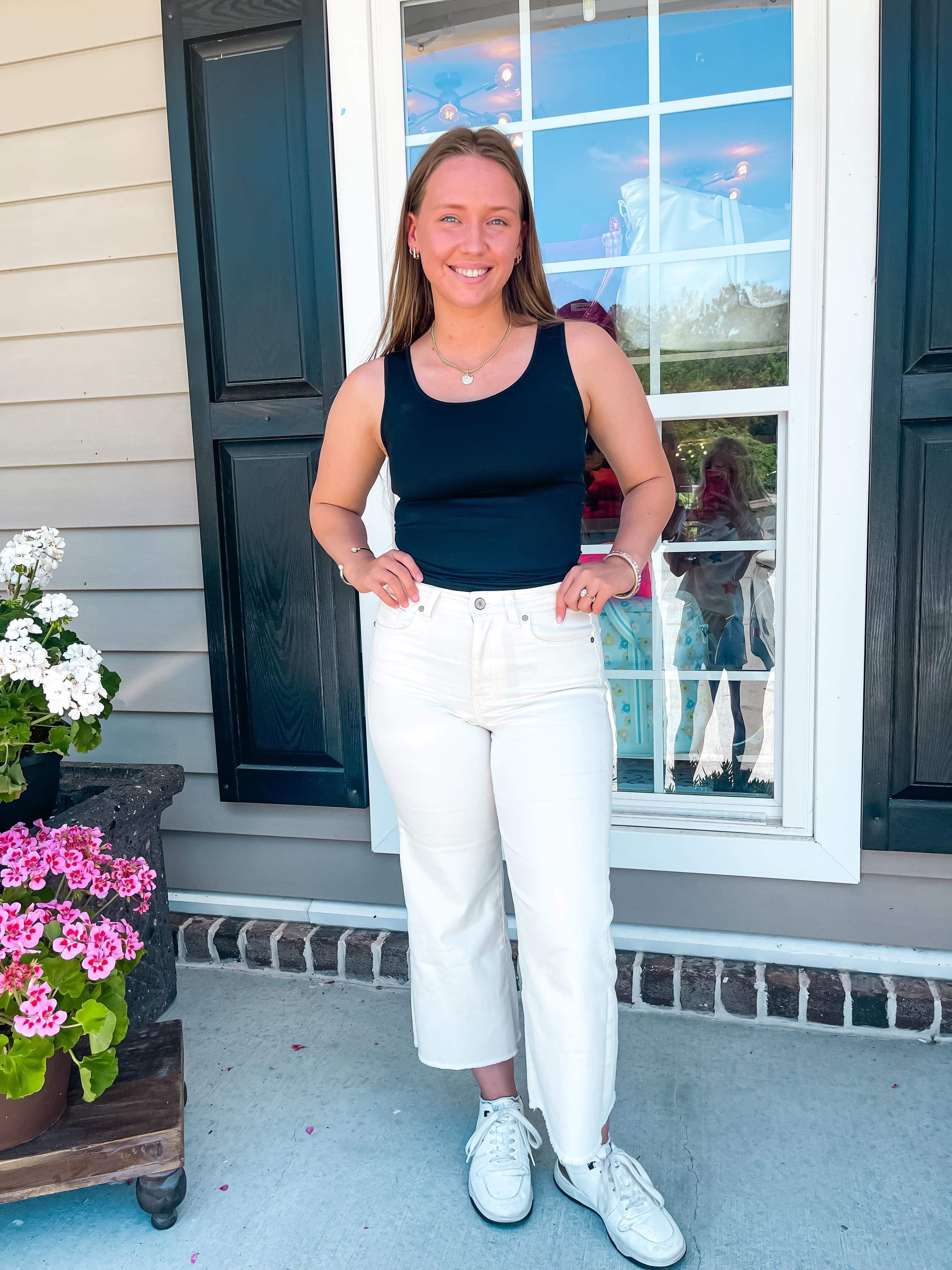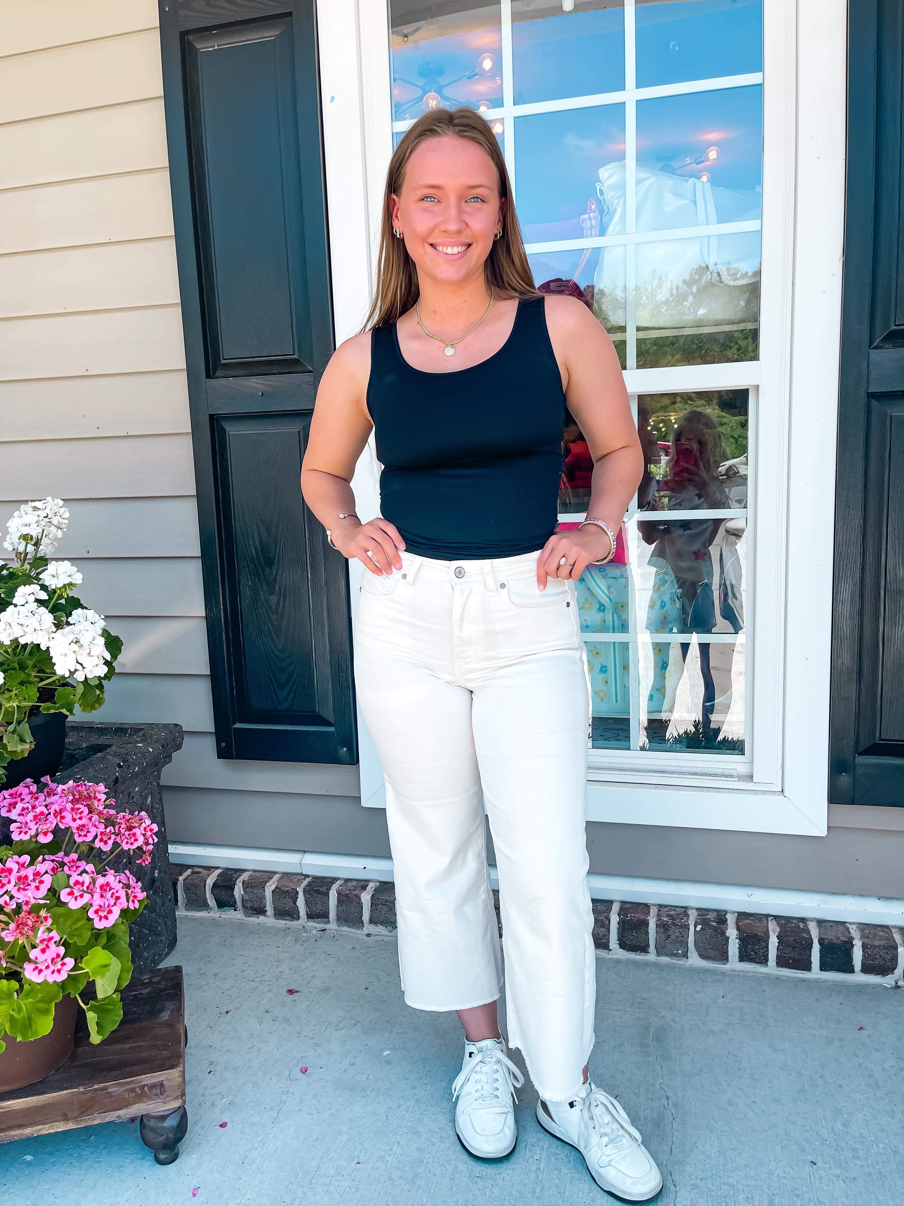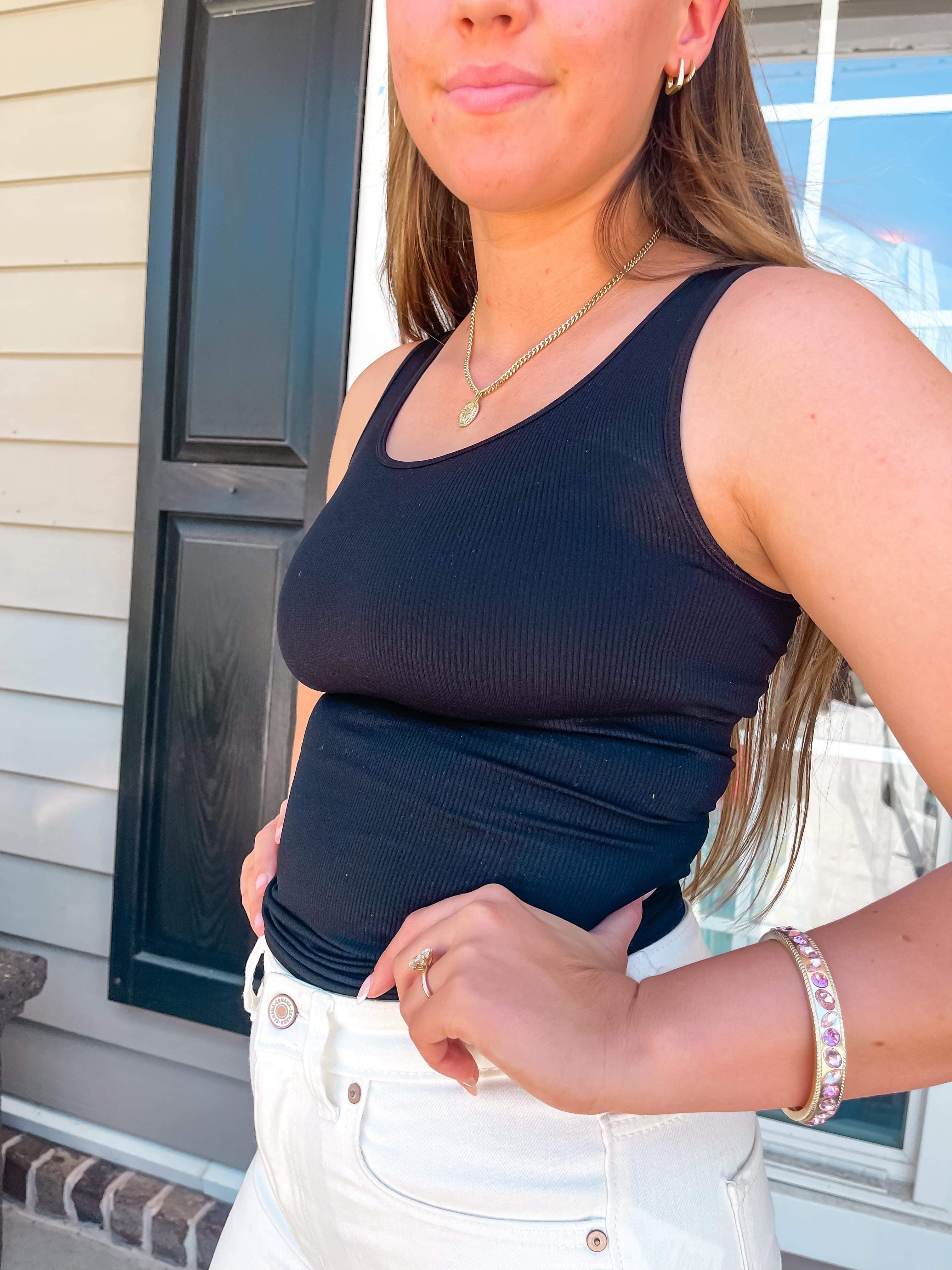 This round-neck ribbed tank is an essential for your wardrobe. This is the perfect cami to wear under lower cut clothing, or if you need something plain that will pair with anything. This tank is one sized and has plenty of stretch.