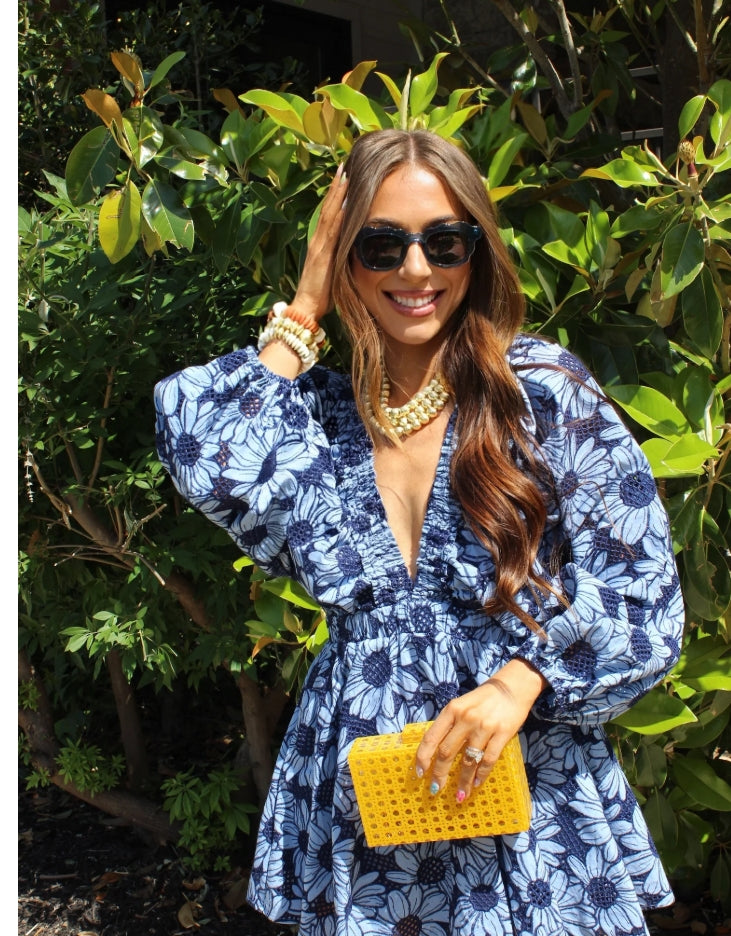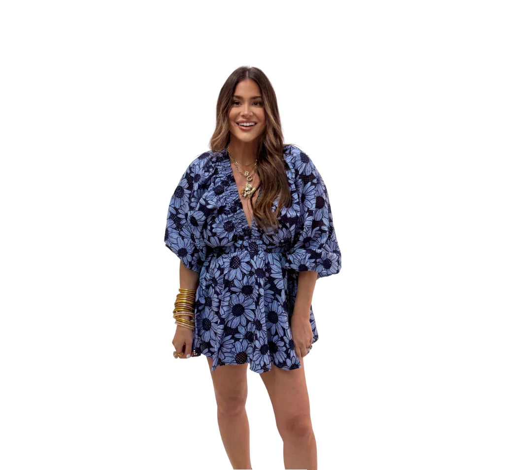 Feel perfect in the Palm Springs Mini Dress! Show off your girly side in the floral print , complete with a fabulously plunging V-neck, balloon sleeves, and a comfortable elastic waistband. No zippers or hooks needed - just slip it on and plunge into summer!