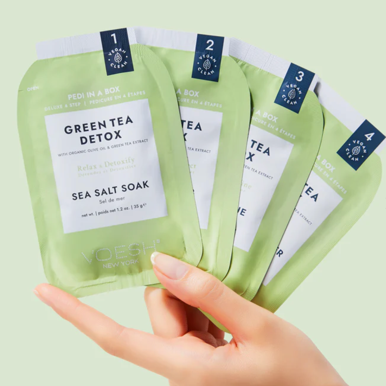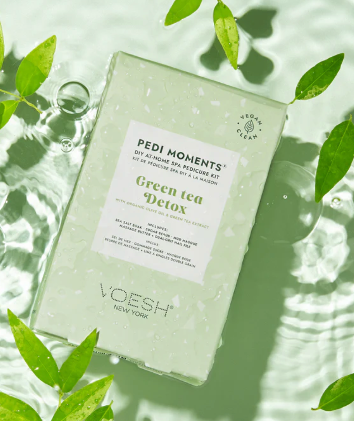 Indulge in self-care with Pedi Moments Green Tea Detox, a salon-worthy pedicure for the ultimate detox. It includes one green tea-scented pedicure kit and a dual-grit nail file, providing all you need for a nourishing, blissful pedi at home. The 4-step pedi treatment is a pampering journey: a detoxifying sea salt soak, a gentle exfoliating sugar scrub, a pore-cleansing mud masque, and a hydrating massage butter.