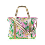 Whether you're headed to a day at the beach or lounging poolside, this Lilly Pulitzer cooler bag is perfect to pack all of your drinks, snacks, and sunscreen for your adventure. A thermal insulated interior keeps your food and drinks chilled, while the exterior boasts a bright print. A sturdy top handle, adjustable straps, roomy interior and exterior pockets make this the perfect on-the-go bag. Gold bamboo hardware and a matching logo plaque make it truly shine.