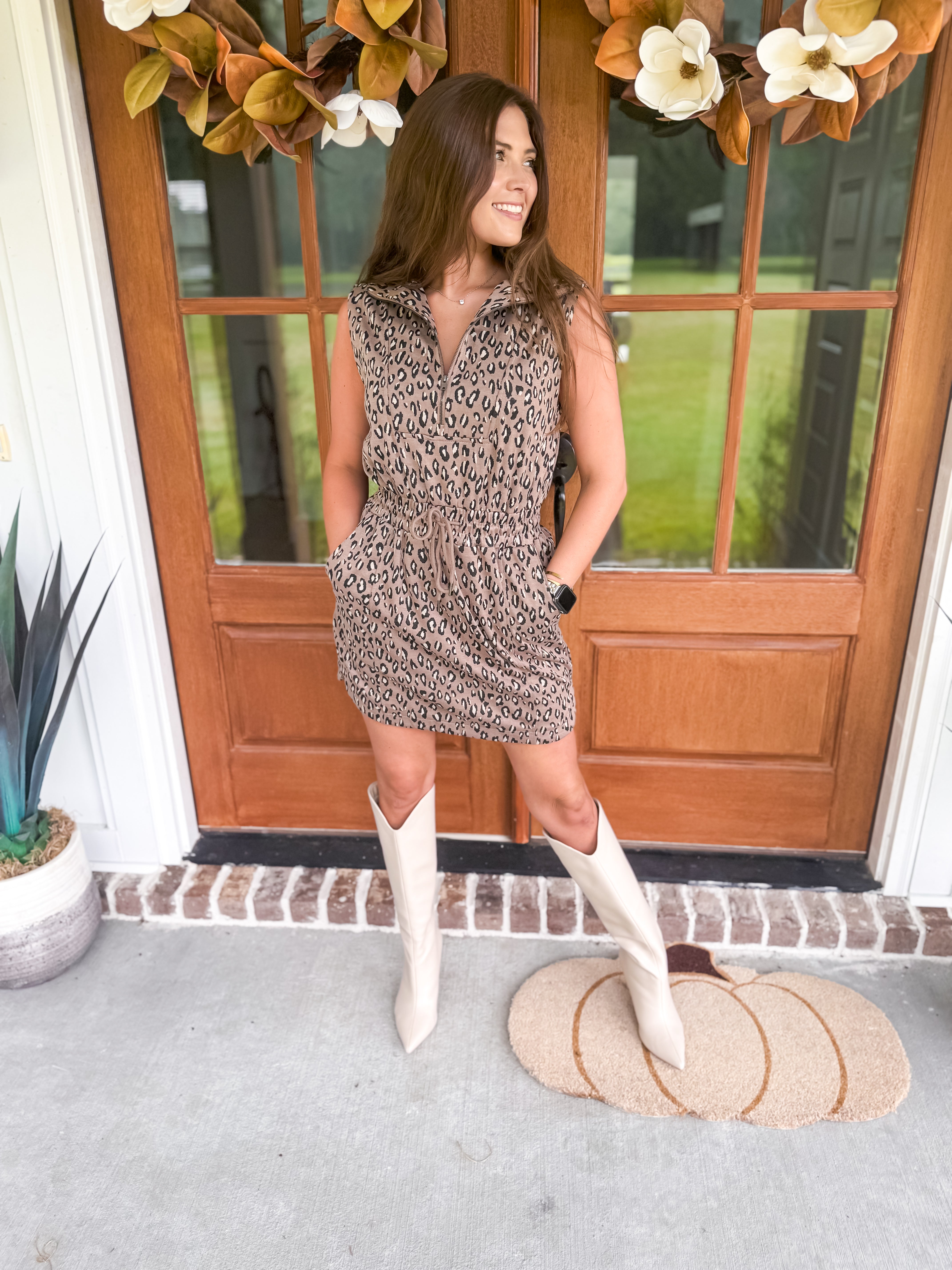 Make a statement in this leopard print mini dress, featuring a half zip, sleeveless design, and a collared neckline. The adjustable drawstring waist and pockets add both flair and functionality to your look.