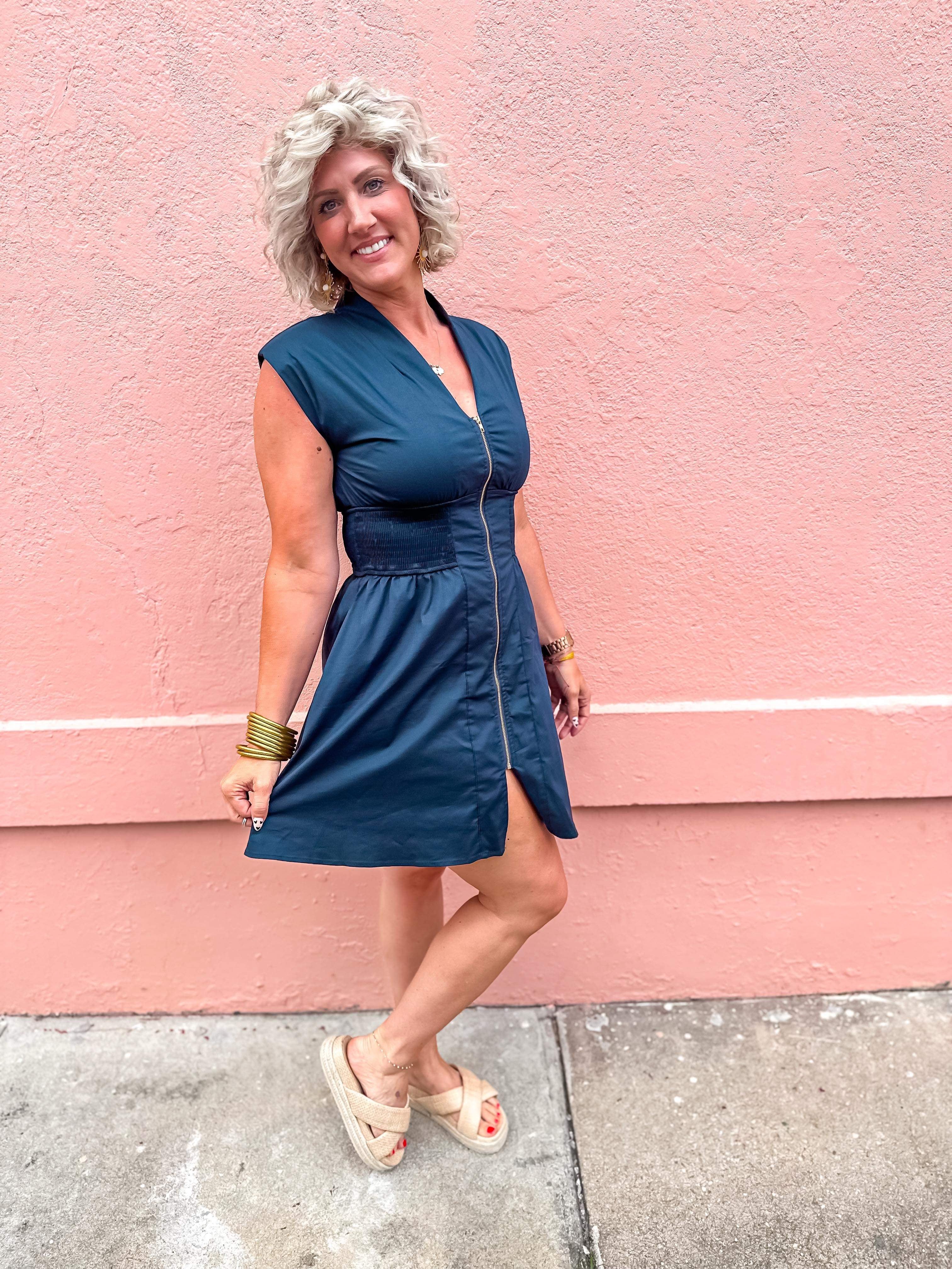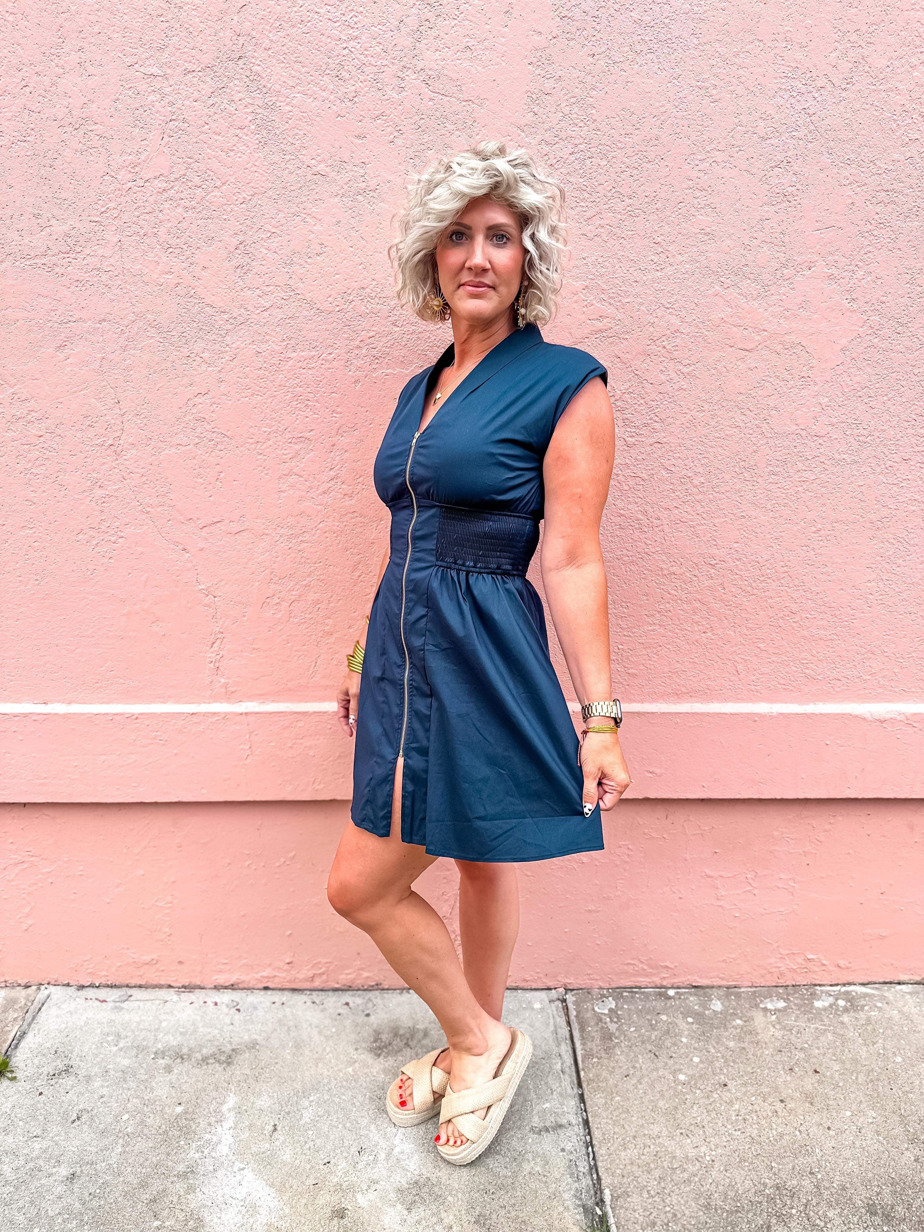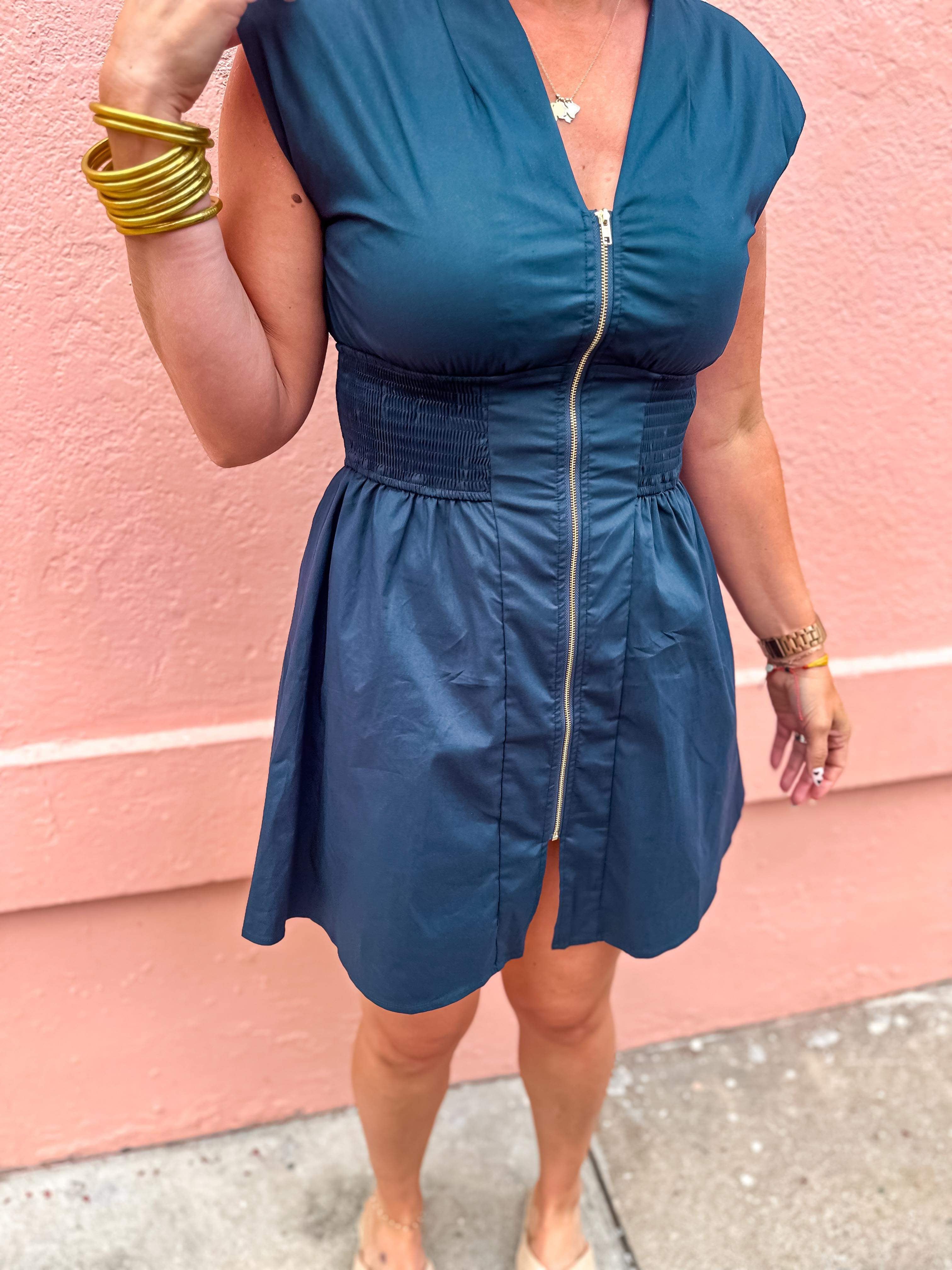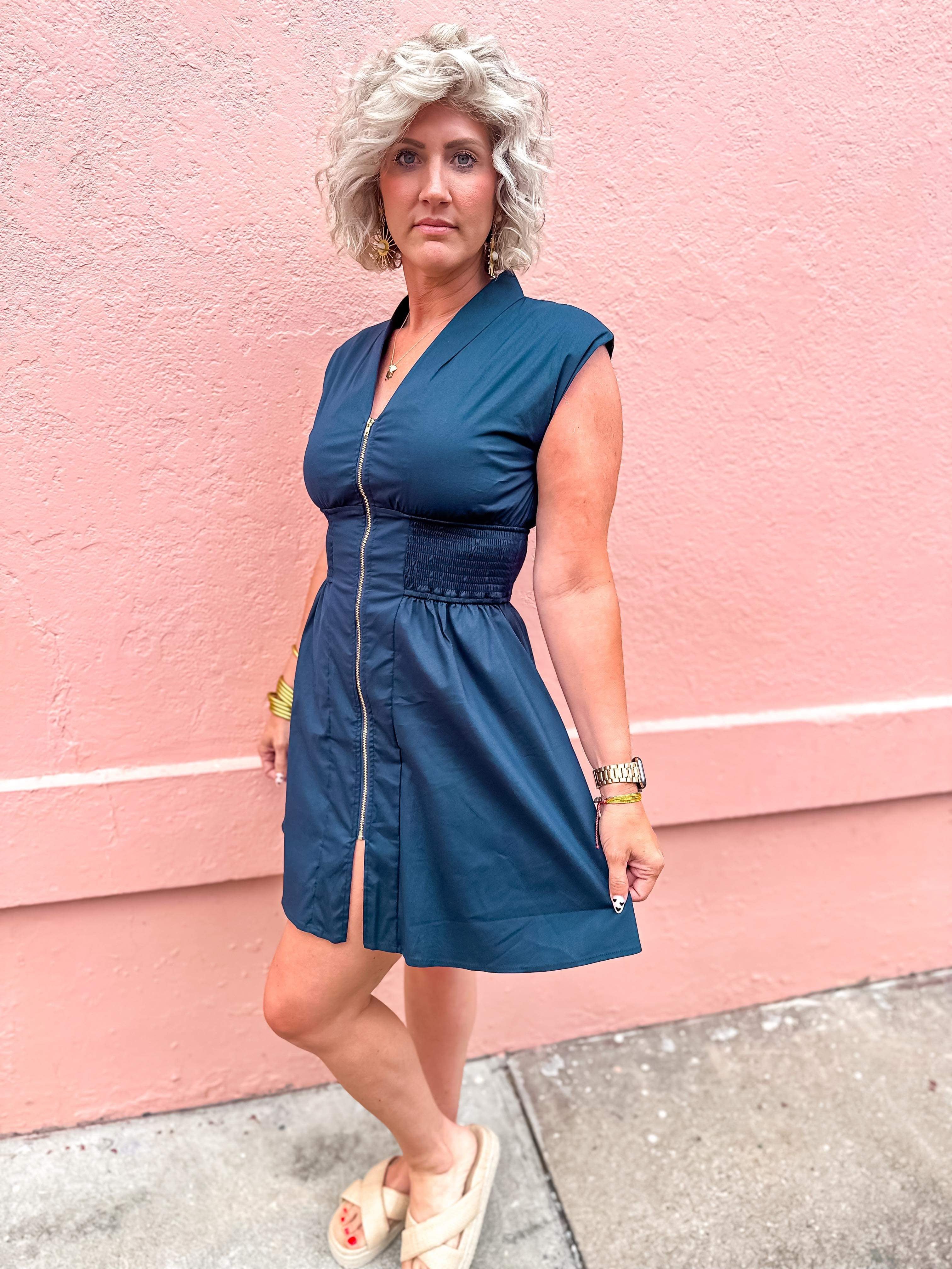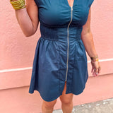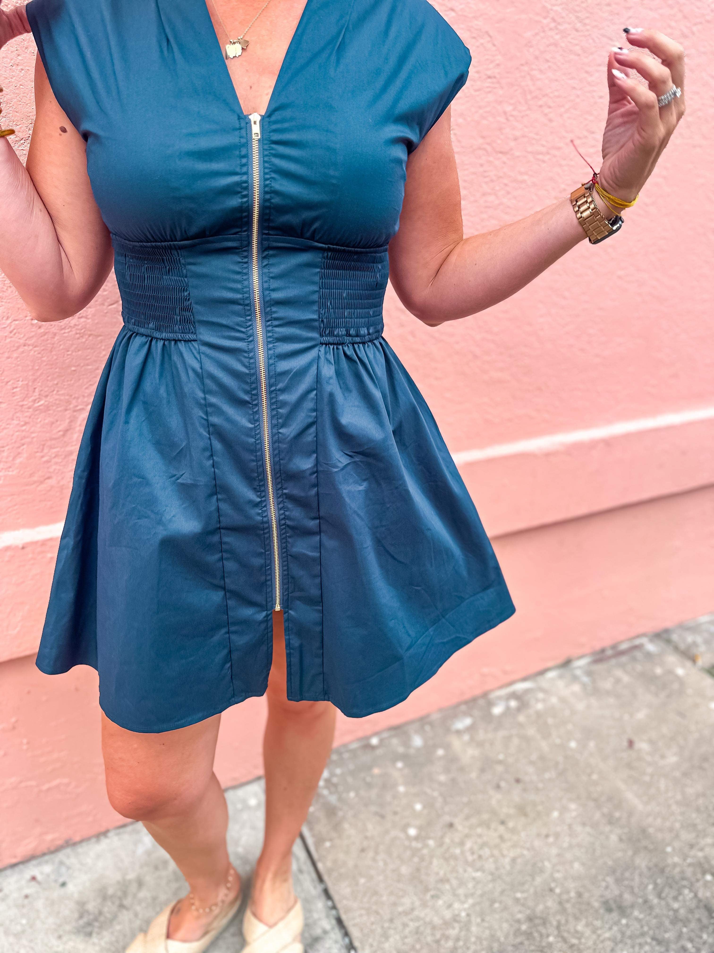 V-Neck Smocked Front-Zip A-Line Mini Dress