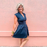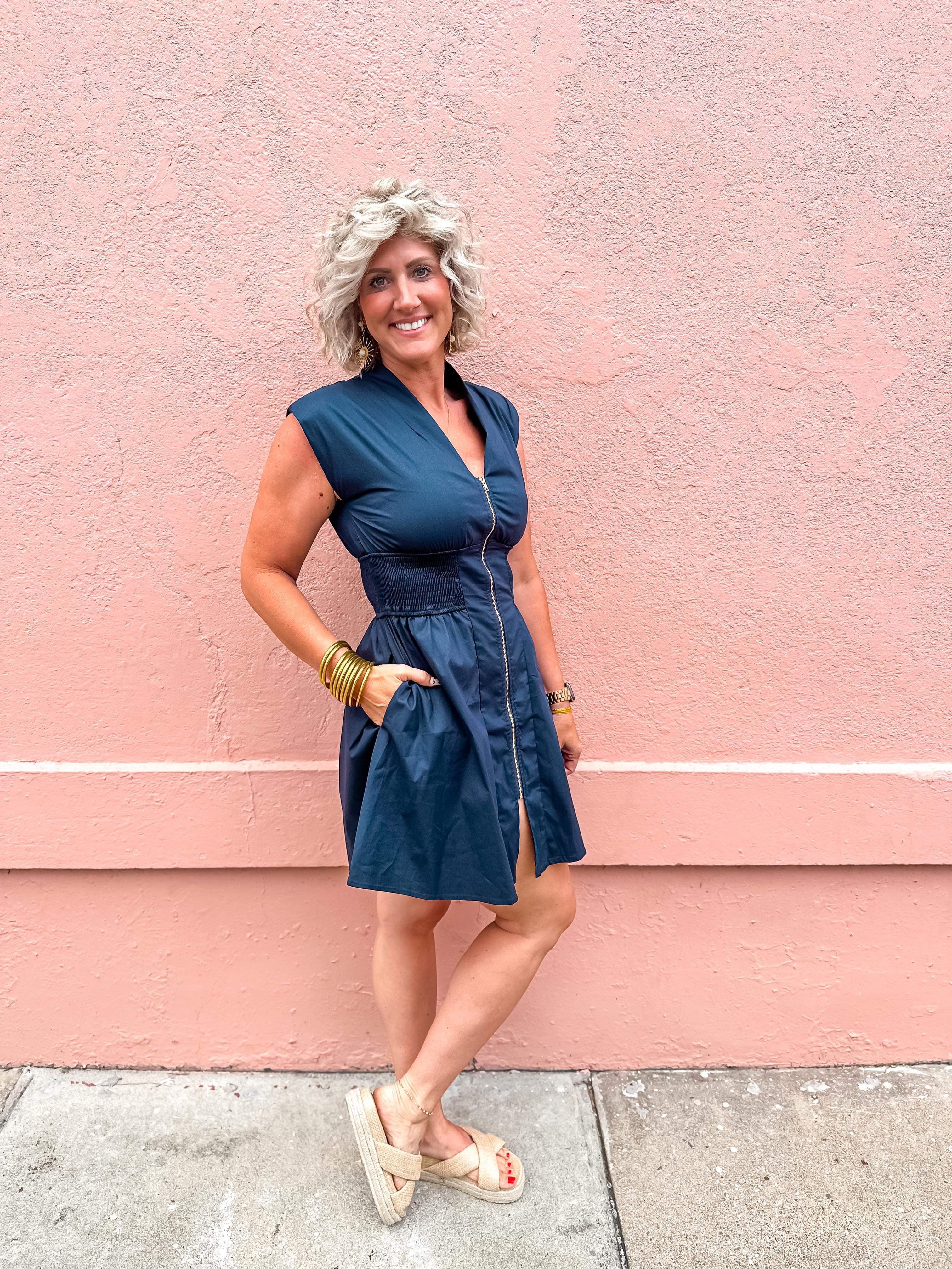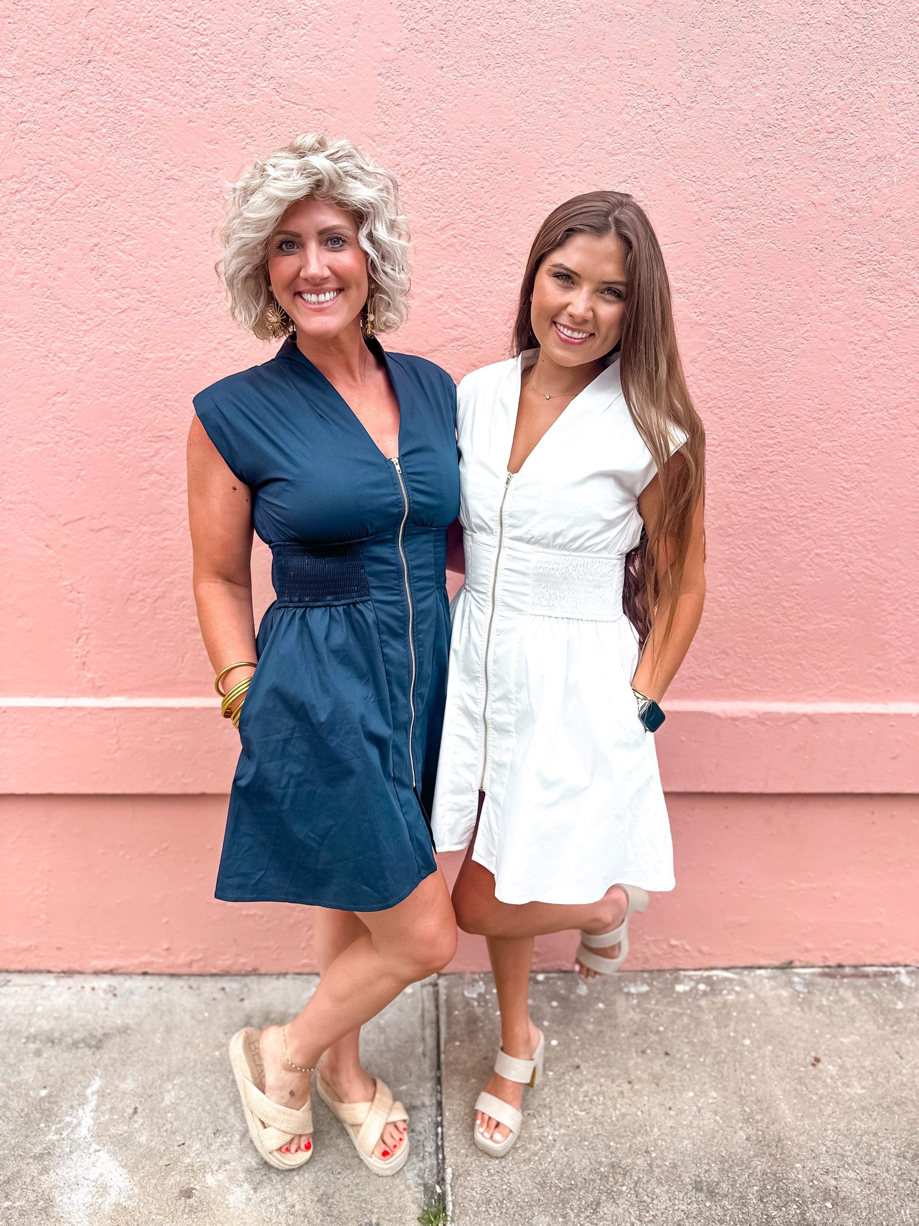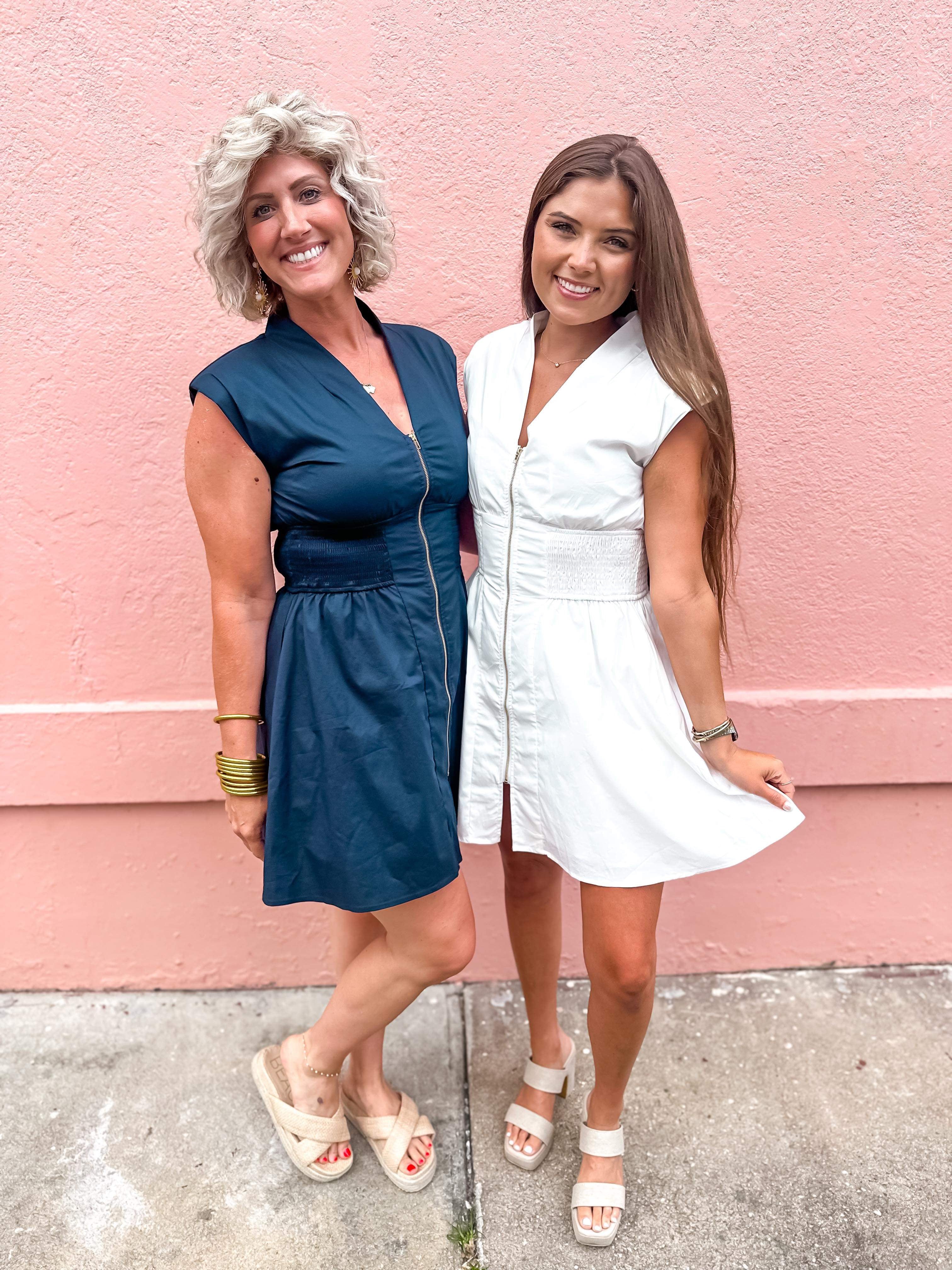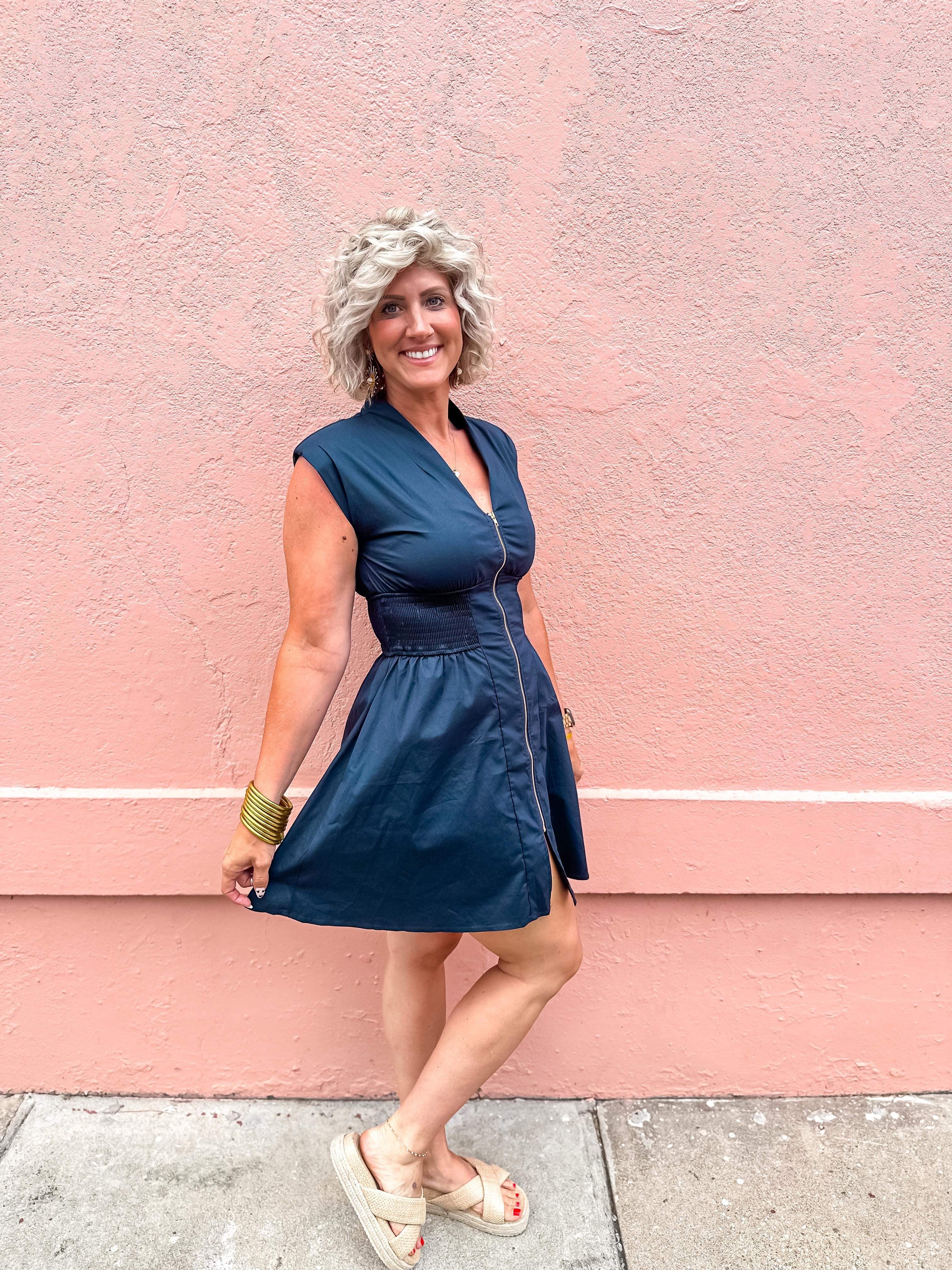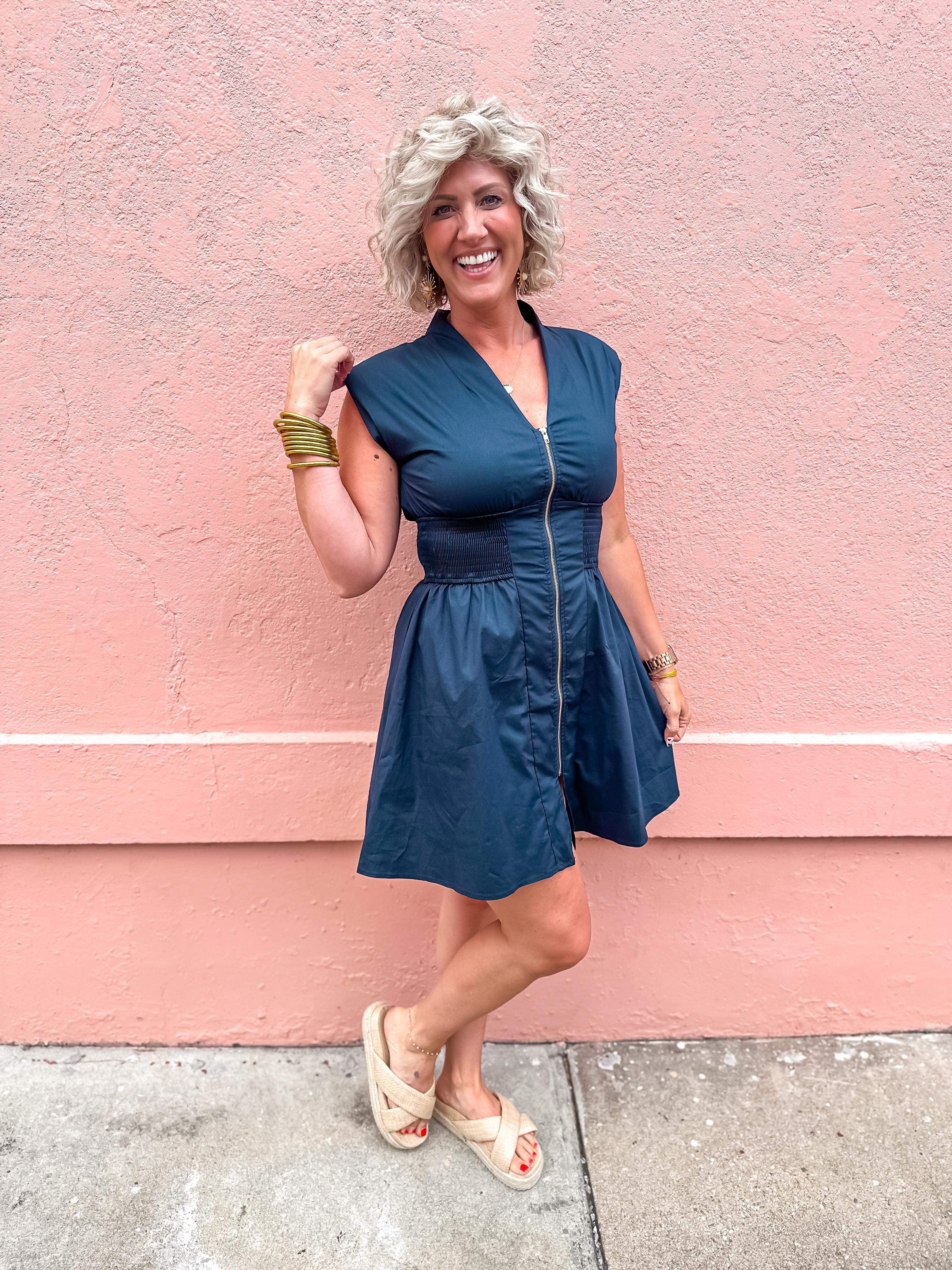 V-Neck Smocked Front-Zip A-Line Mini Dress