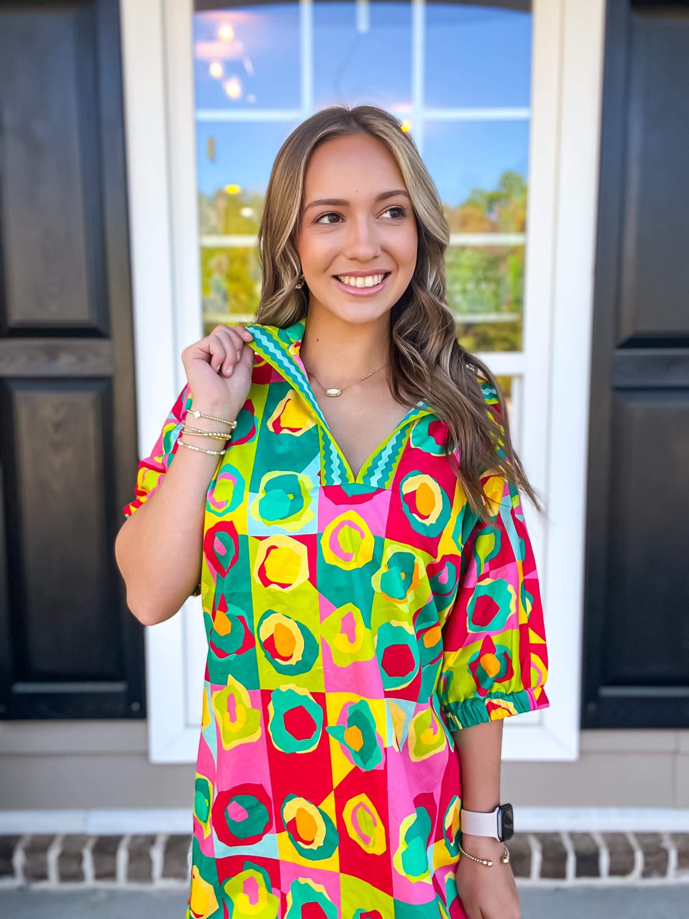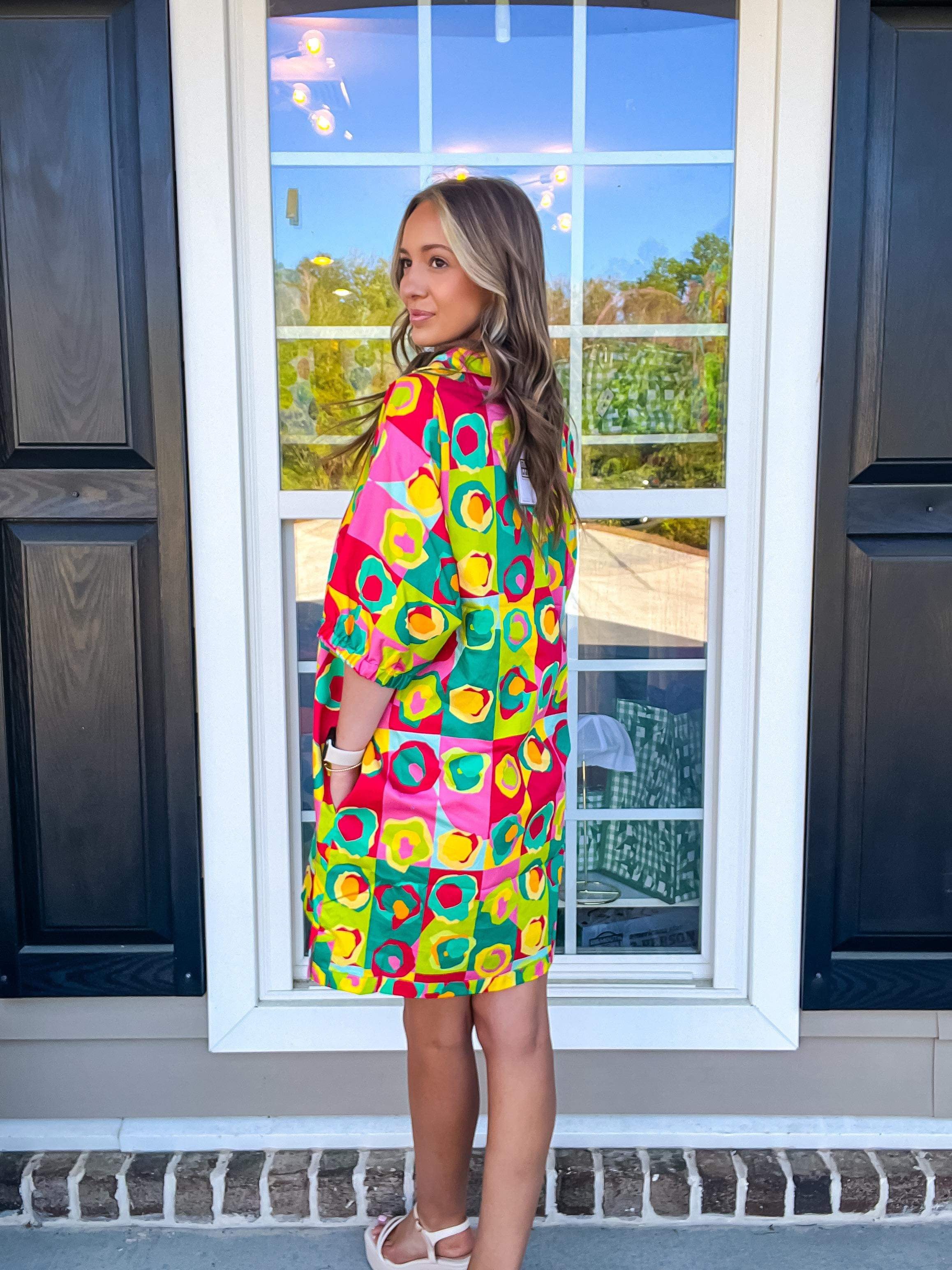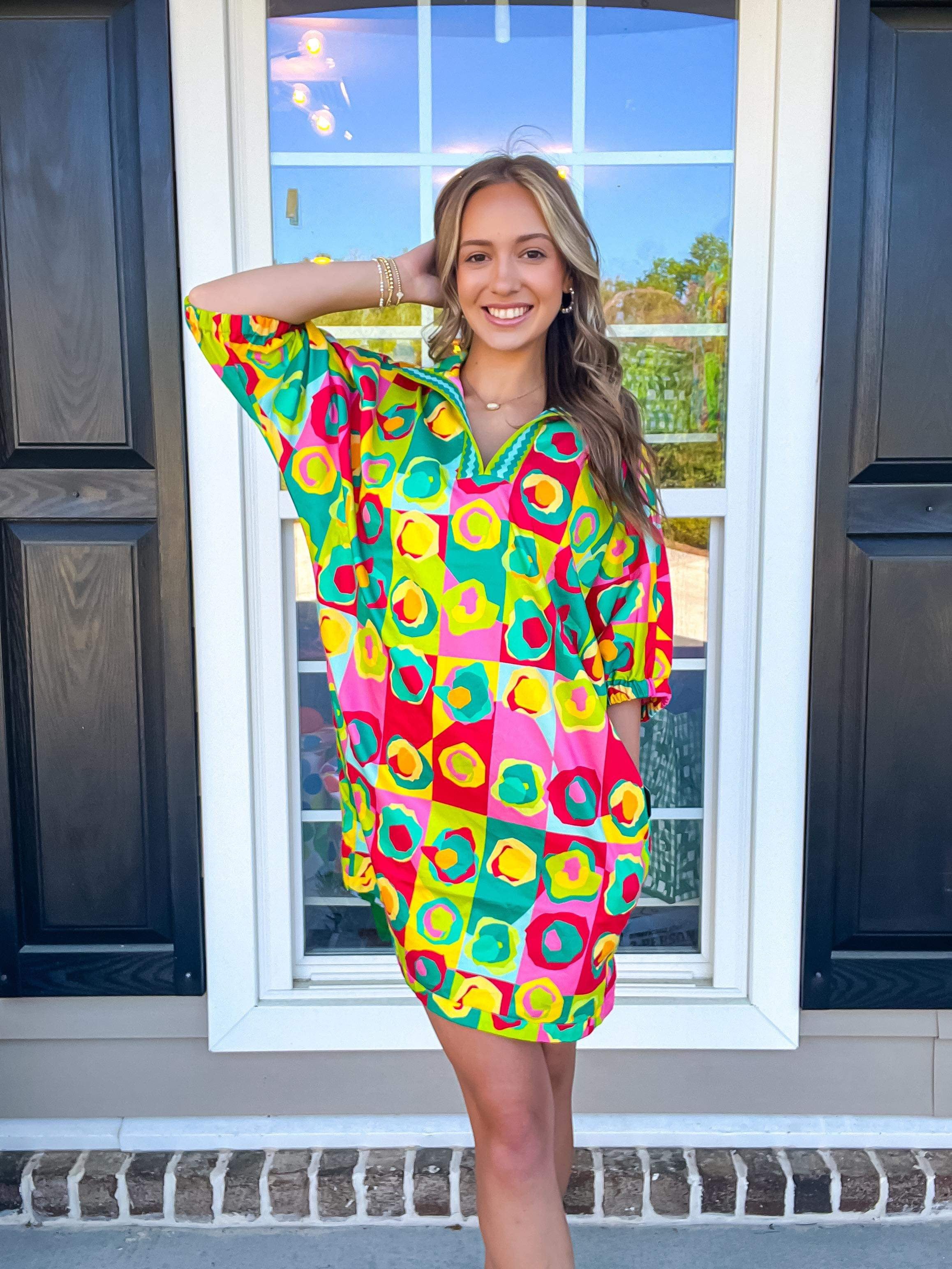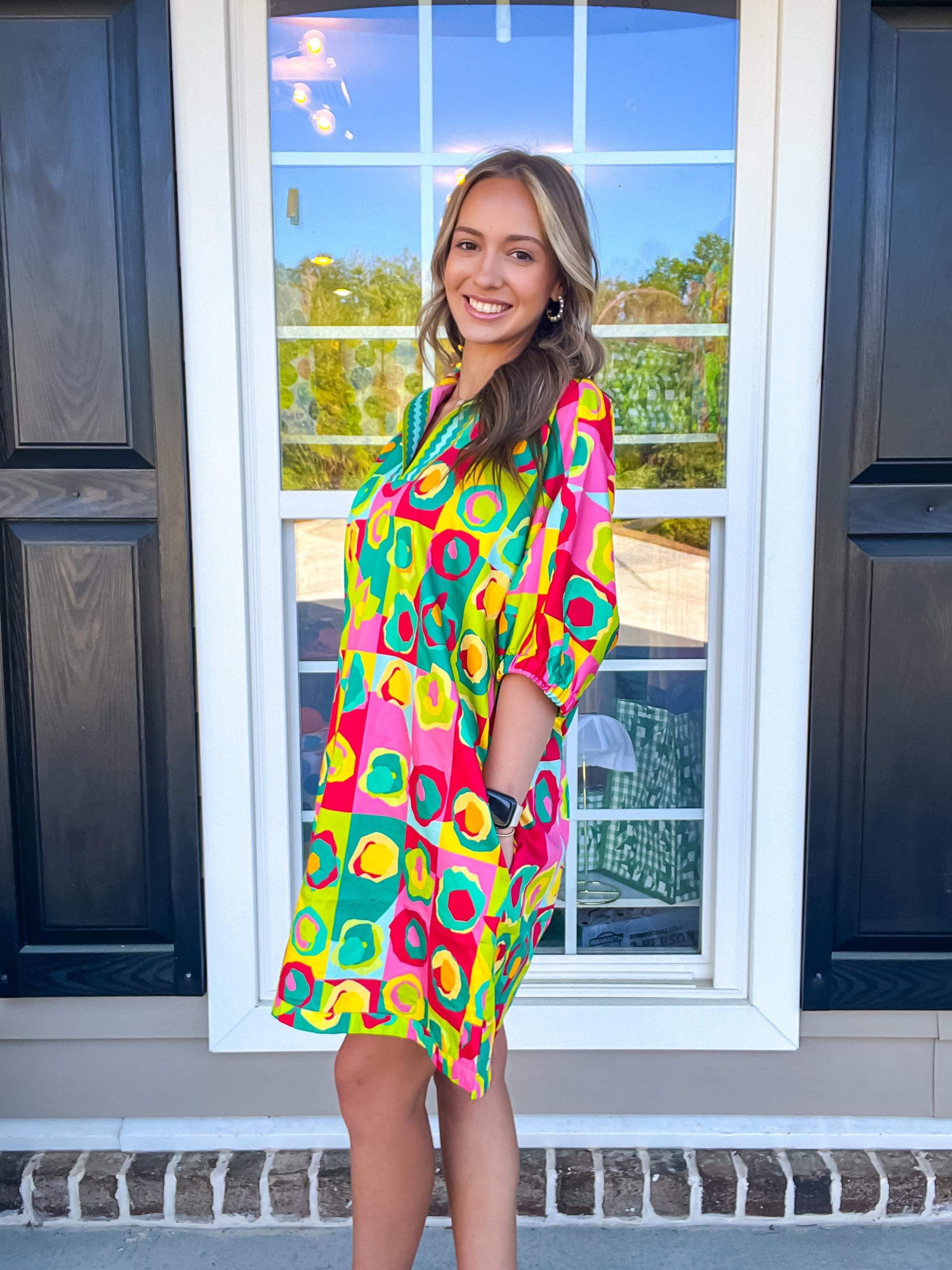 Our signature Poppy Dress in Rhett Pop is perfect for casual days and dressed up evenings. Loose fitting with an optional stand up collar and knee length hem. Dress up with a heel or go casual with a sneaker, the Poppy Dress is versatile for every style!
