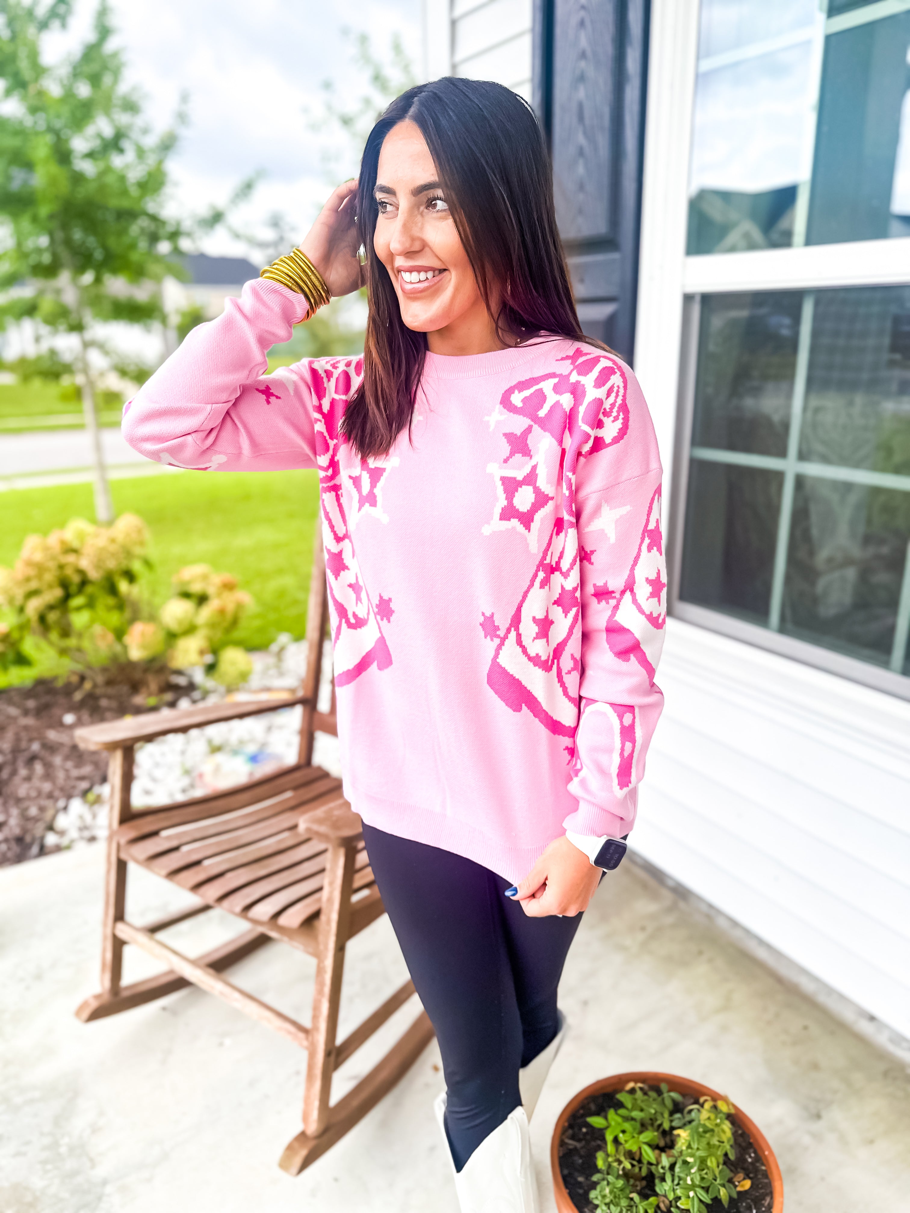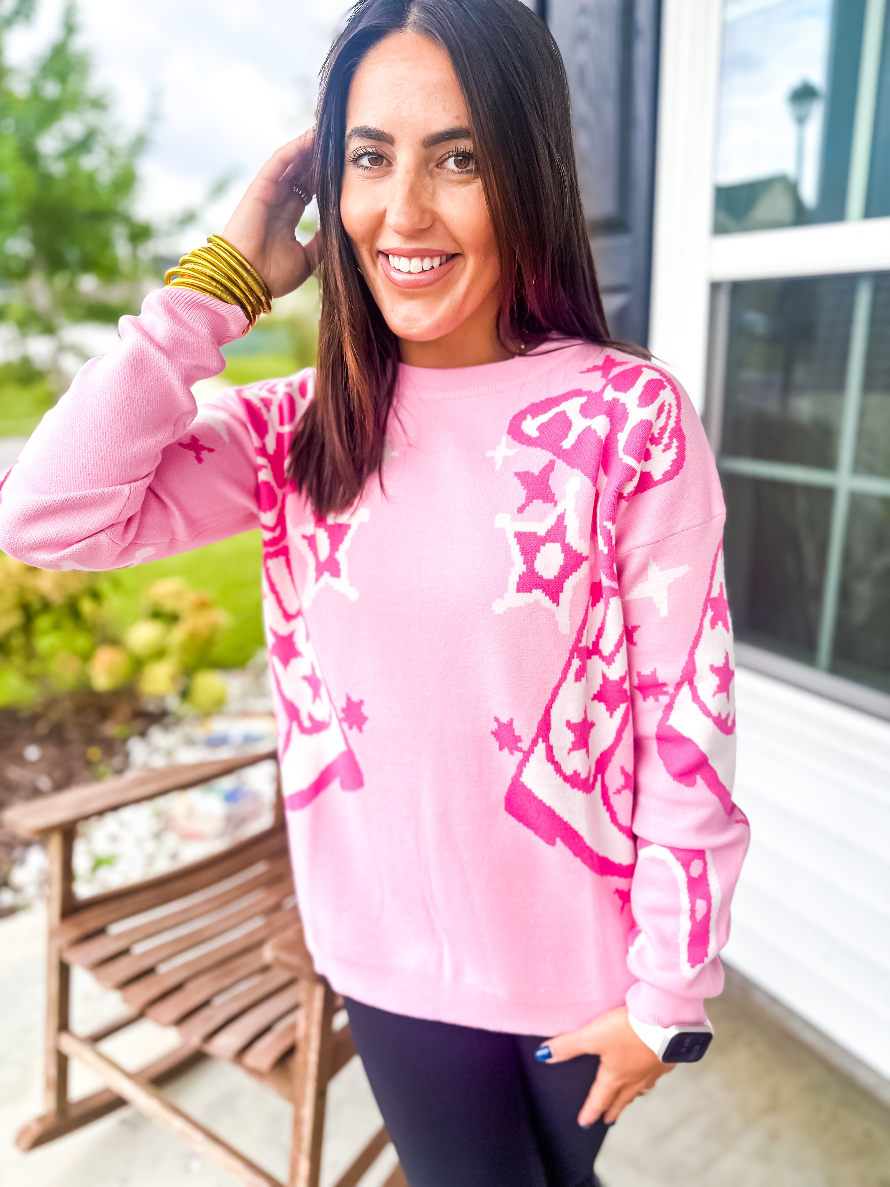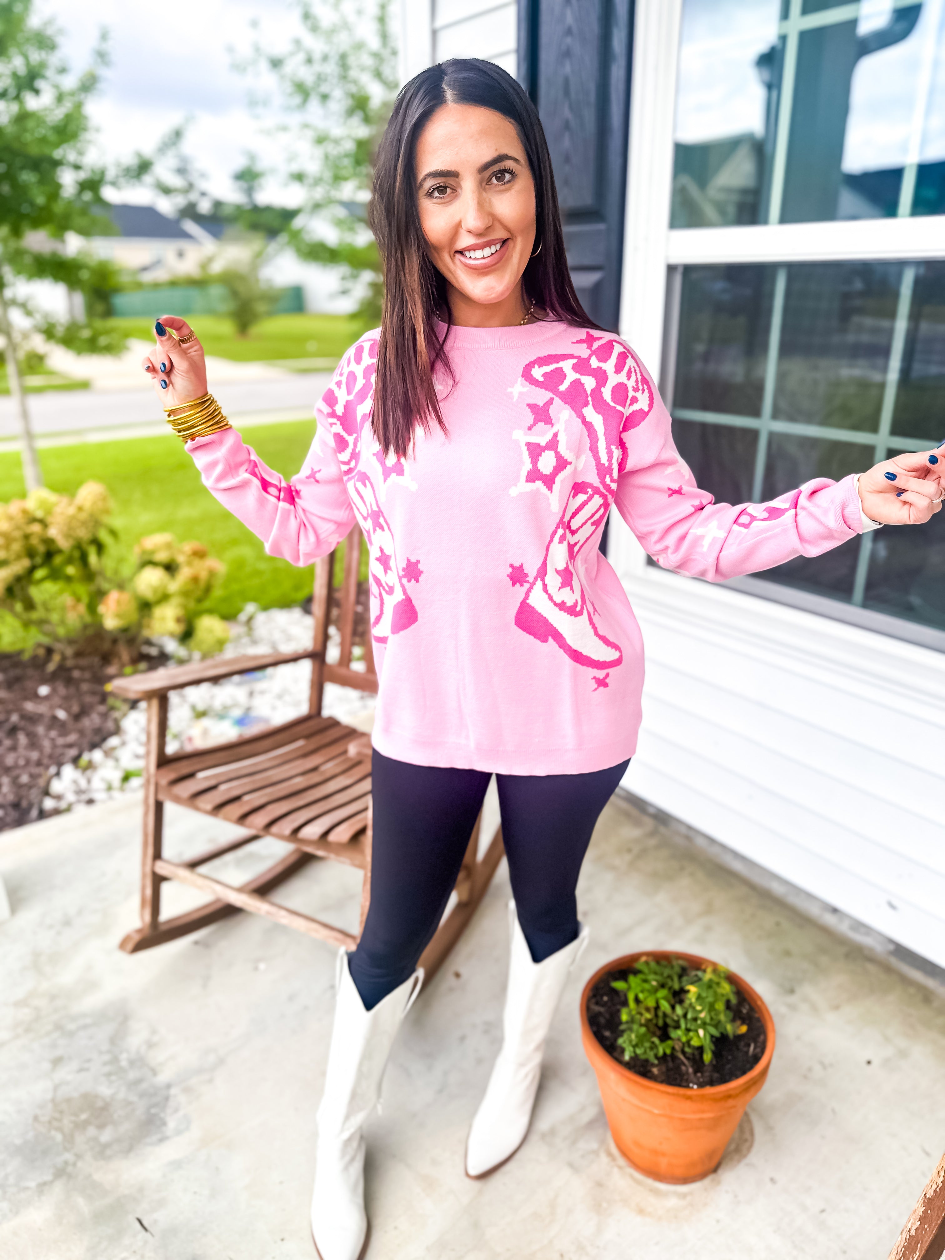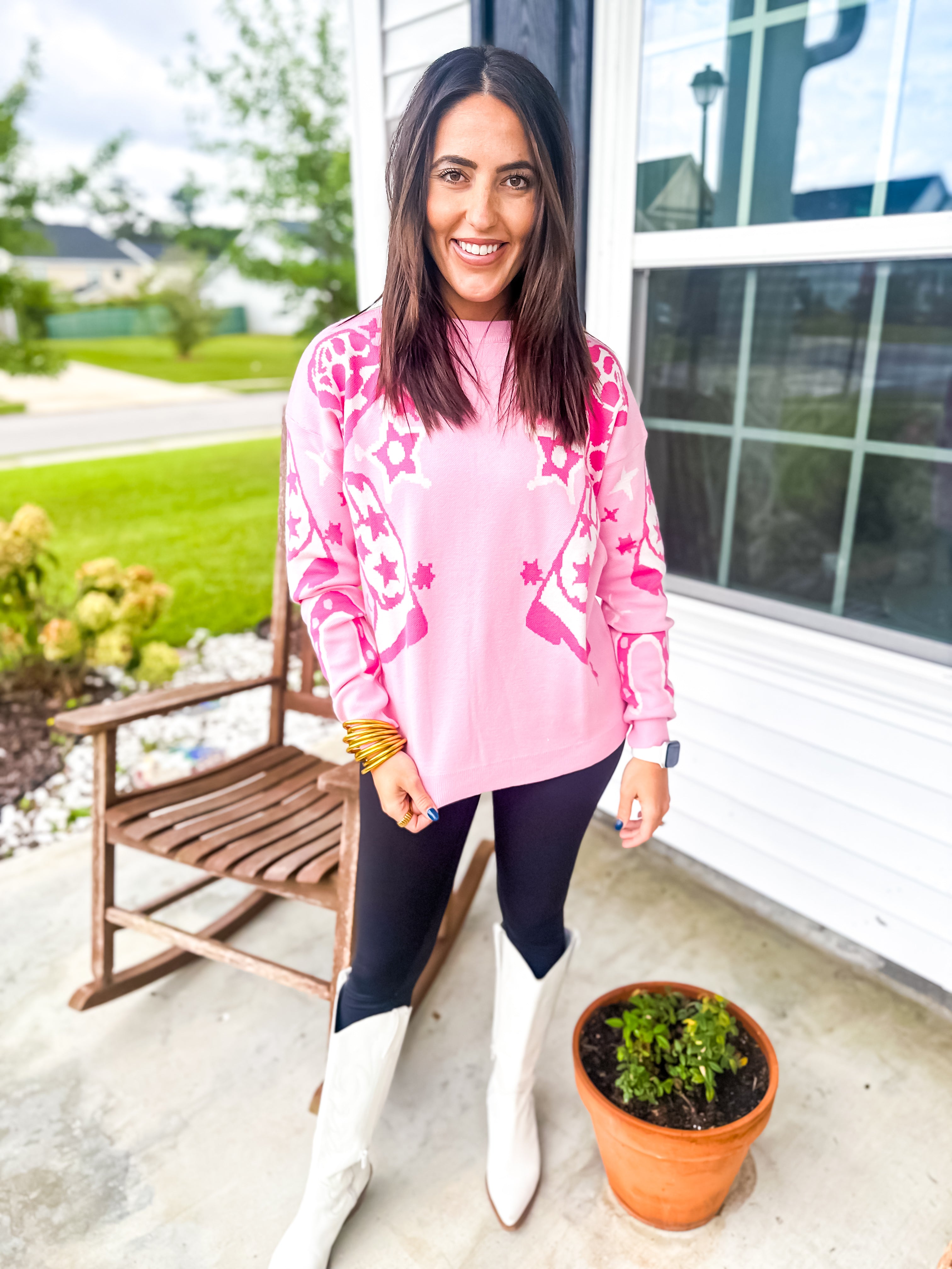 Introducing our Post It Up Sweater in Pink. I absolutely love this sweater y'all! It is of course pink and beautiful - but it features a 'cowboy' print throughout with cowboy hats, boots, and stars! This is such a cute sweater - a great sweater to wear to country concerts in the fall and winter! It is soft as butter and has a little weight to it, but not heavy by any means!