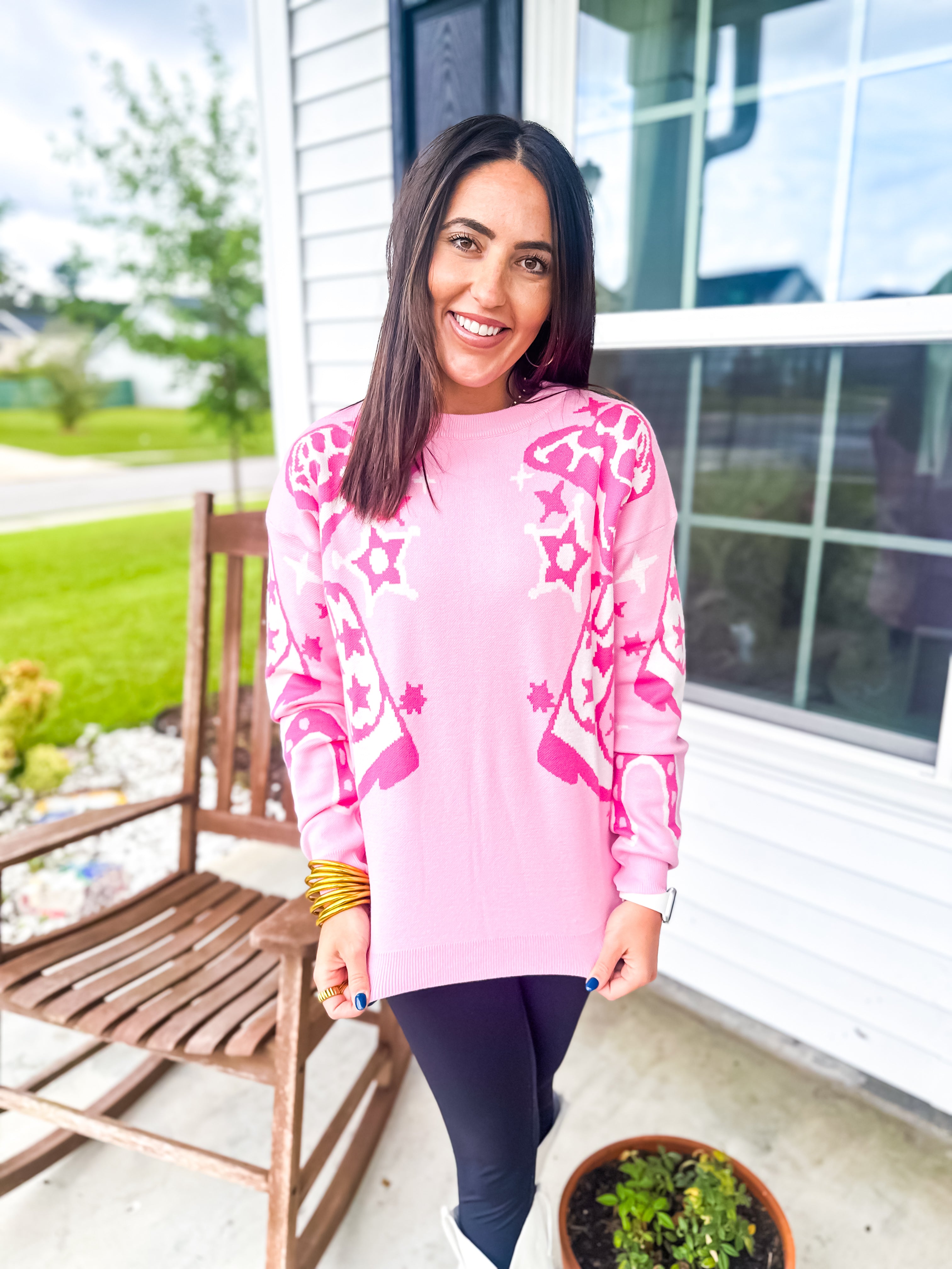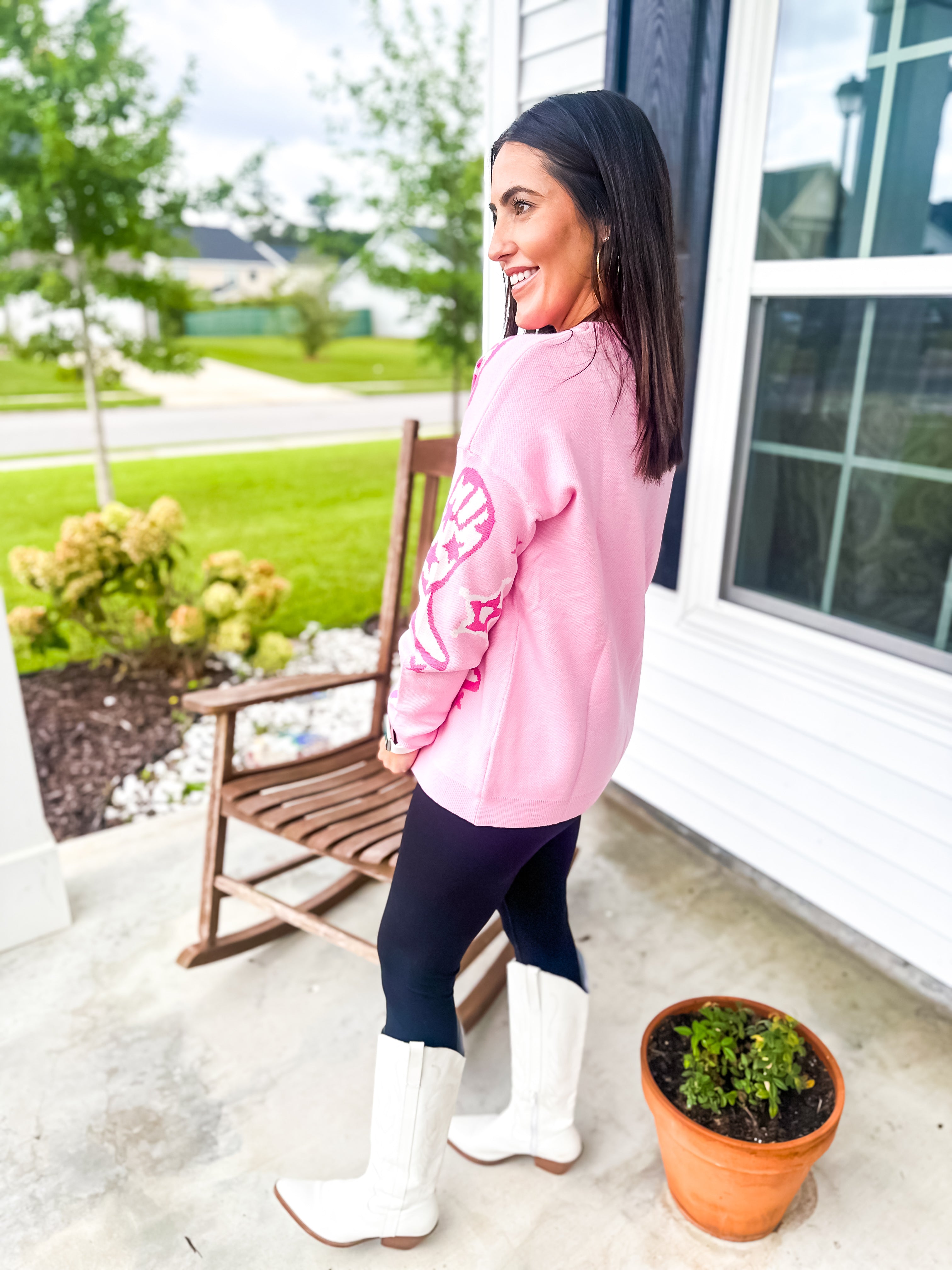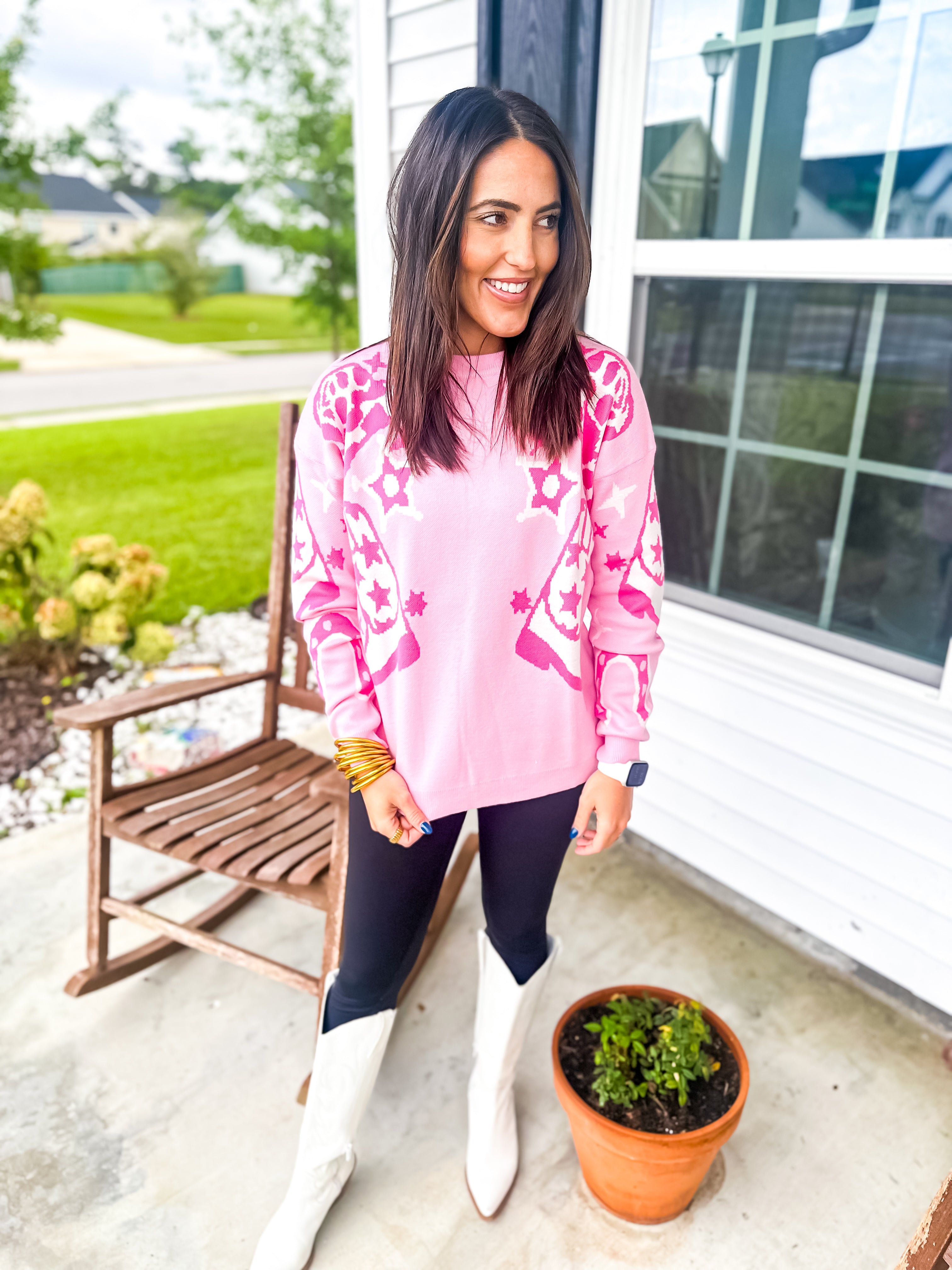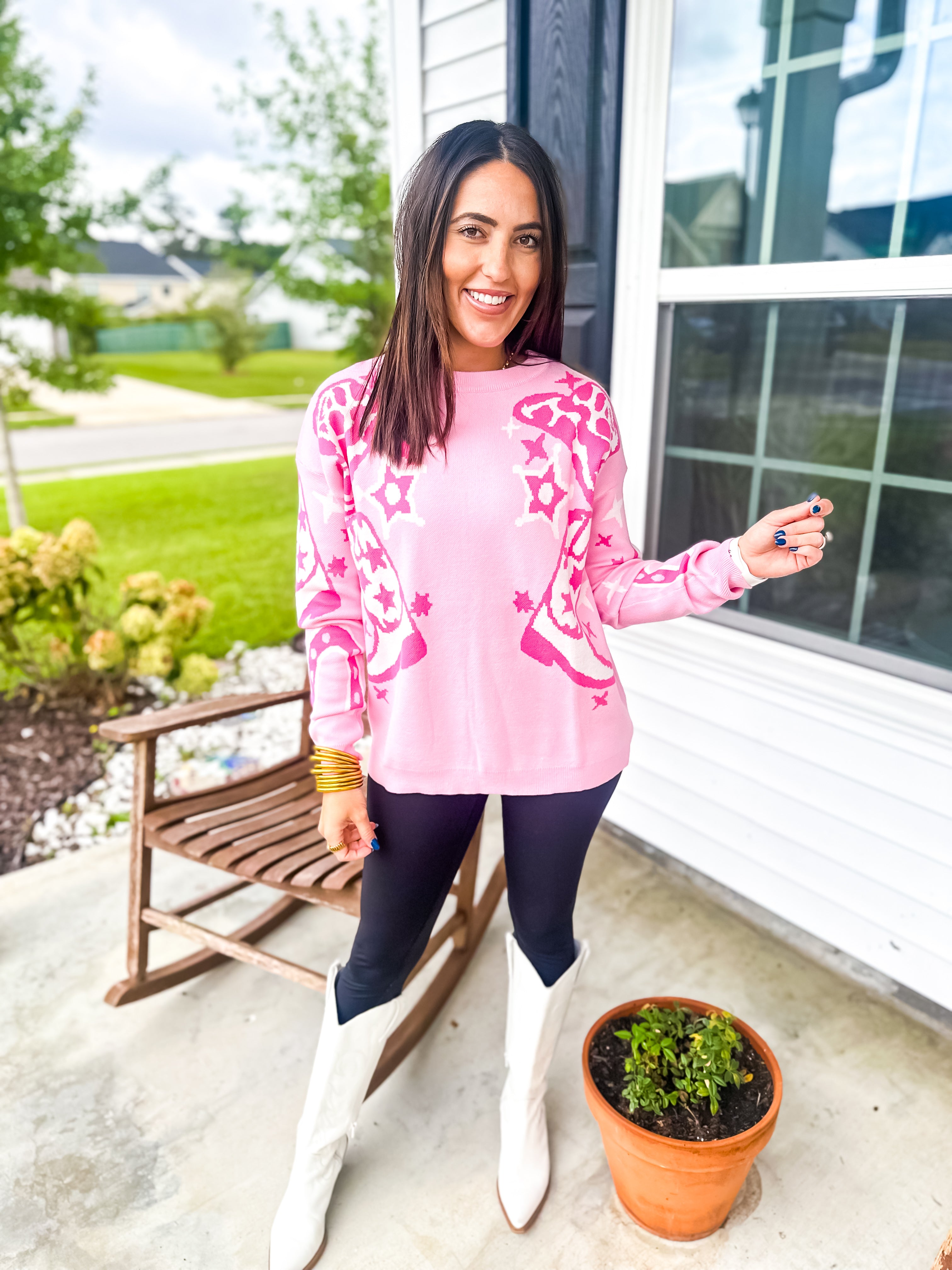 Introducing our Post It Up Sweater in Pink. I absolutely love this sweater y'all! It is of course pink and beautiful - but it features a 'cowboy' print throughout with cowboy hats, boots, and stars! This is such a cute sweater - a great sweater to wear to country concerts in the fall and winter! It is soft as butter and has a little weight to it, but not heavy by any means!