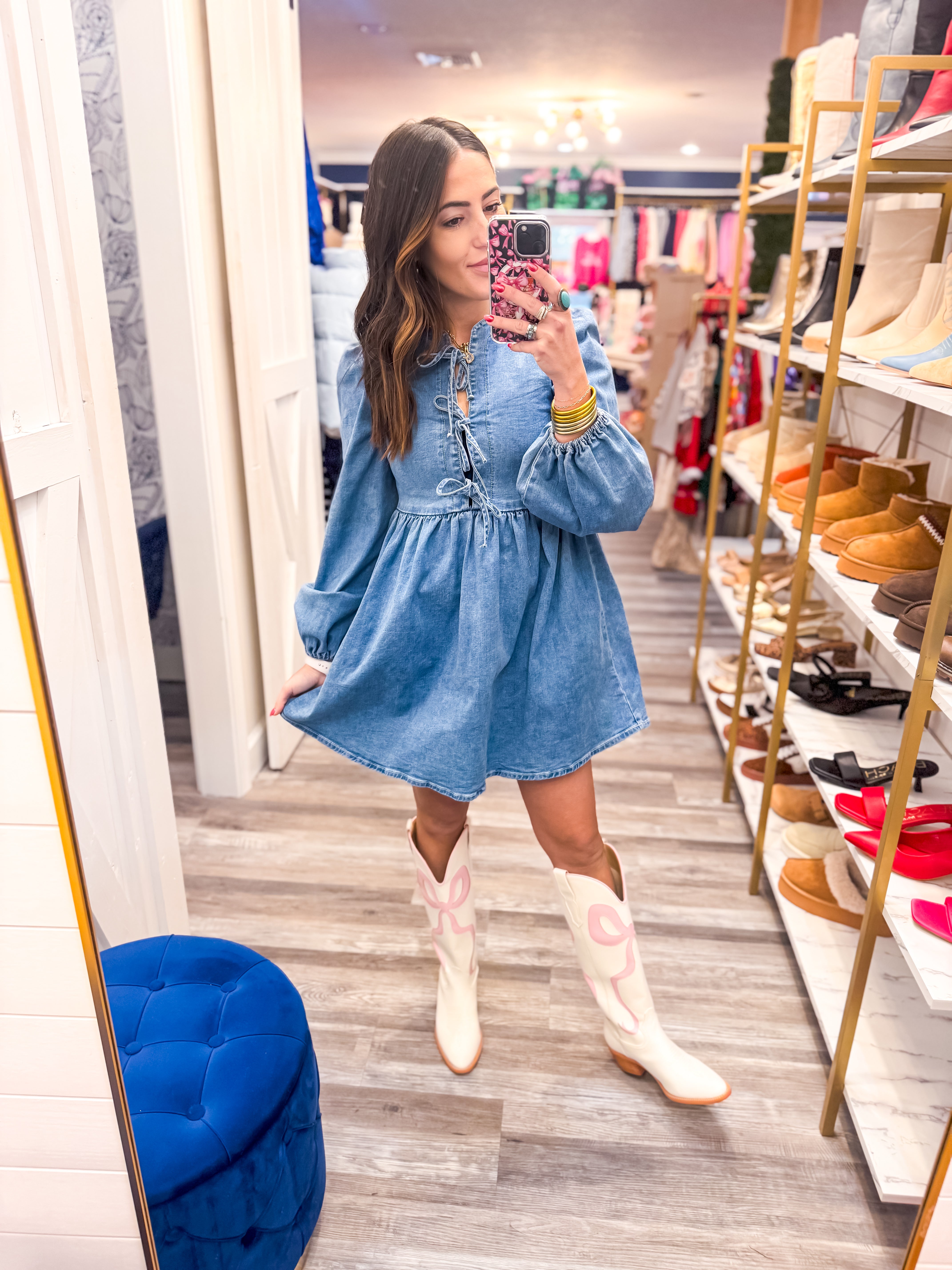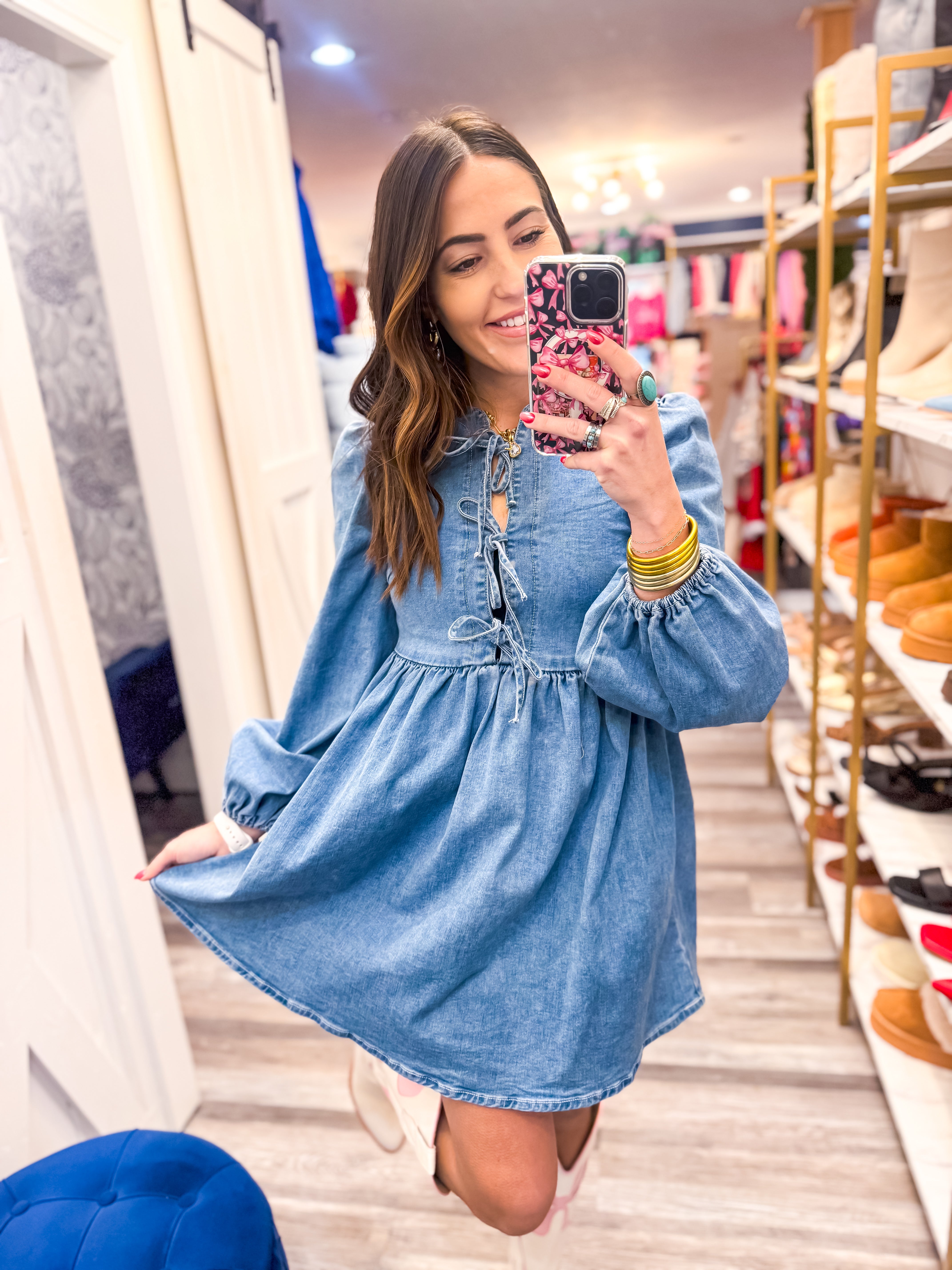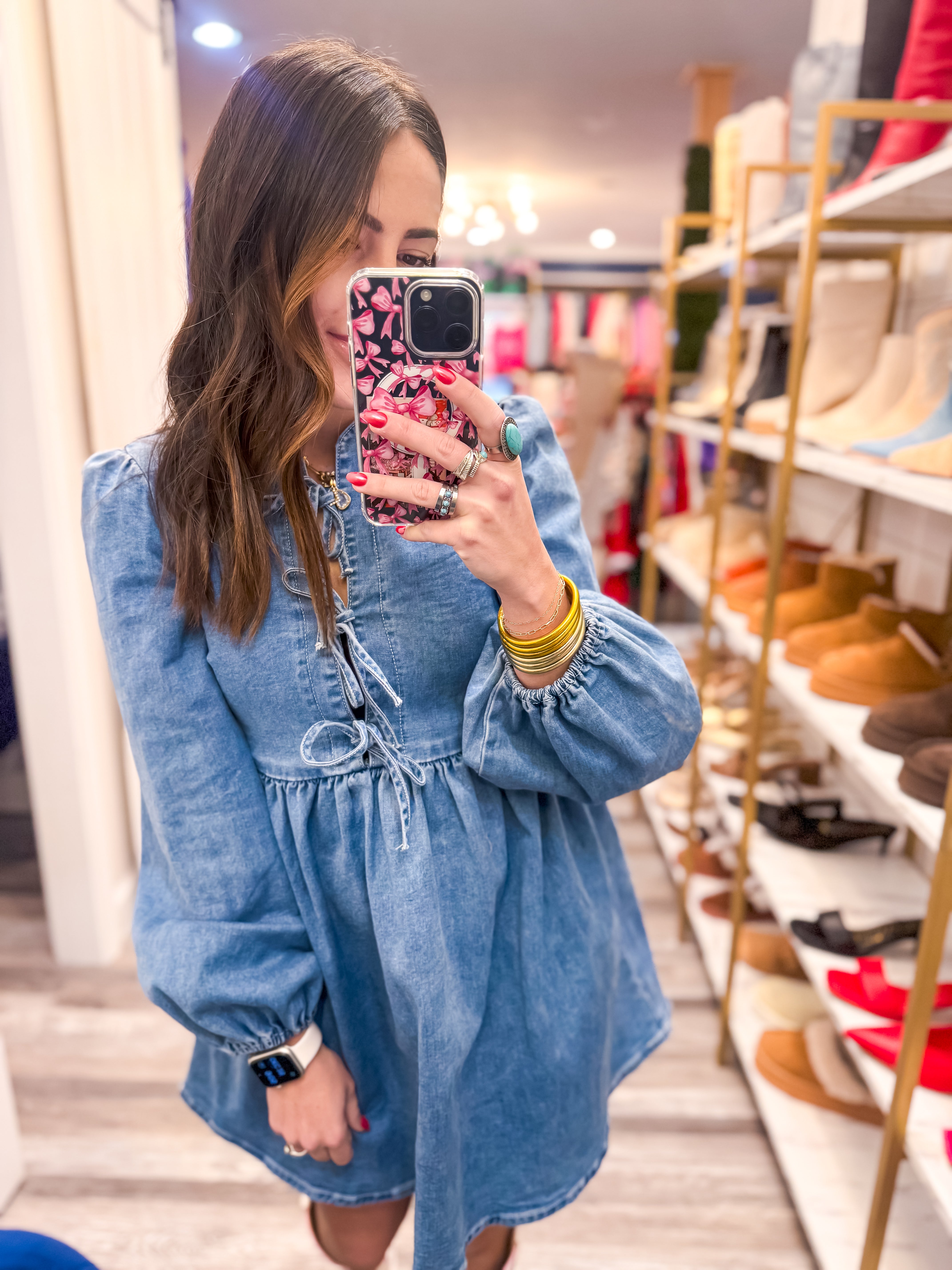 This denim long-sleeve mini dress exudes a chic, vintage-inspired vibe, featuring a playful bow detail that adds a touch of femininity. Crafted from washed denim, it has a soft, lived-in feel with subtle faded accents, enhancing its retro charm. The trendy and cute design is perfect for casual outings, offering a flattering and stylish look for any occasion. Whether you're heading out for a brunch, shopping trip, or a day with friends, this dress combines comfort and fashion effortlessly, making it a versatile wardrobe staple.