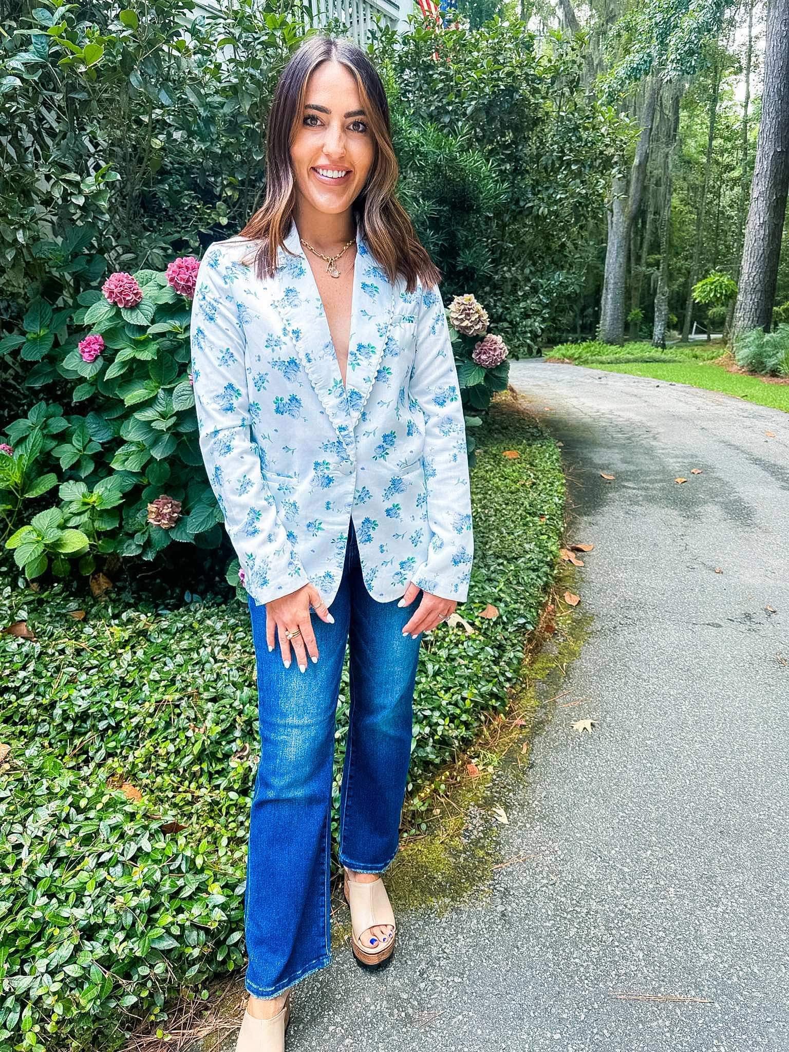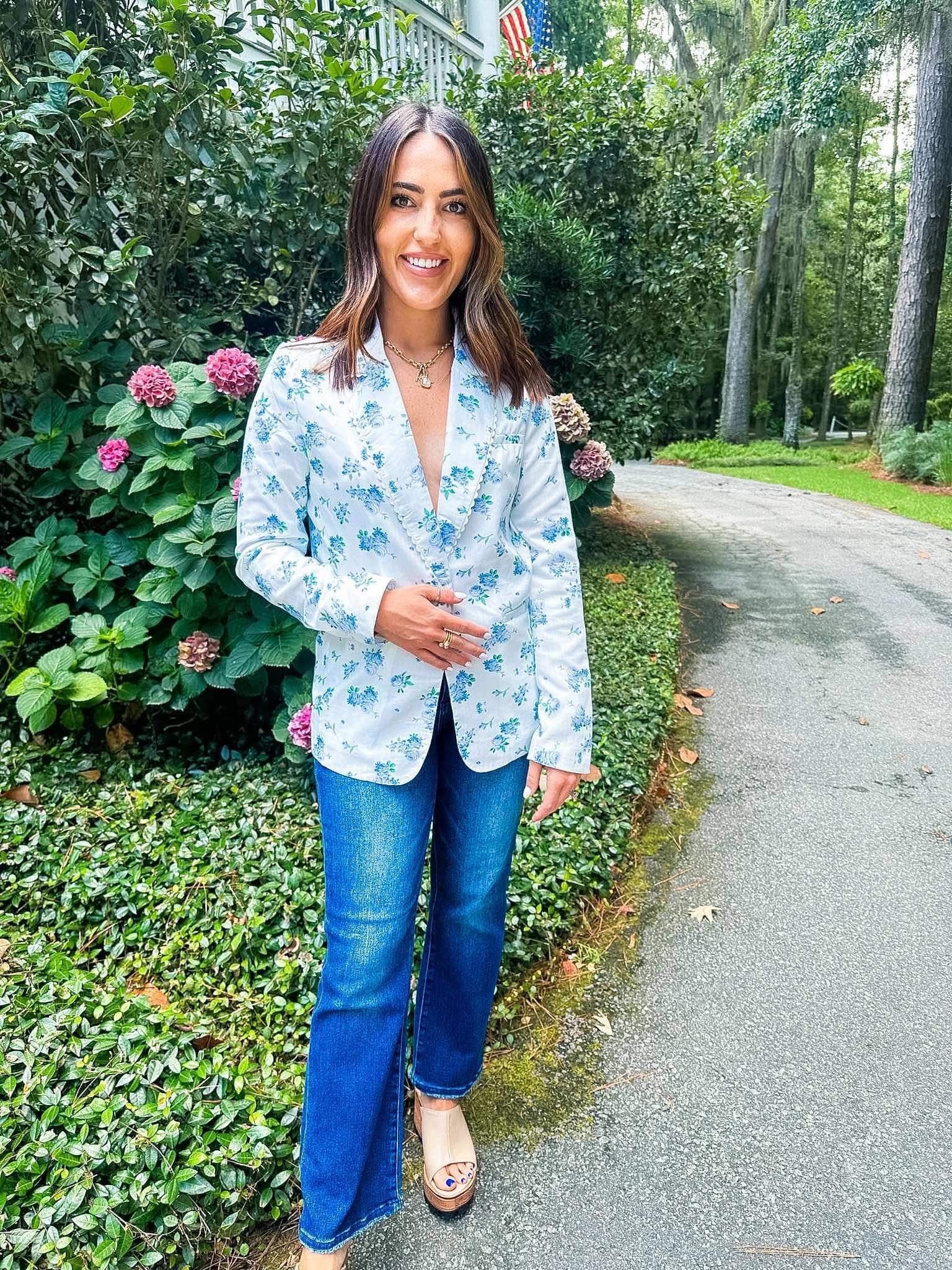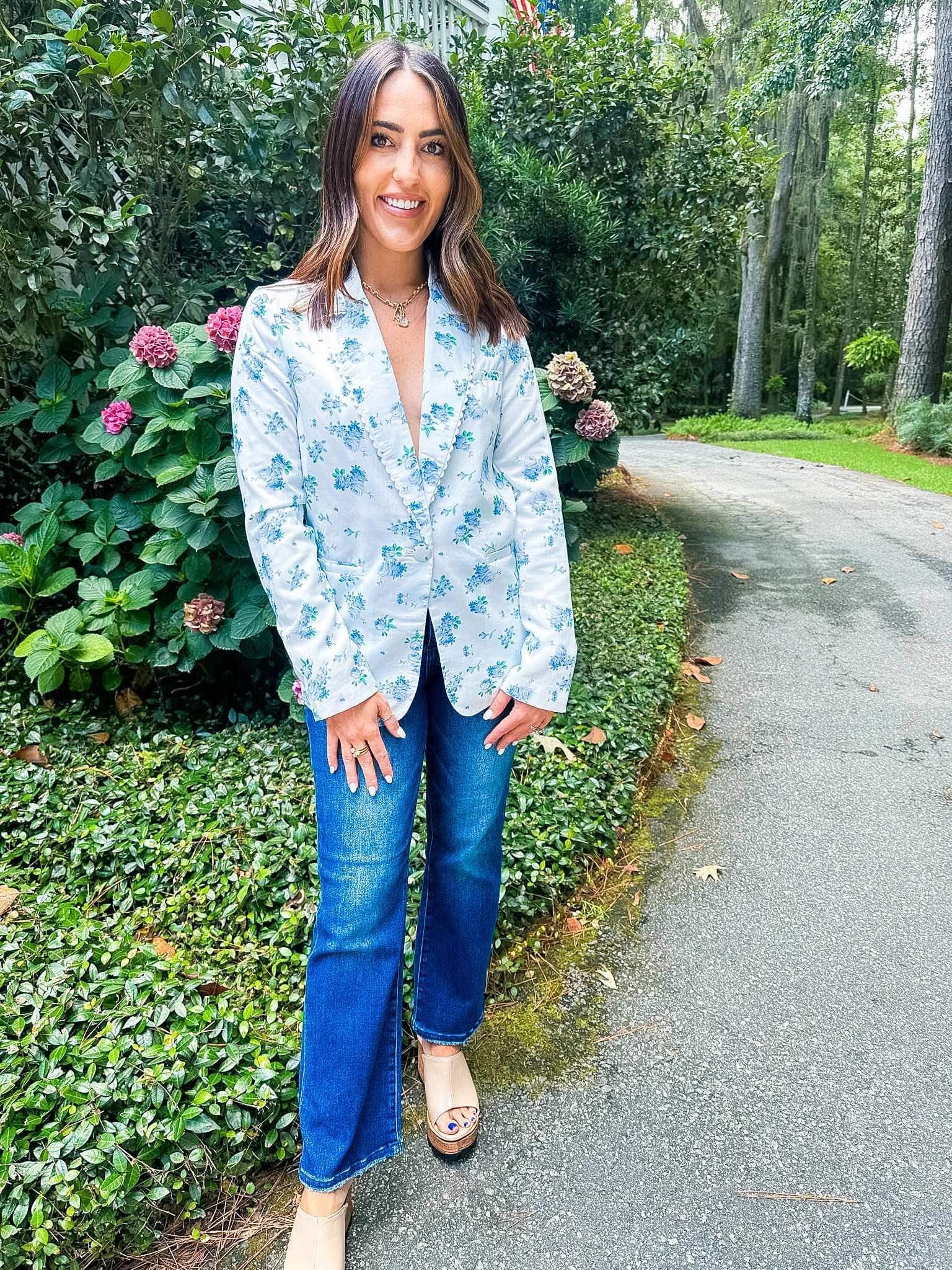Introducing an amazing blazer that will need to be added to your wardrobe. It has an ivory base with lace detailing around the trim. It features a beautiful blue floral print throughout - very soft and elegant print.