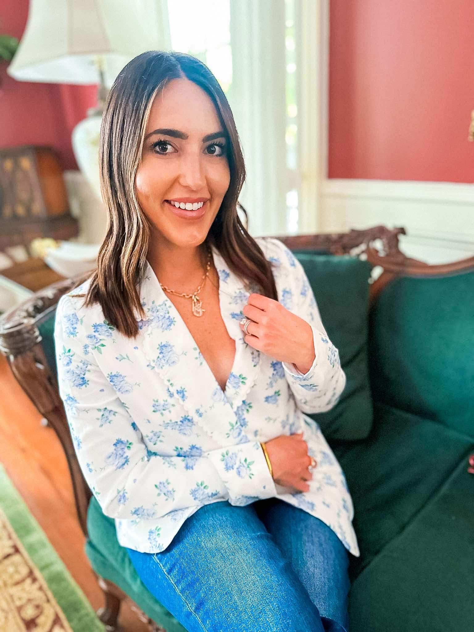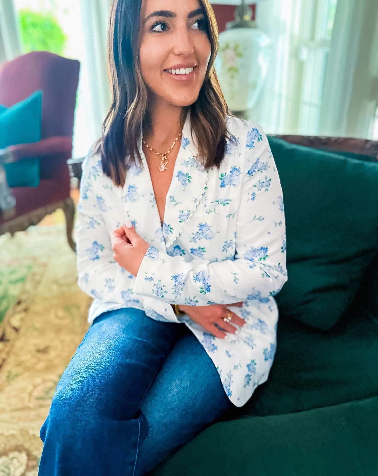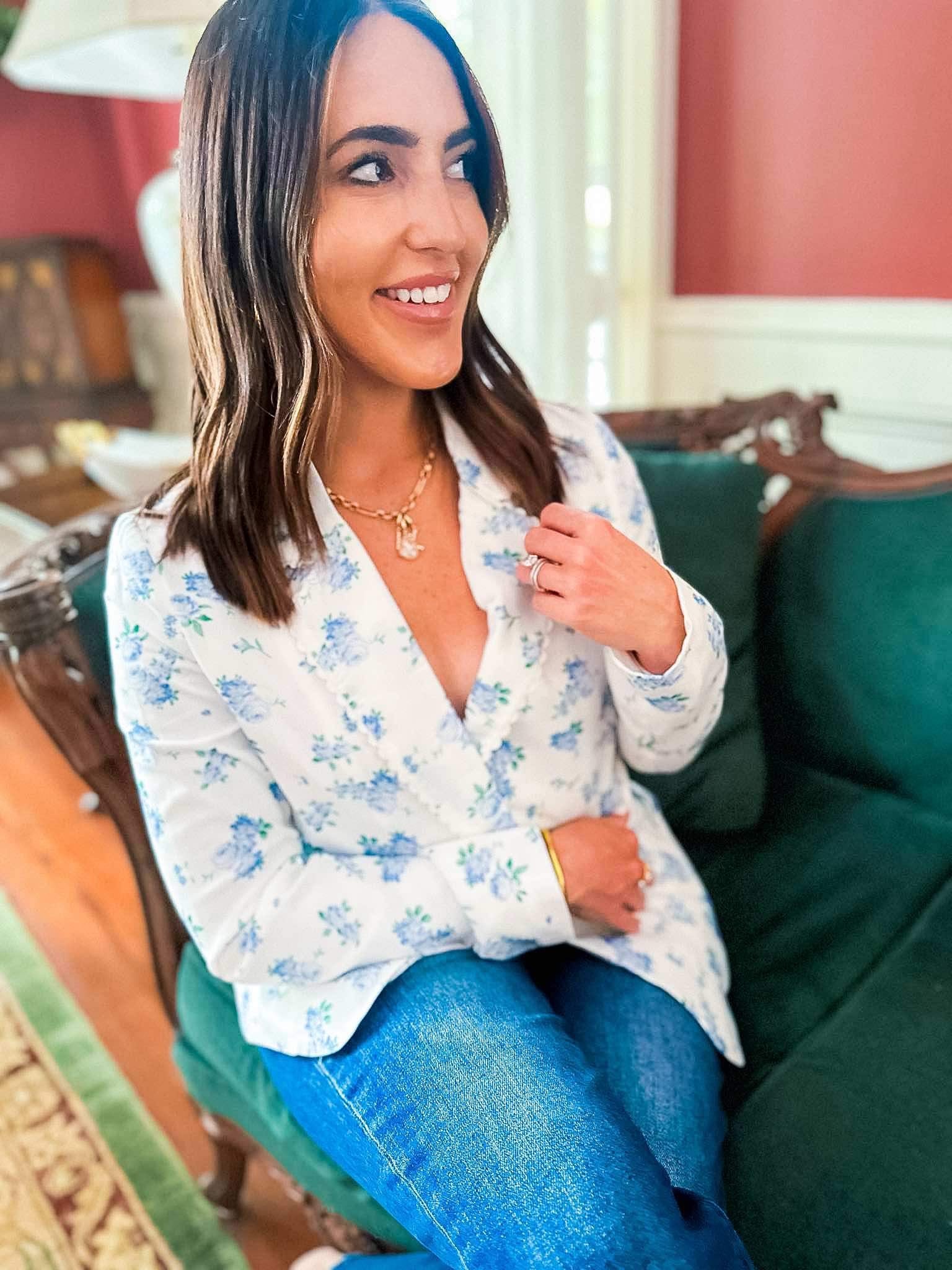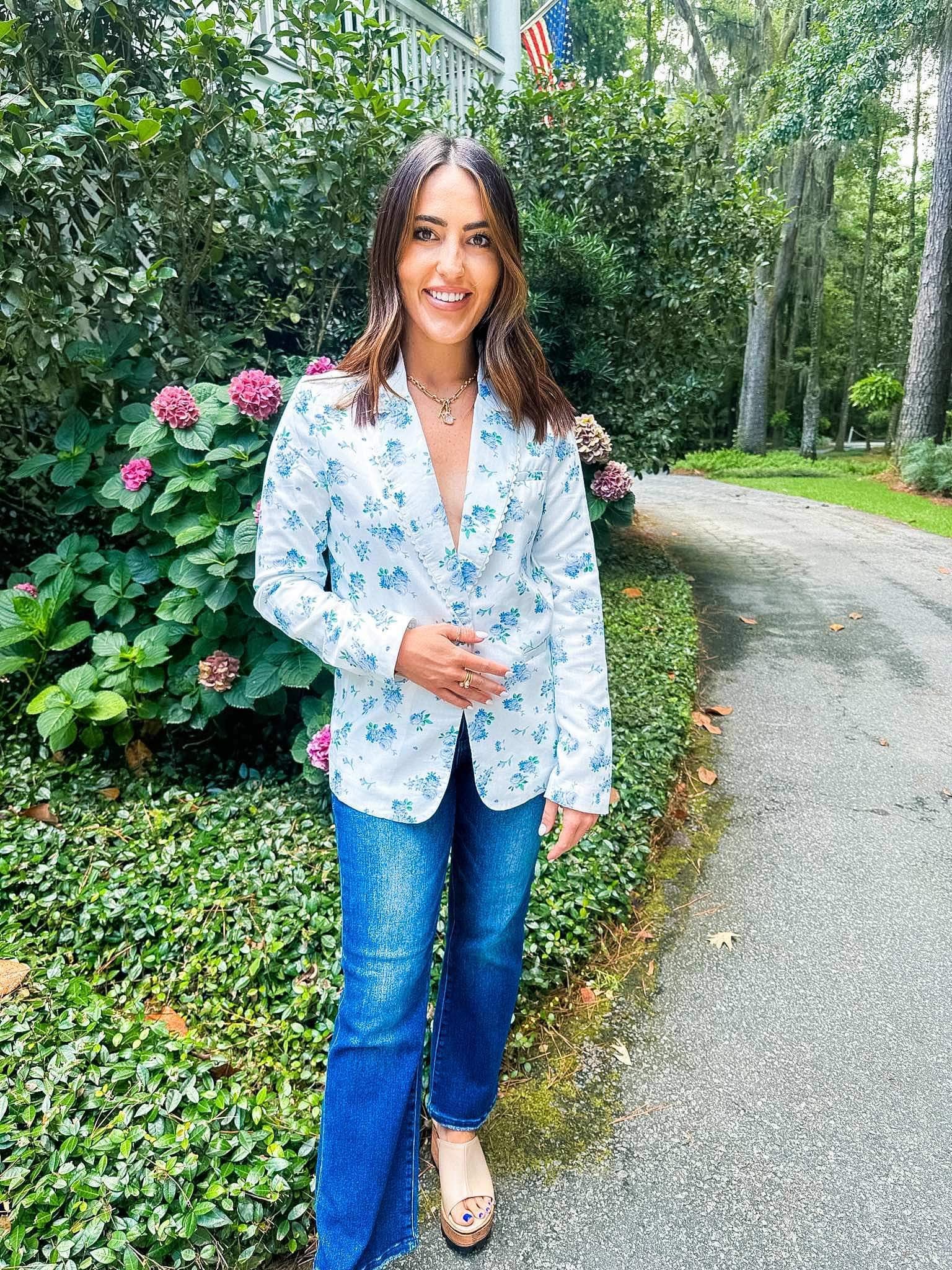 Introducing an amazing blazer that will need to be added to your wardrobe. It has an ivory base with lace detailing around the trim. It features a beautiful blue floral print throughout - very soft and elegant print.
