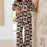 Printed Collared Neck Top and Wide Leg Pants Set