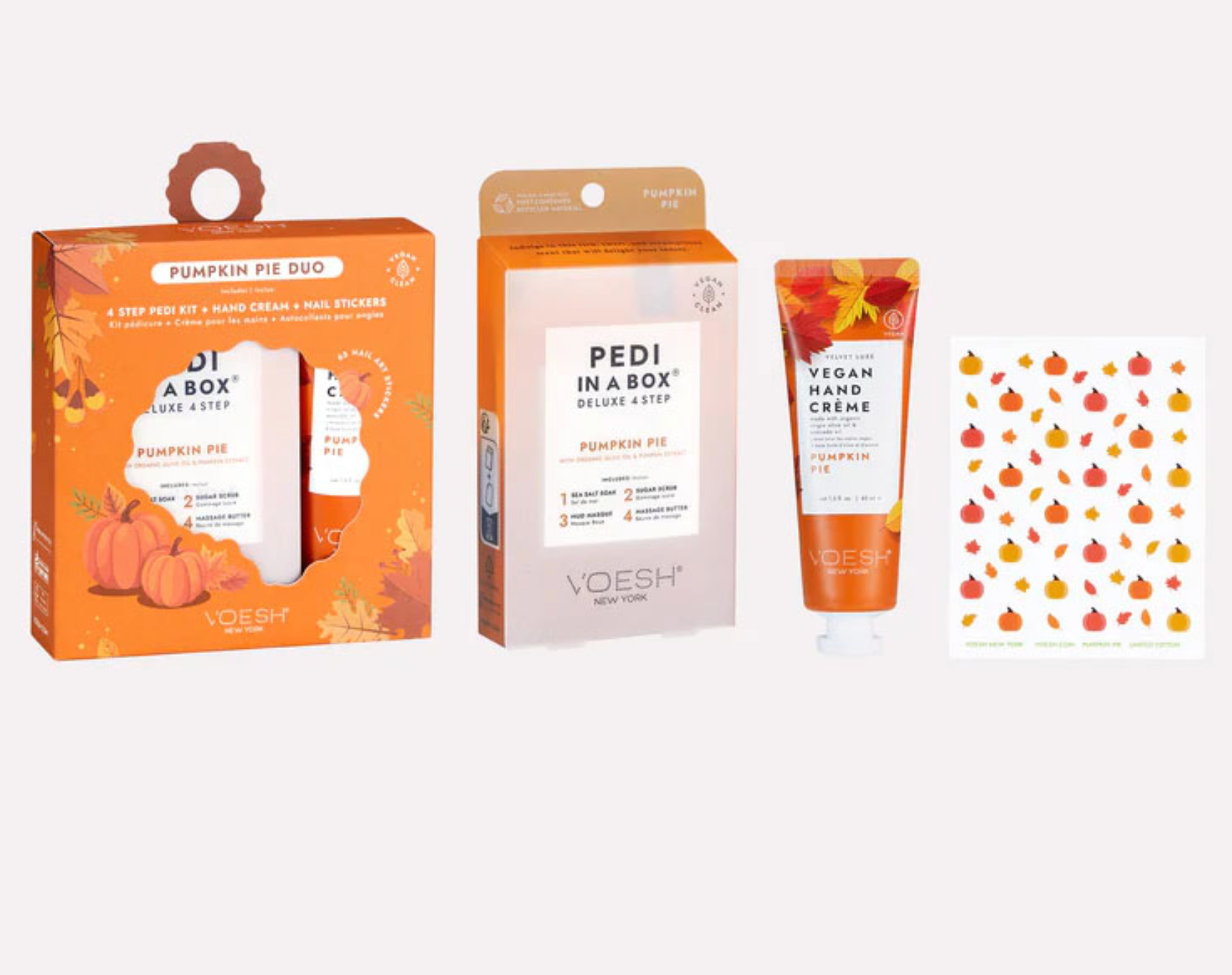 Get ready to fall into self-love with our pumpkin-scented, seasonal Pumpkin Pie Duo. New for the holidays, the limited edition duo features the seasonal Pumpkin Pie Pedi in a Box Deluxe 4 Step, matching Vegan Hand & Body Créme, and pumpkin-inspired Nail Stickers.