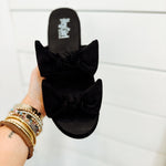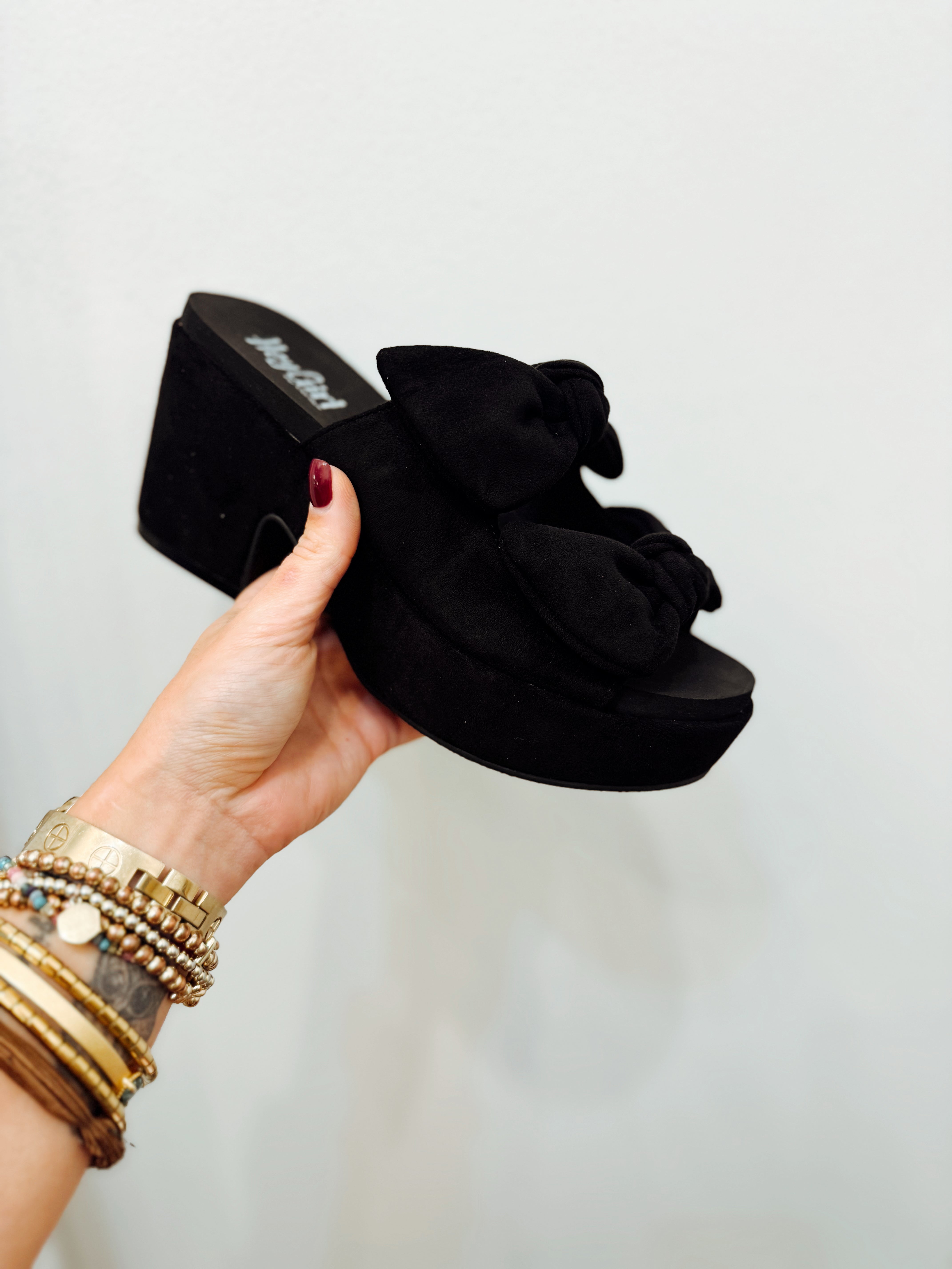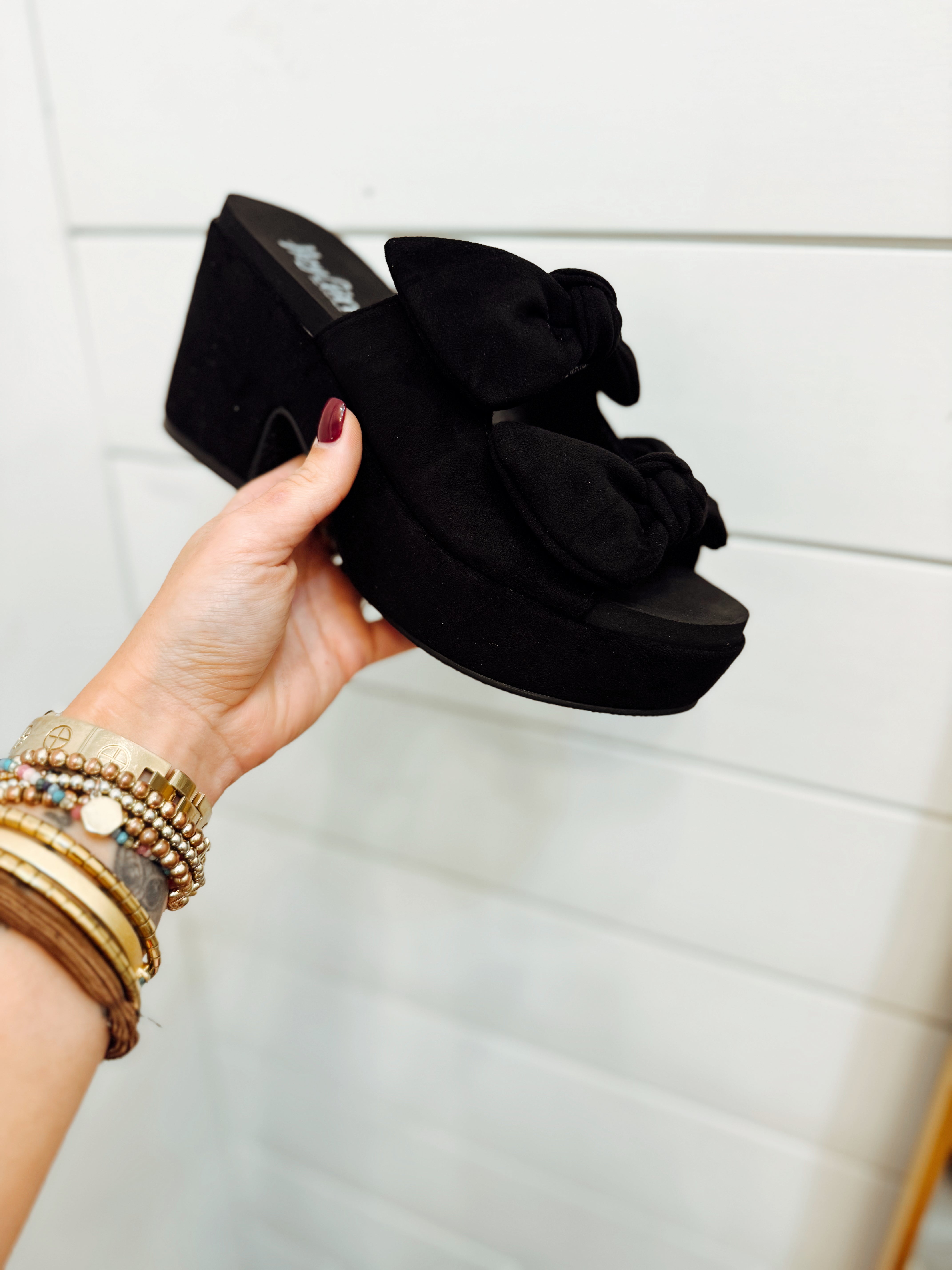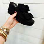 Channel retro glam with these all-black platform mule sandals—bold, playful, and packed with personality. Featuring soft faux suede, darling double bow details, and a chunky heel, these heels are perfect for making a statement while staying comfy.