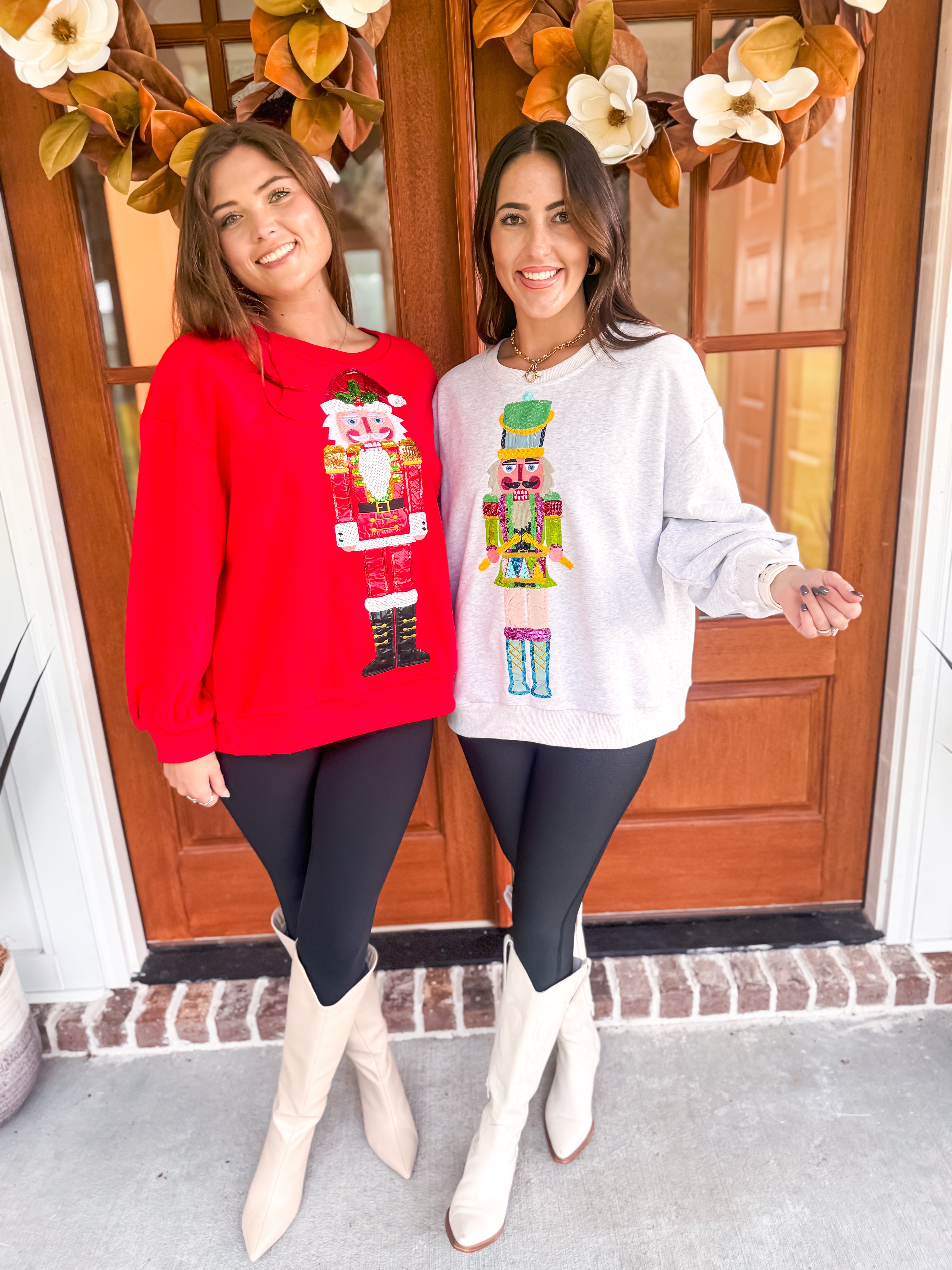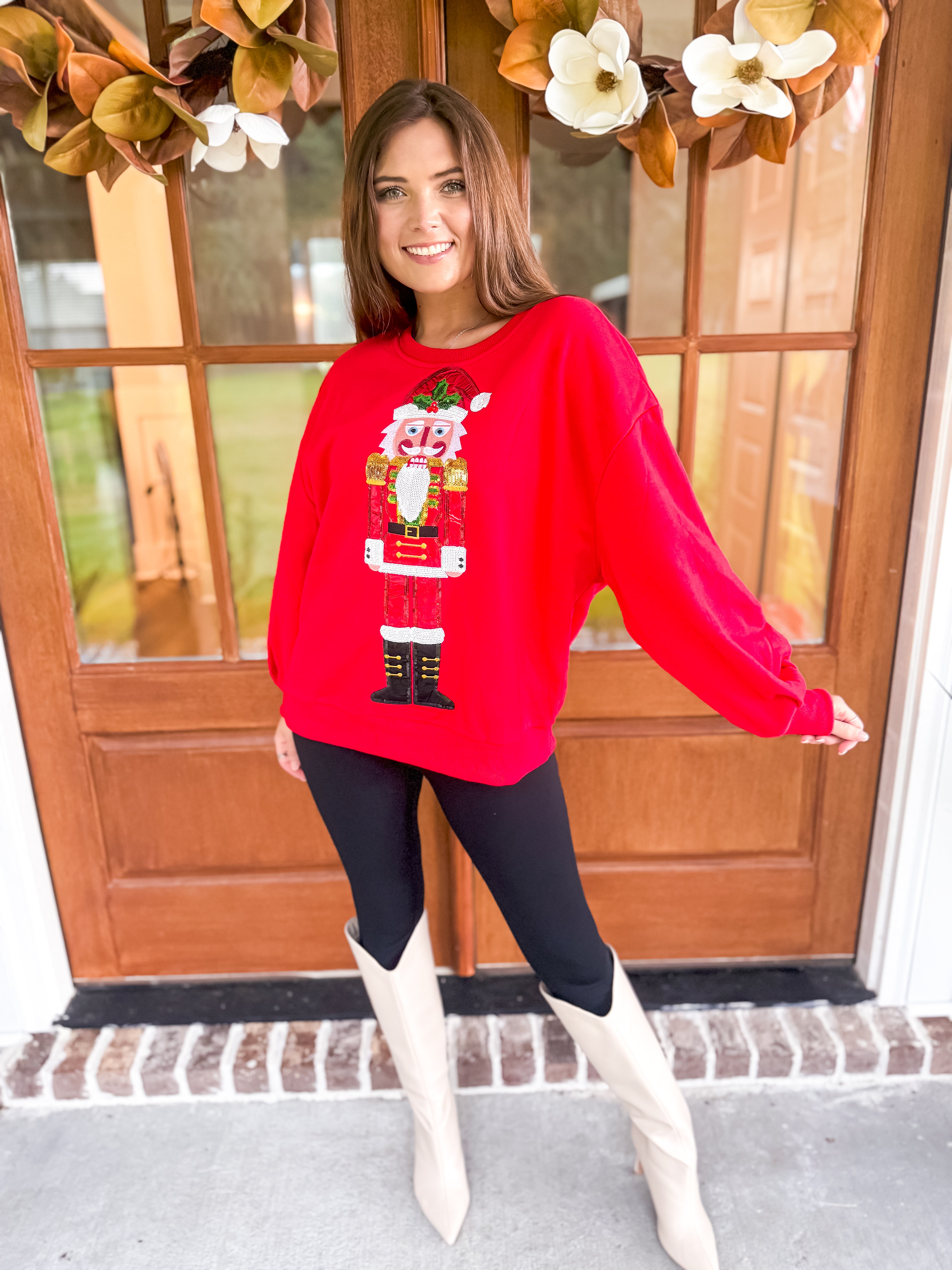 QOS Red Metallic Santa Nutcracker Sweatshirt