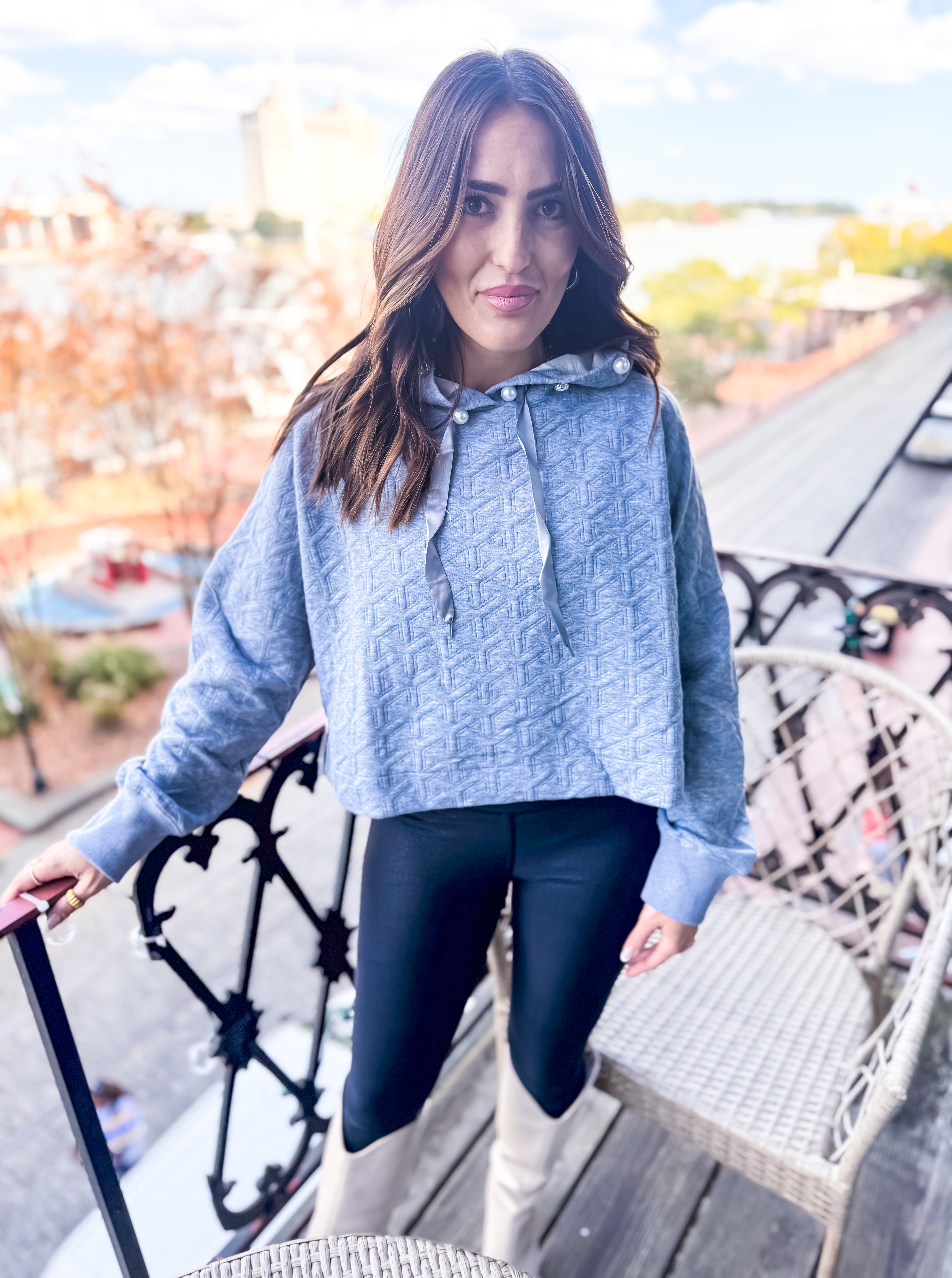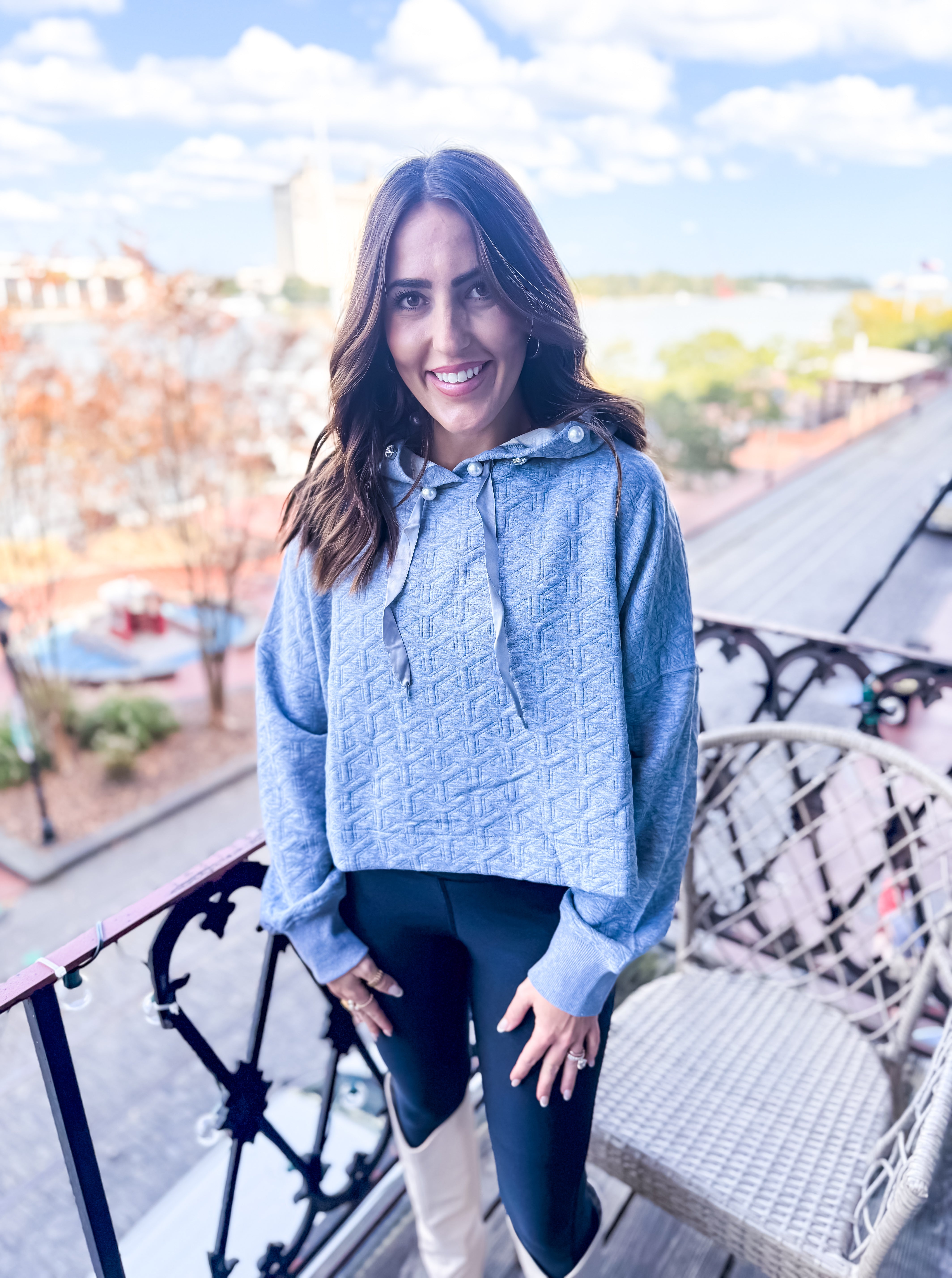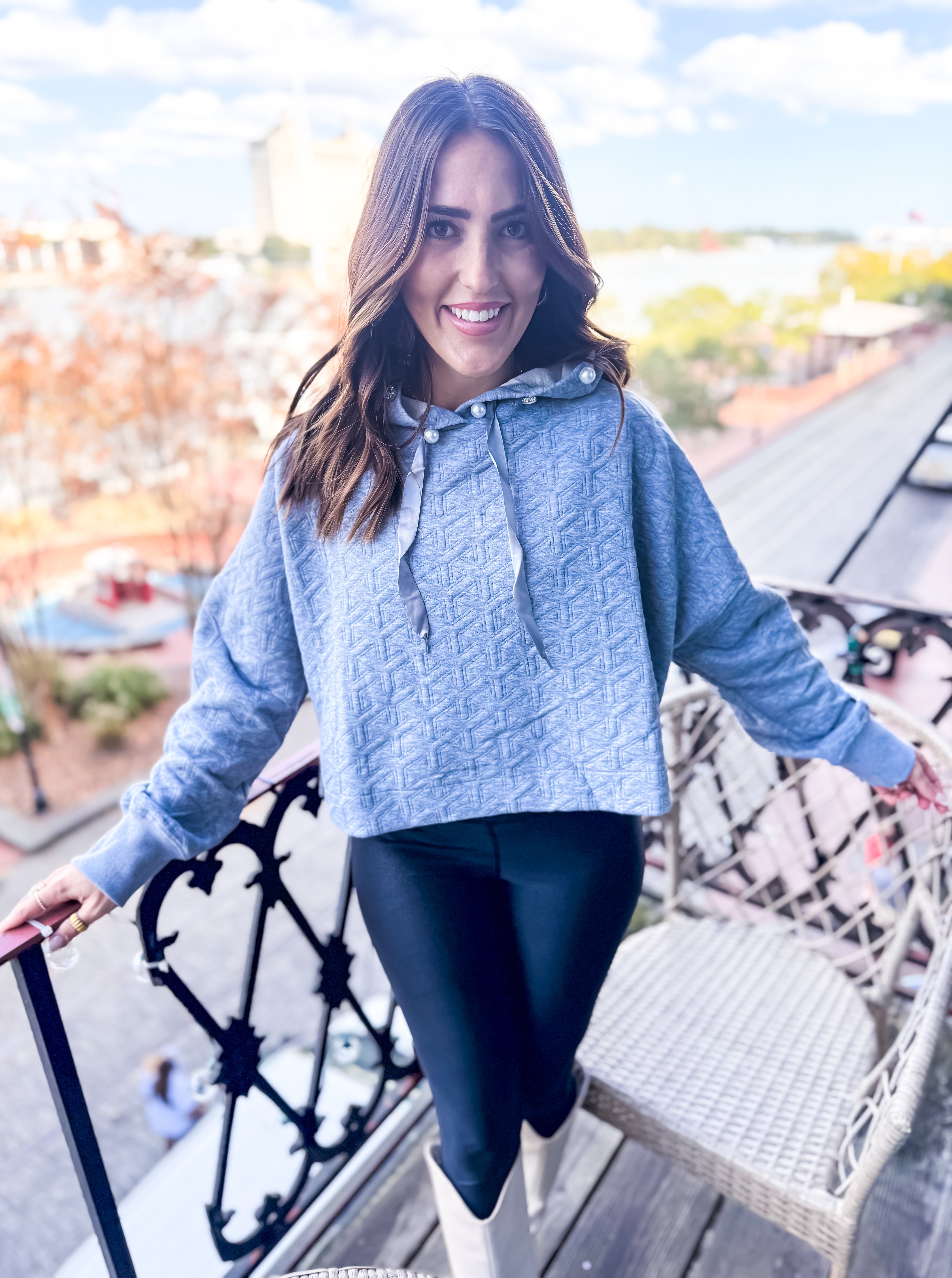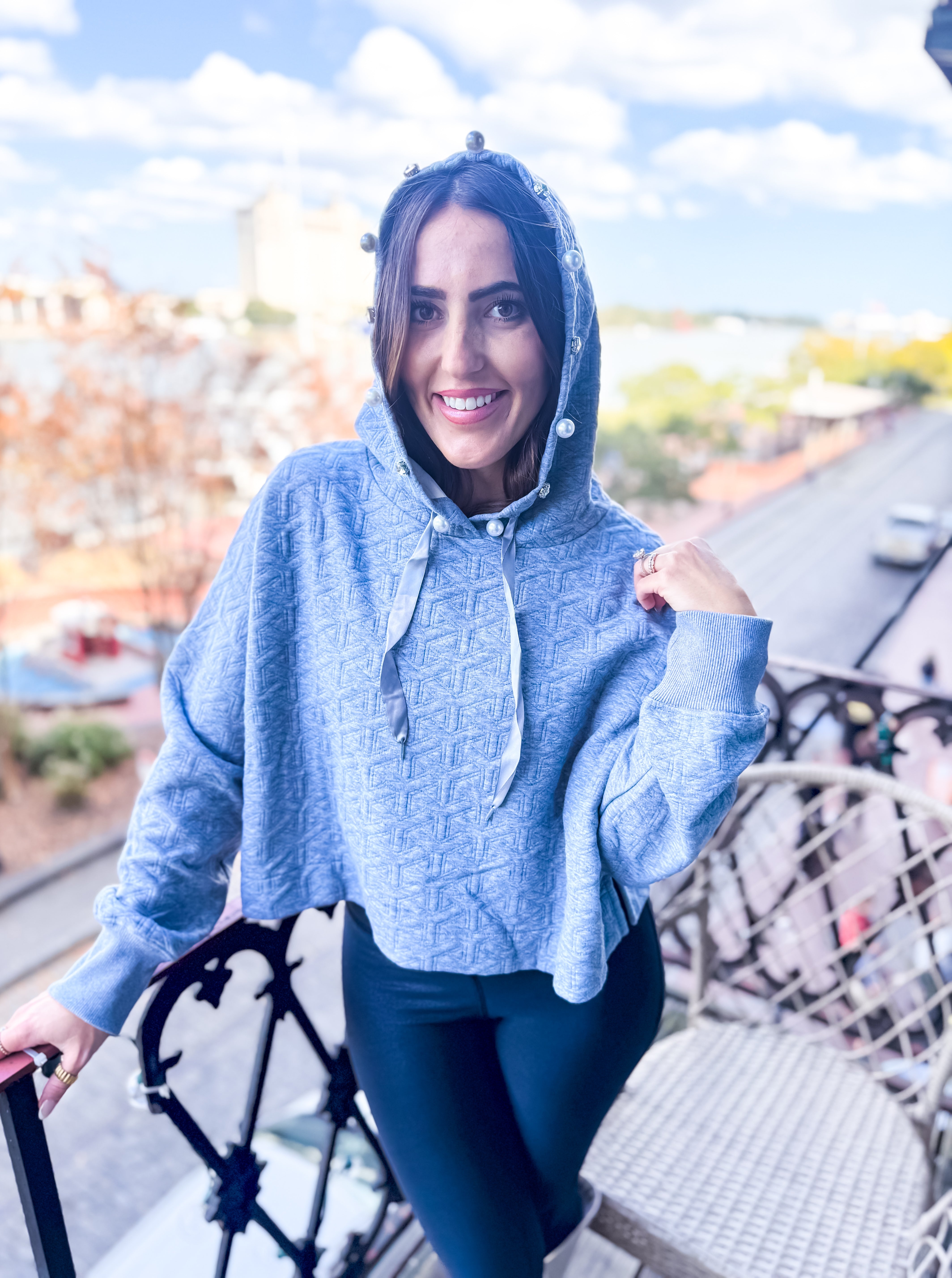Elevate your everyday look with these quilted hoodies, making a statement wherever you go. Features pearl and rhinestone embellishments around the neckline, silk drawstring, and a Simply Southern emblem. Made of 97% polyester and 3% spandex.