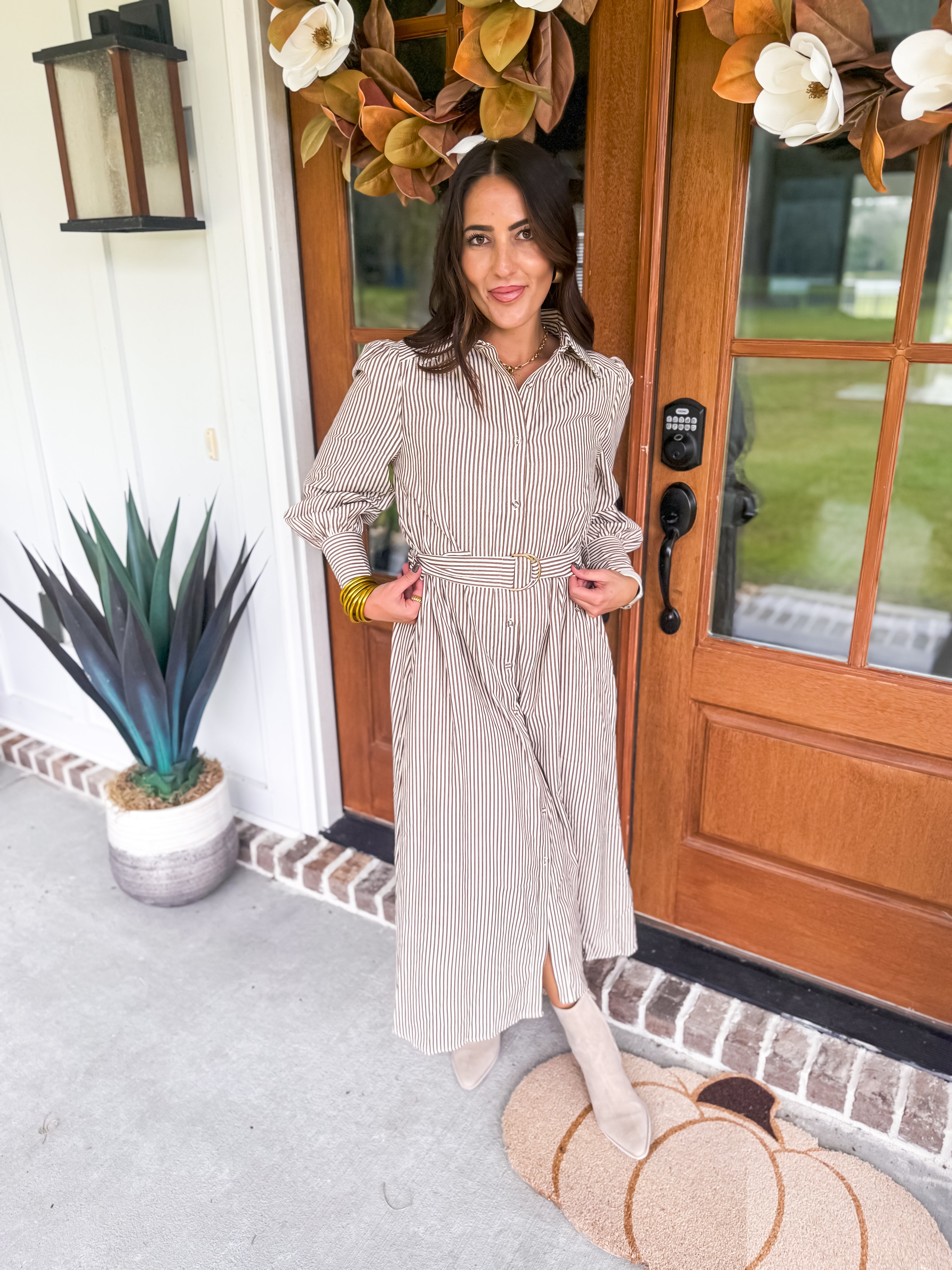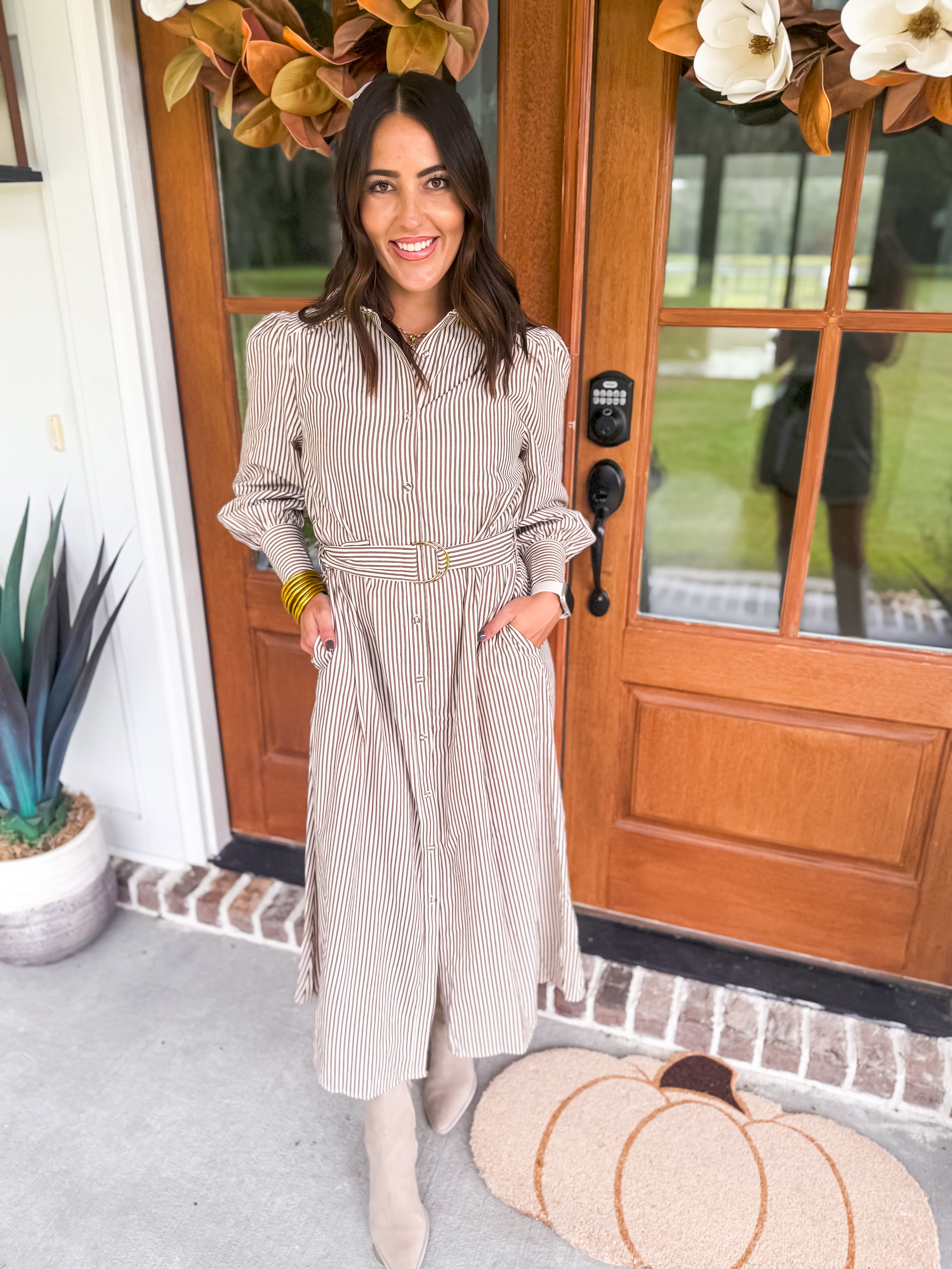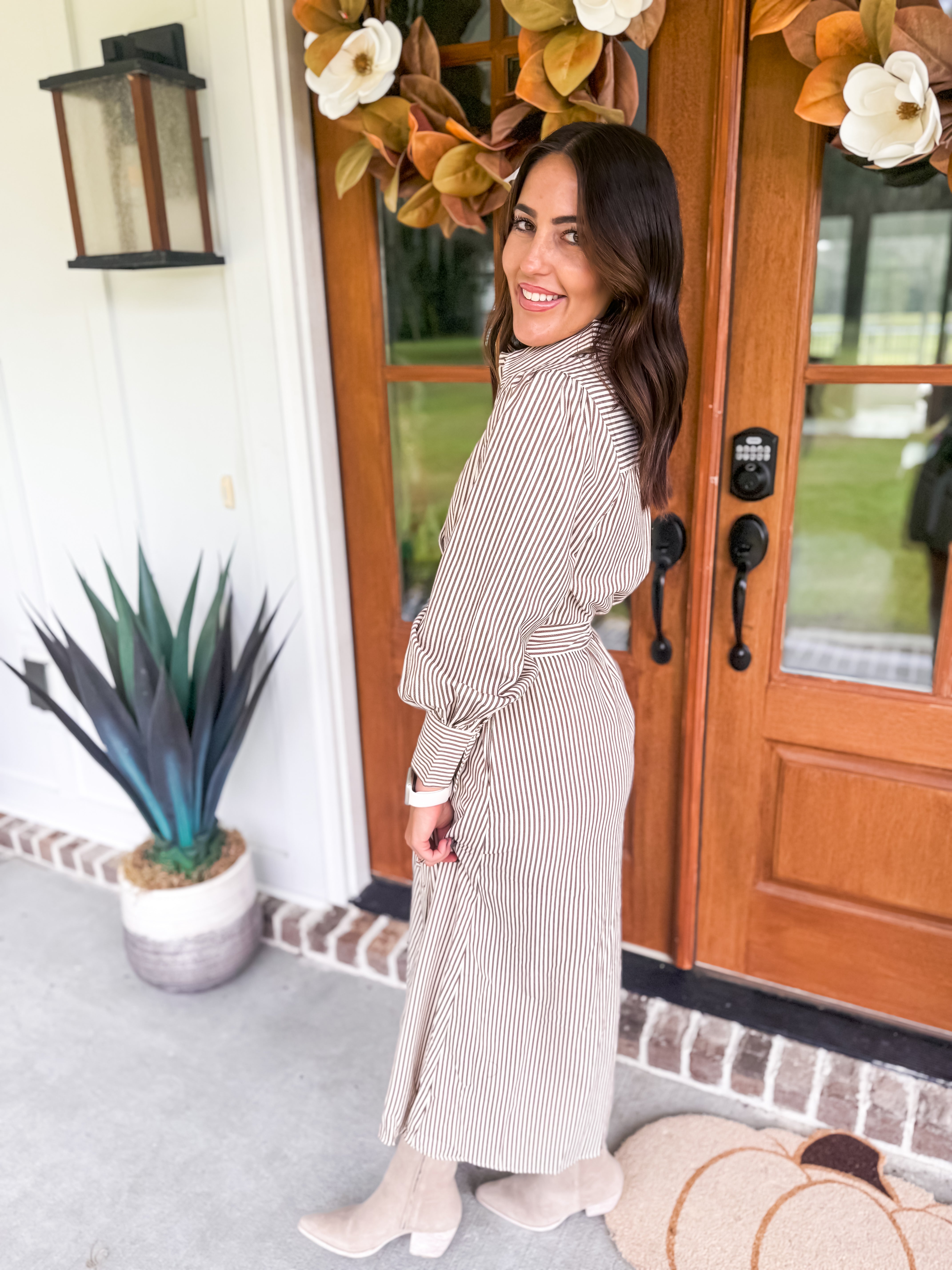 Elevate your style with this long sleeve striped midi dress, featuring a classic collar, button-up detail, and a flattering belt at the waist. Complete with pockets for a practical touch, it’s a sophisticated choice for any occasion.