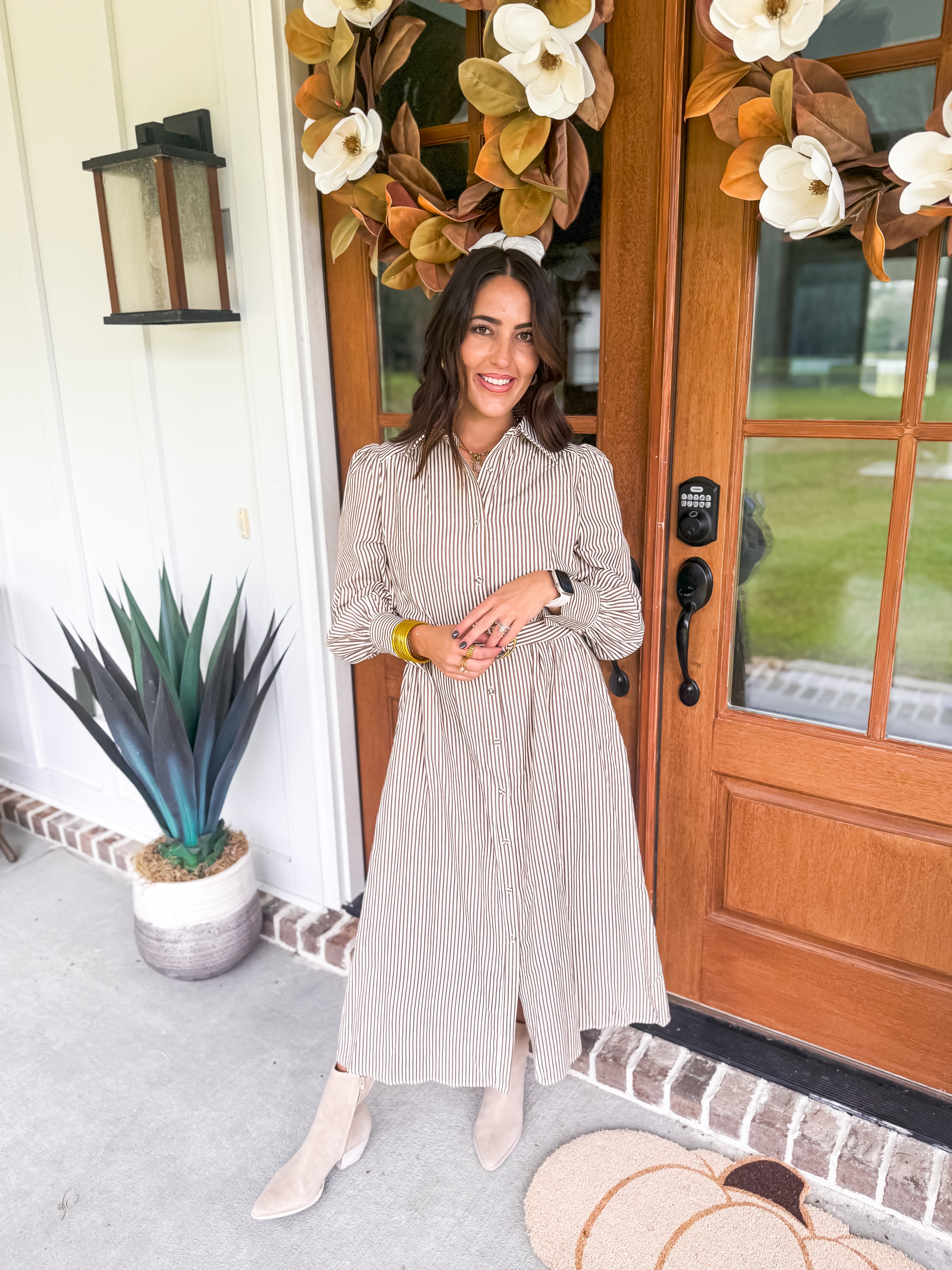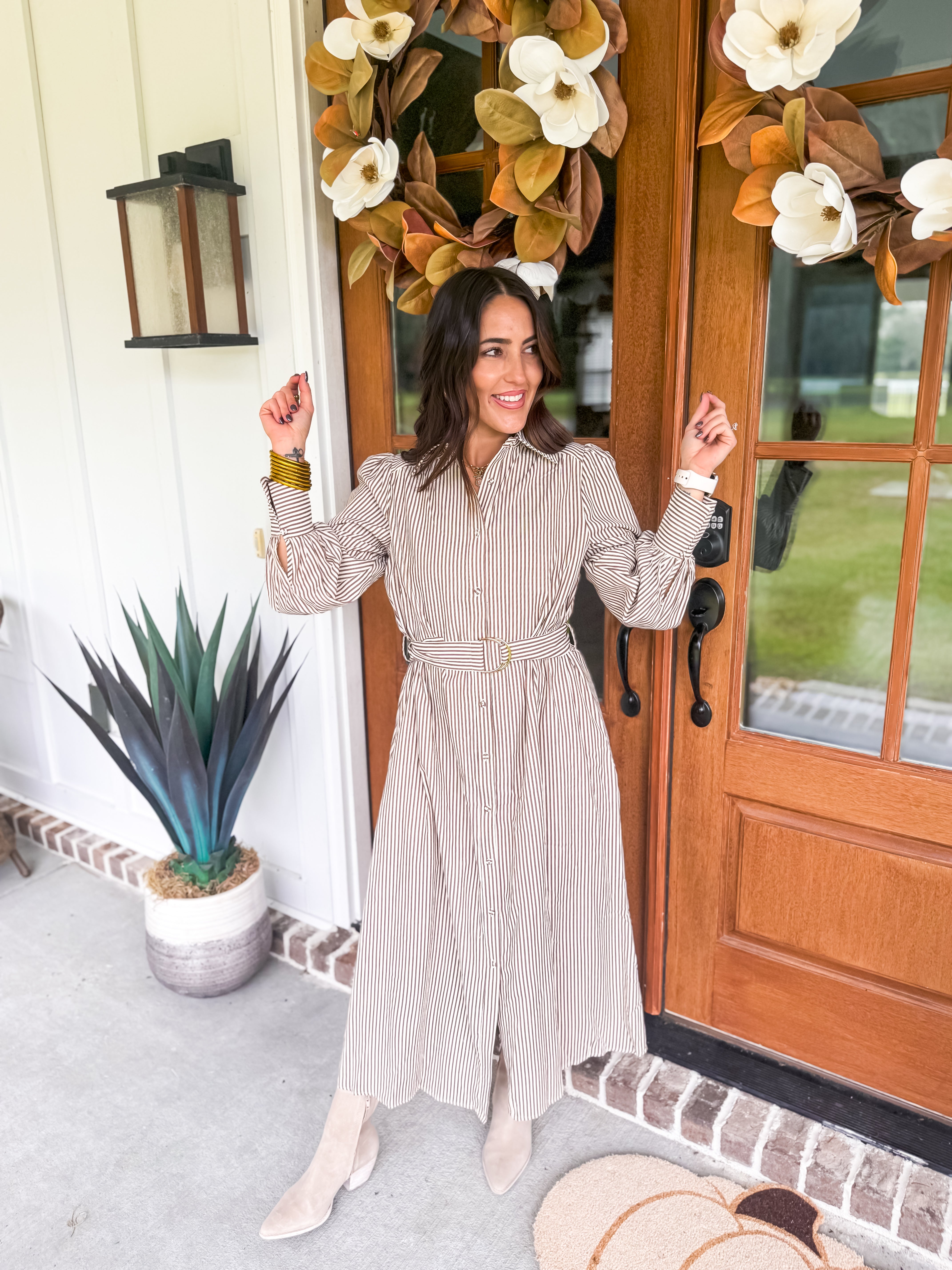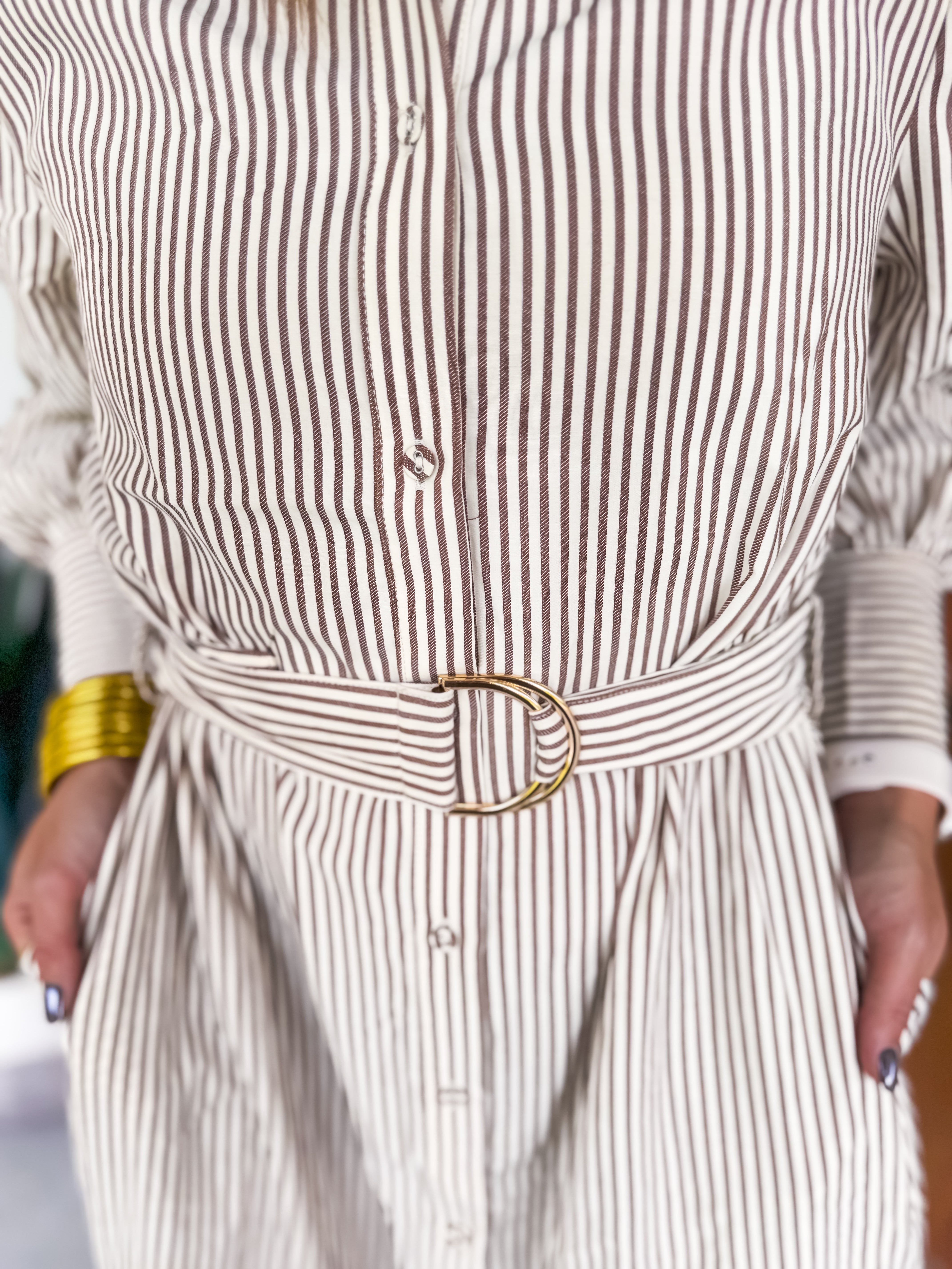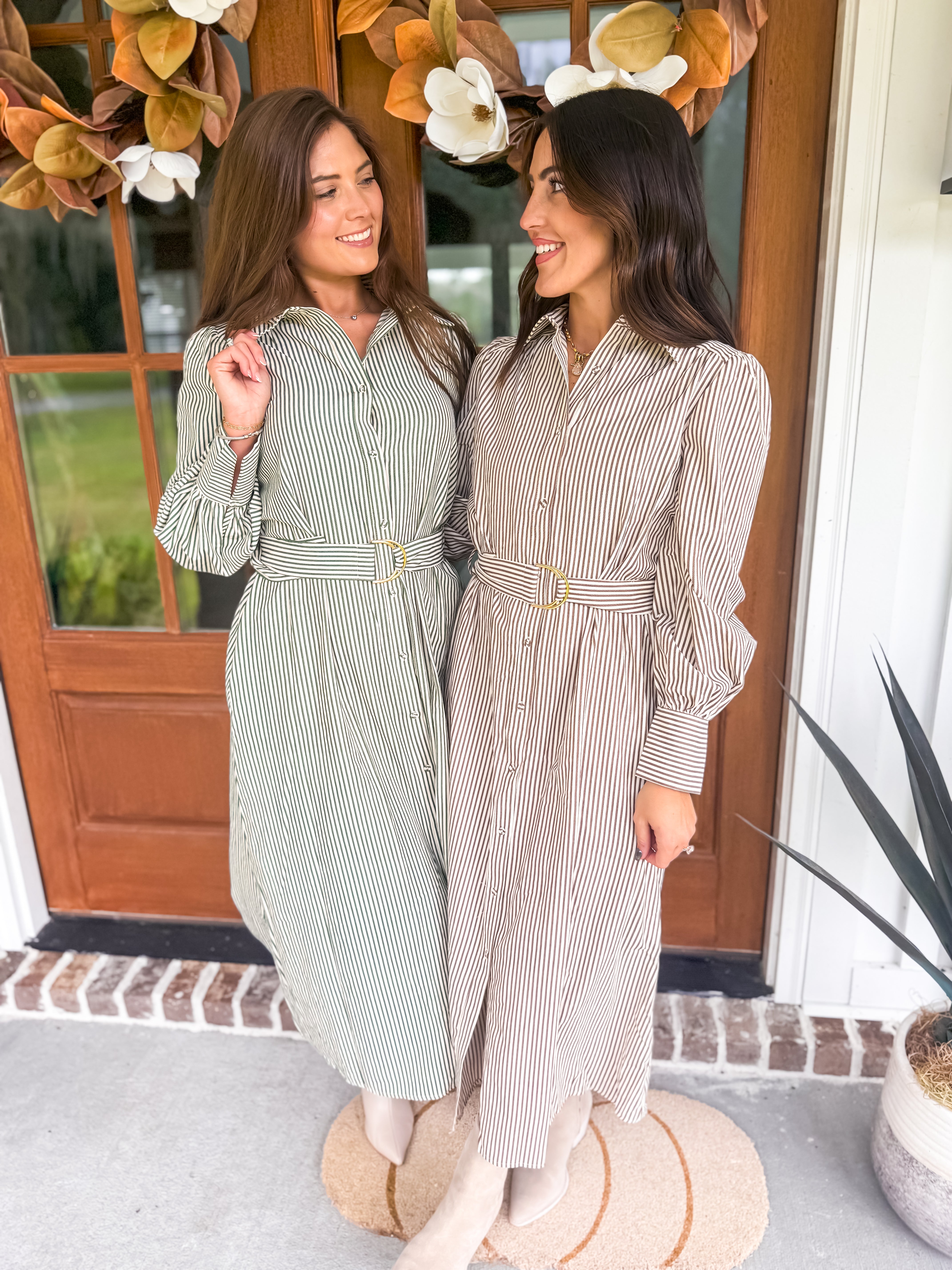 Elevate your style with this long sleeve striped midi dress, featuring a classic collar, button-up detail, and a flattering belt at the waist. Complete with pockets for a practical touch, it’s a sophisticated choice for any occasion.