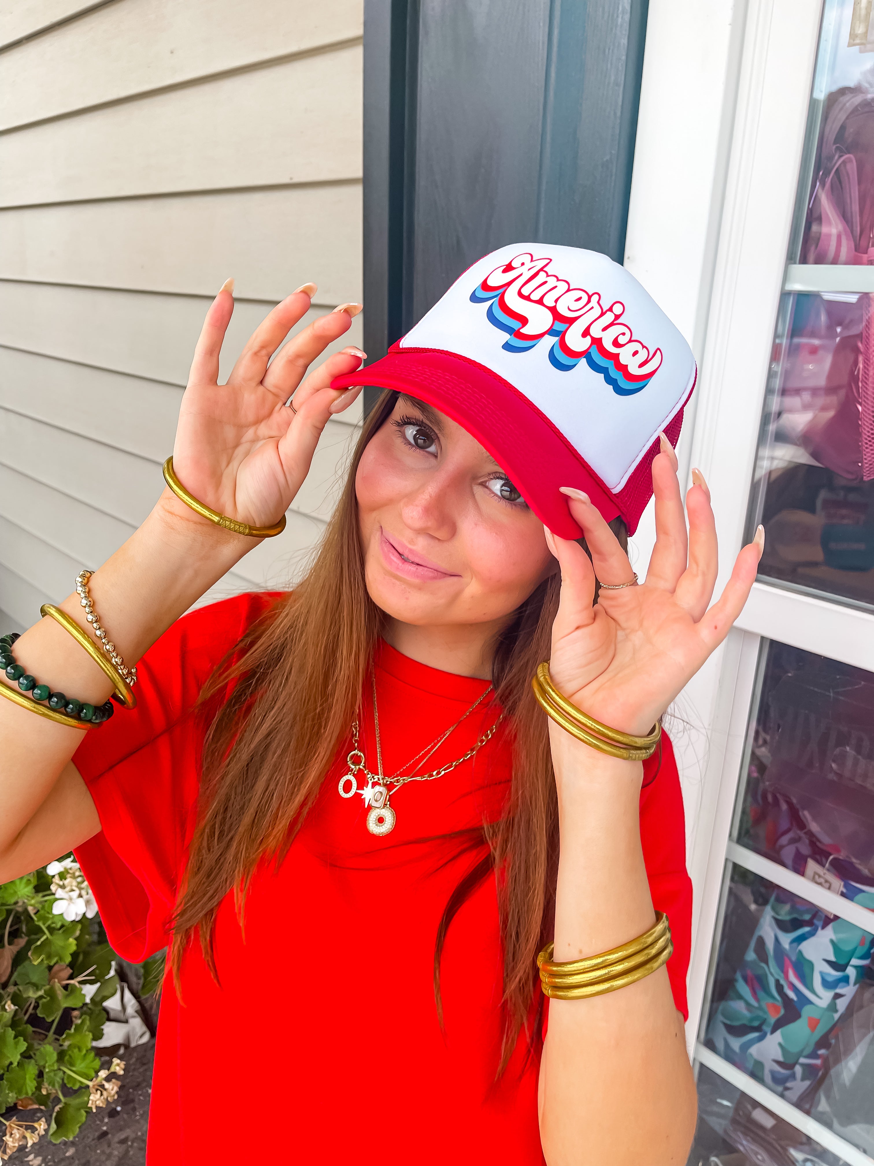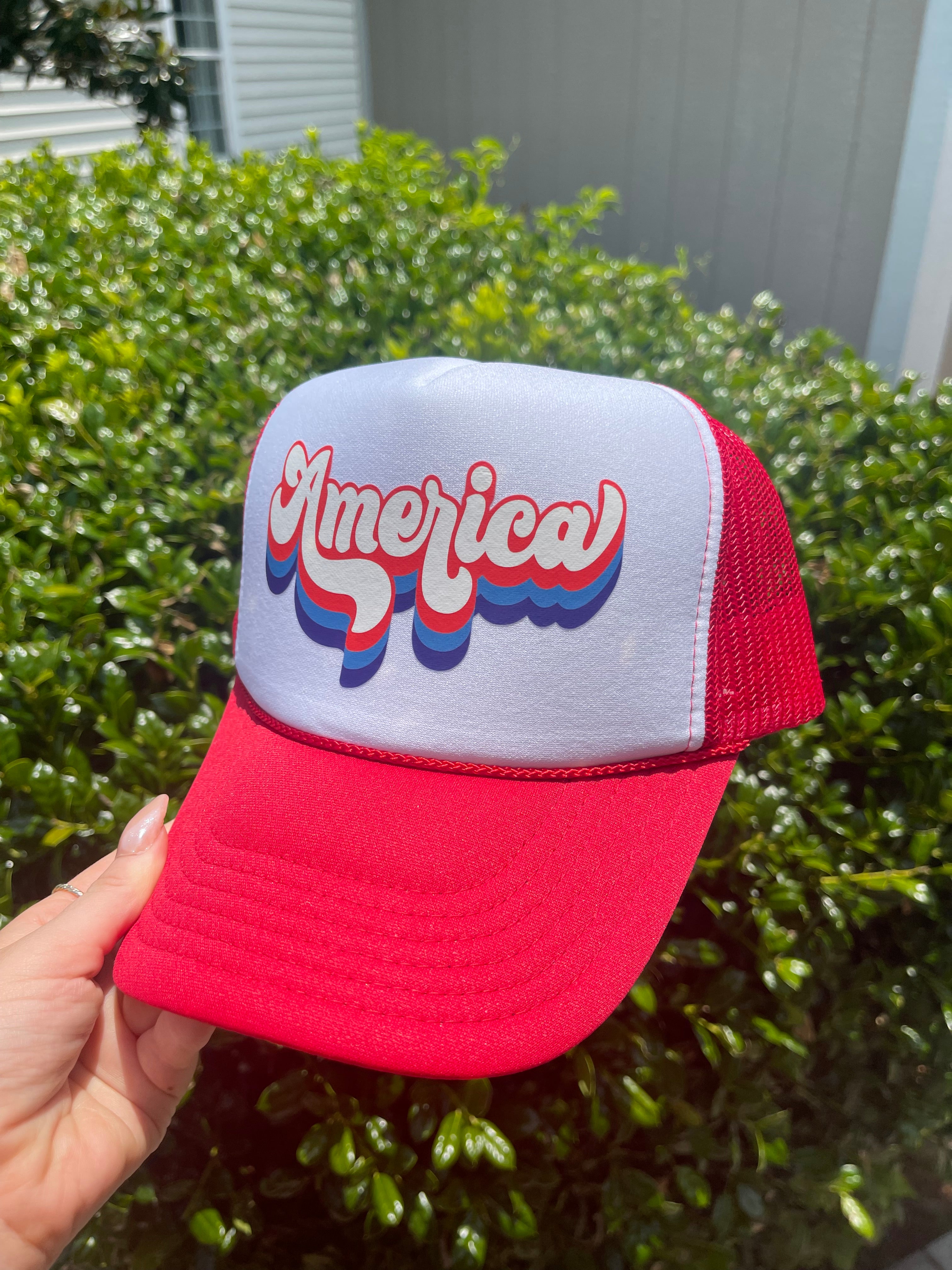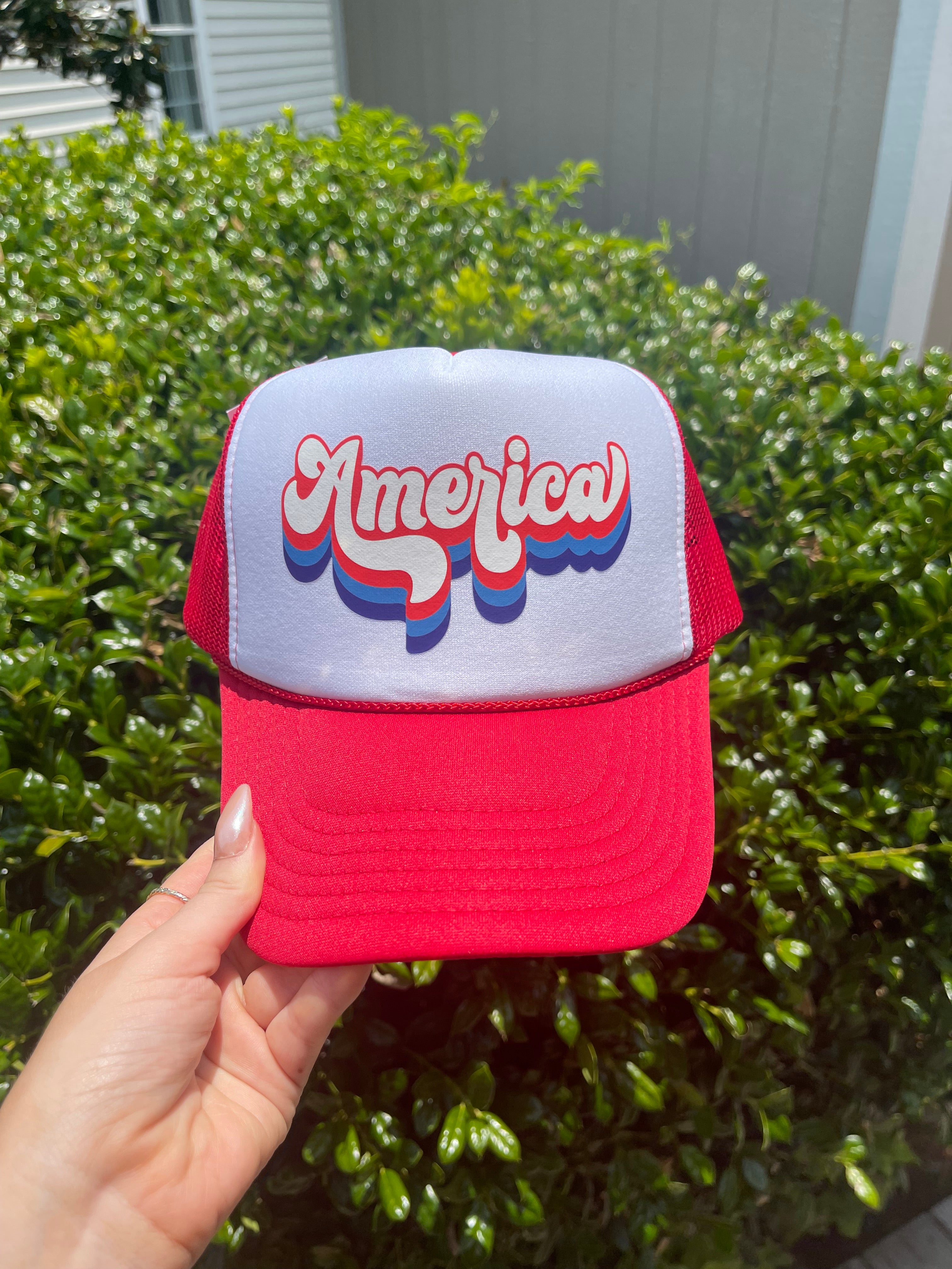Retro inspried Red, White, & Blue America caps are perfect for Memorial Day, Fourth of July, or just when you are feeling patriotic!! This design is screen printed onto your favorite foam trucker or retro rope hat. Foam truckers have a foam front, mesh back, and adjustable snapback enclousre. Retro rope hats a nylon caps with a rope accent and adjustable snapback enclosure. Add a trucker hat chain and your patriotic look is ready!