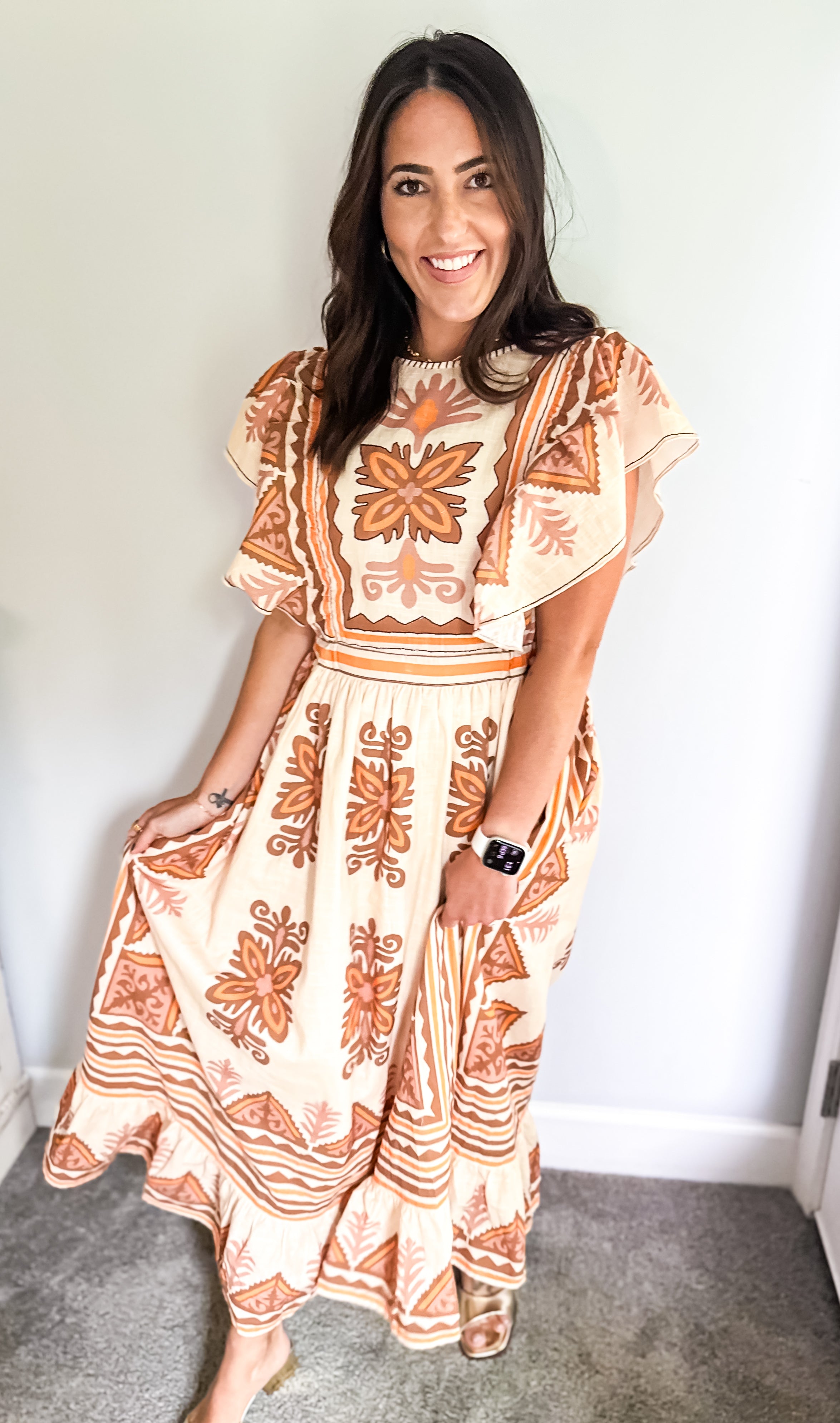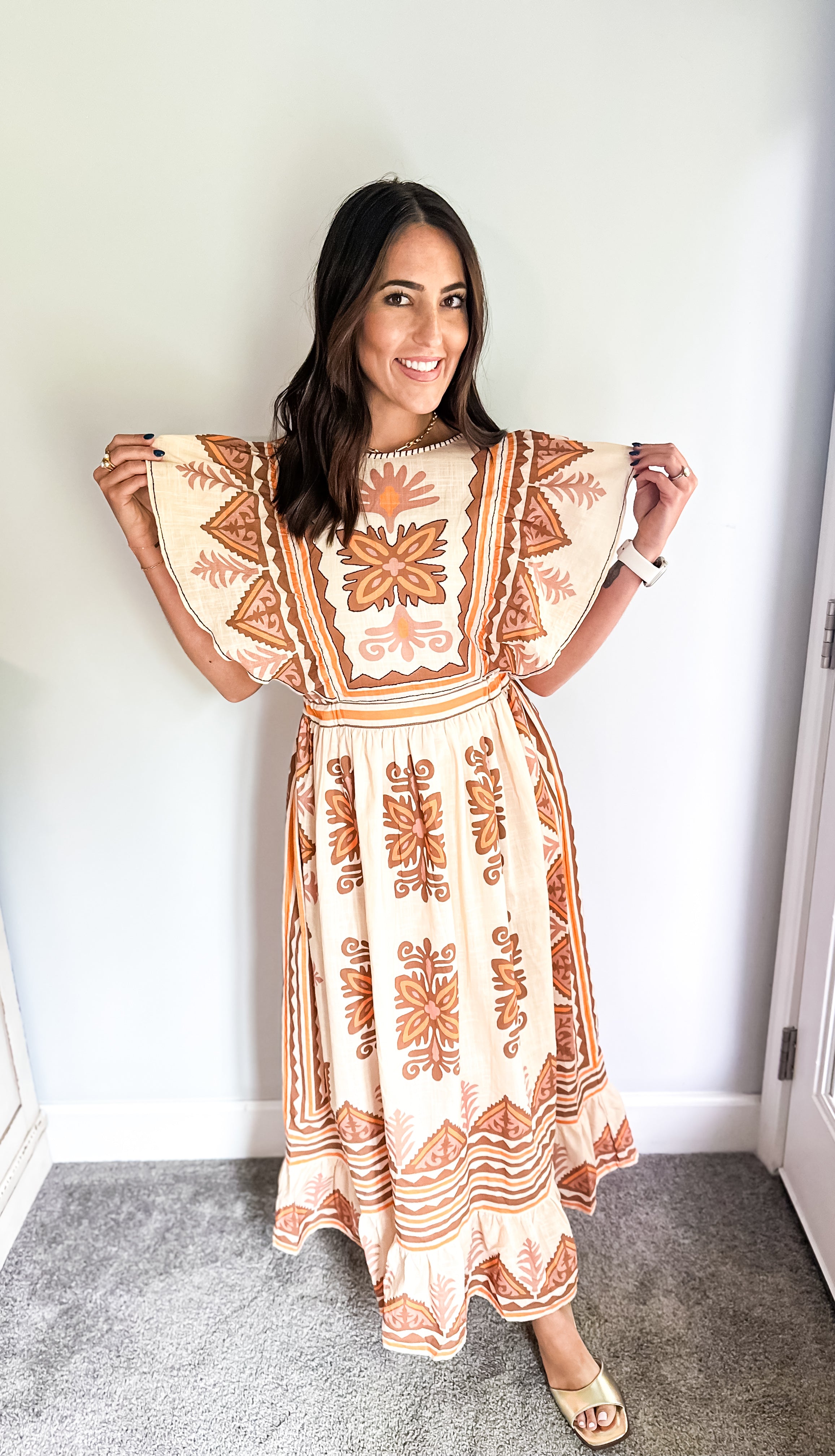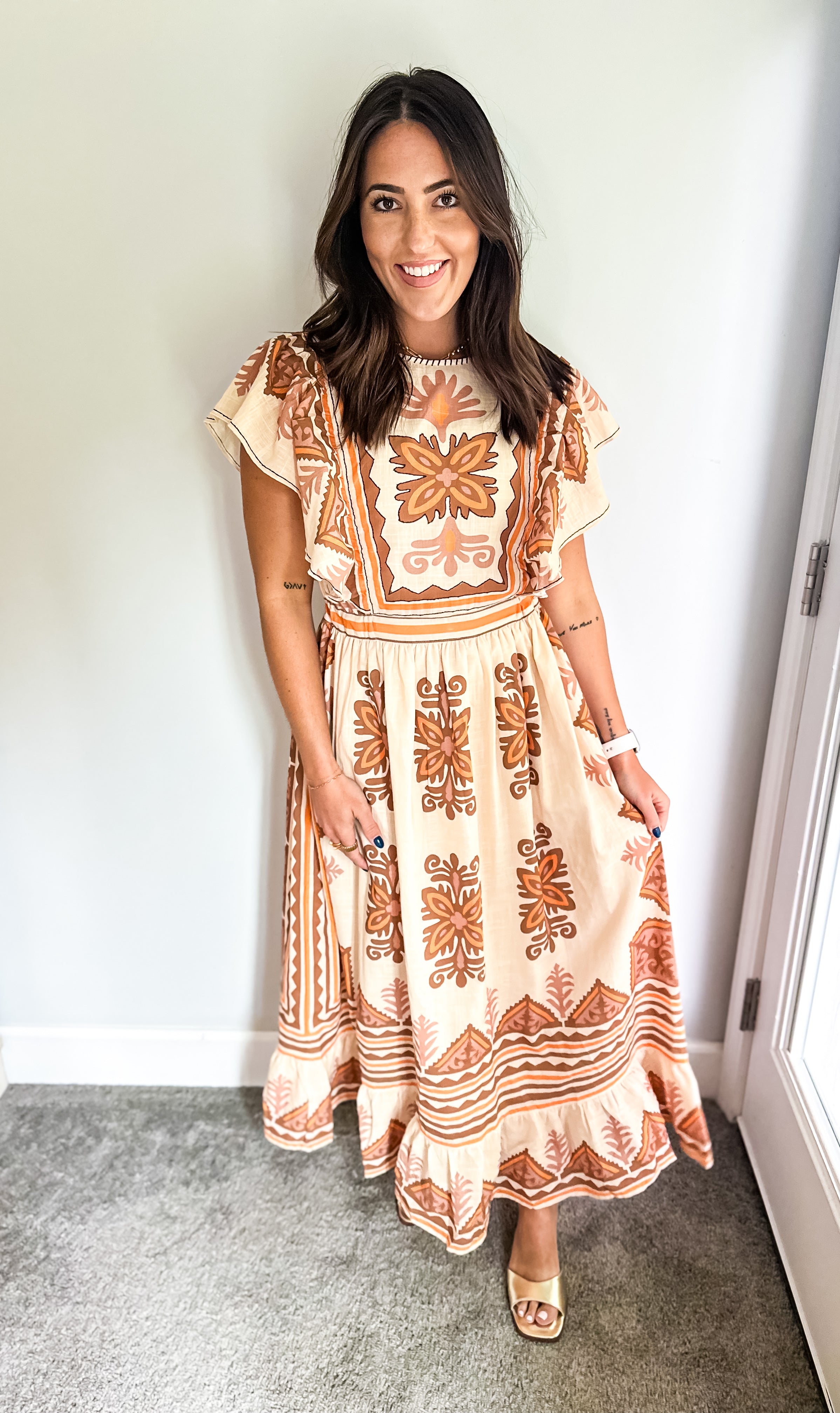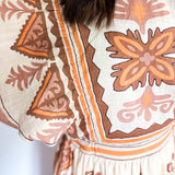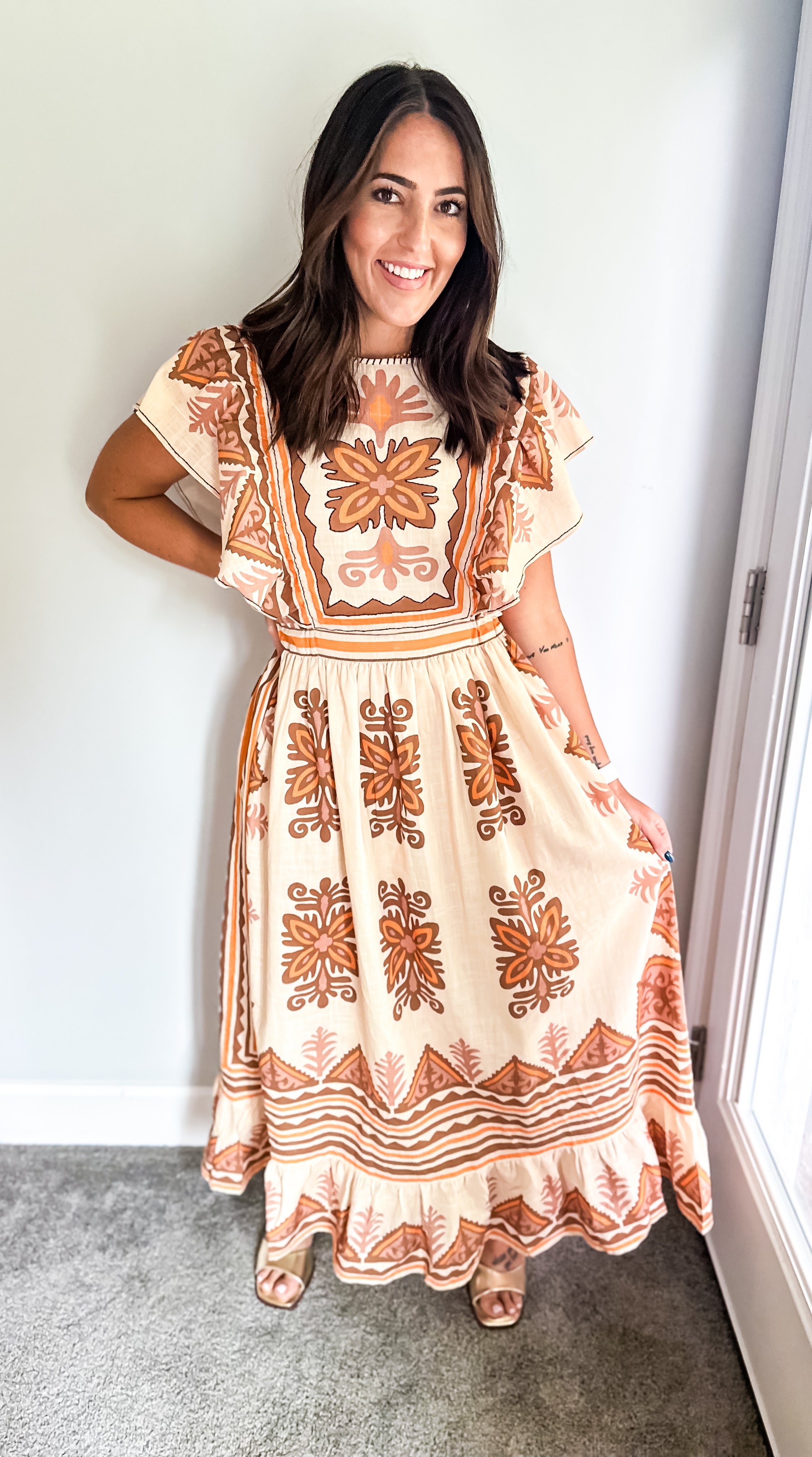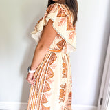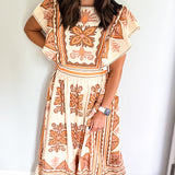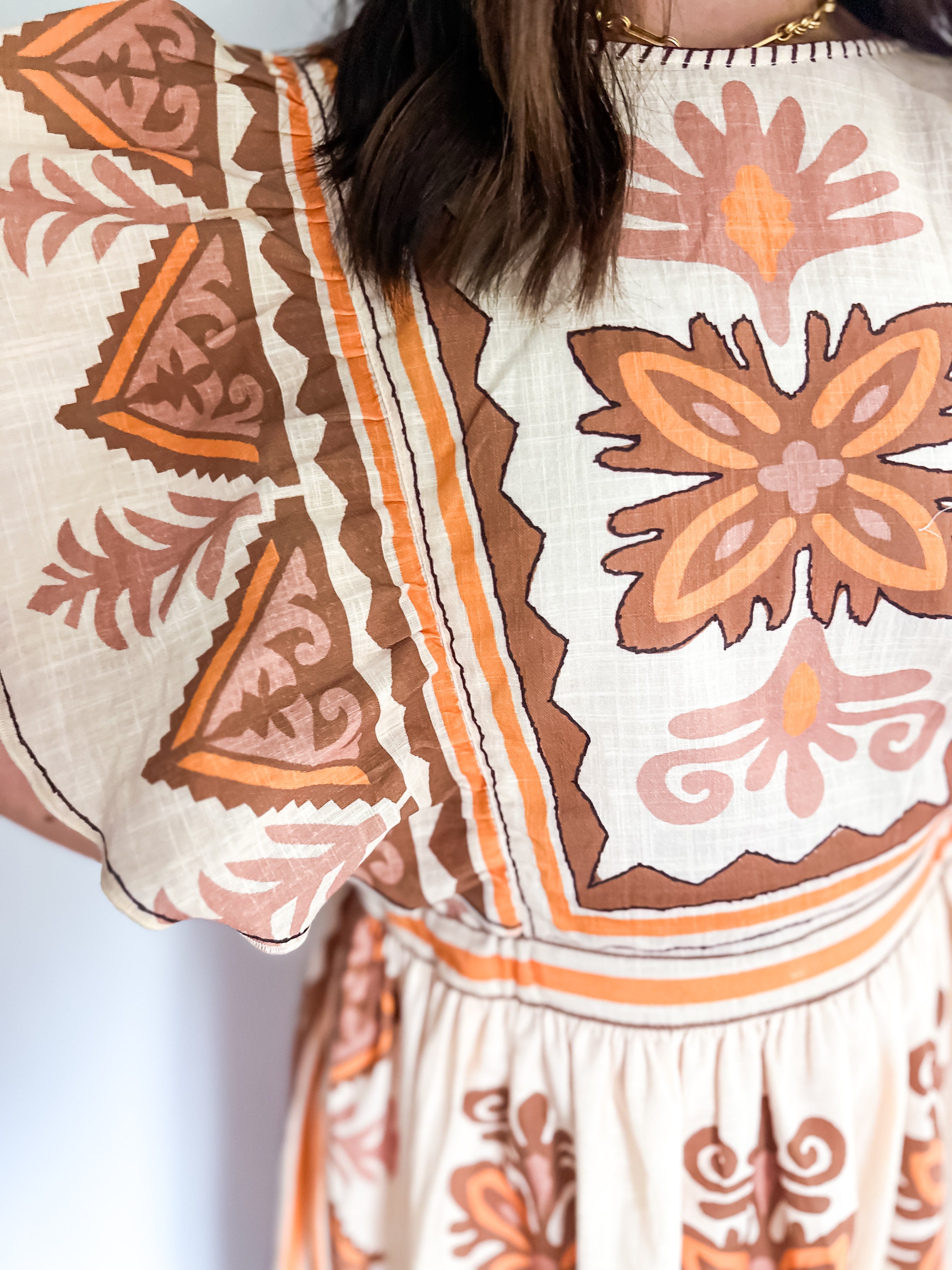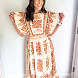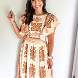 Embrace the essence of fall with our stunning midi dress, featuring a creamy base adorned with intricate embroidery in rich deep orange and brown hues. Beauty offers both comfort and elegance, making it an ideal choice for all your autumn celebrations—especially Thanksgiving. Its true midi length adds a touch of sophistication, ensuring you’ll feel as good as you look. Don’t miss out on this perfect fall staple!