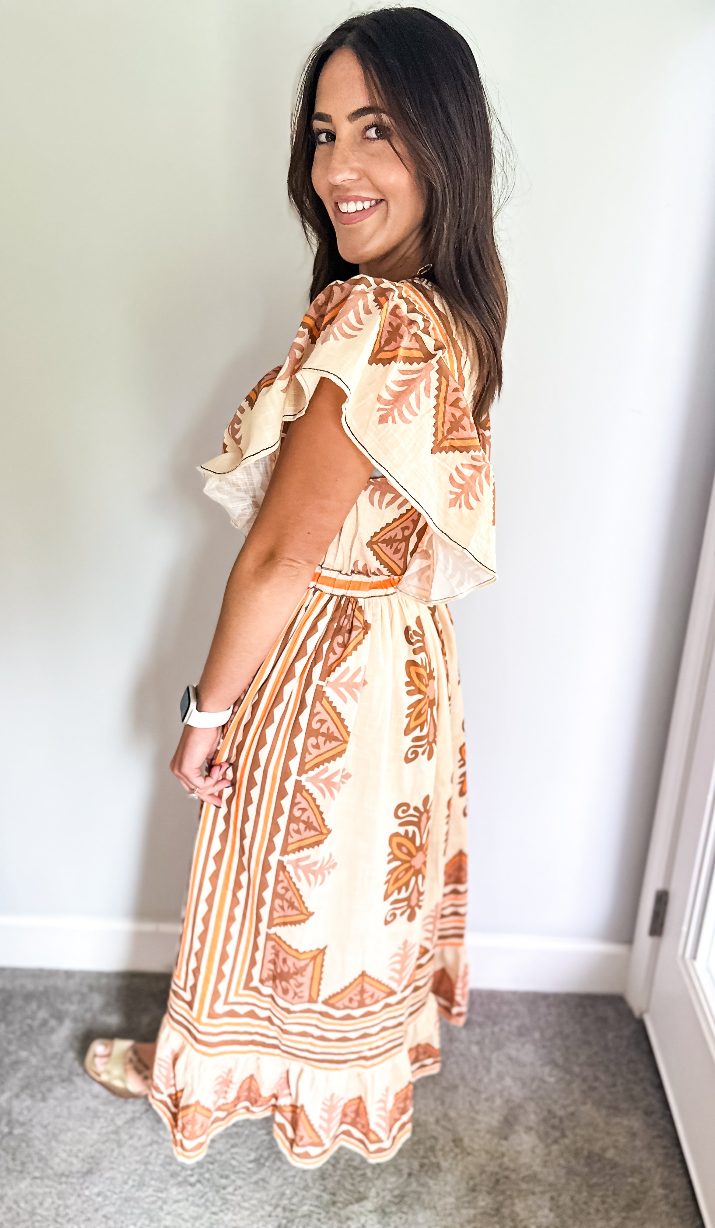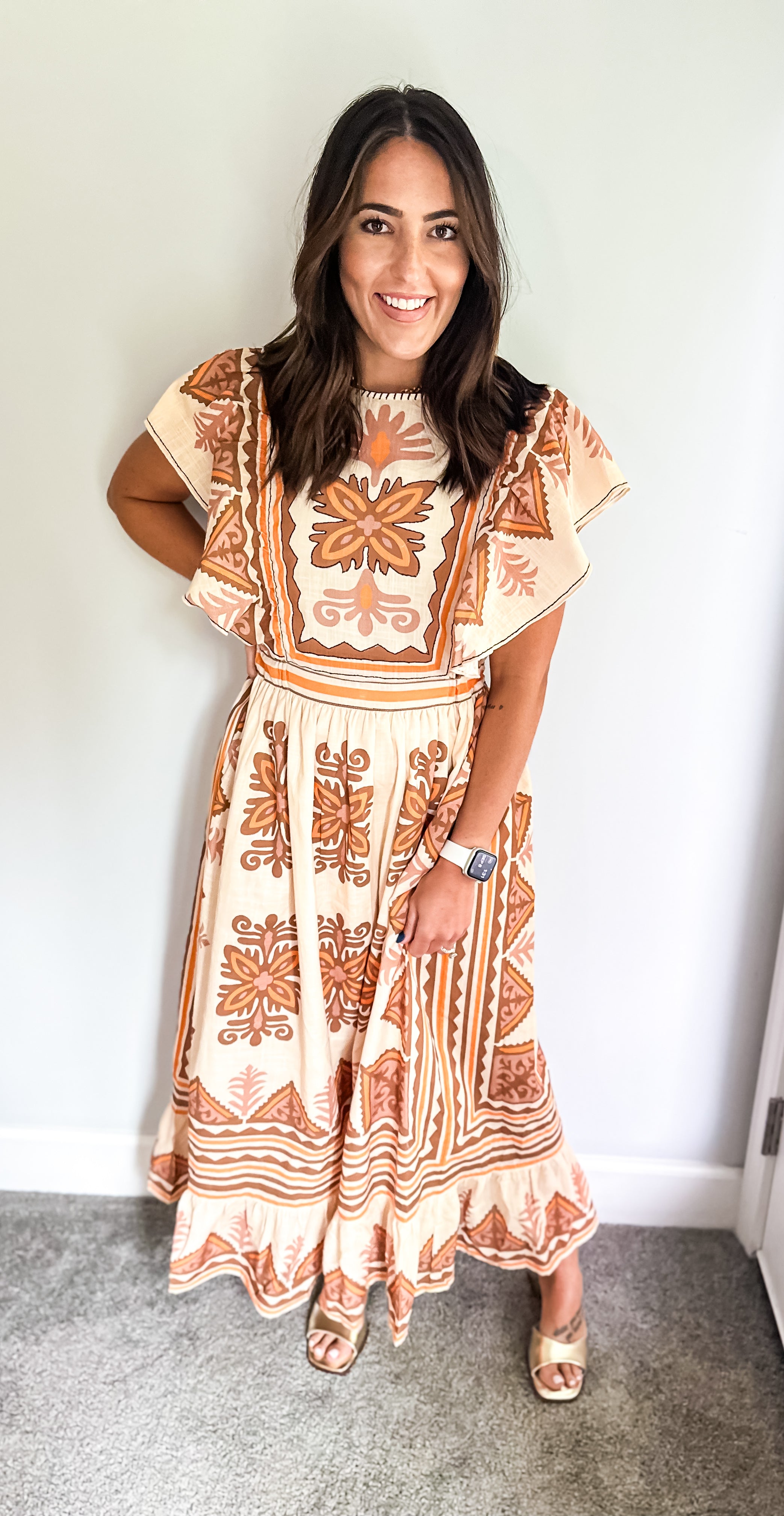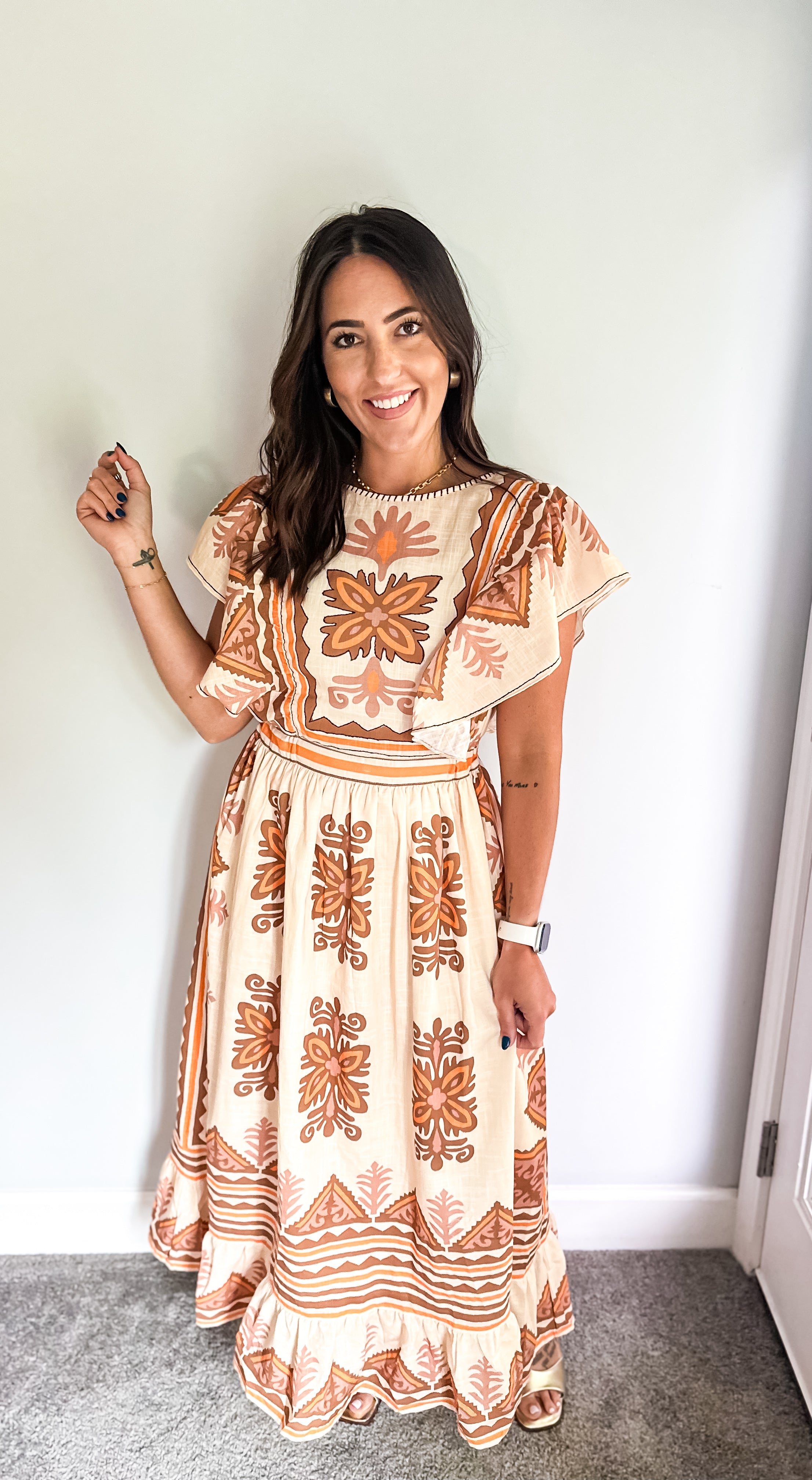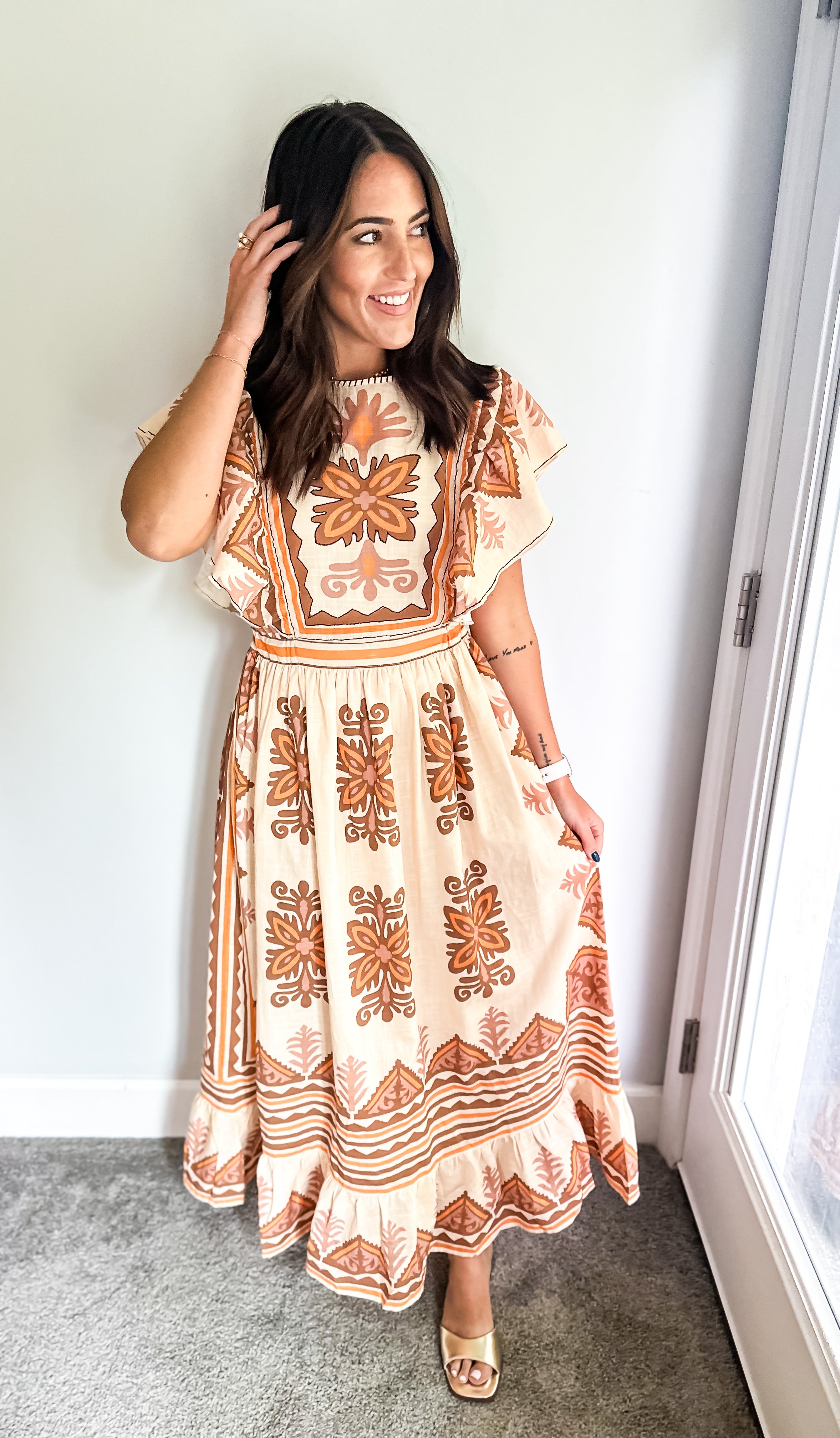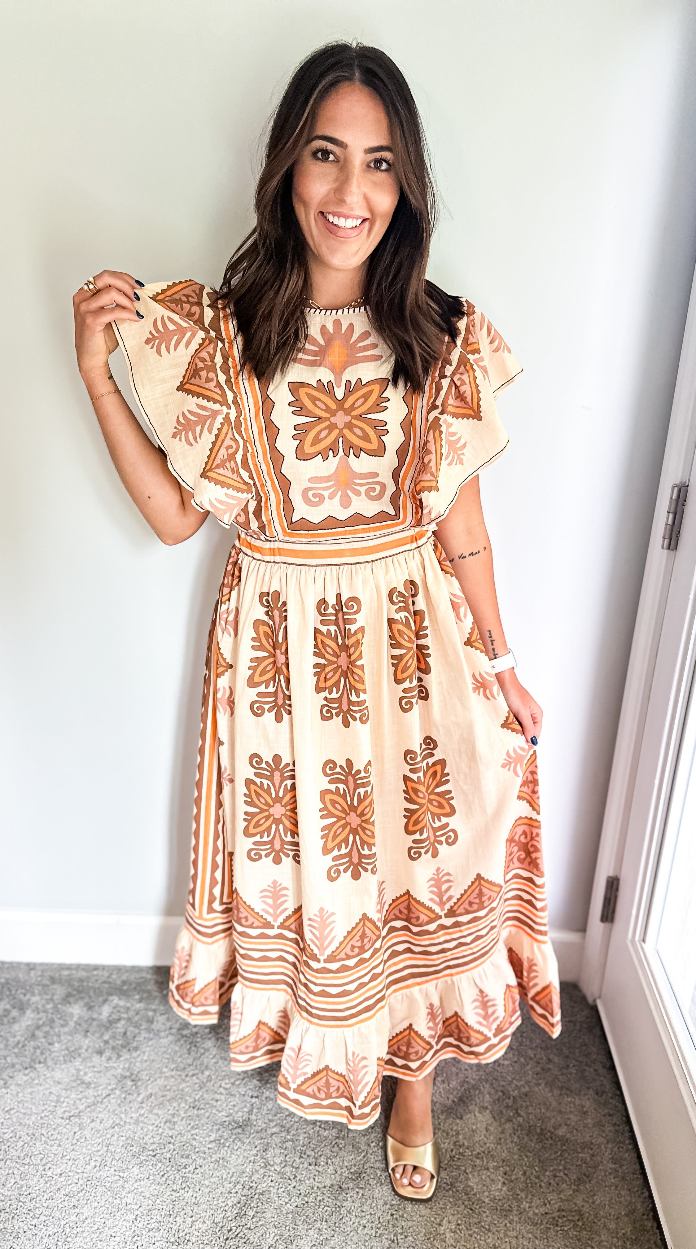 Embrace the essence of fall with our stunning midi dress, featuring a creamy base adorned with intricate embroidery in rich deep orange and brown hues. Beauty offers both comfort and elegance, making it an ideal choice for all your autumn celebrations—especially Thanksgiving. Its true midi length adds a touch of sophistication, ensuring you’ll feel as good as you look. Don’t miss out on this perfect fall staple!