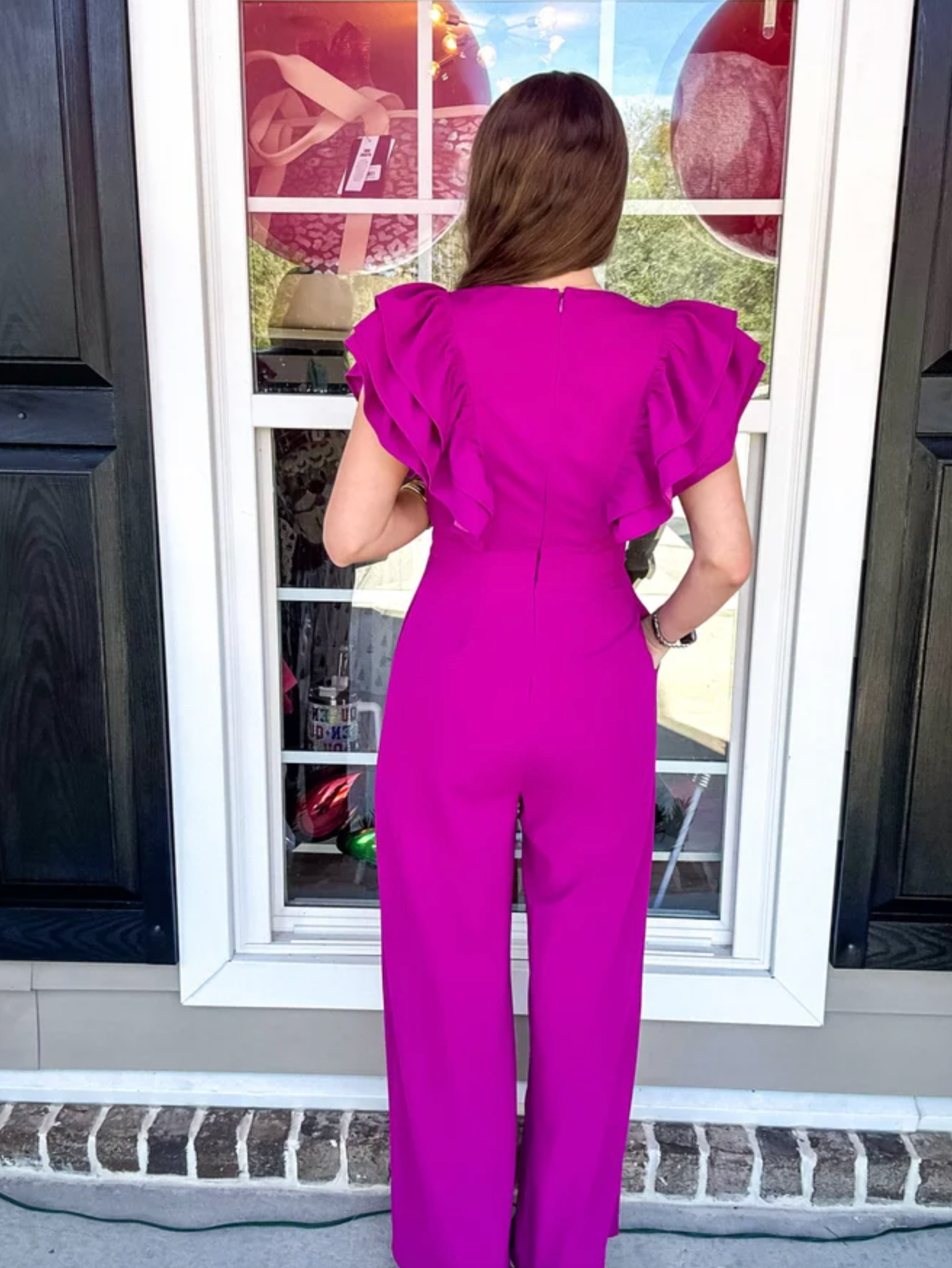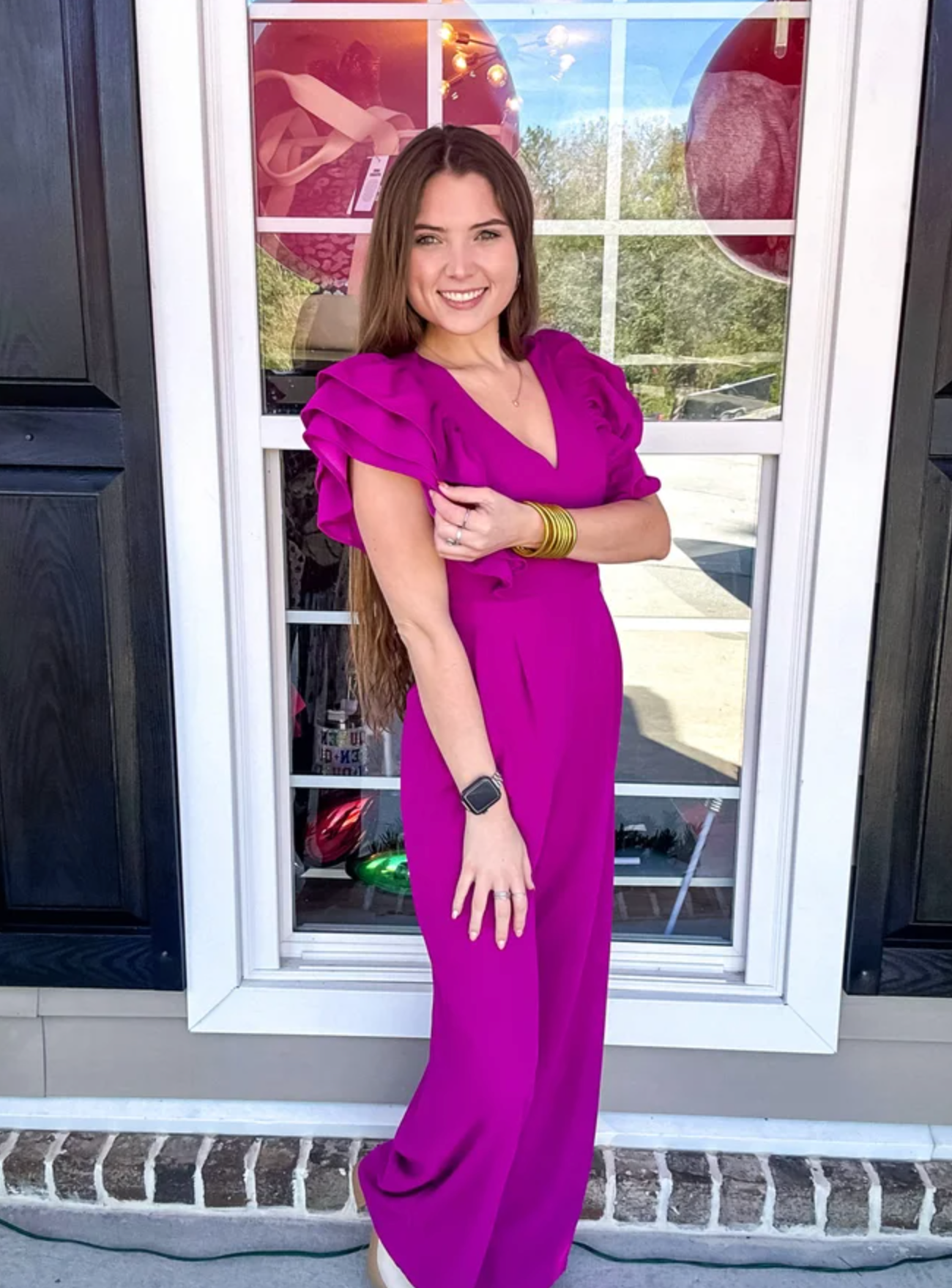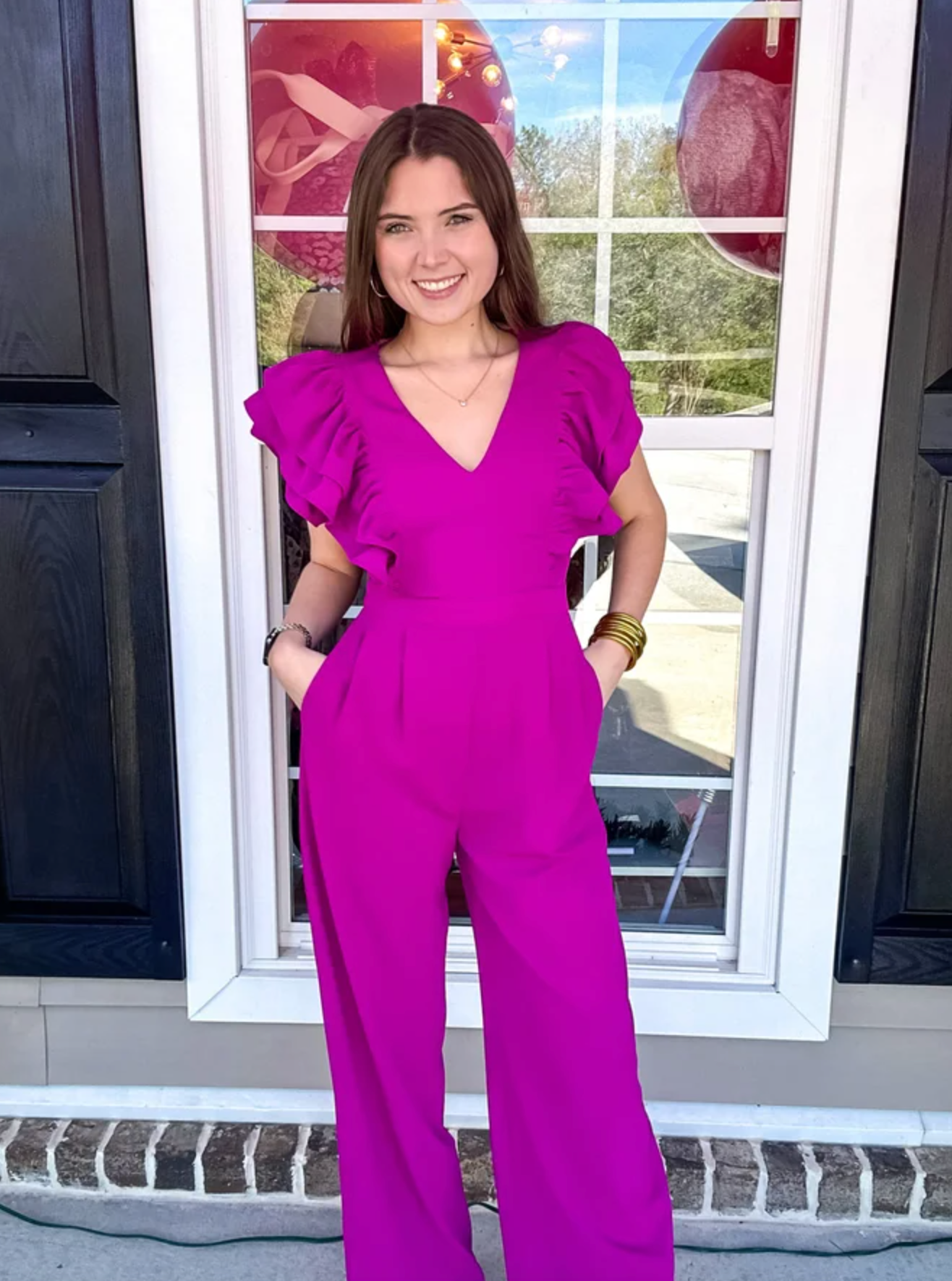 Solid v-neck ruffle sleeve jumpsuit featuring pocket at sides. Zip closure at back. Lined. Woven. Non-sheer. Lightweight.