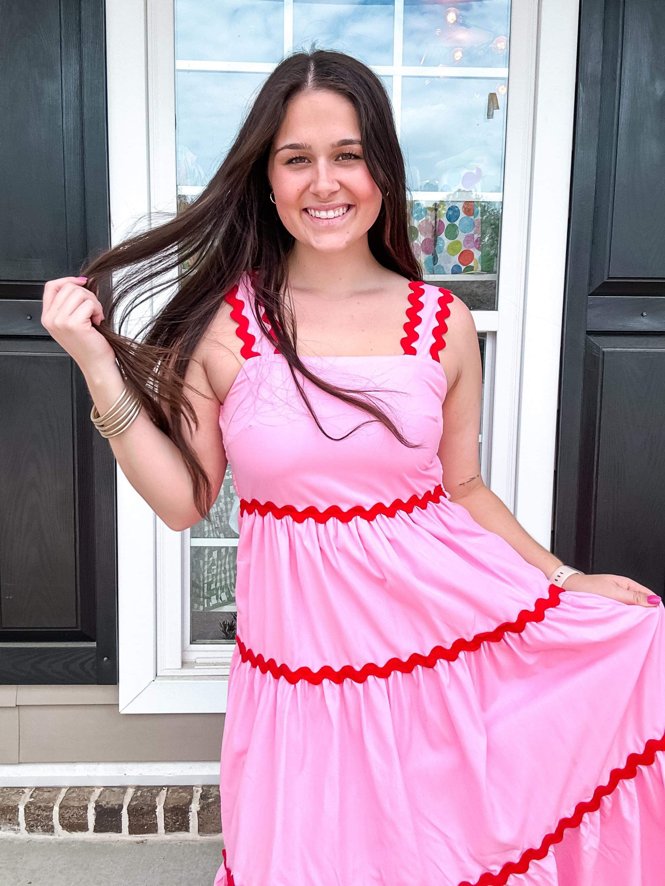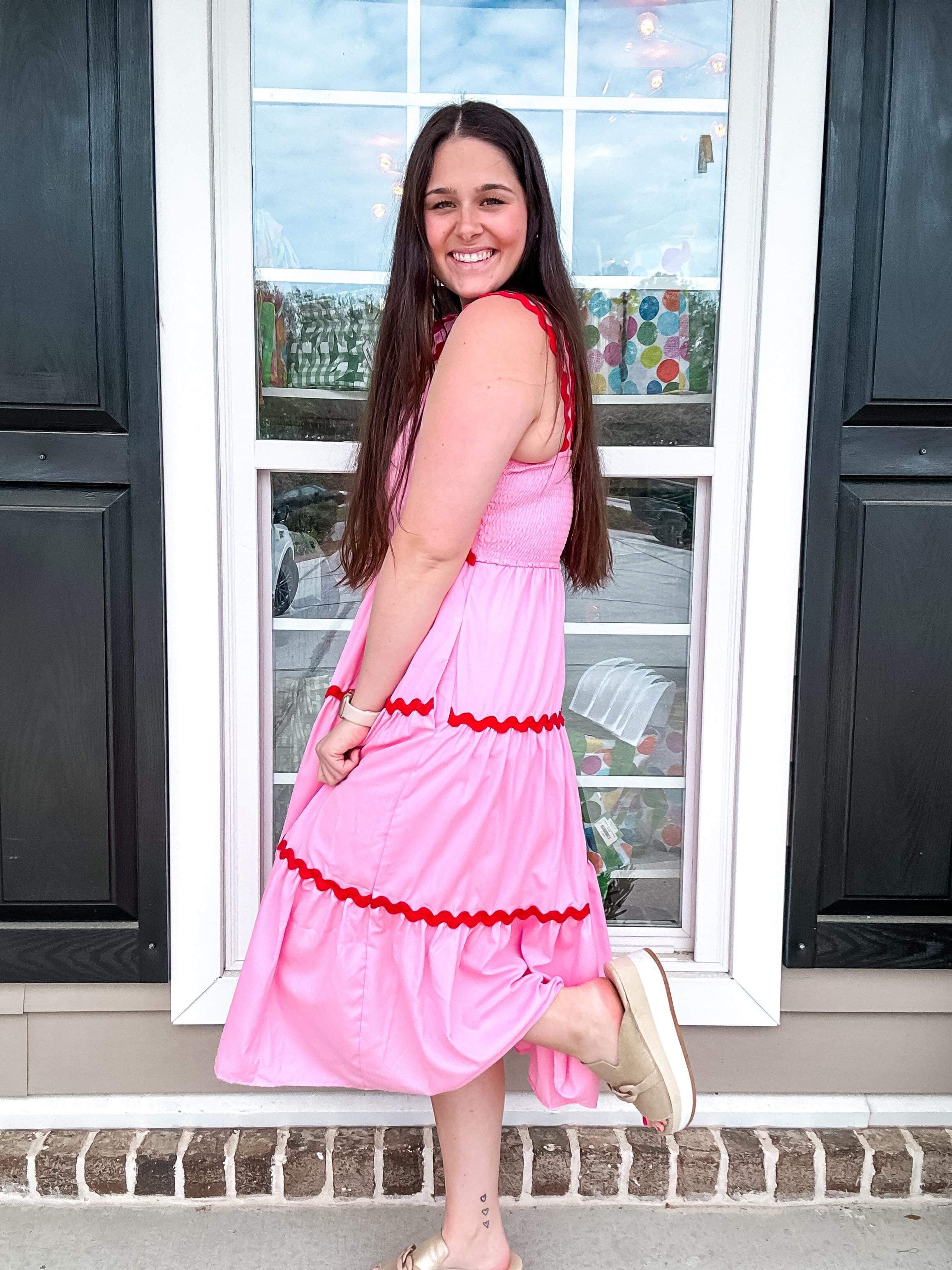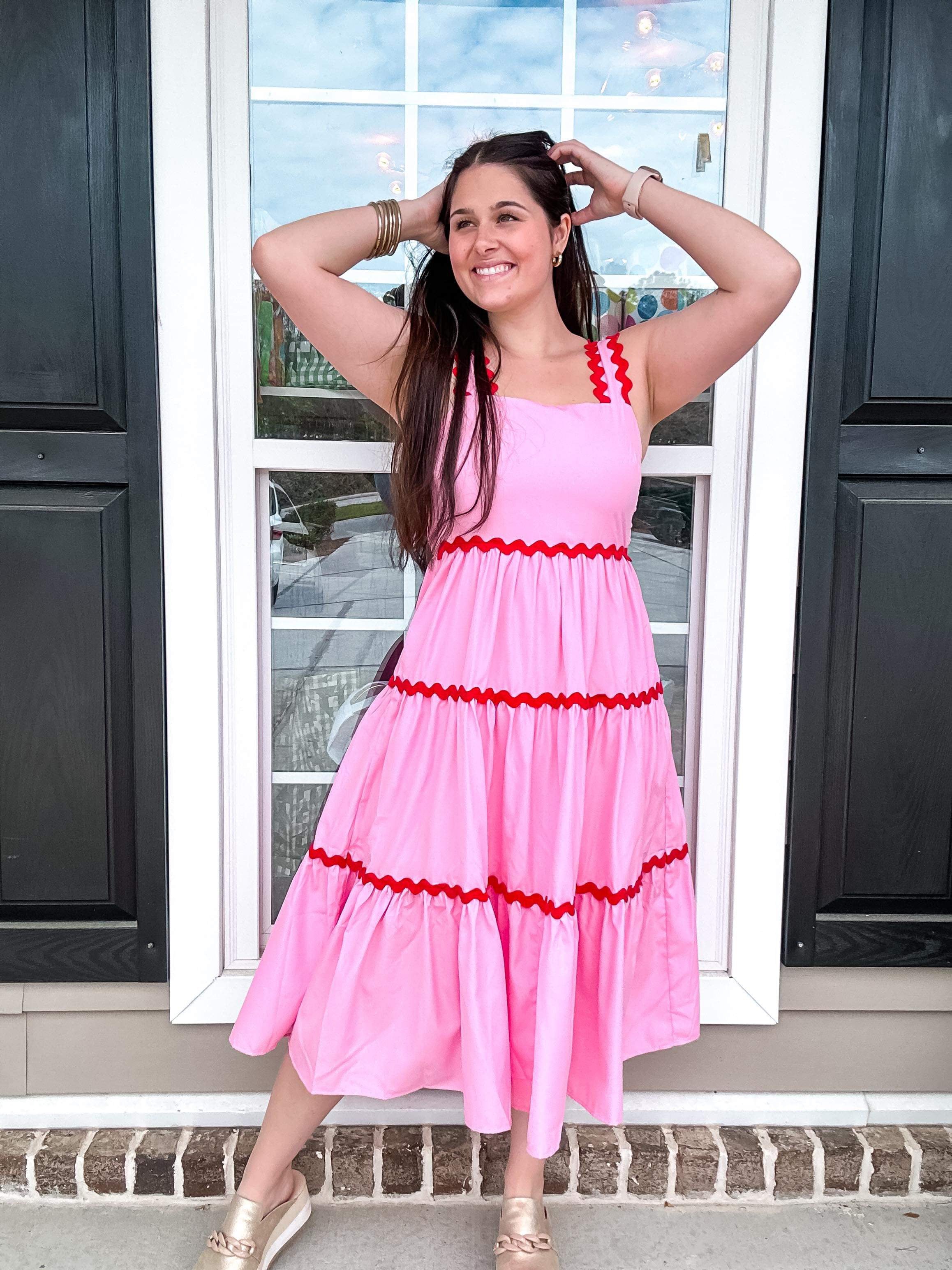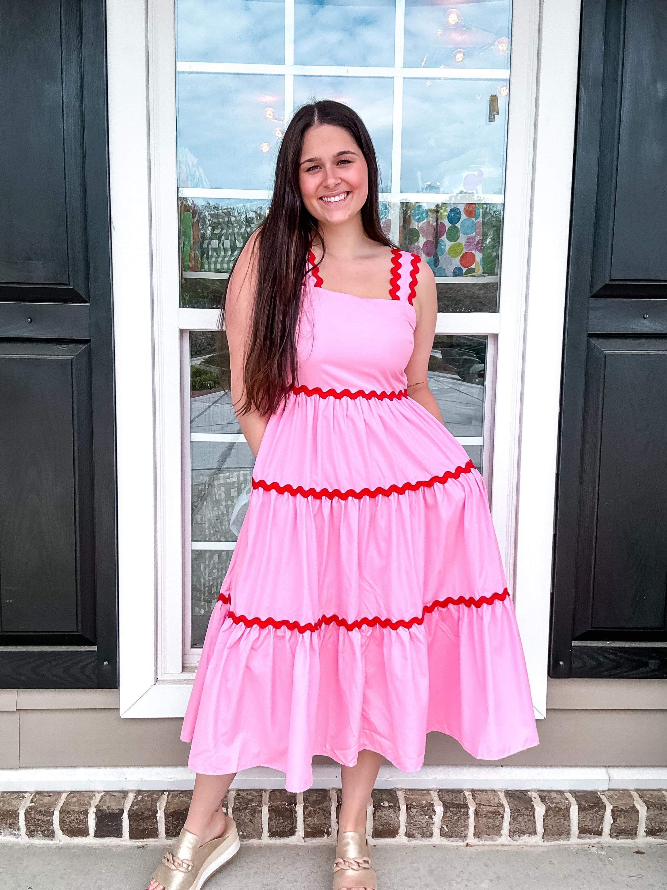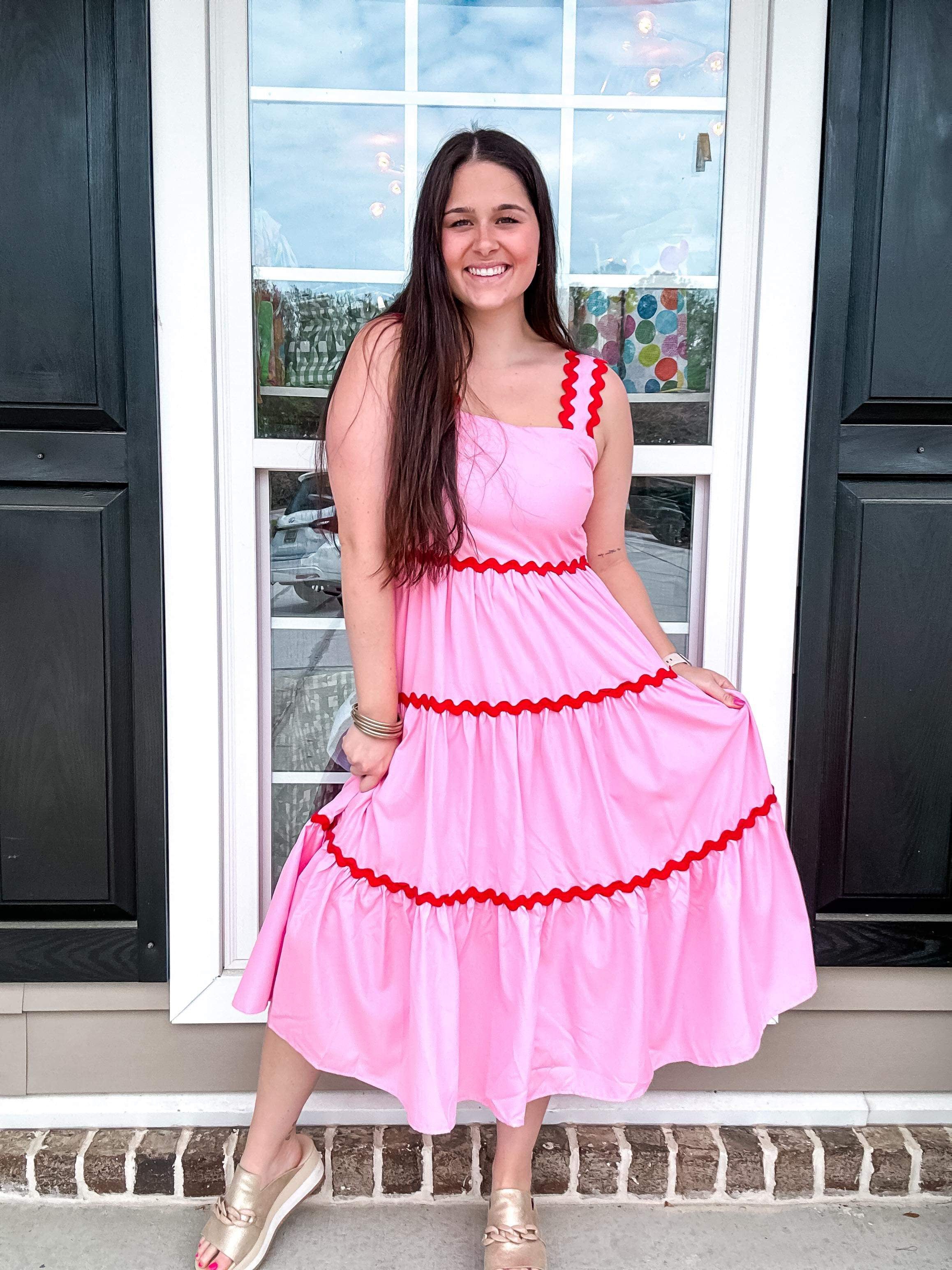Solid square neck sleeveless midi dress featuring rick rack trimming detail. Pockets at side. Lined. Woven. Non-sheer. Lightweight.