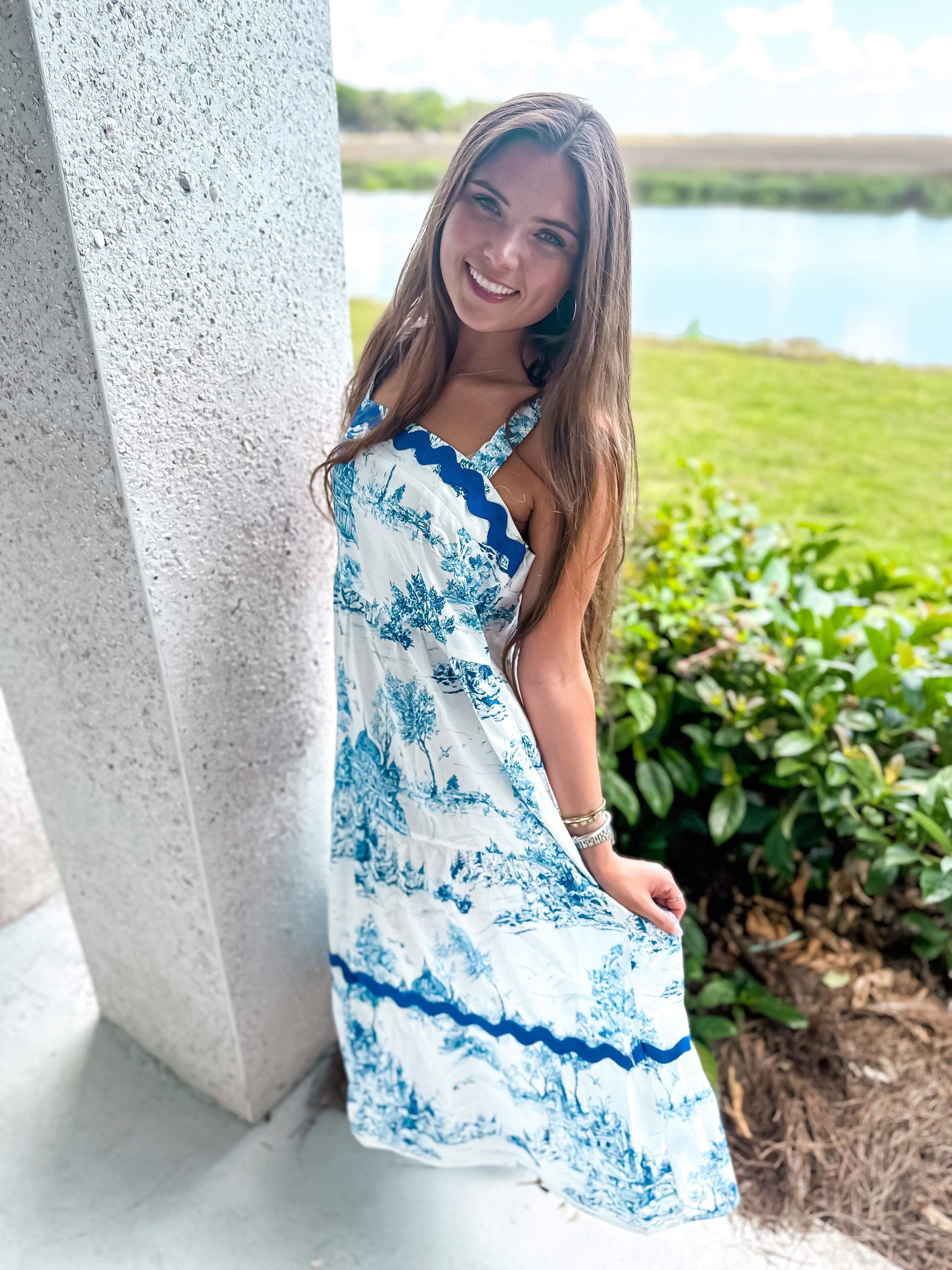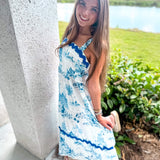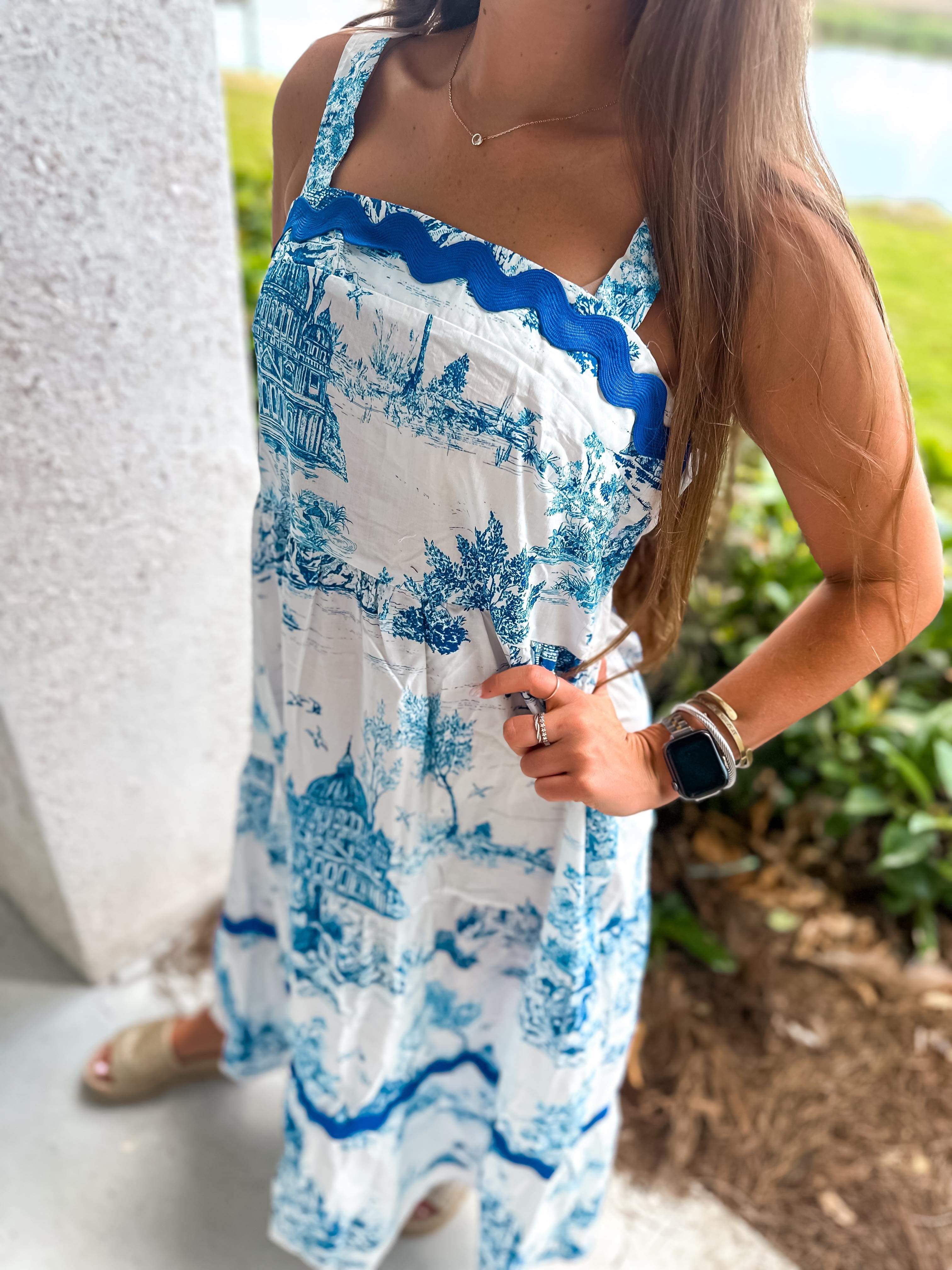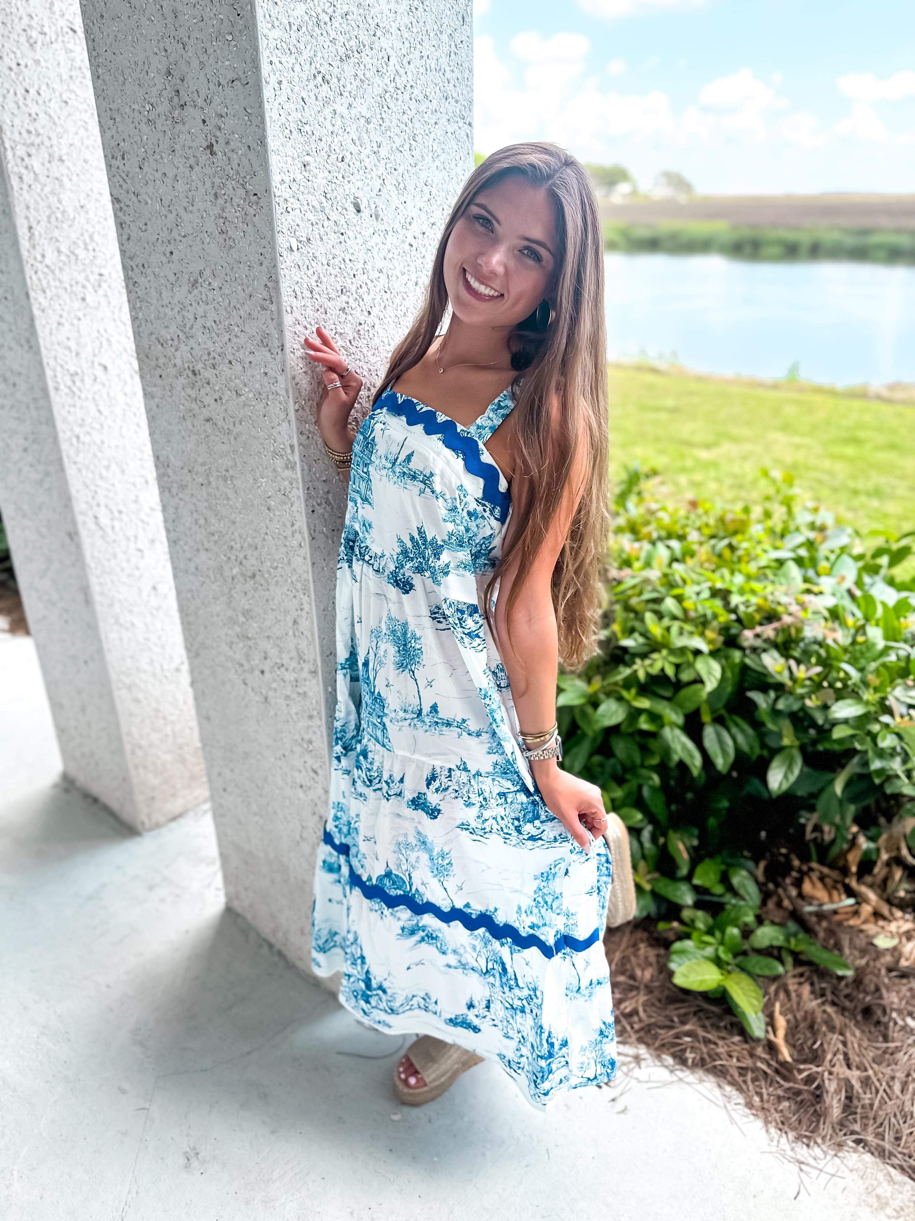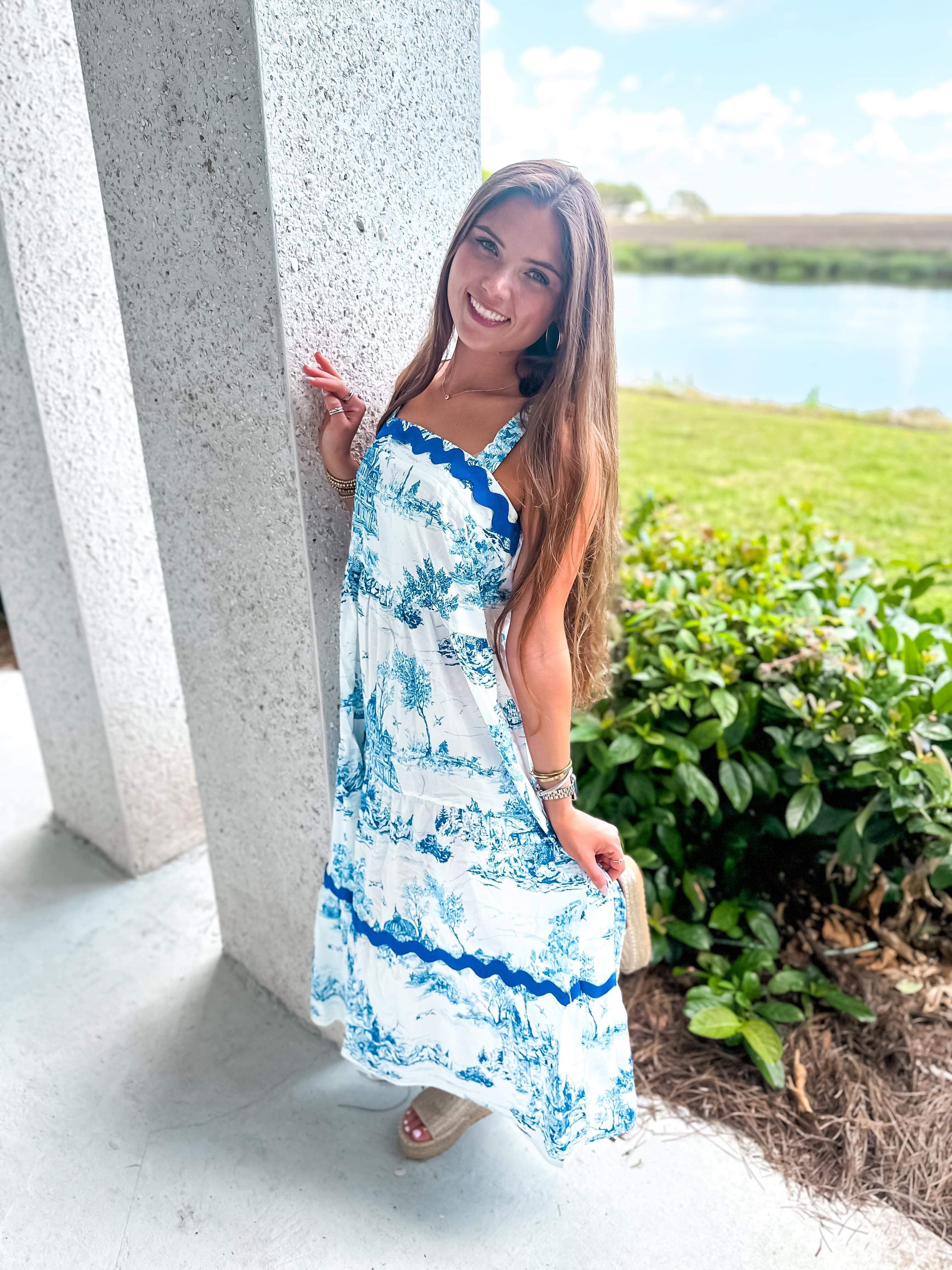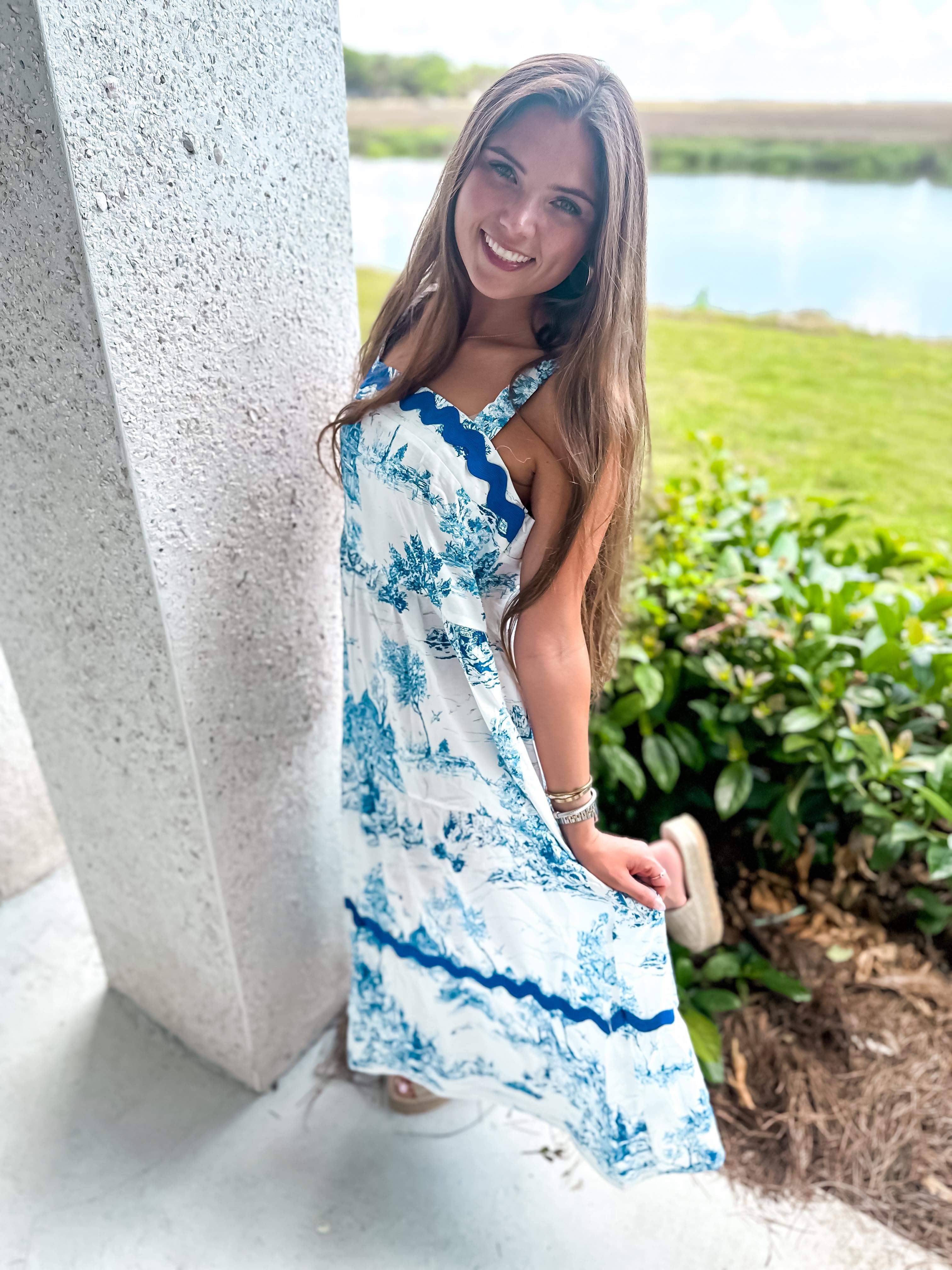 Introducing our Seaside Serenity Midi Dress in Blue. This is a perfect dress for anywhere and everywhere. Crafted for tranquil days by the shore, this sleeveless midi dress embodies effortless sophistication. Its timeless tank / sleeveless design offers comfort and freedom! It is perfect for soaking up the sun's rays or strolling along sandy beaches. She features delicate rickrack detailing that adds a touch of whimsy, reminiscent of ocean waves gently caressing the shore. Embrace the serenity of coastal living with this must-have addition to your summer wardrobe. Always keep her in mind for any and all of your Spring & Summer events.
