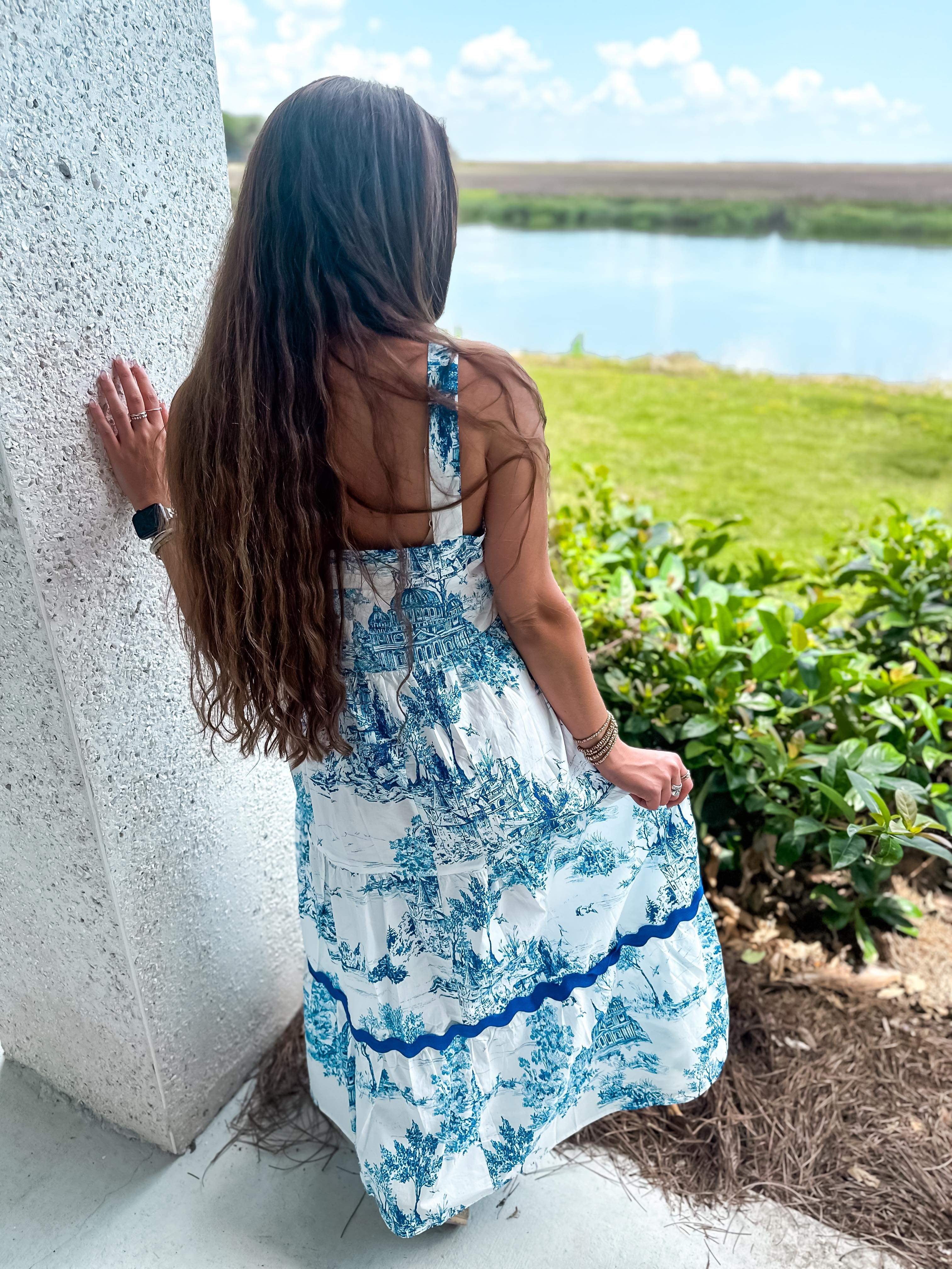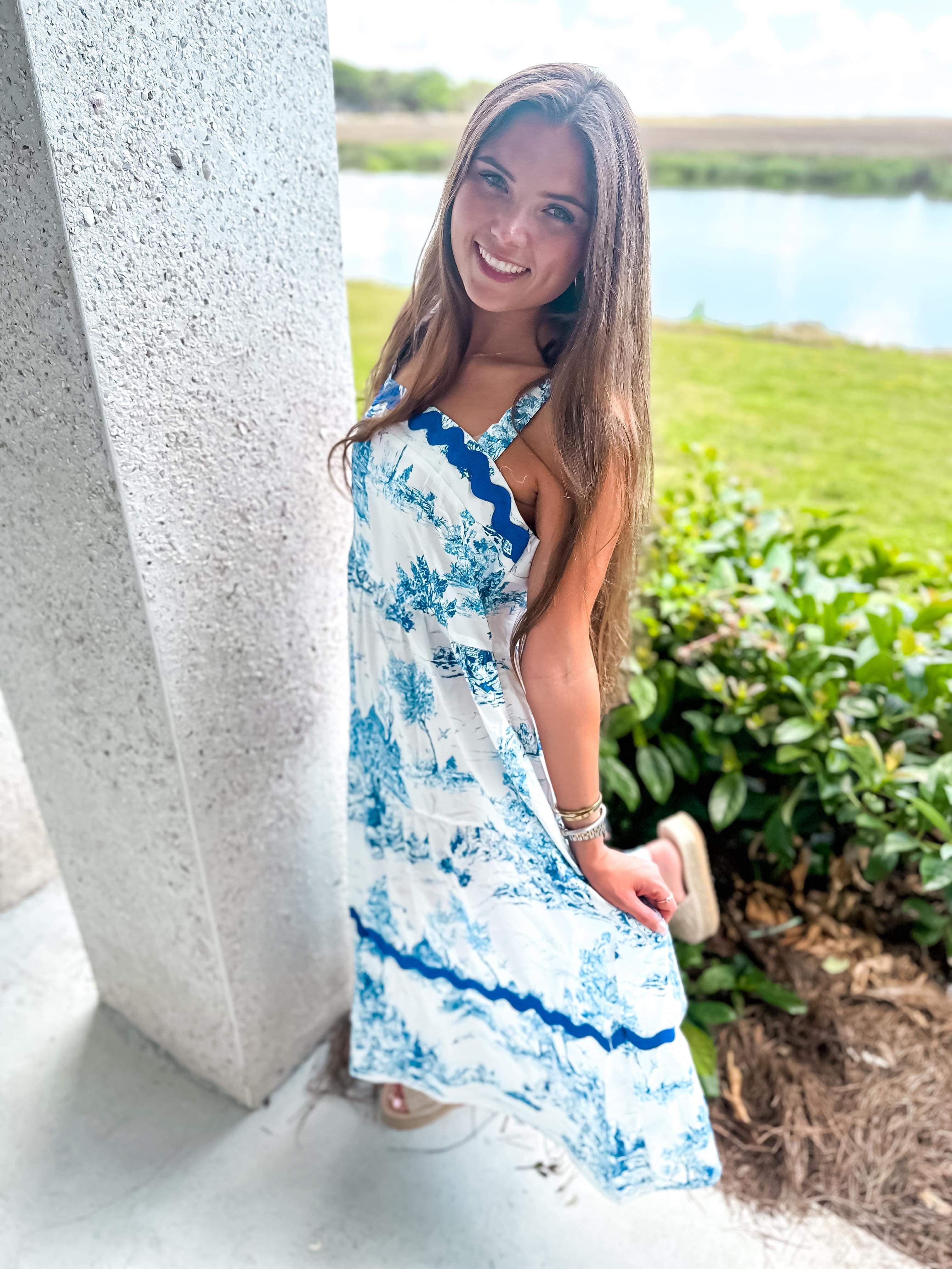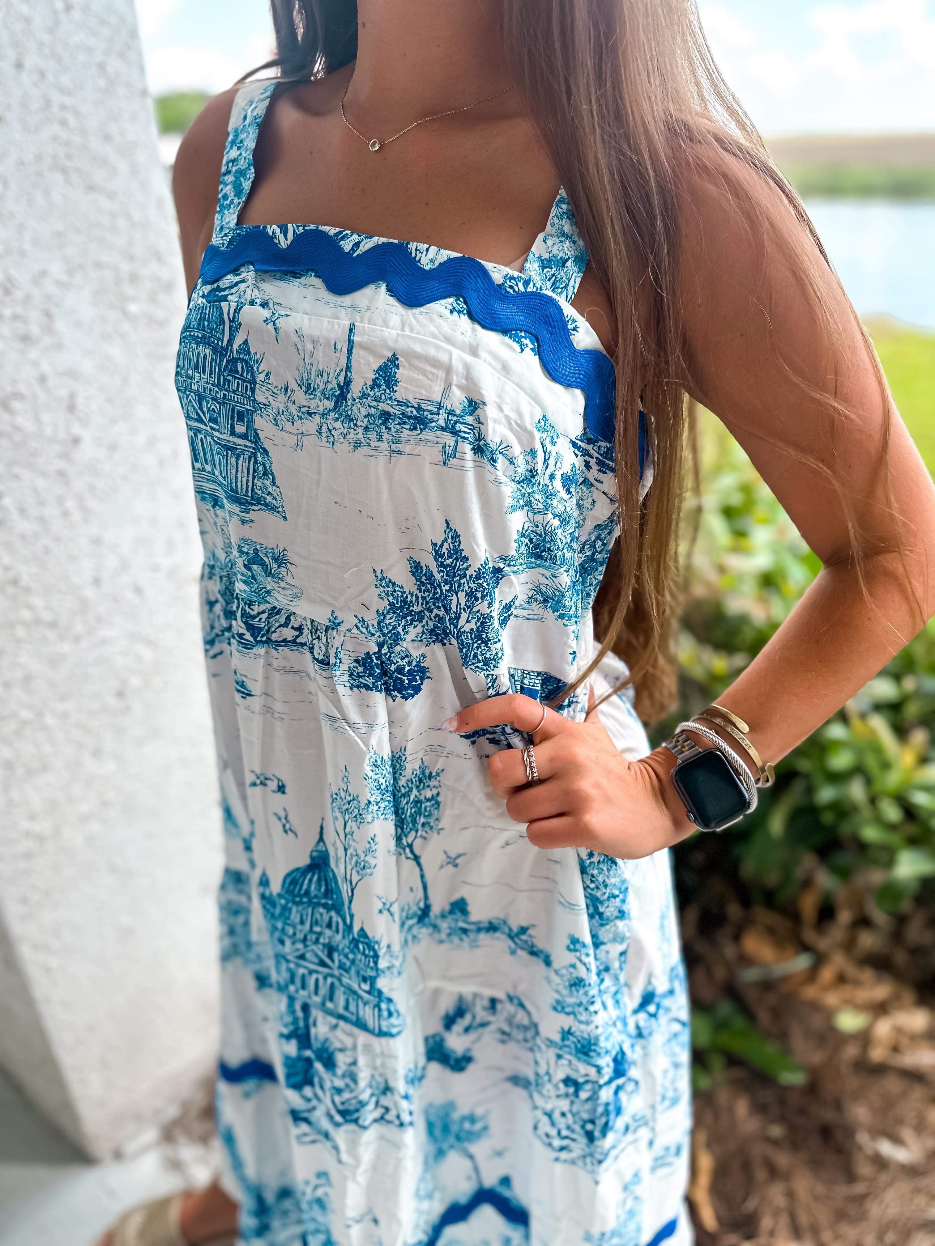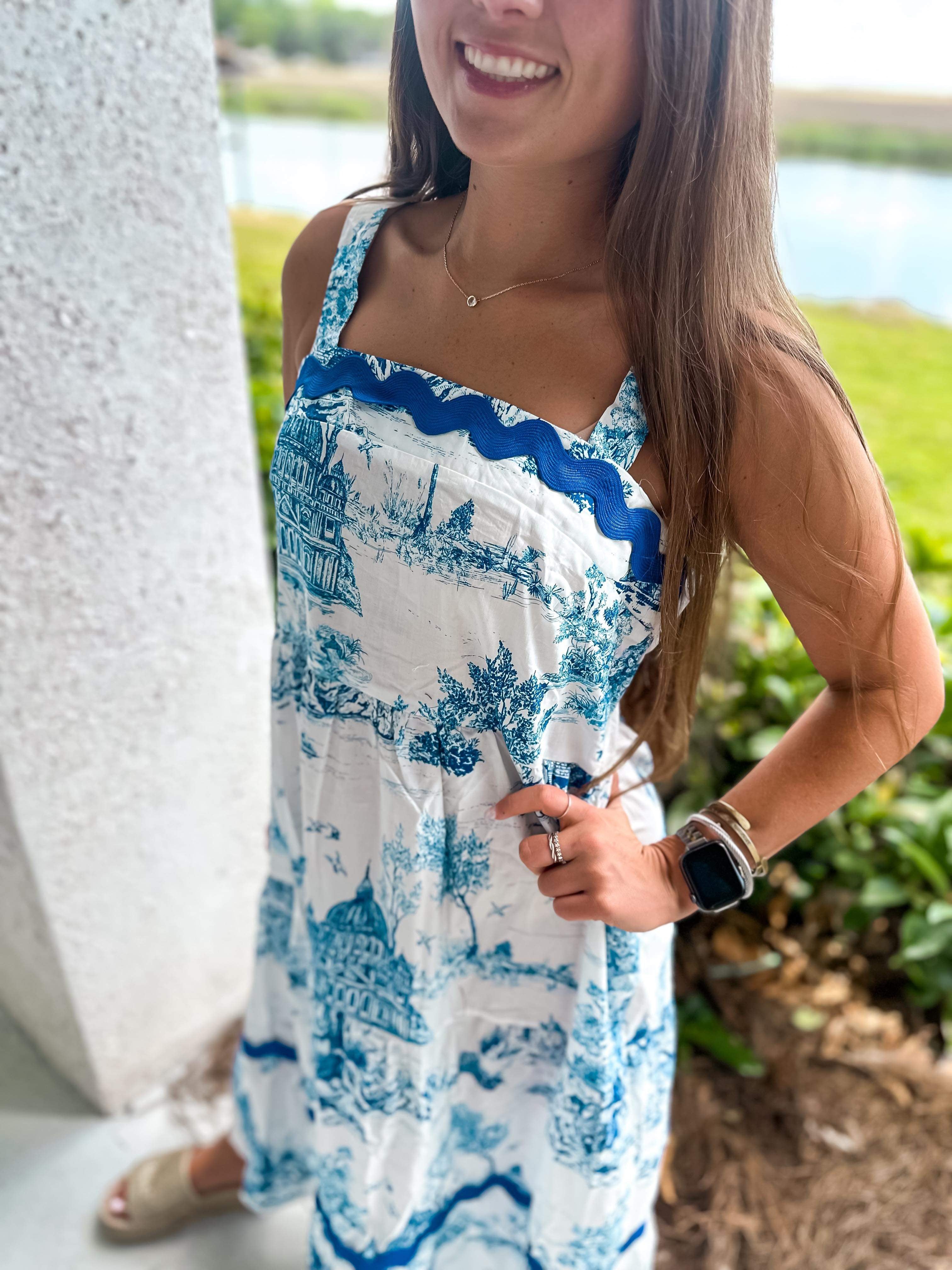Introducing our Seaside Serenity Midi Dress in Blue. This is a perfect dress for anywhere and everywhere. Crafted for tranquil days by the shore, this sleeveless midi dress embodies effortless sophistication. Its timeless tank / sleeveless design offers comfort and freedom! It is perfect for soaking up the sun's rays or strolling along sandy beaches. She features delicate rickrack detailing that adds a touch of whimsy, reminiscent of ocean waves gently caressing the shore. Embrace the serenity of coastal living with this must-have addition to your summer wardrobe. Always keep her in mind for any and all of your Spring & Summer events.