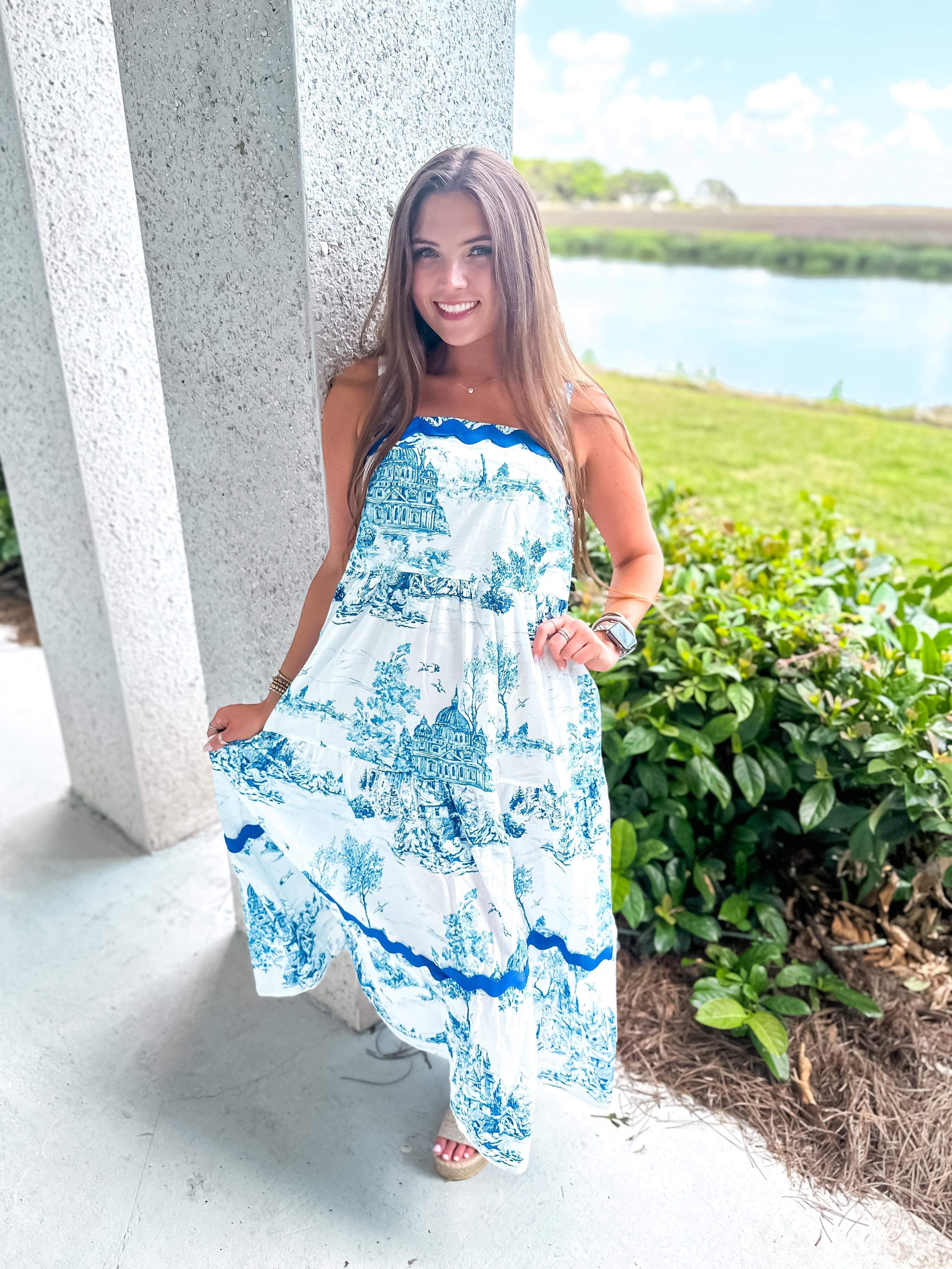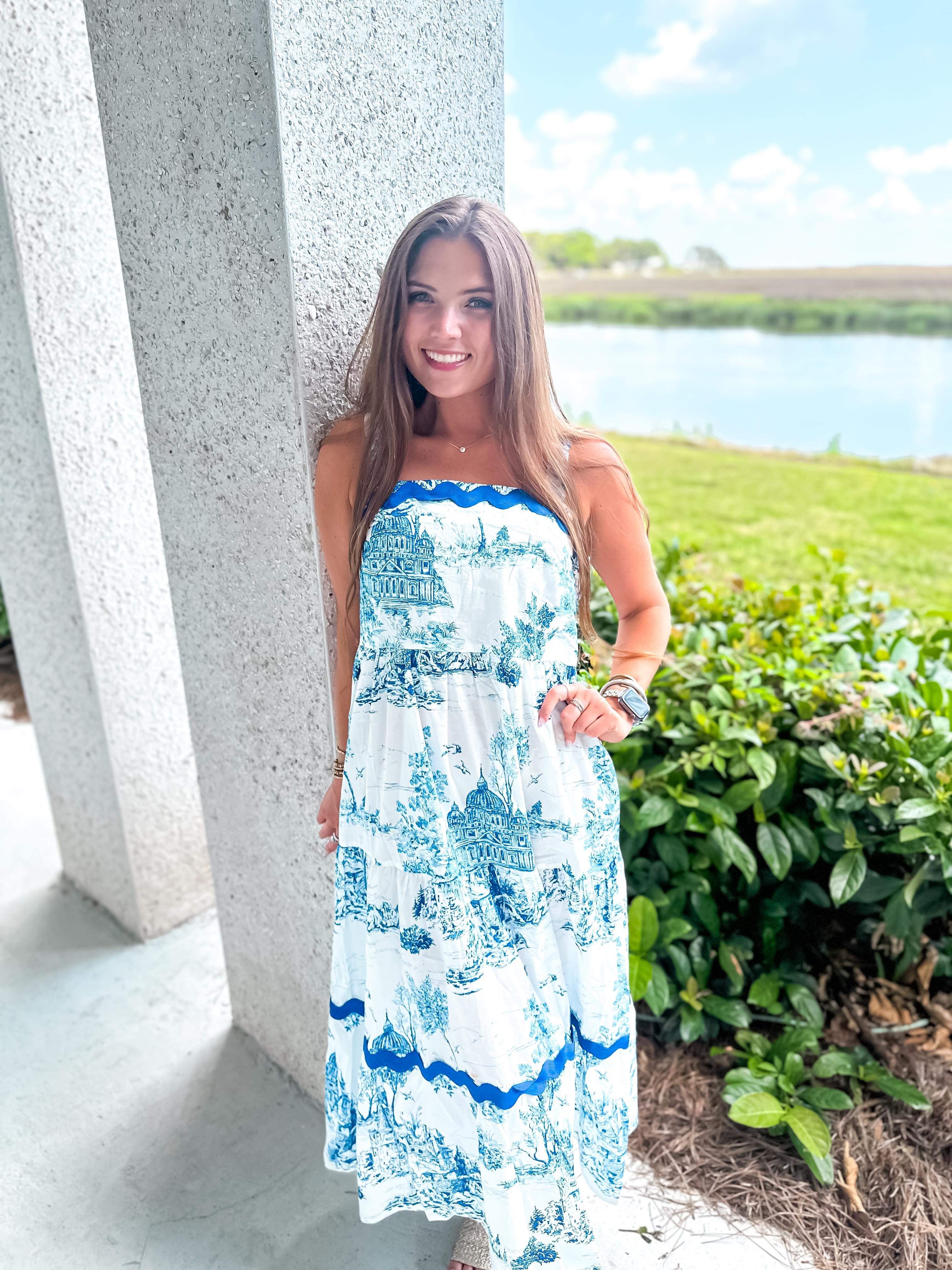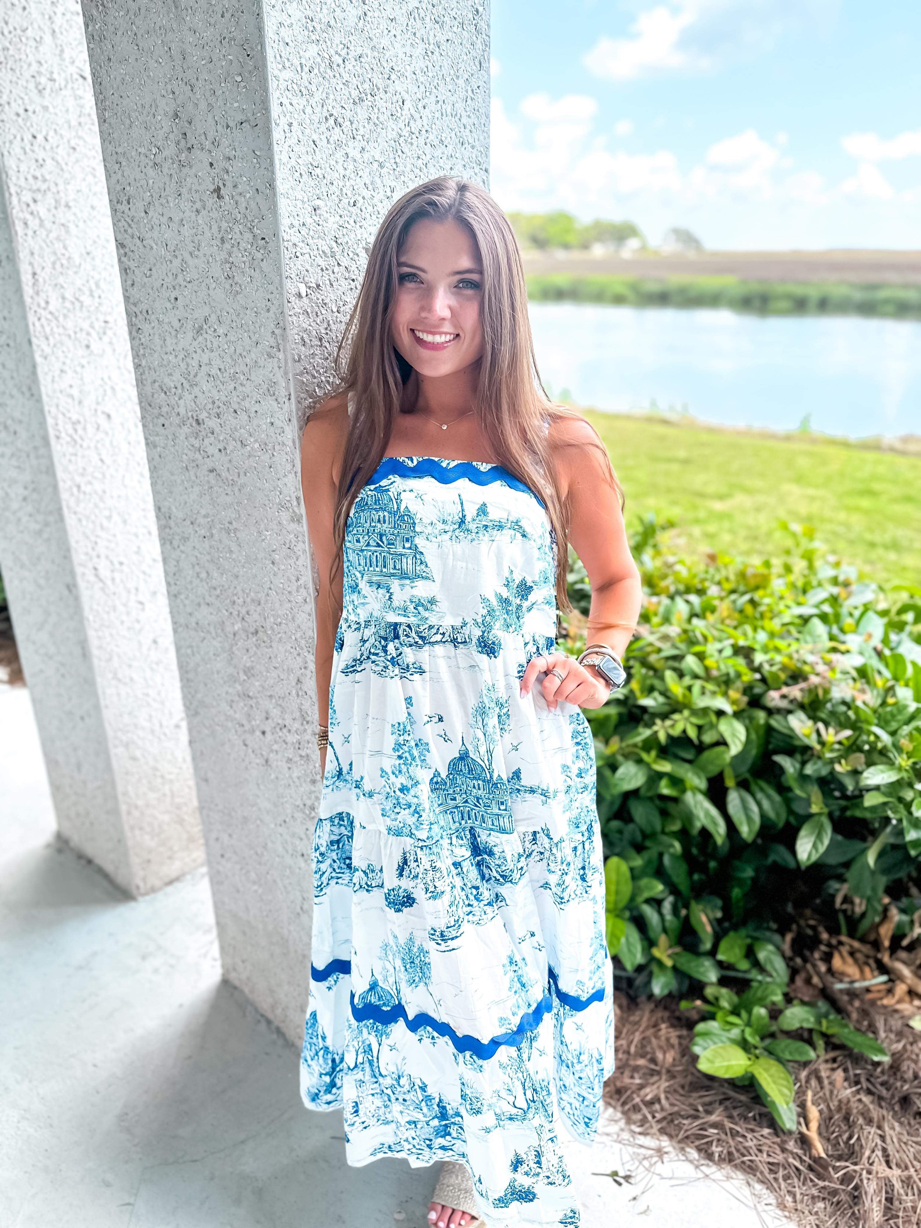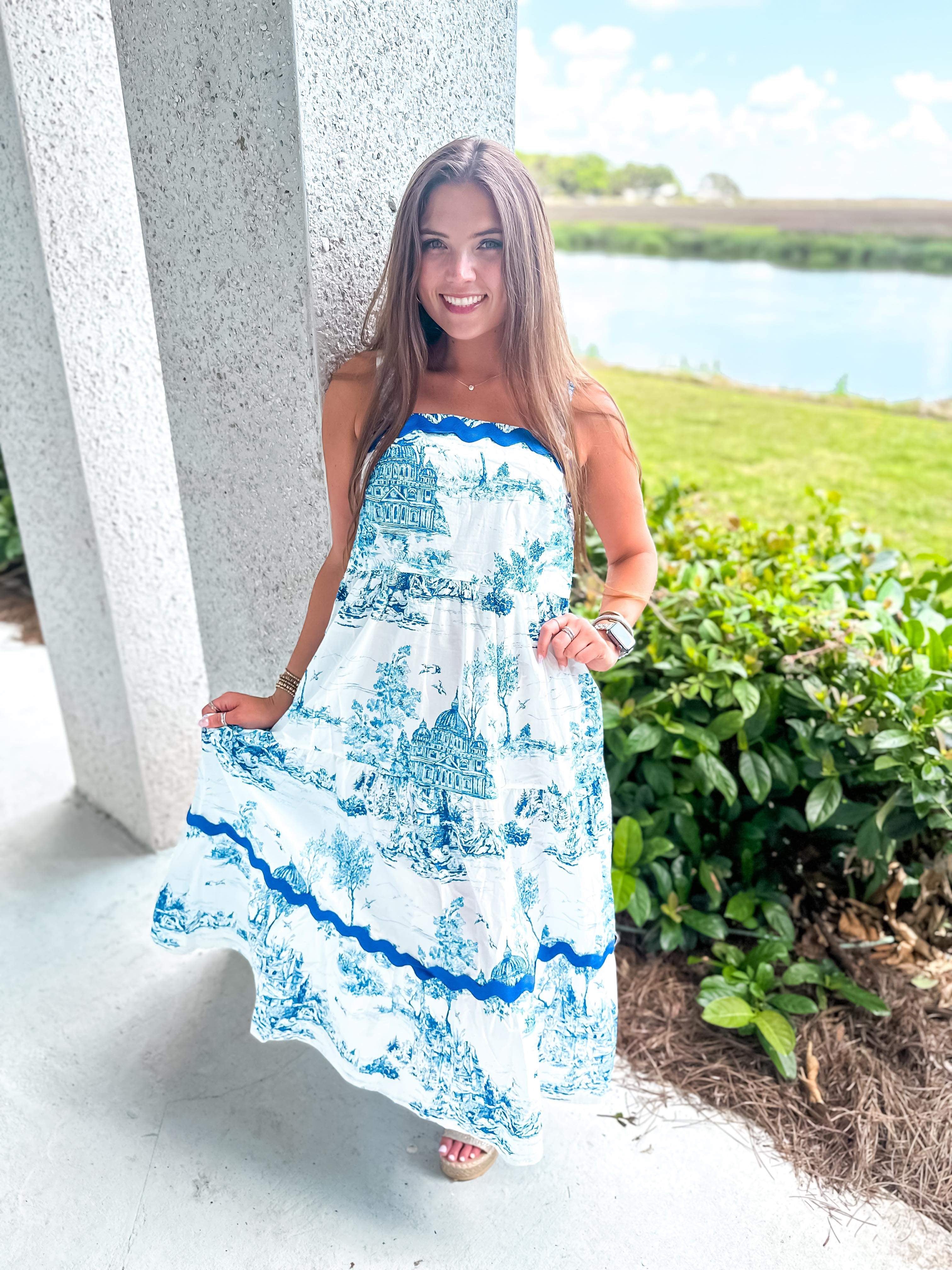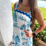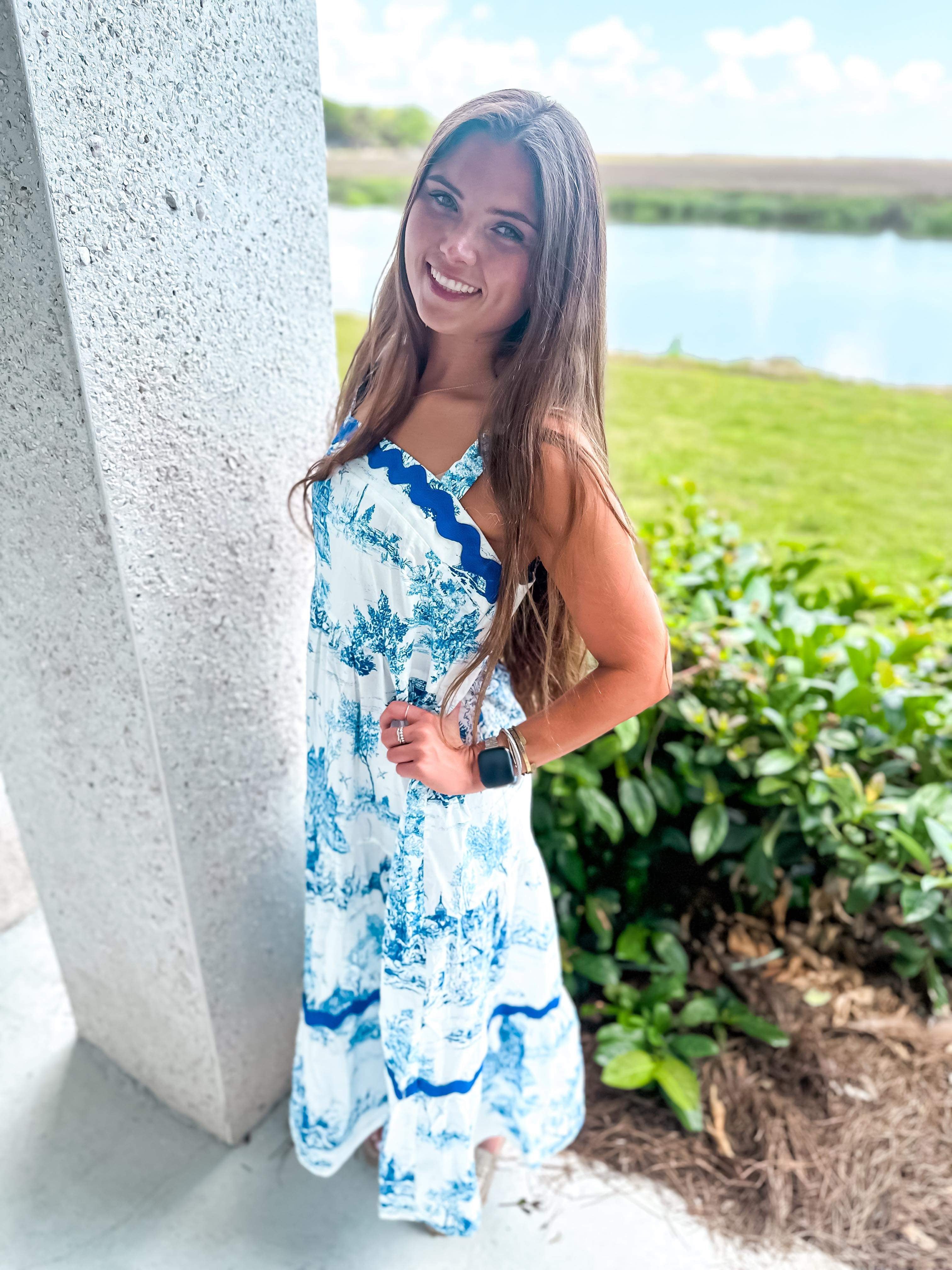 Introducing our Seaside Serenity Midi Dress in Blue. This is a perfect dress for anywhere and everywhere. Crafted for tranquil days by the shore, this sleeveless midi dress embodies effortless sophistication. Its timeless tank / sleeveless design offers comfort and freedom! It is perfect for soaking up the sun's rays or strolling along sandy beaches. She features delicate rickrack detailing that adds a touch of whimsy, reminiscent of ocean waves gently caressing the shore. Embrace the serenity of coastal living with this must-have addition to your summer wardrobe. Always keep her in mind for any and all of your Spring & Summer events.