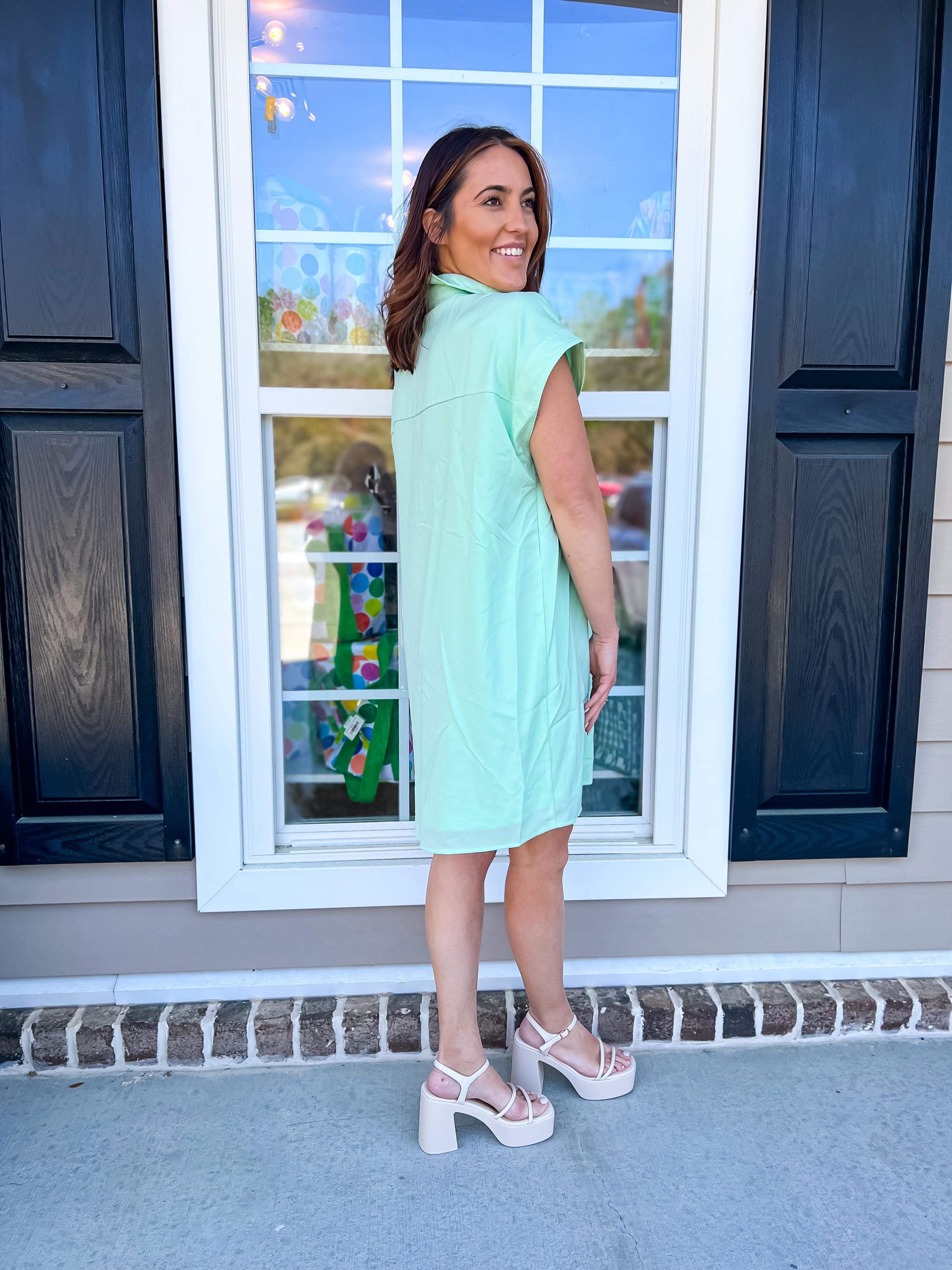 Collared short sleeve mini dress featuring button detail at front. Unlined. Woven. Non-sheer. Lightweight.