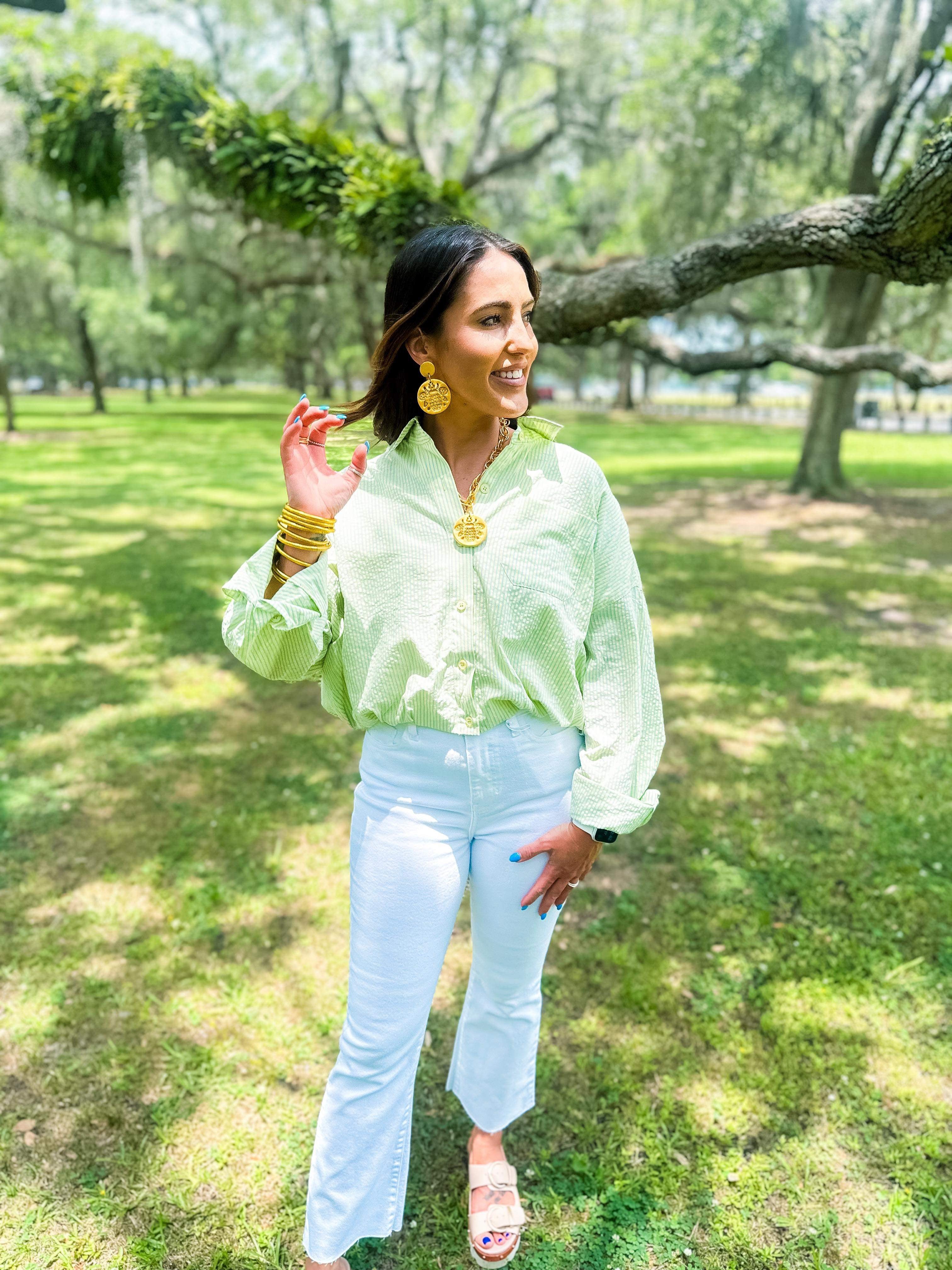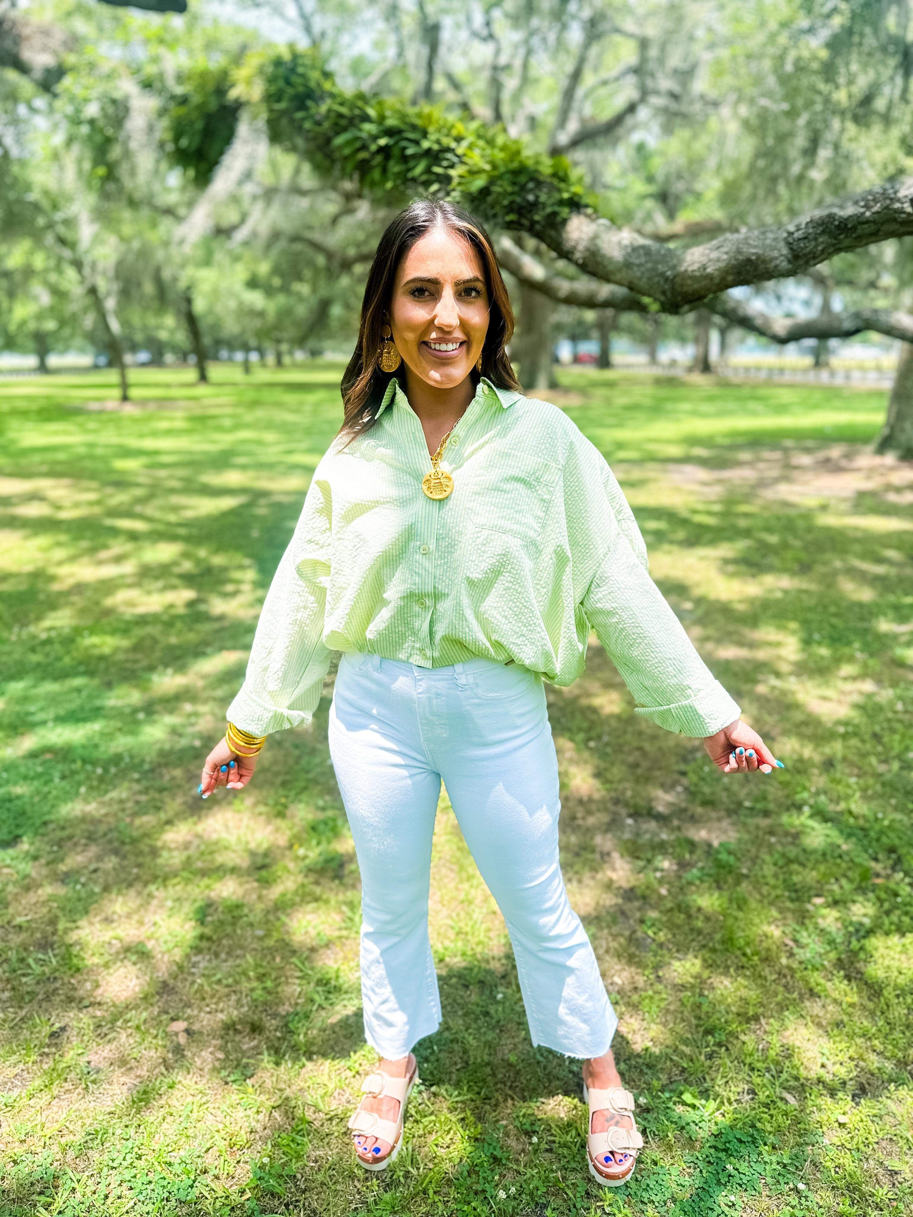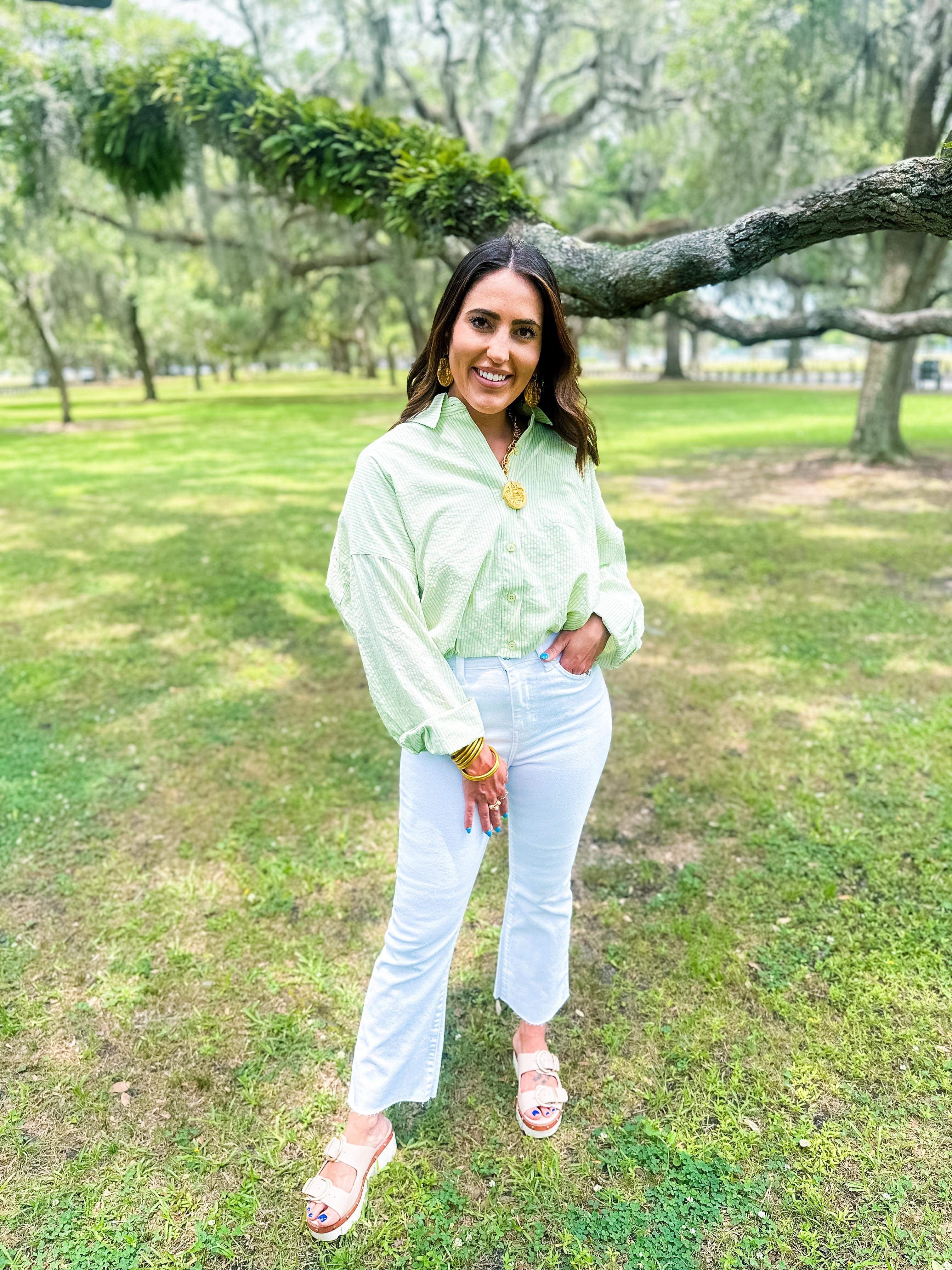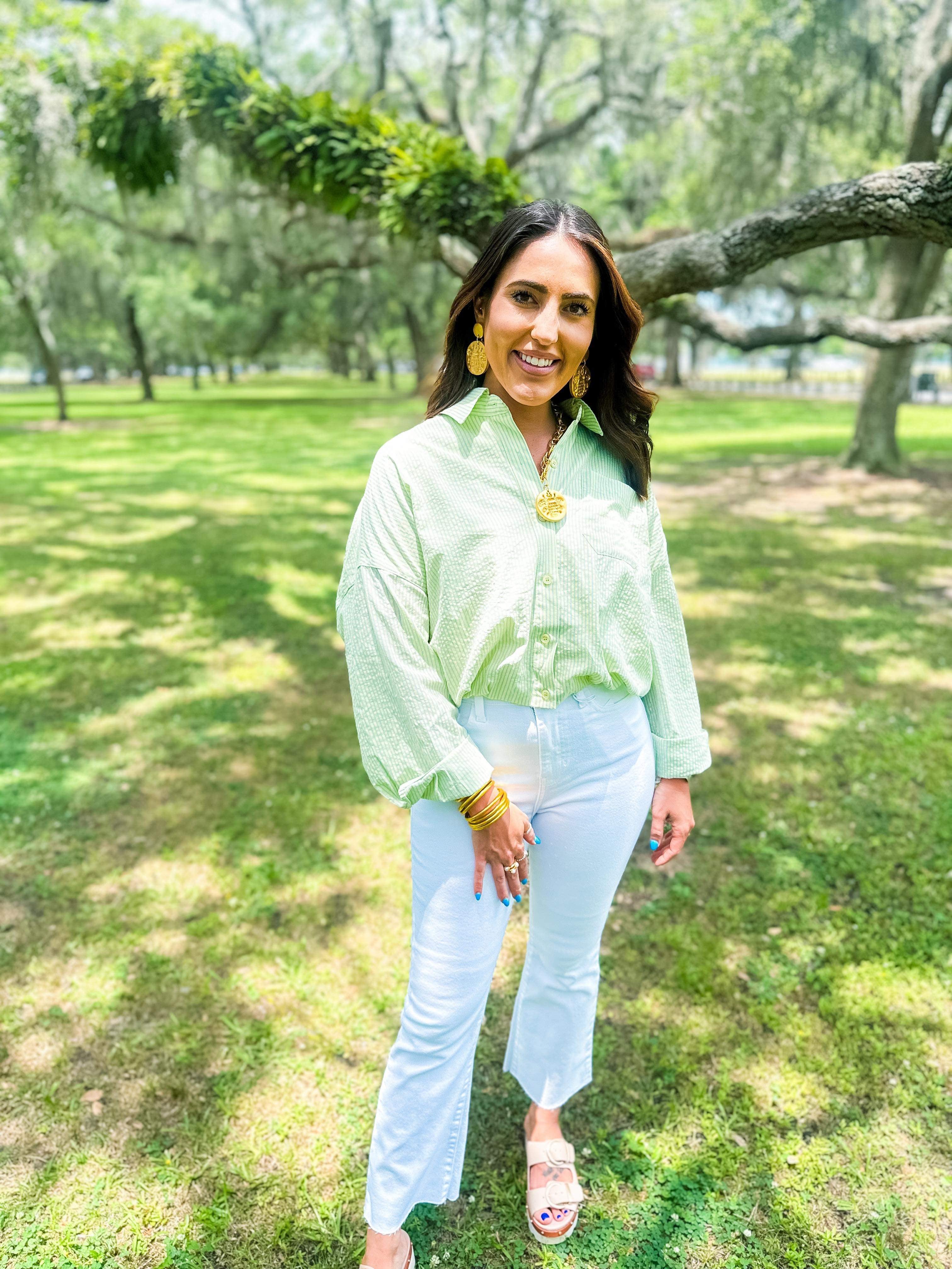 Seersucker Stripe Pocket Bubble Button Up Top- Green